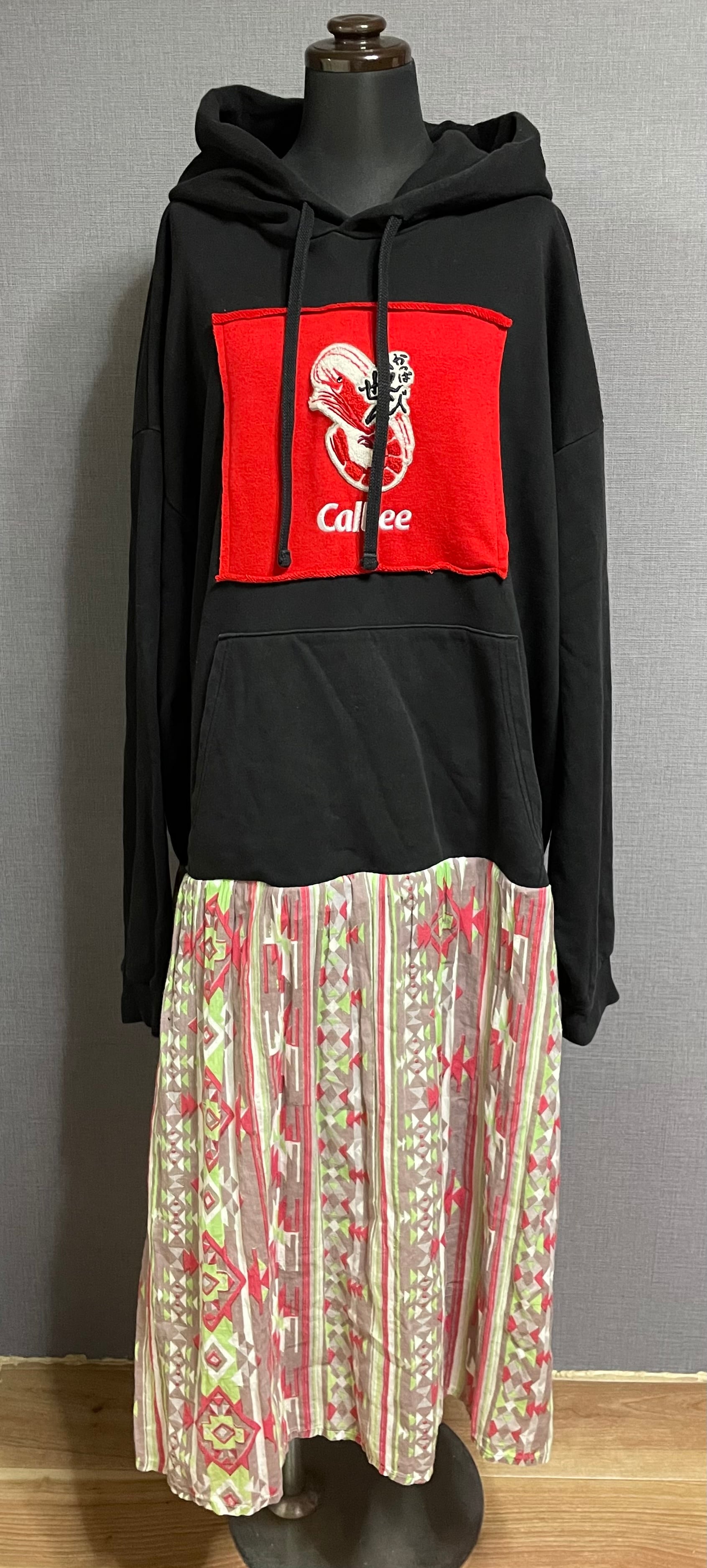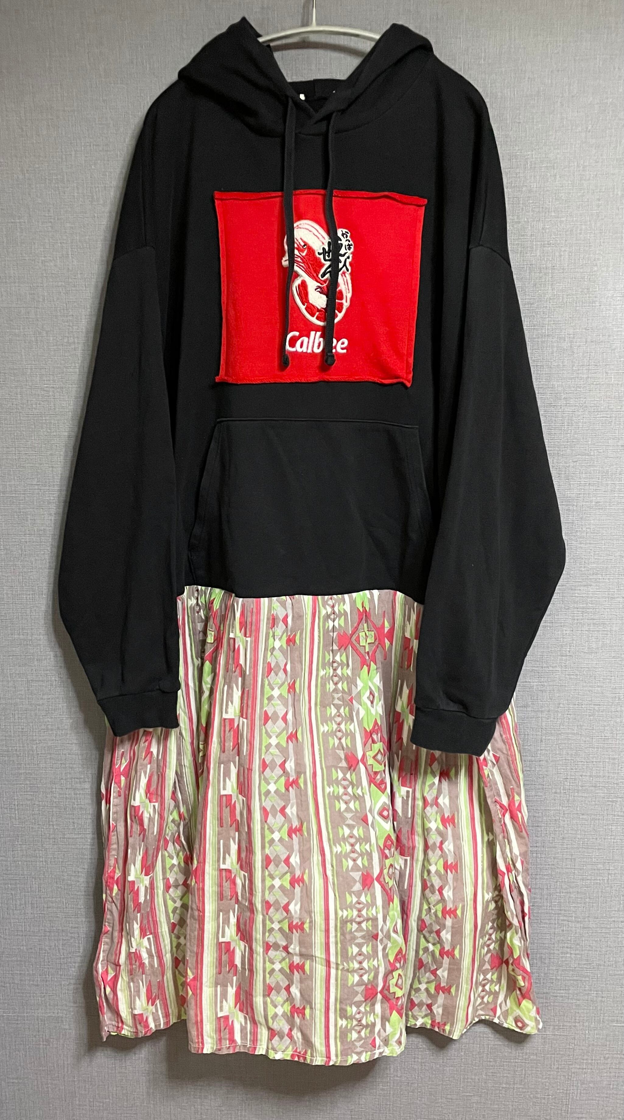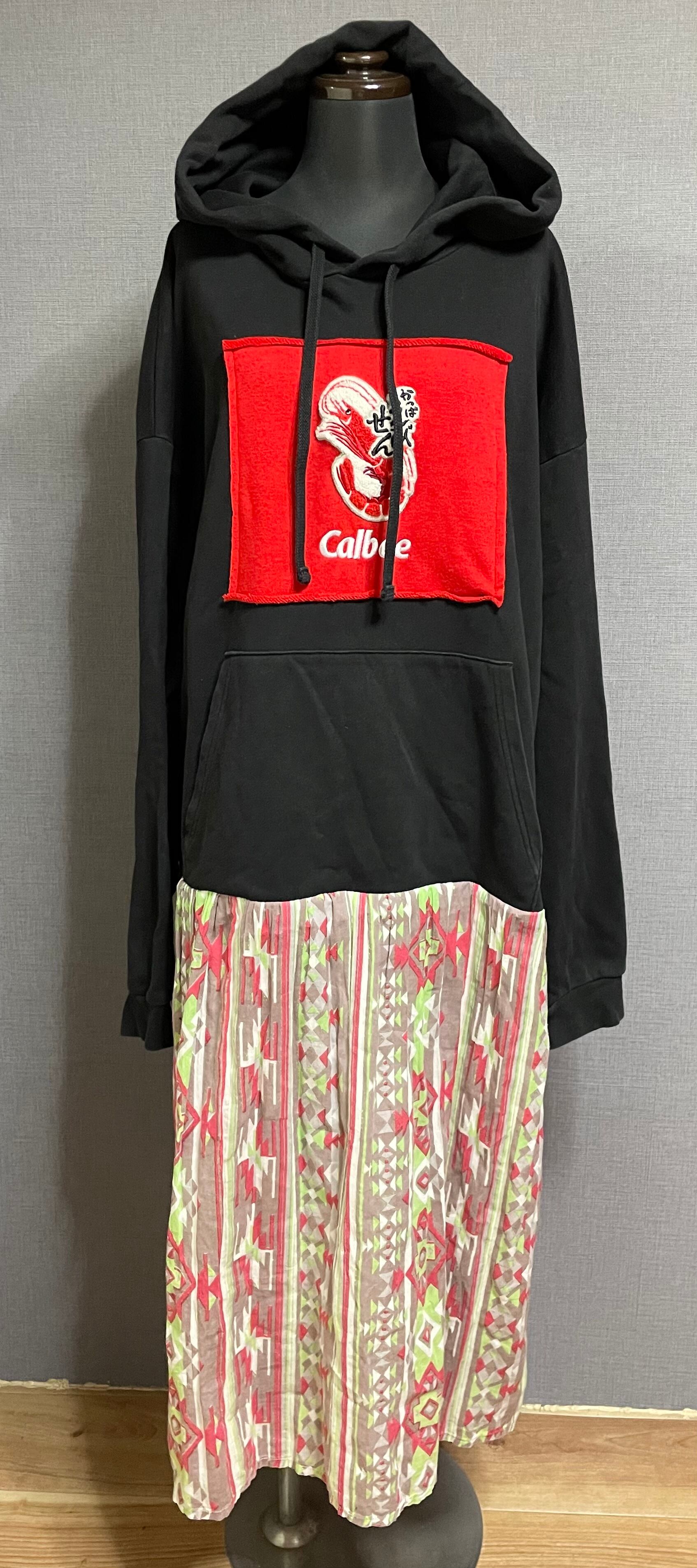 黒パーカーに美味しいやつを縫いつけ、インド綿の柄スカートを合わせています♬