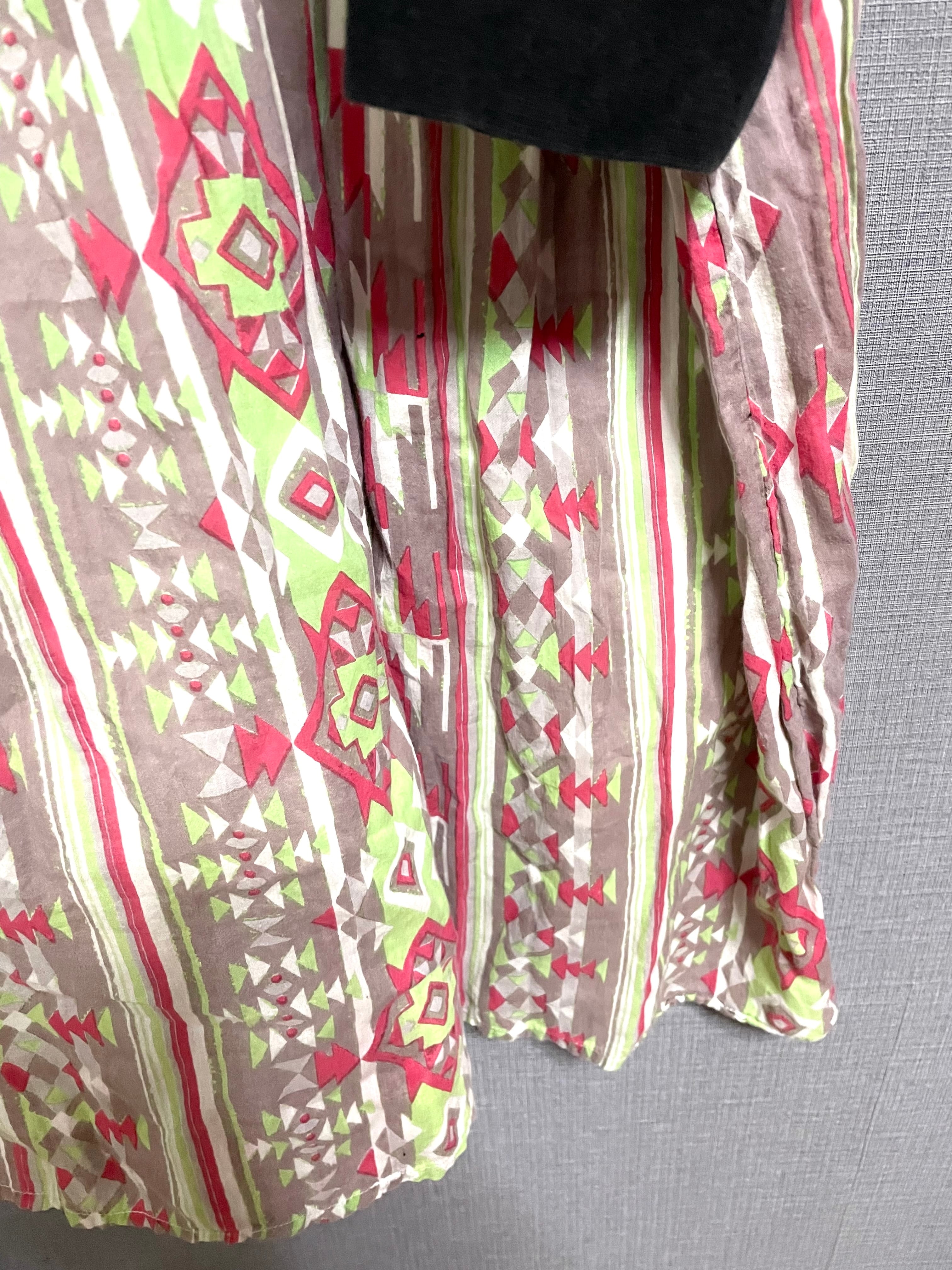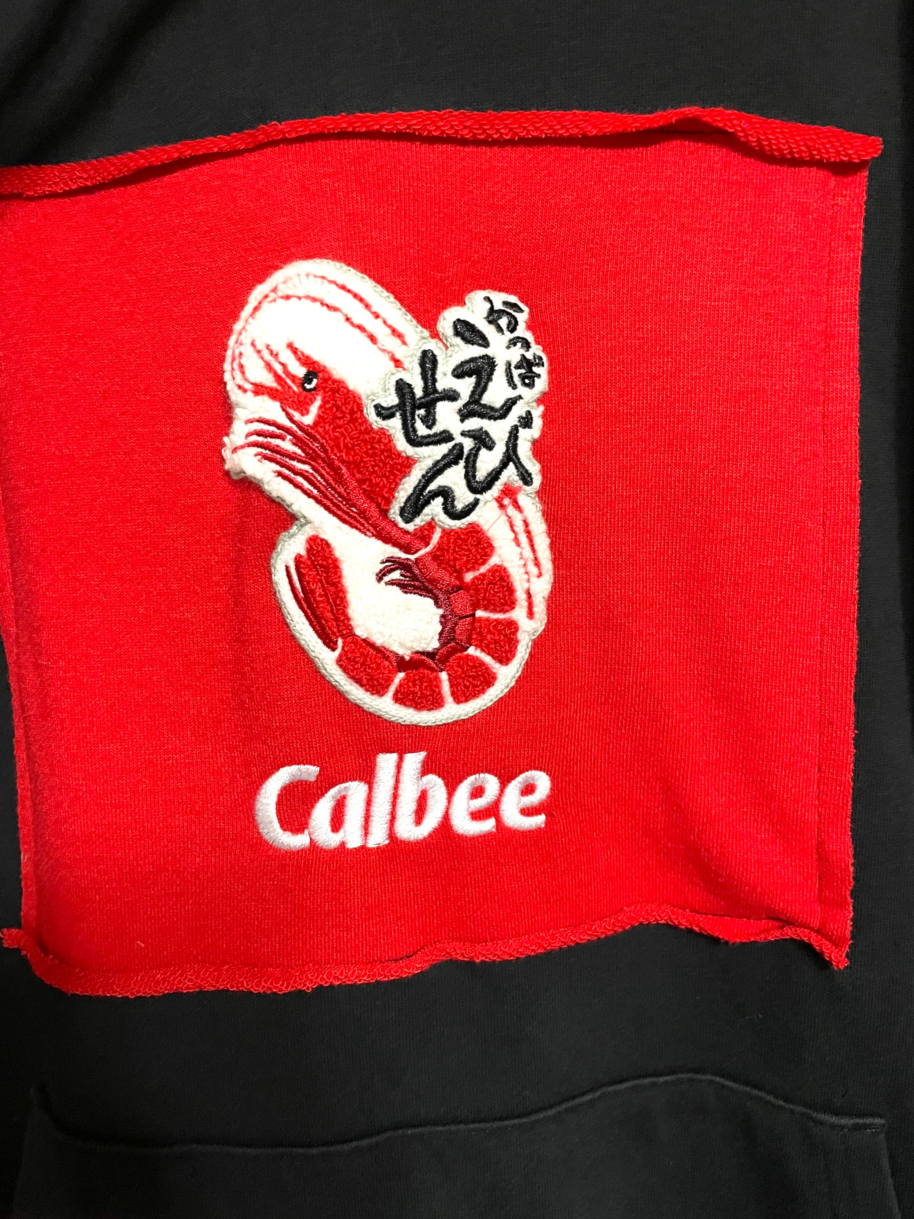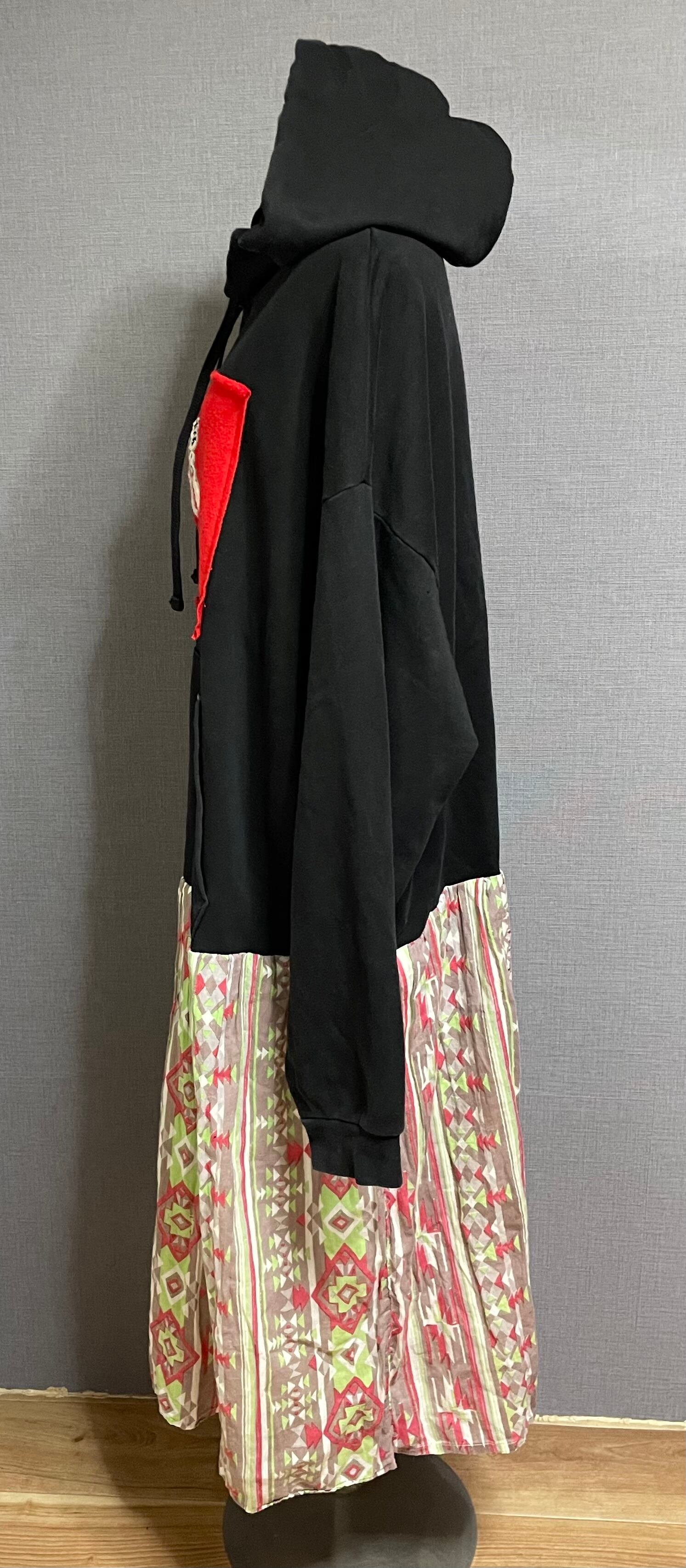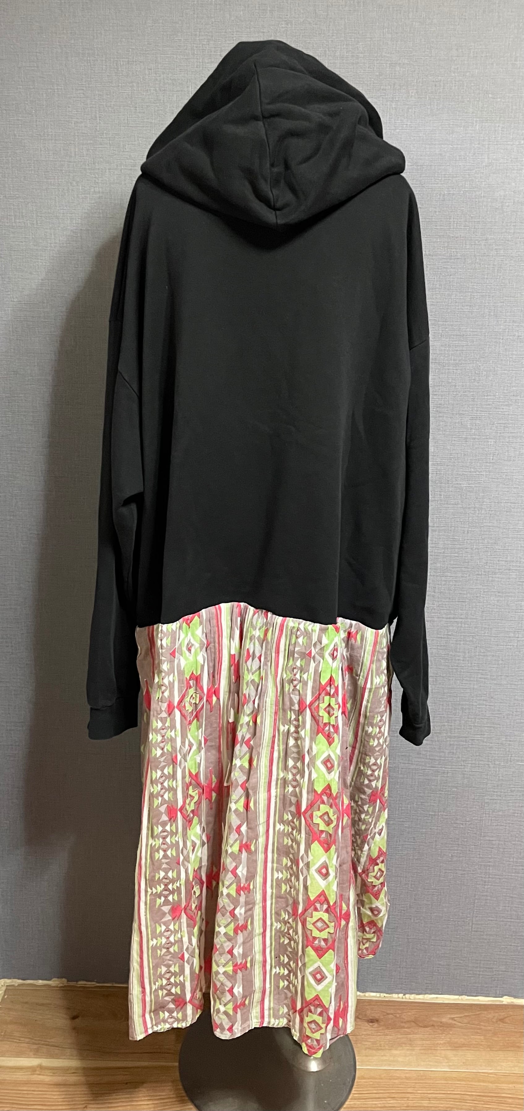 黒パーカーに美味しいやつを縫いつけ、インド綿の柄スカートを合わせています♬