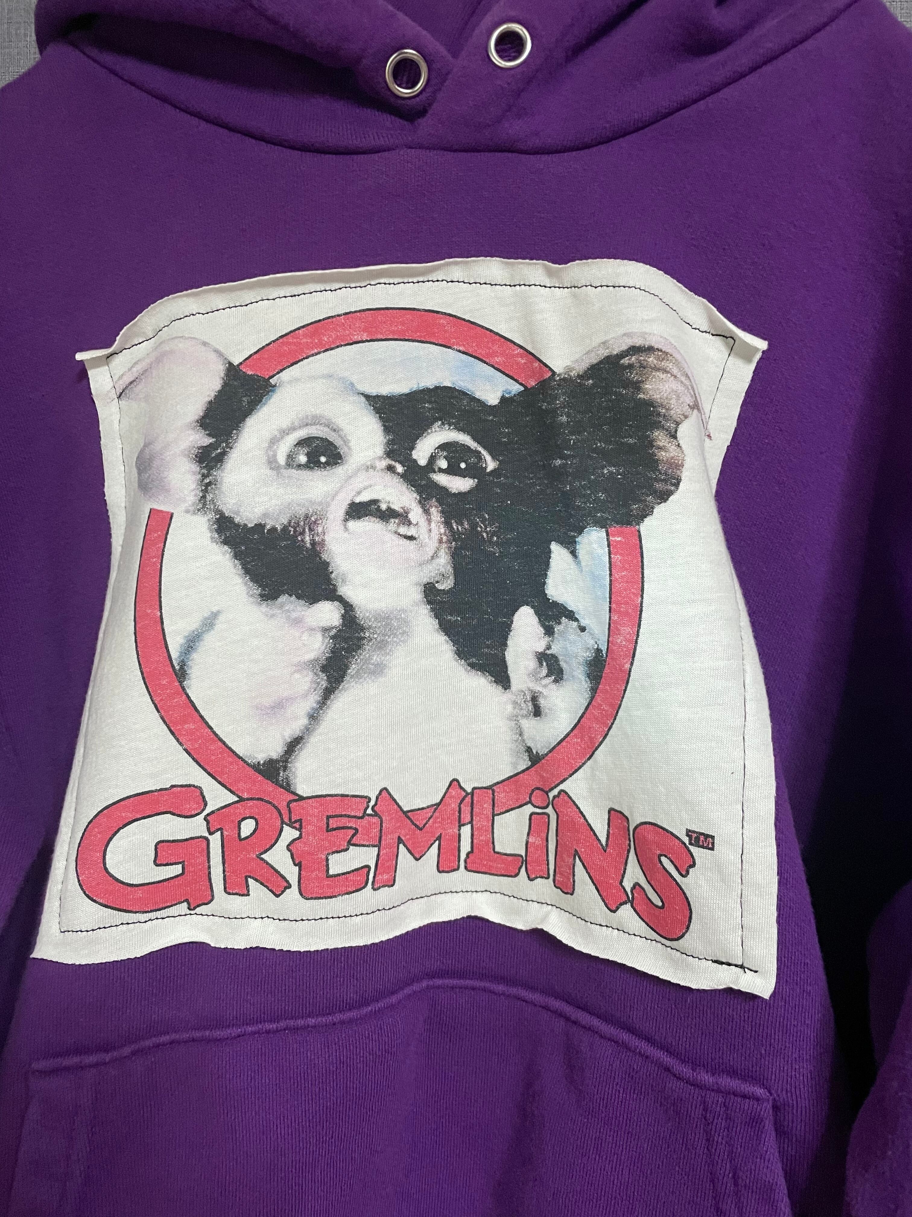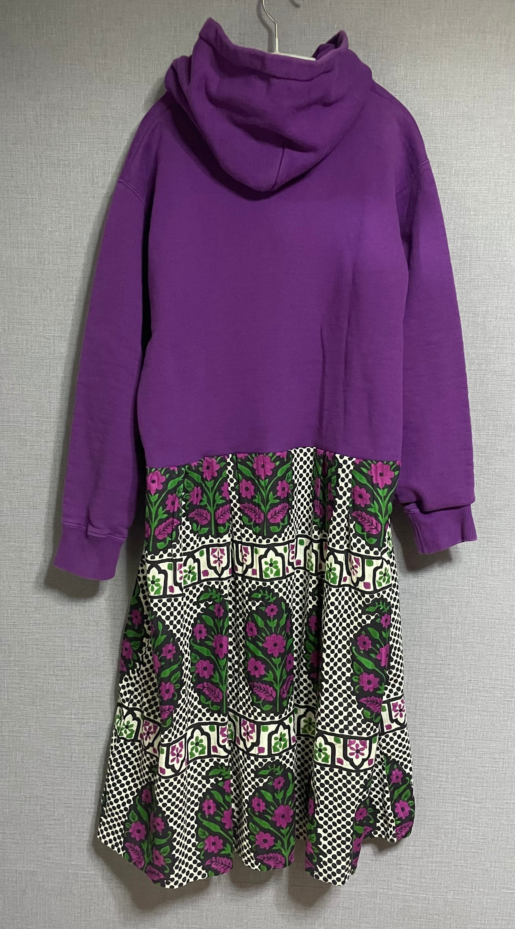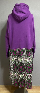 パープルパーカーにかわいい生き物を縫いつけ、柄スカートを合わせています♬