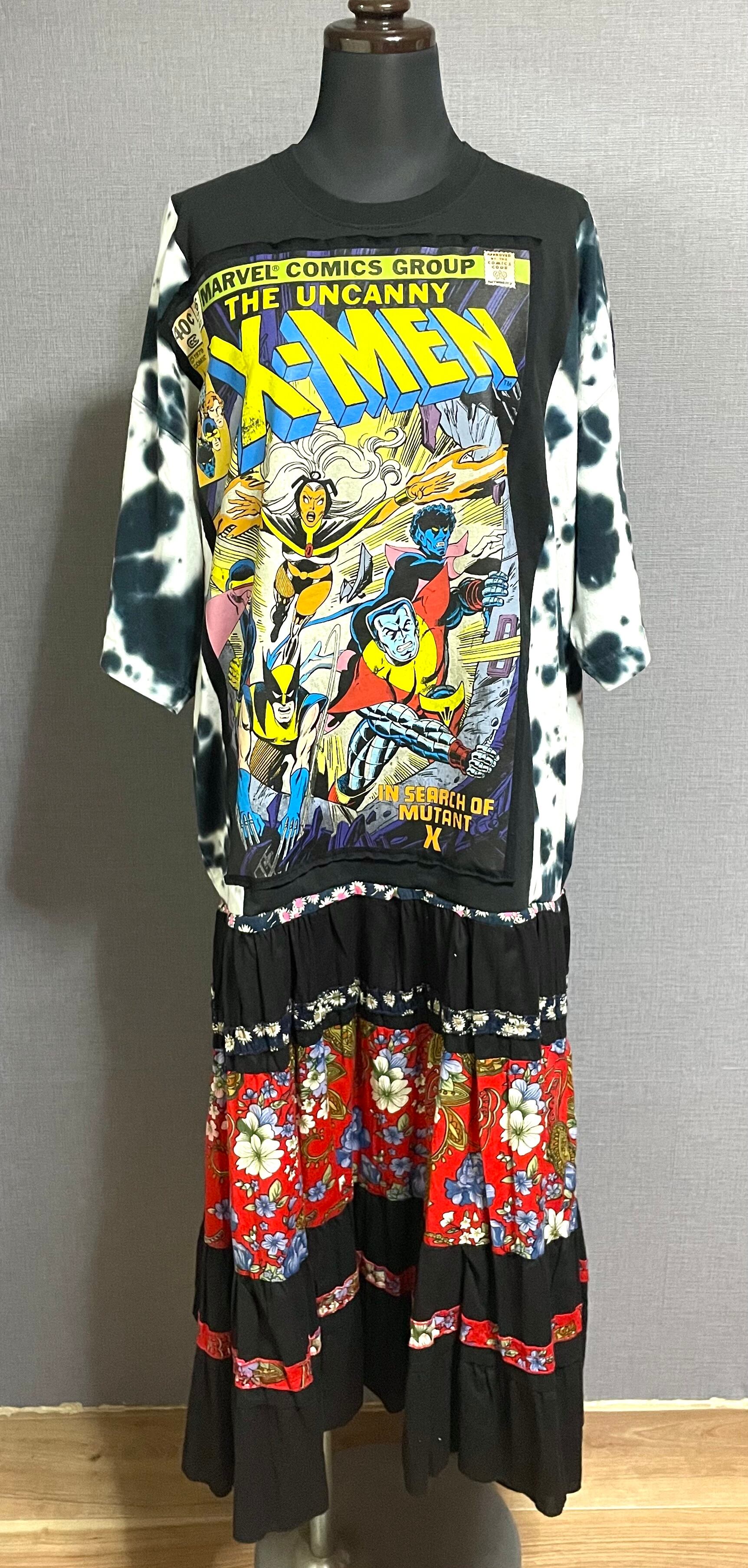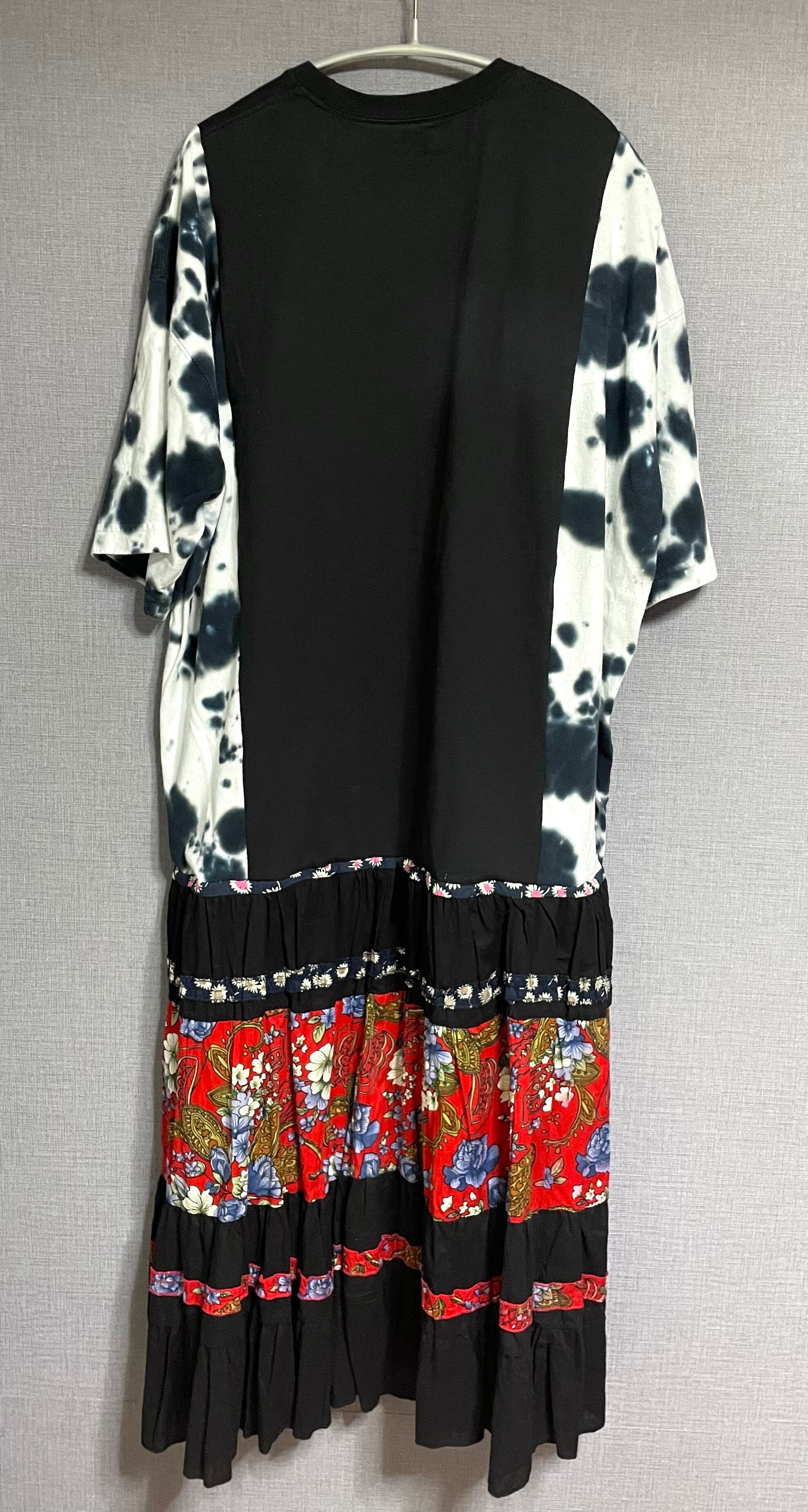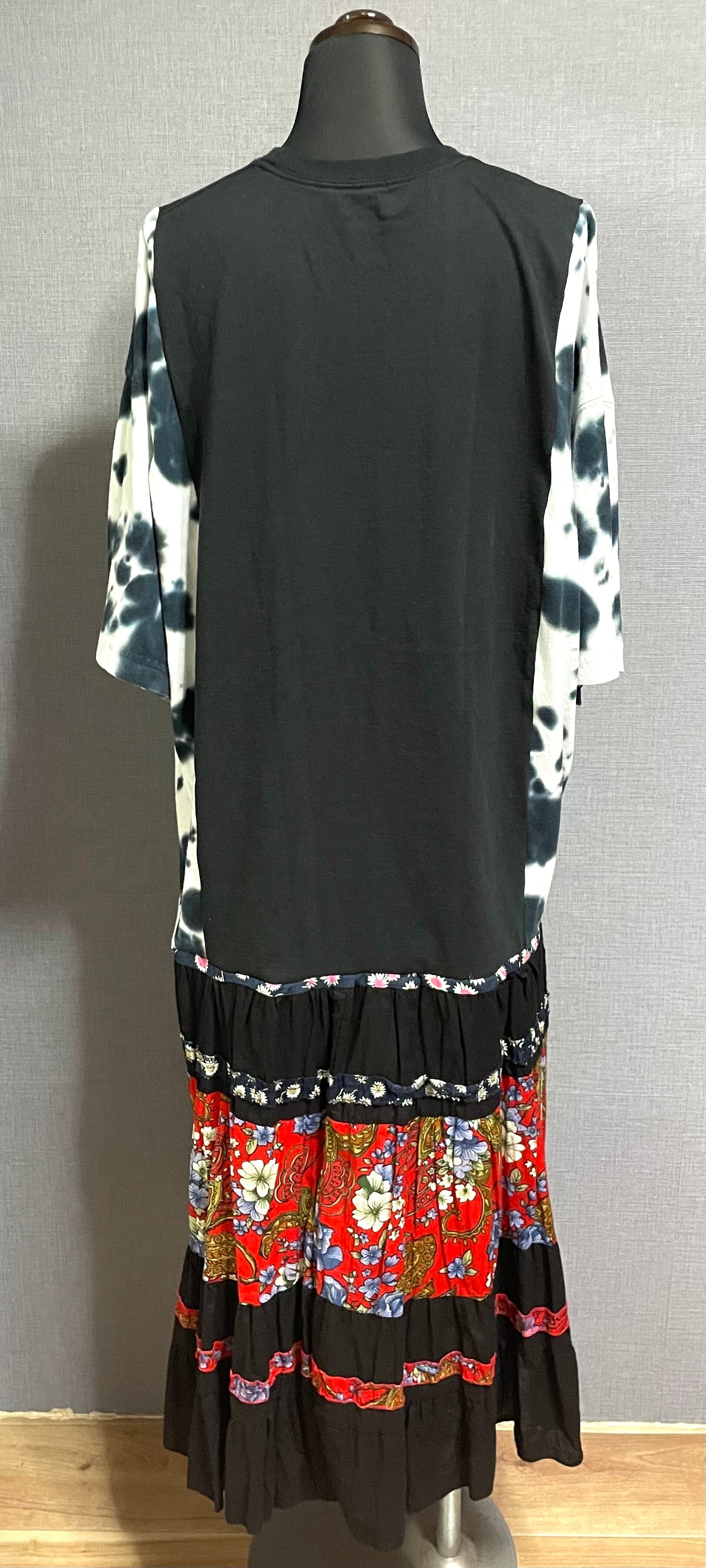 黒Tシャツに袖とサイドはタイダイ模様を合わせ、黒と赤の素敵なスカートを合わせています♬