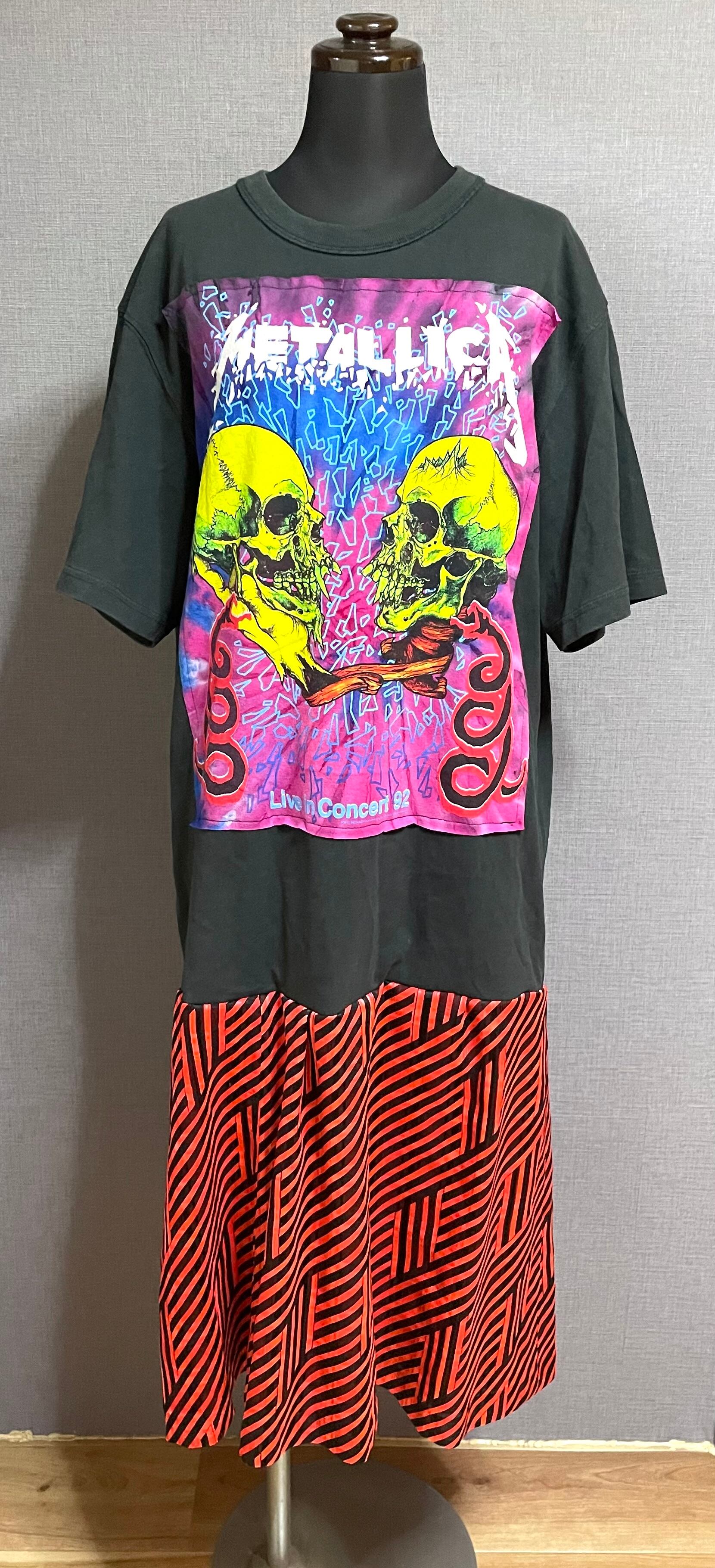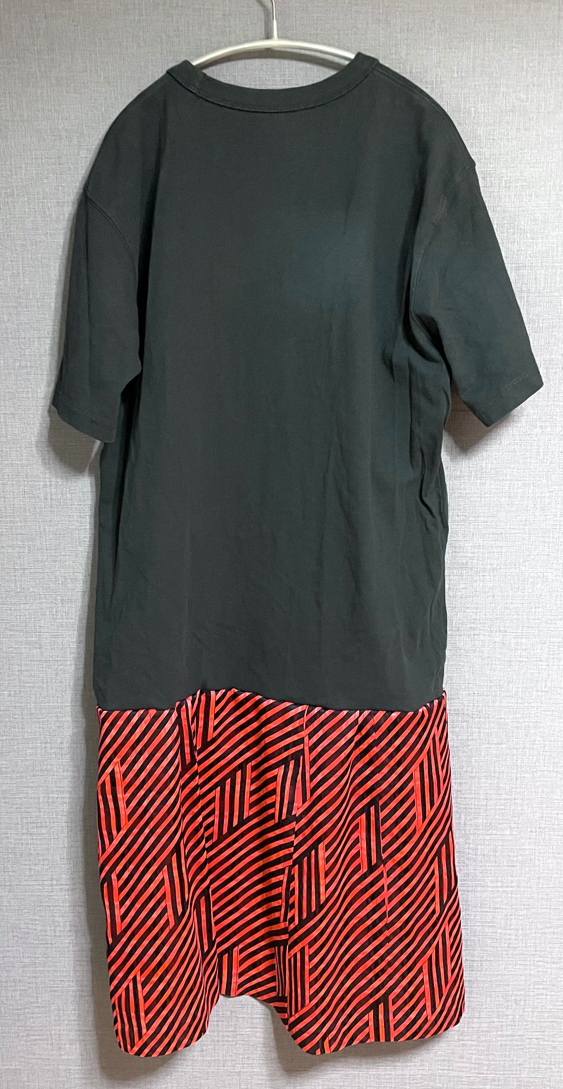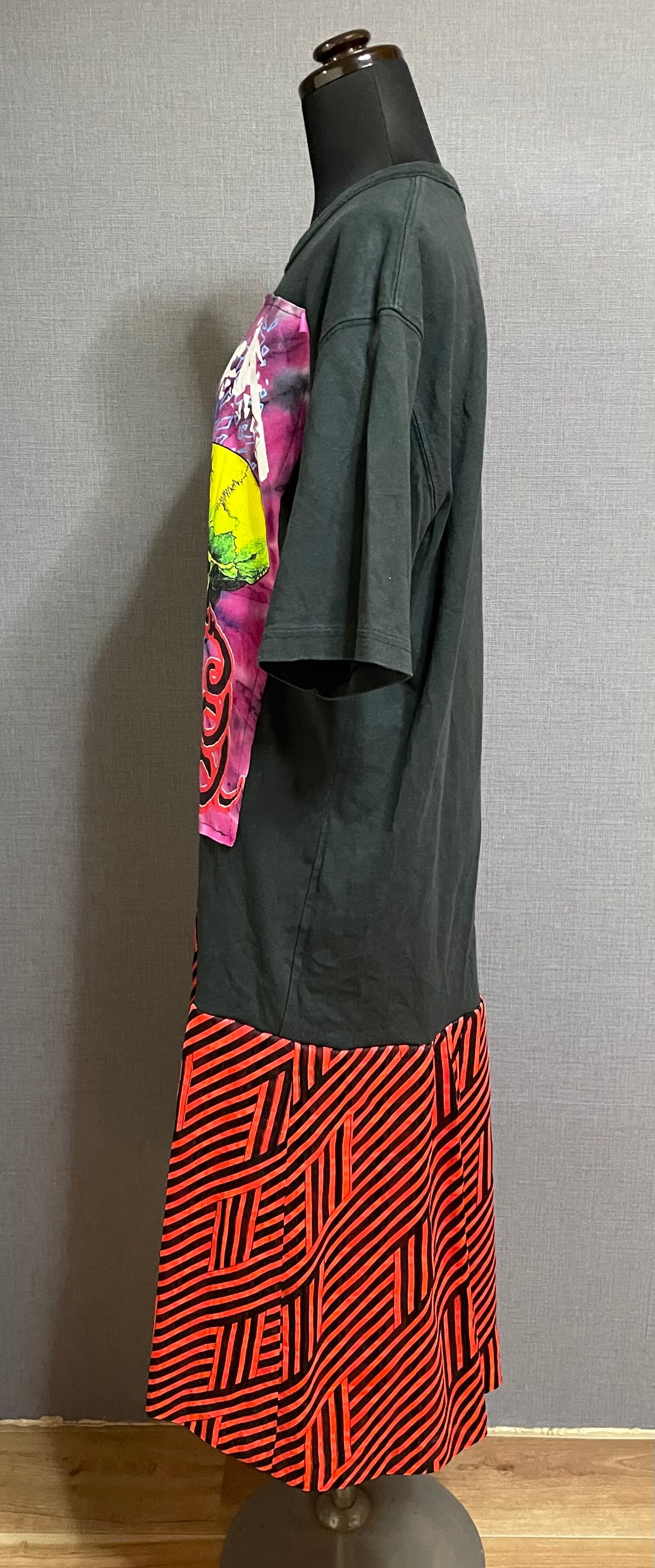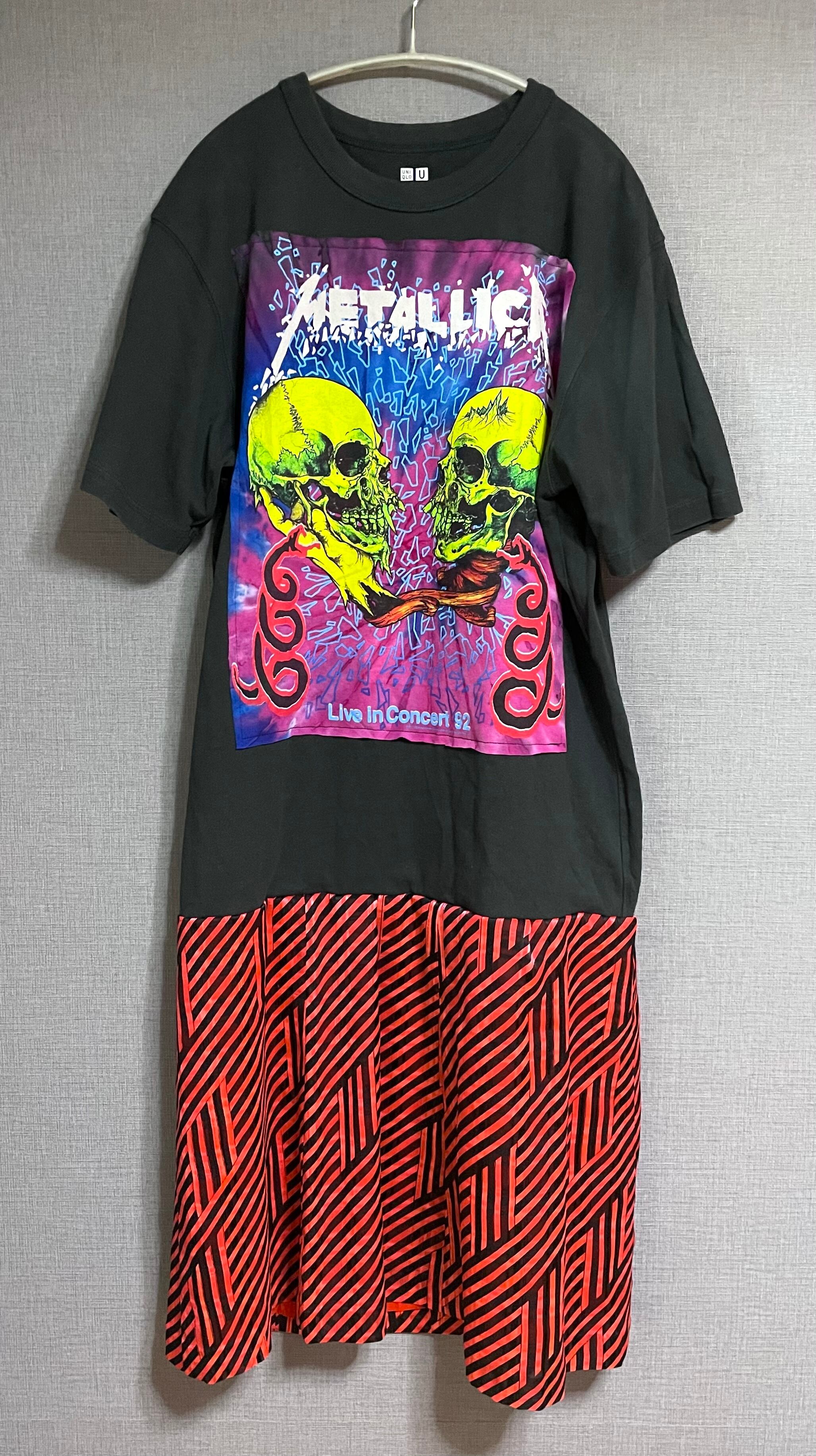 黒Tシャツにドクロくんを縫いつけ、柄スカートを合わせています♬