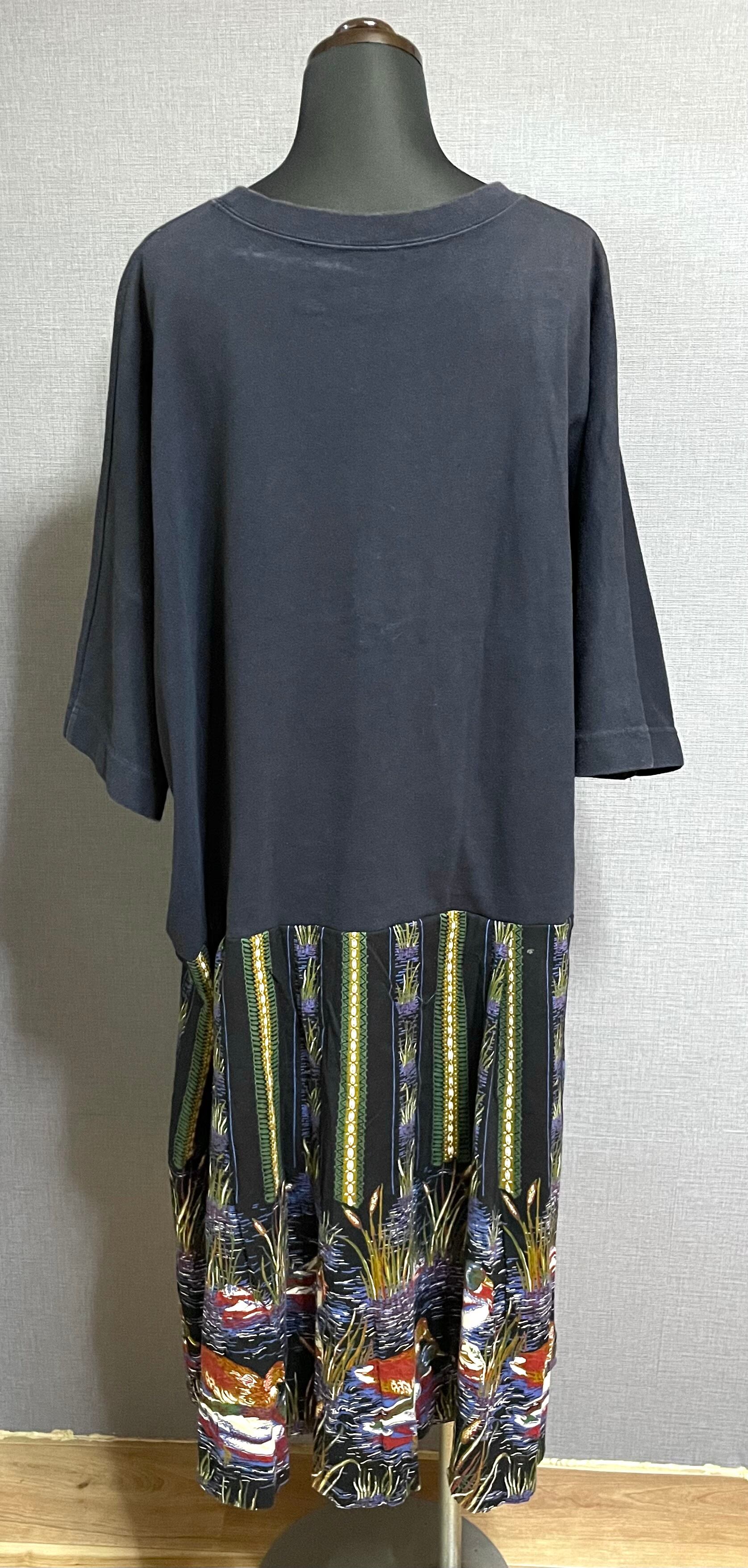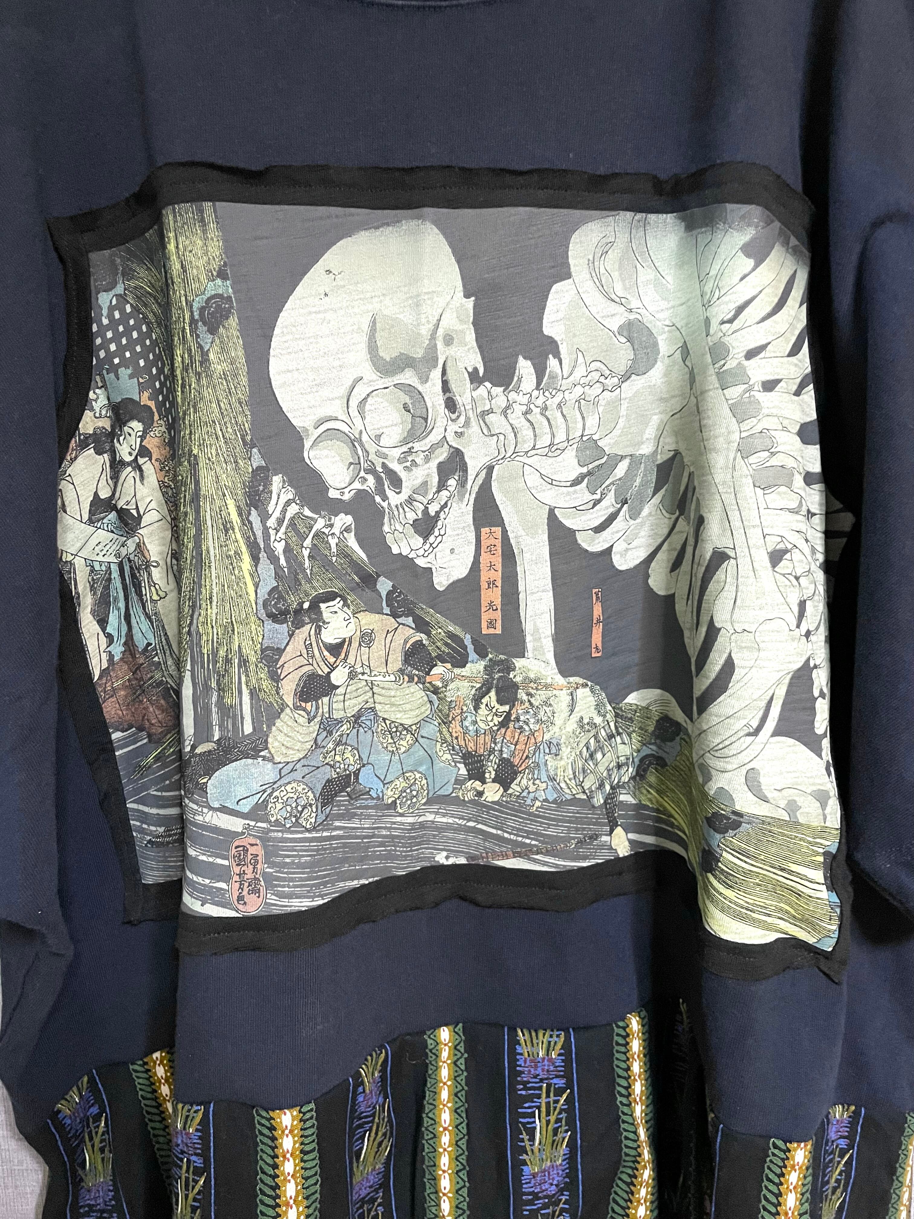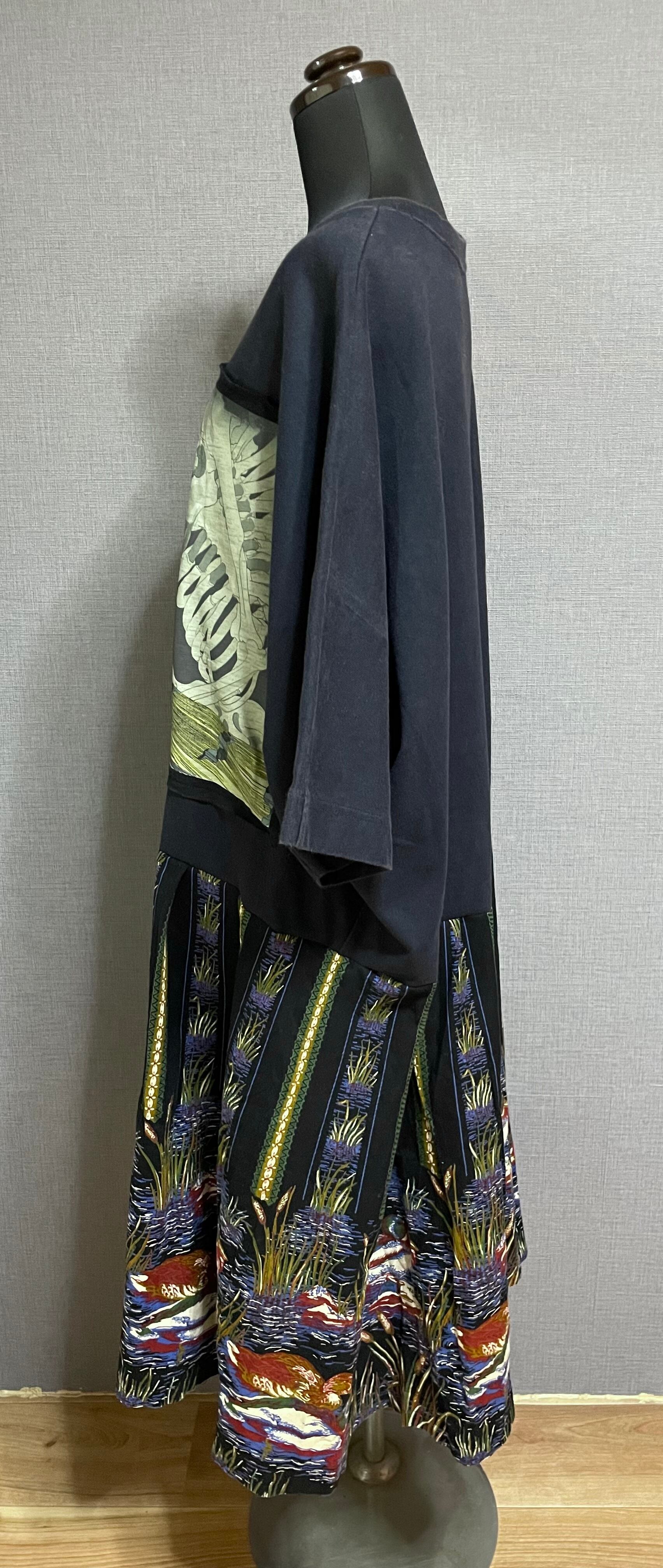 ネイビービッグTシャツに素晴らしいドクロを縫いつけ、可愛らしい鴨柄スカートを合わせています♬