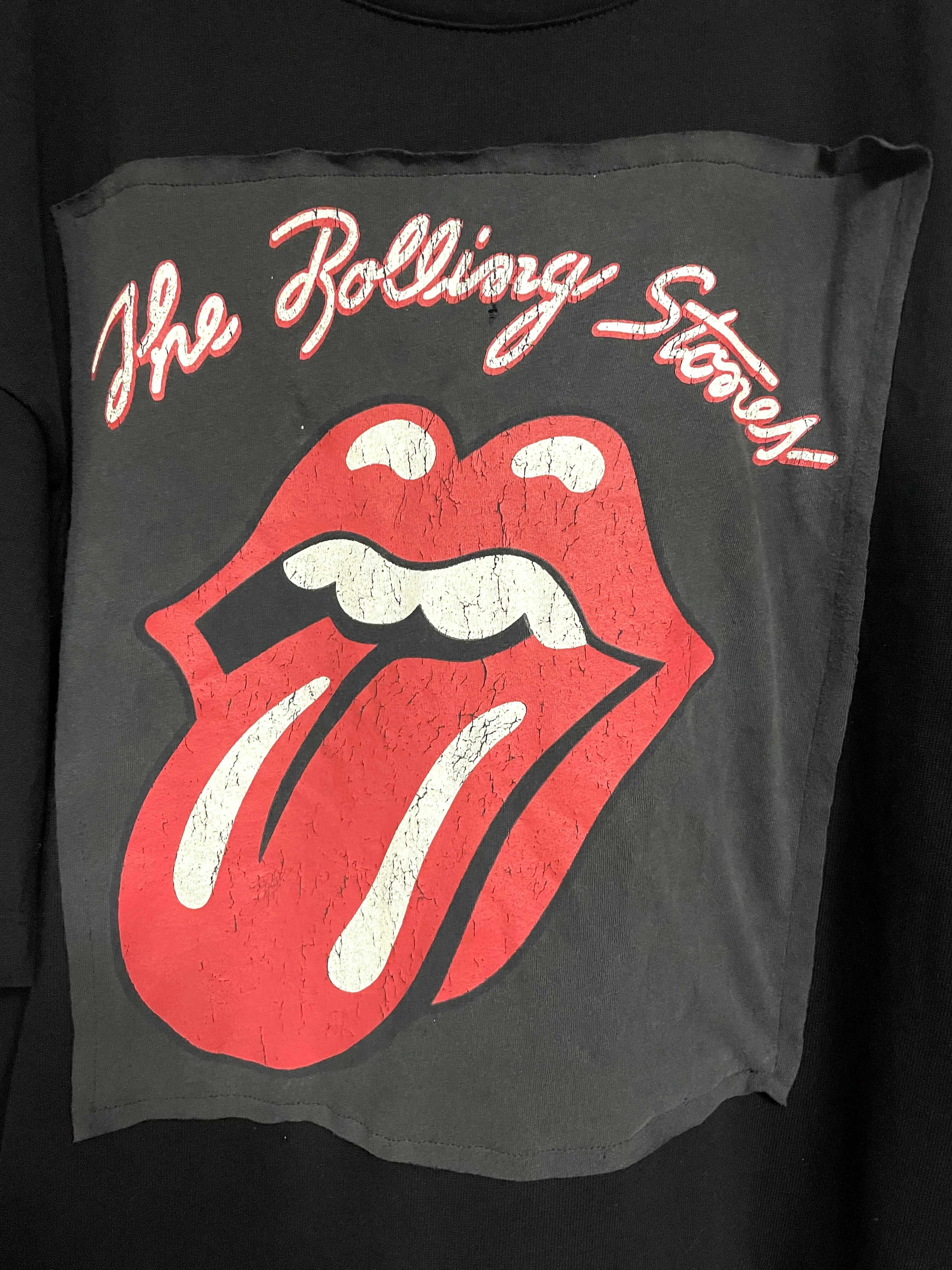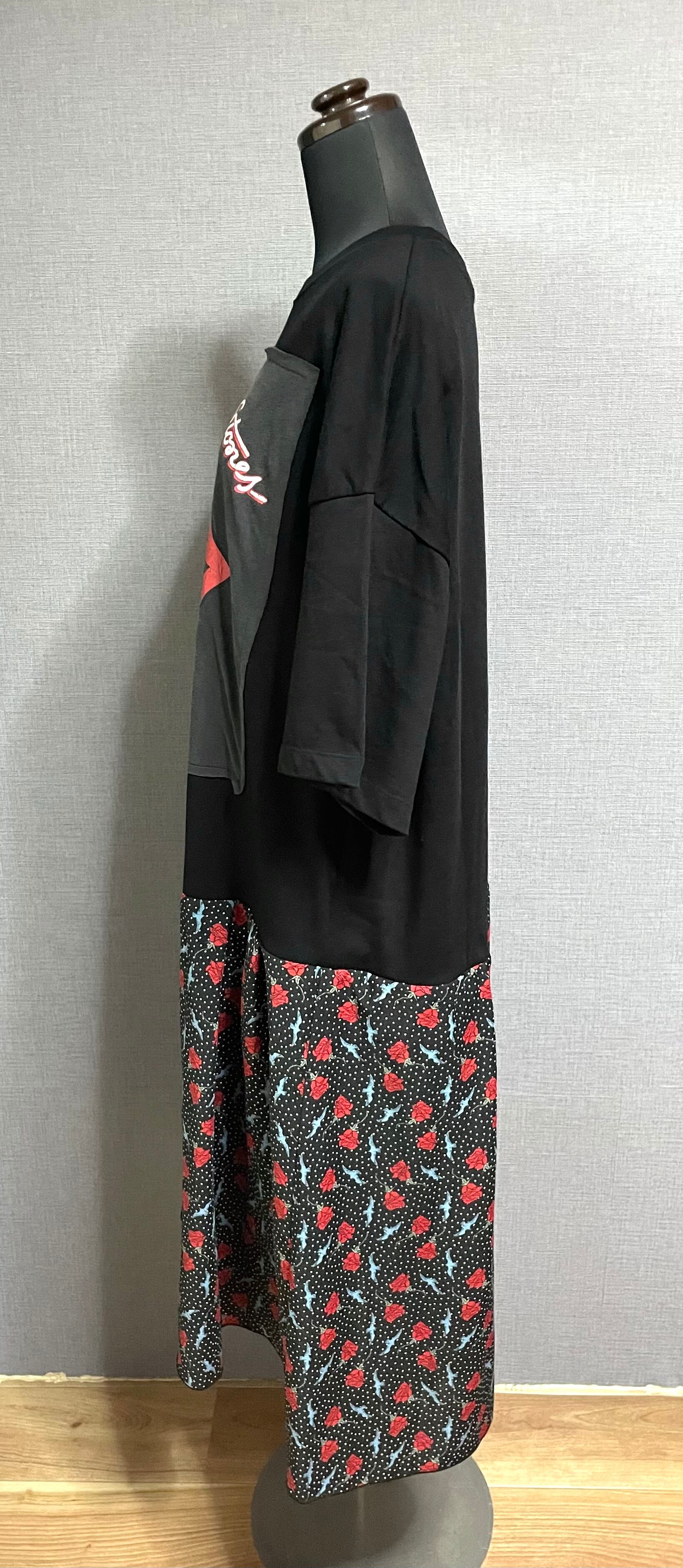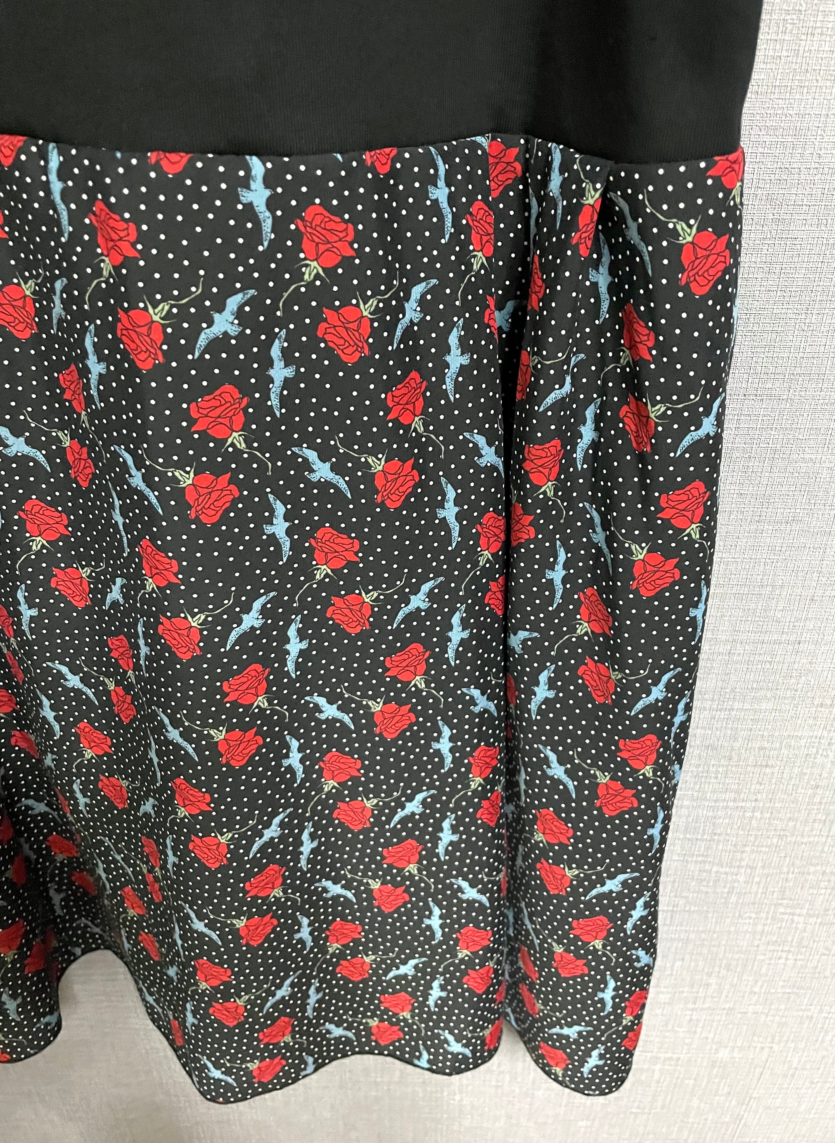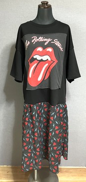 黒Tシャツにベロを縫いつけ、薔薇と鳥のスカートを合わせています♬