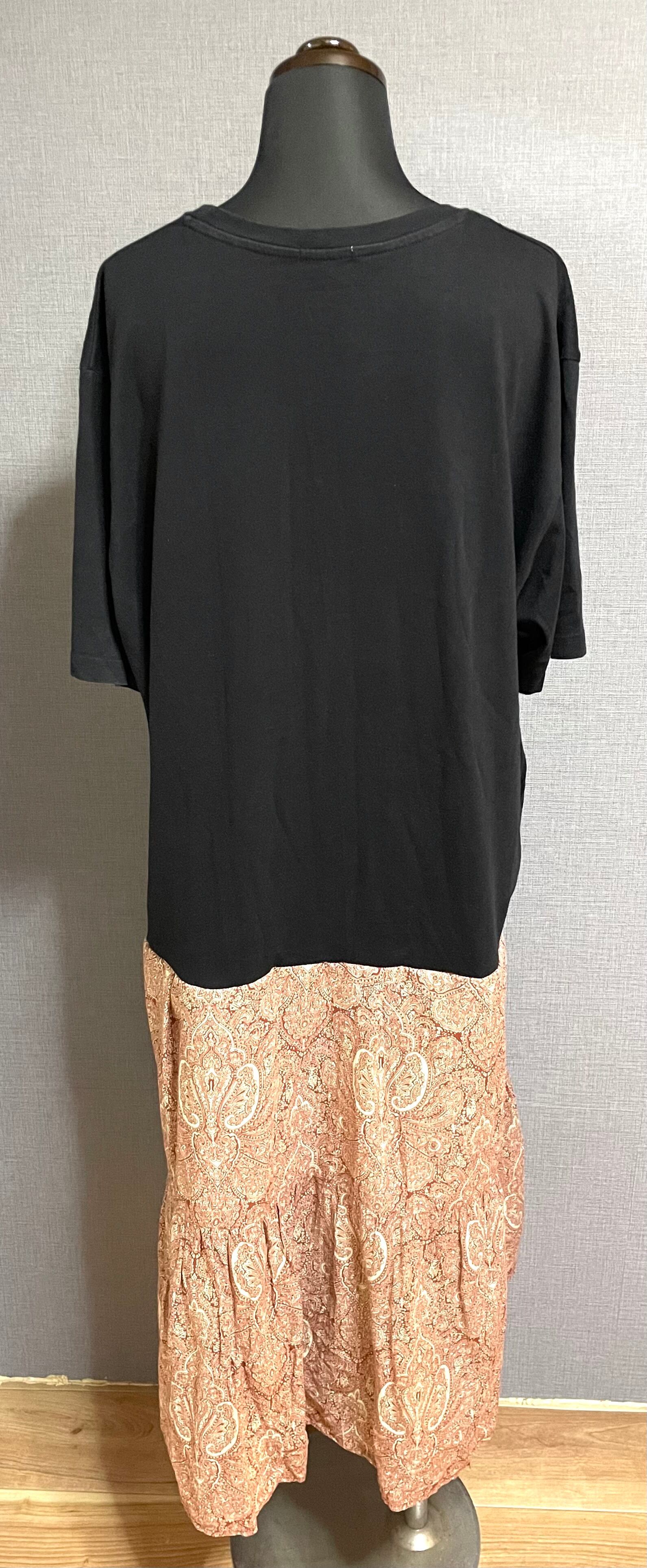 かわいいプリント黒Tシャツに、柄スカートを合わせています♬