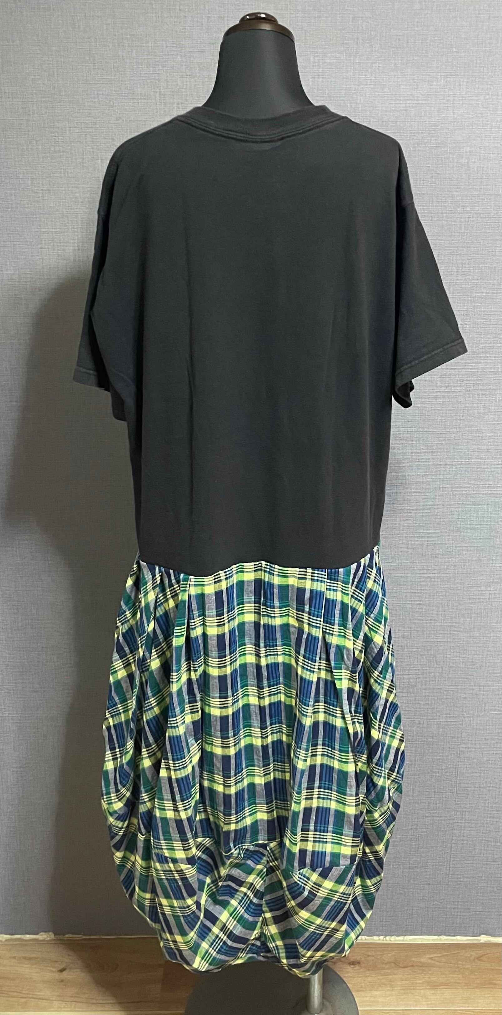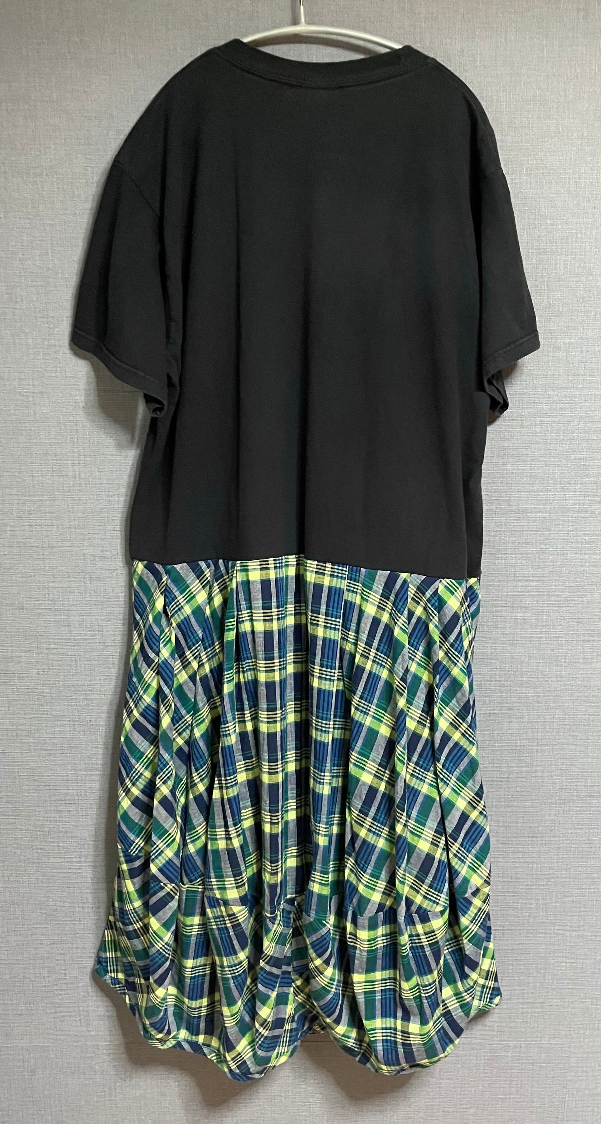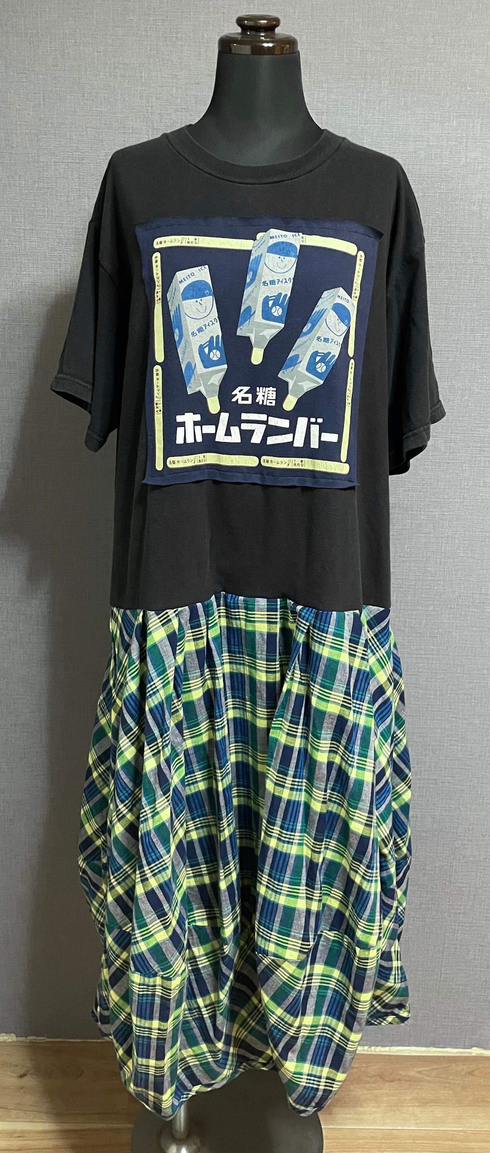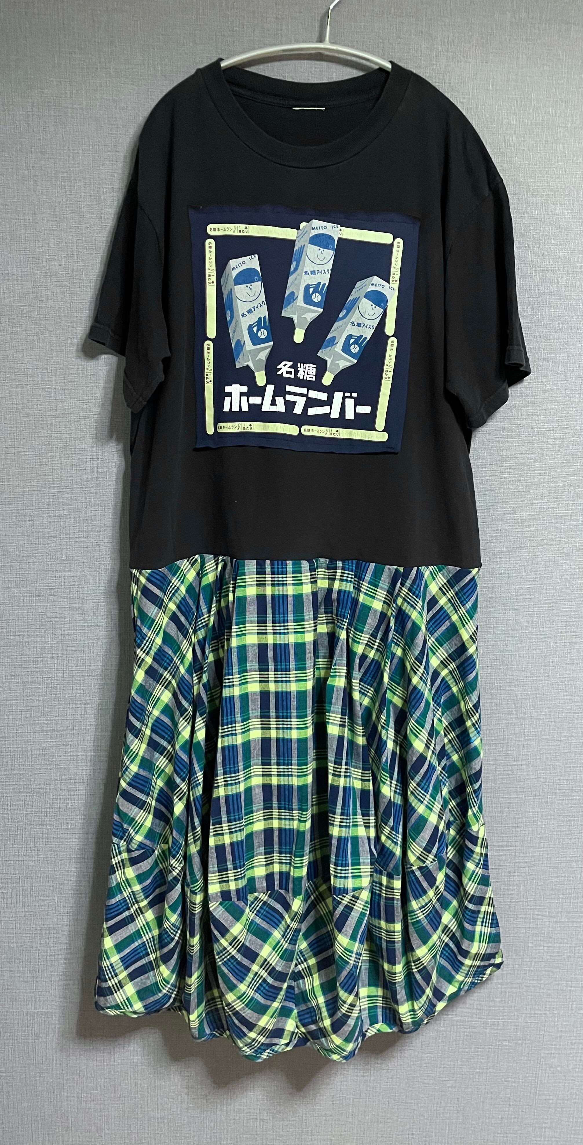 黒Tシャツに可愛らしいアイスを縫いつけ、チェック柄スカートを合わせています♬