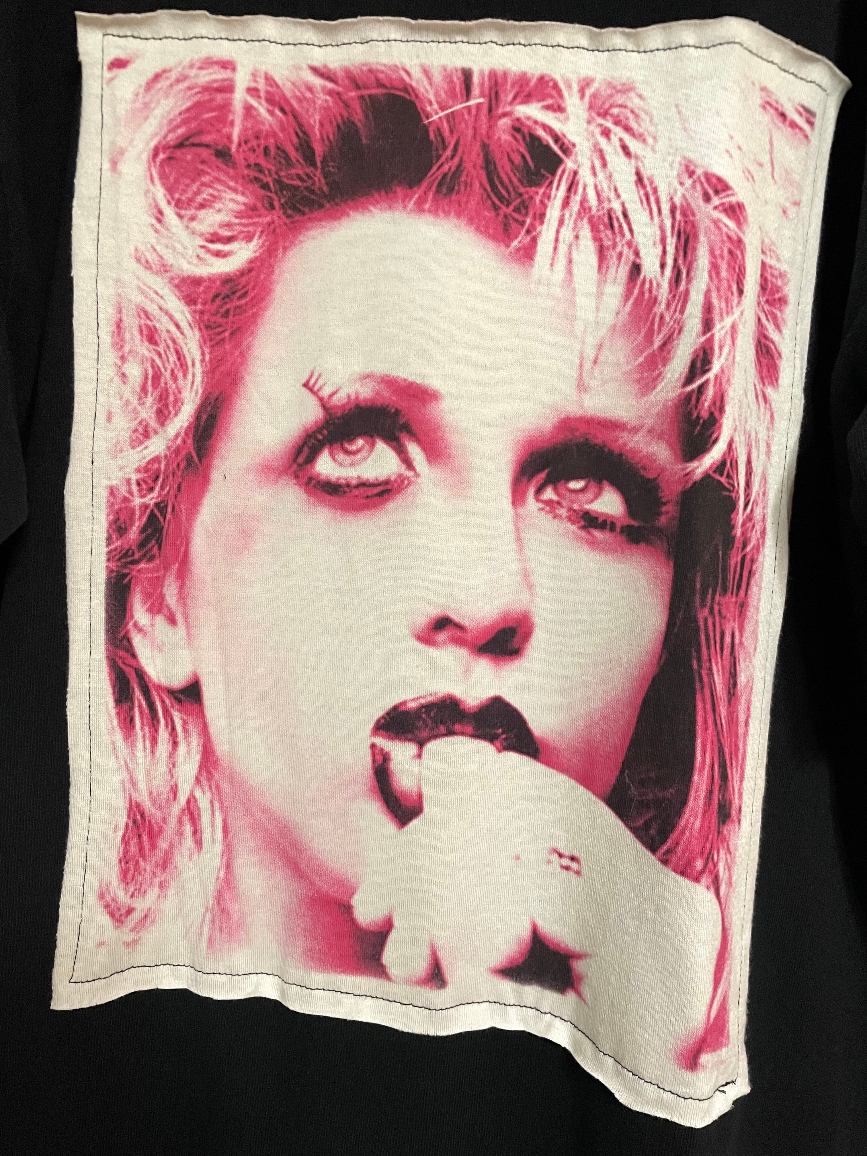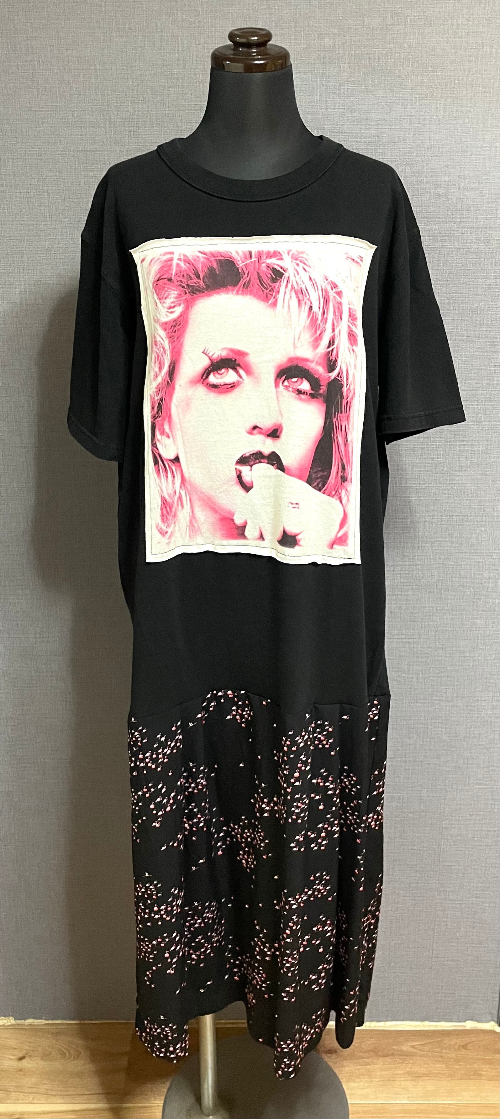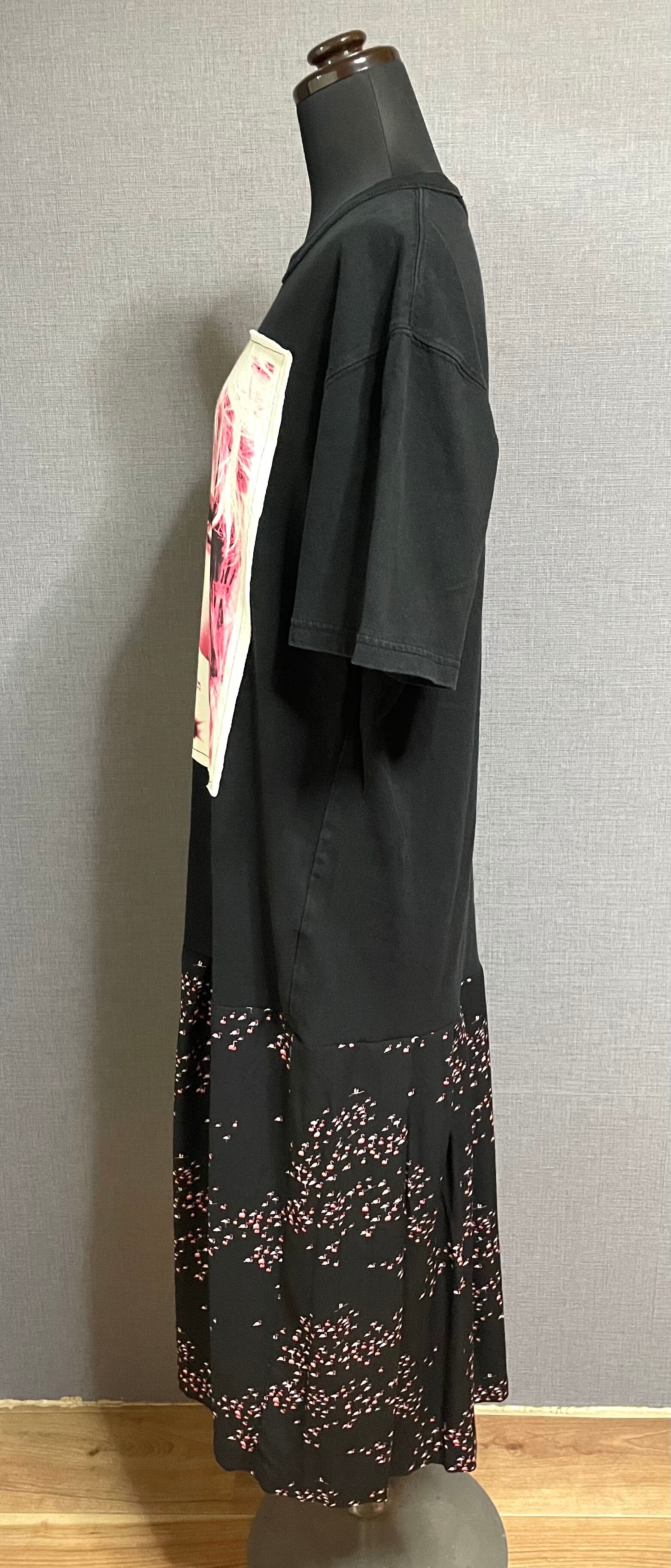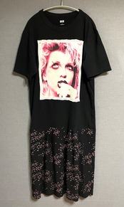 黒Tシャツにかっこいい女子を縫いつけ、フラミンゴ柄のスカートを合わせています♬