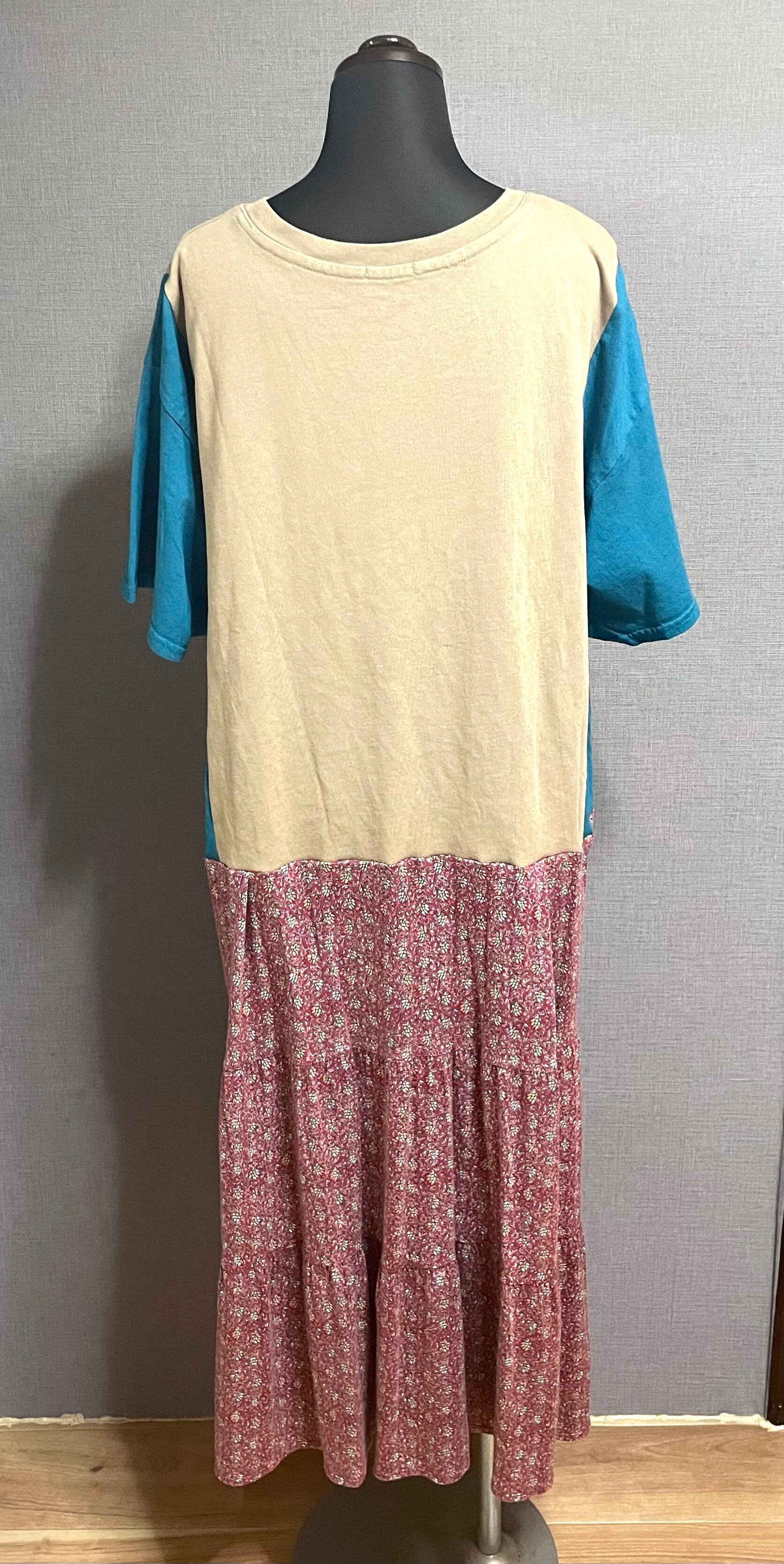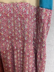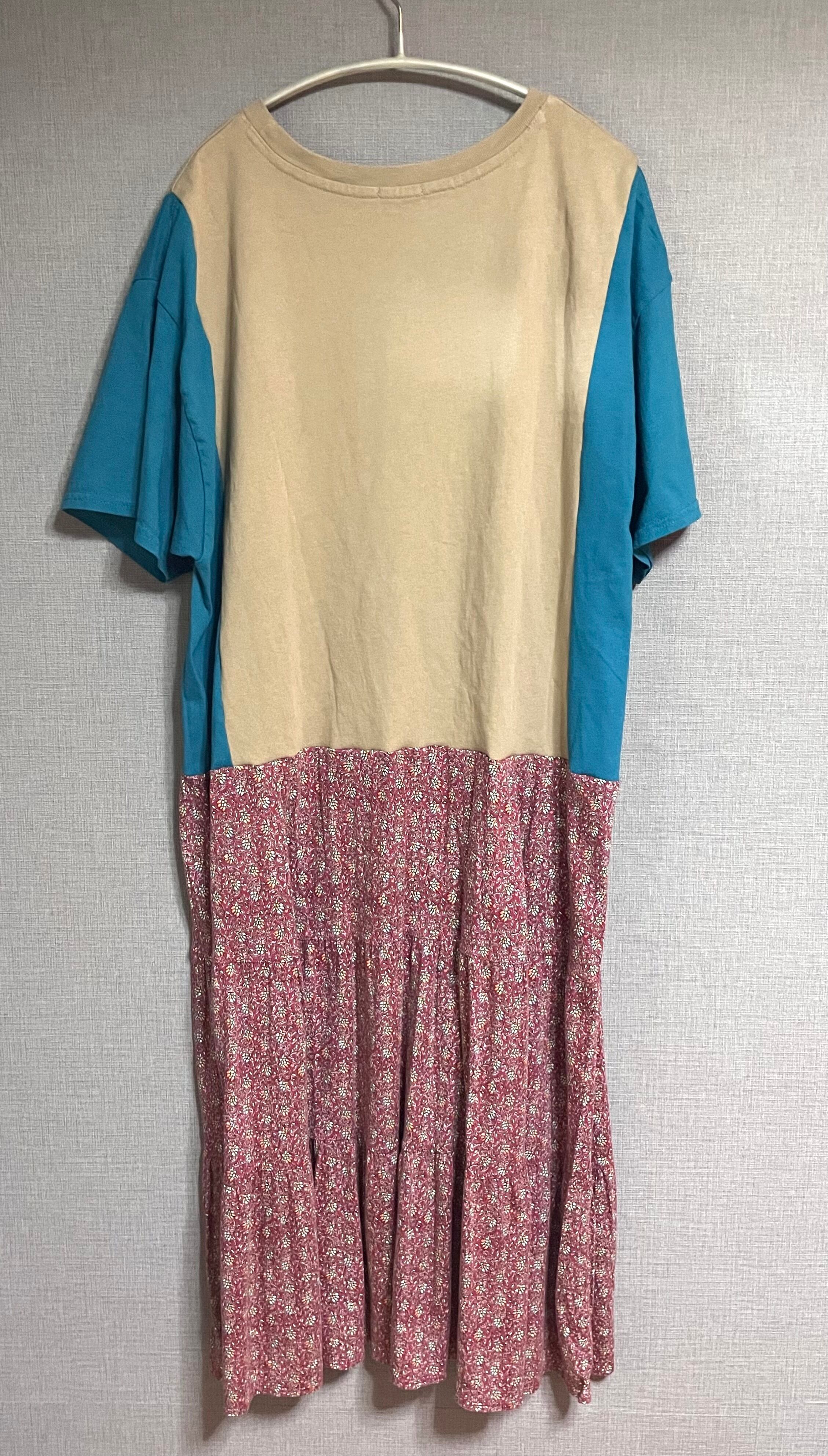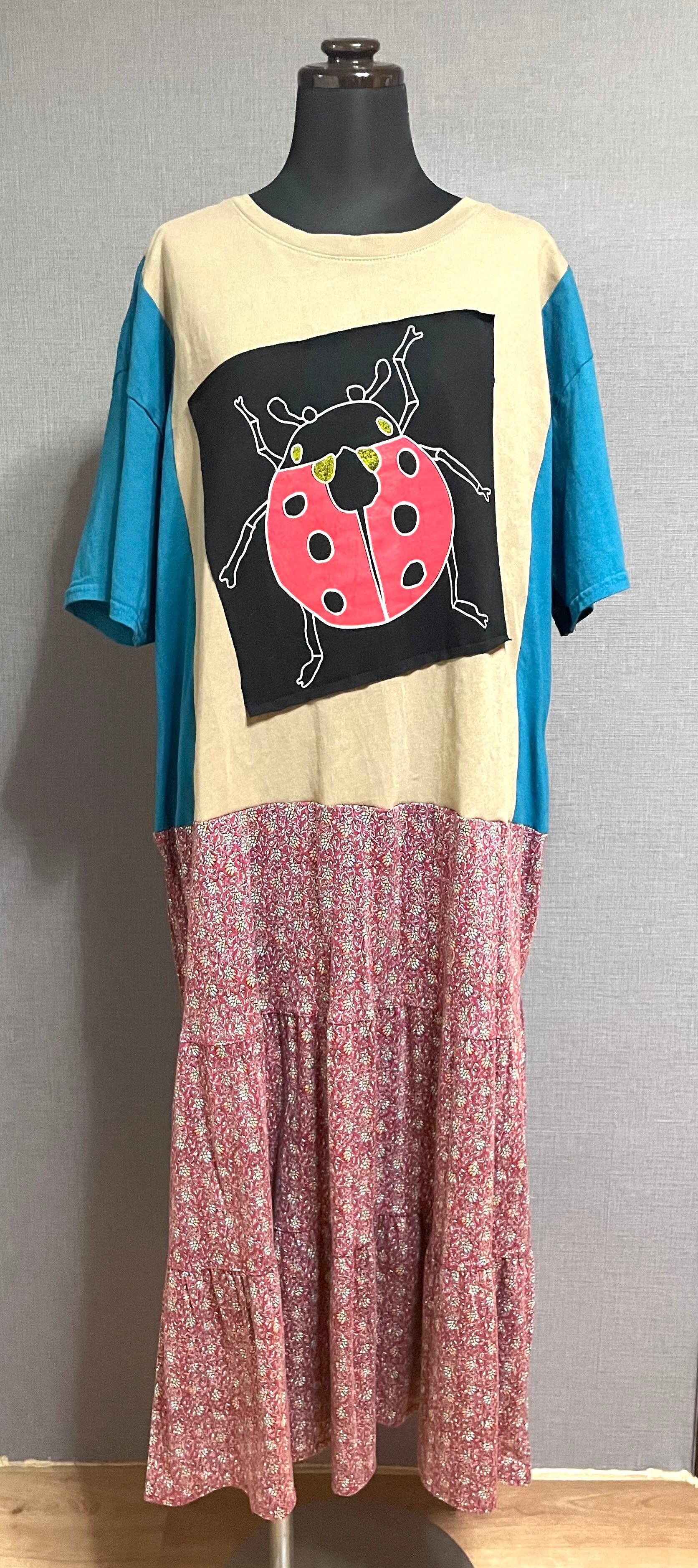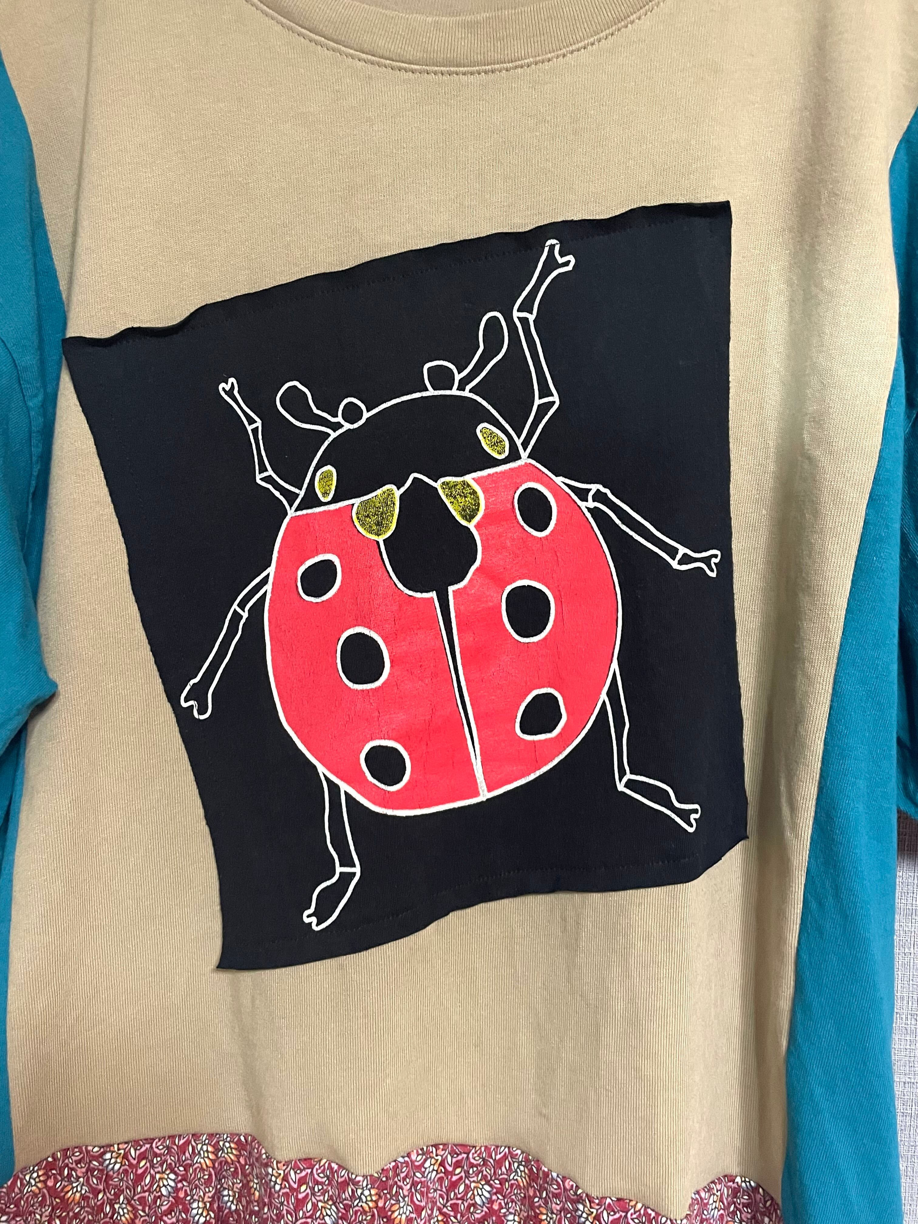 ベージュのTシャツにグリーンのようなブルーのようなきれいな色の袖を合わせ、てんとう虫を縫いつけ、柄スカートを合わせています♬