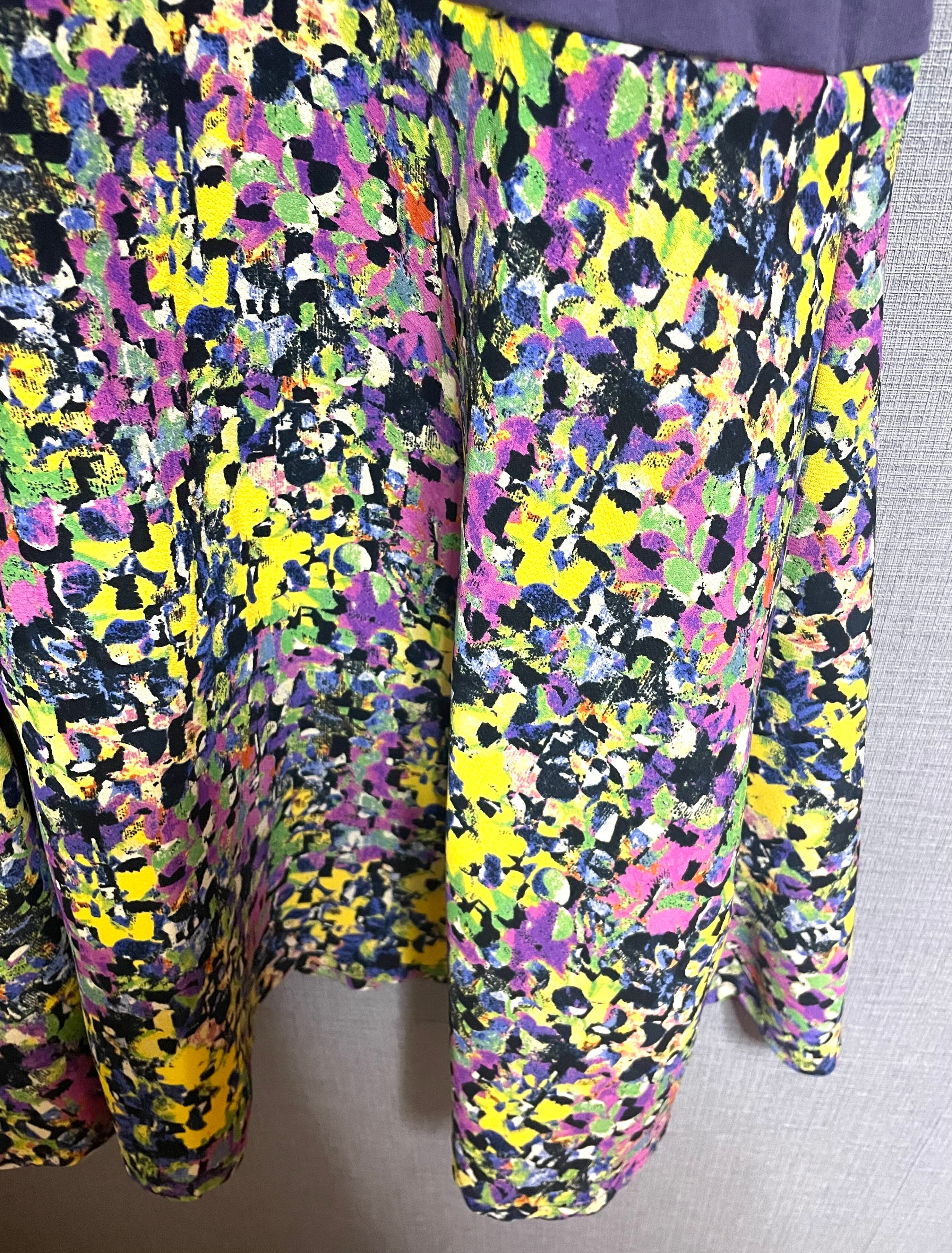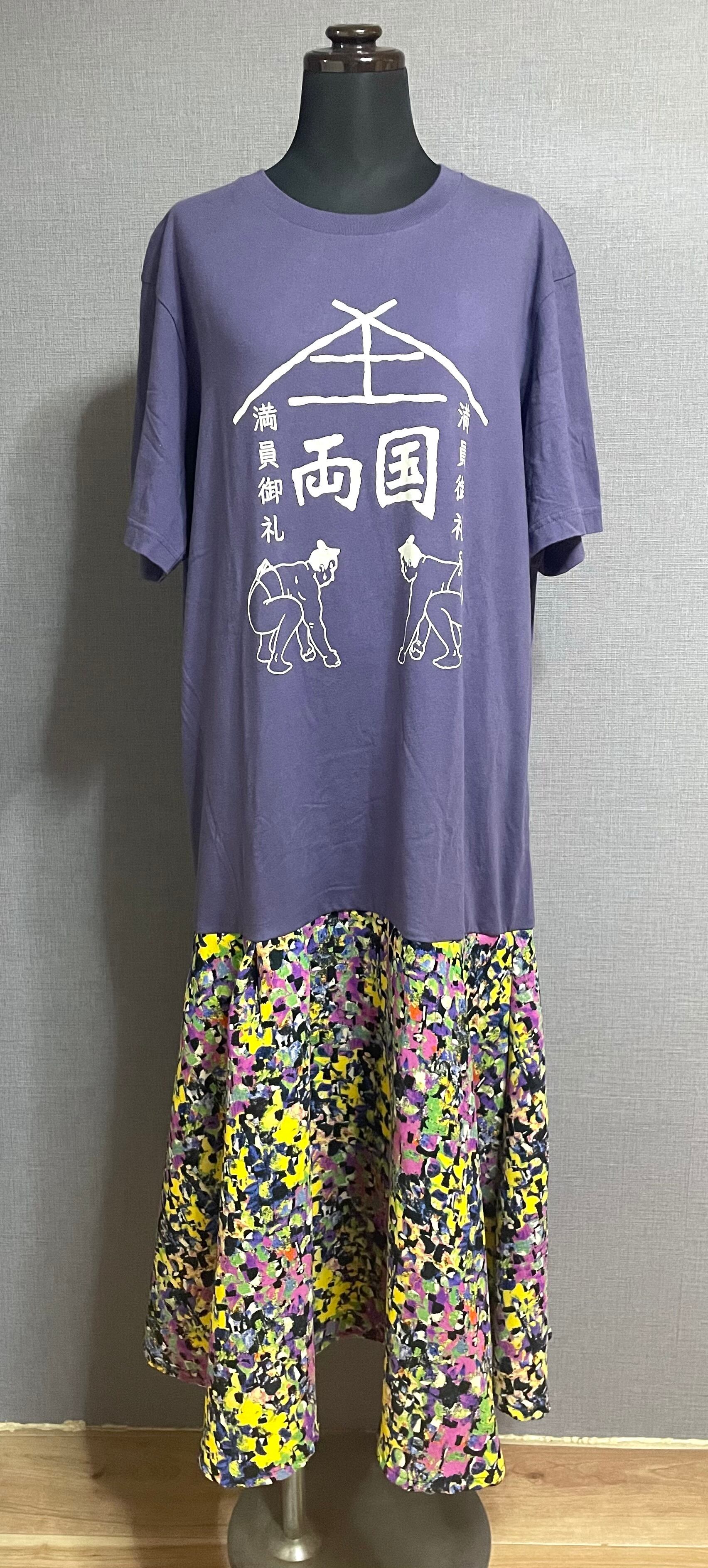 くすんだ感じの色味が素晴らしいおすもうTシャツに、絵の具で点々としたような柄スカートを合わせています♬