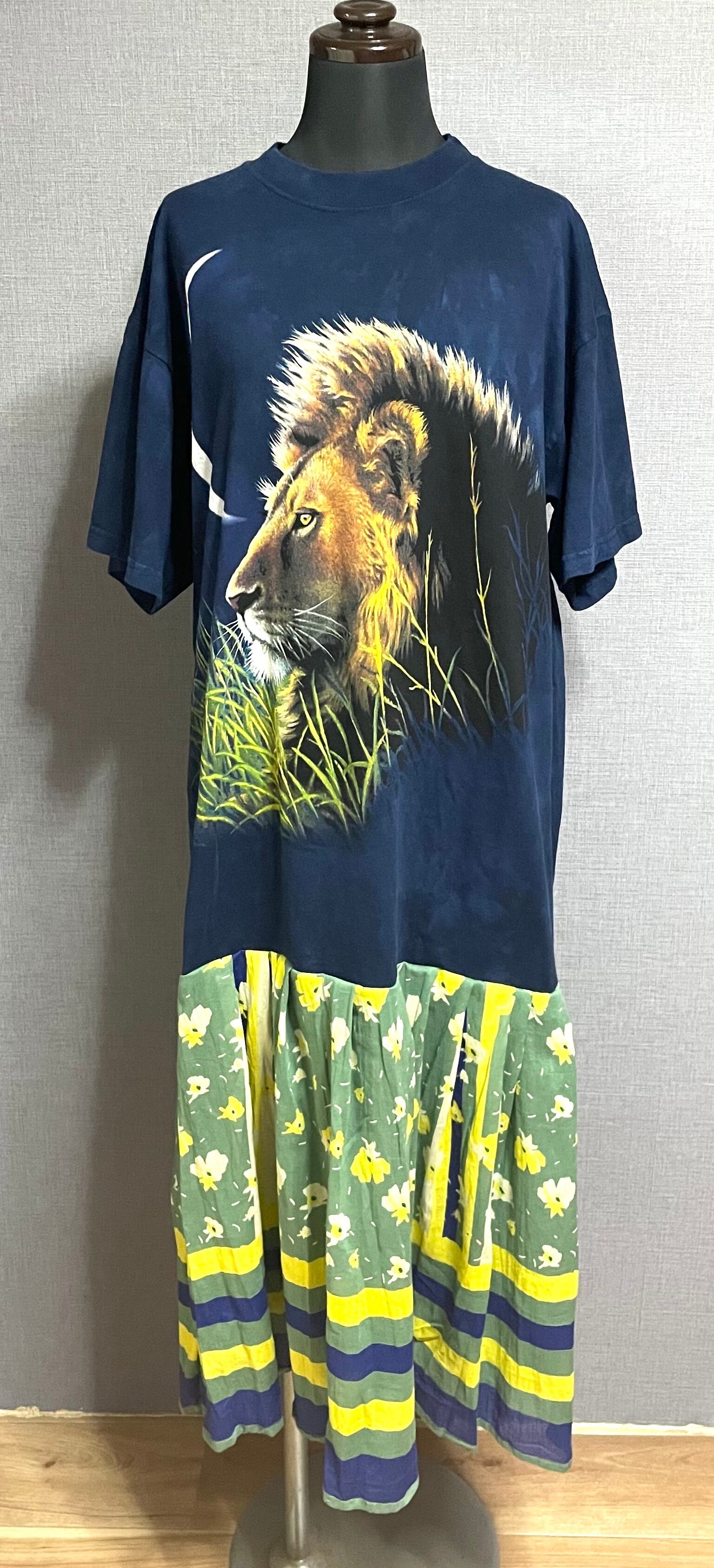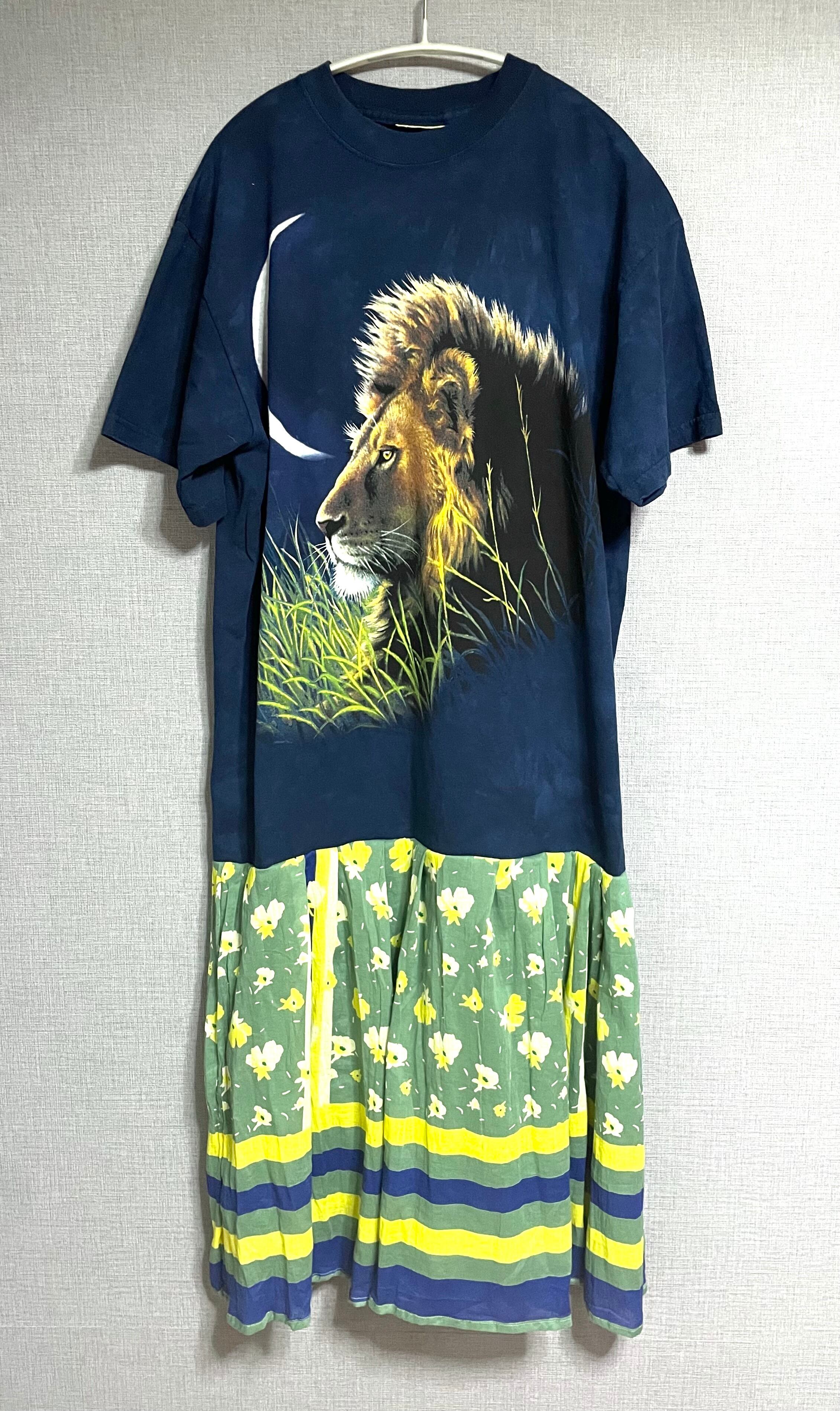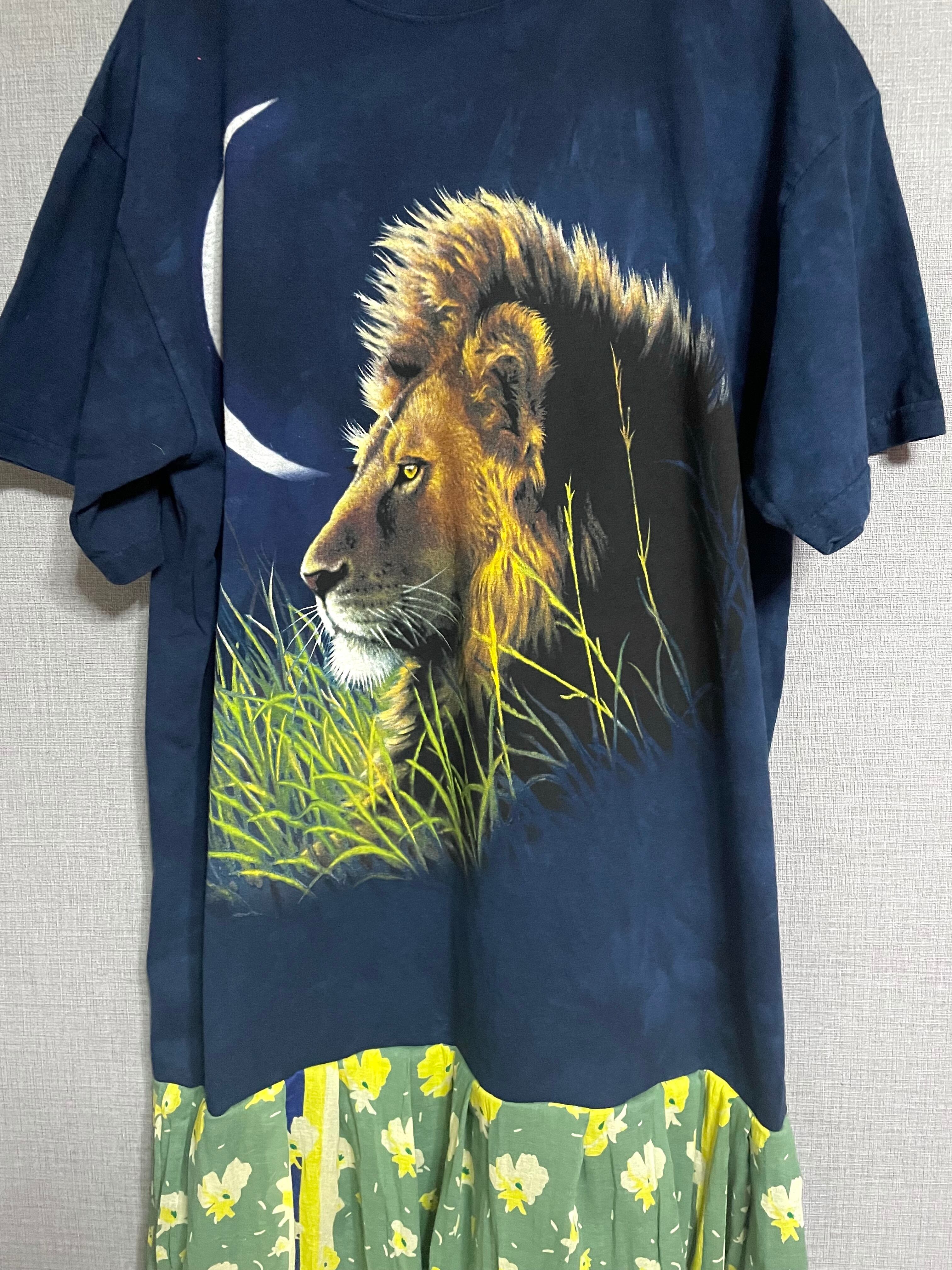 三日月とライオンがプリントされたネイビーのタイダイTシャツに、薄手の柄スカートを合わせています♬
