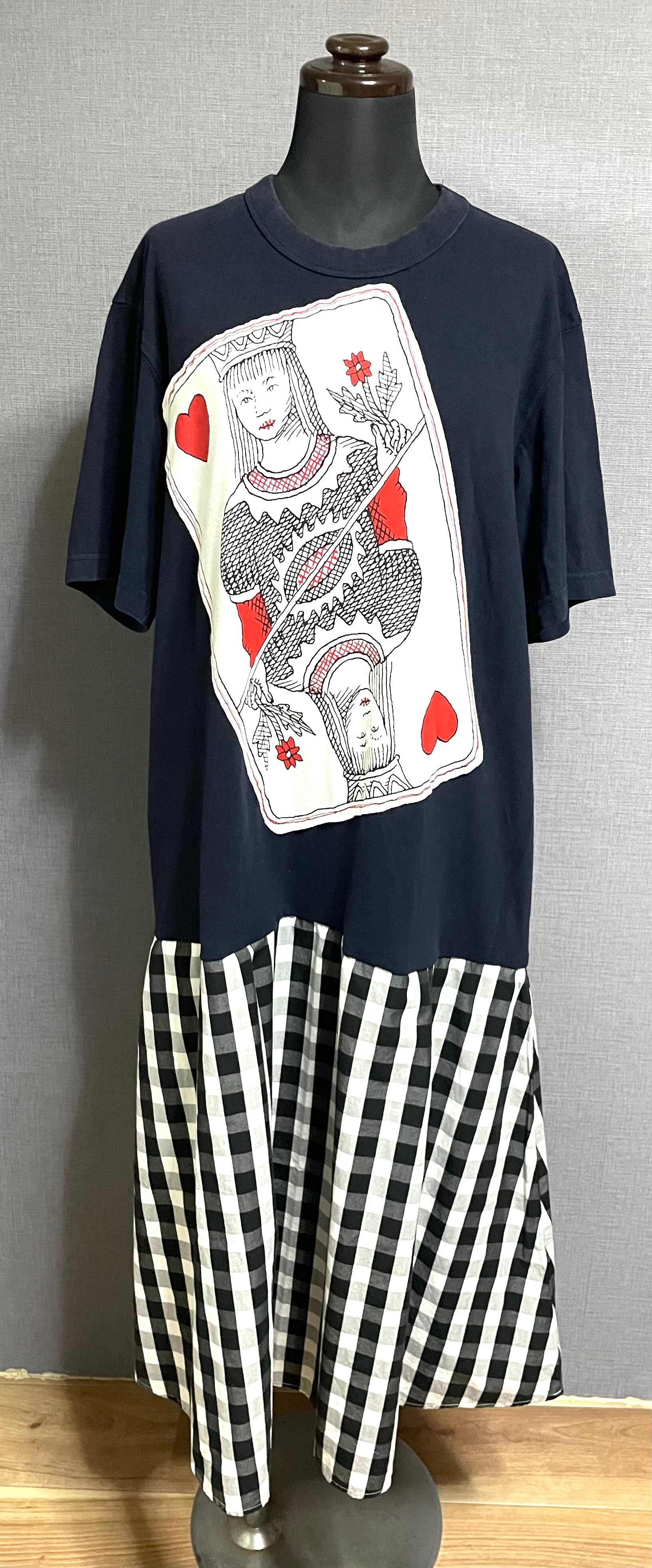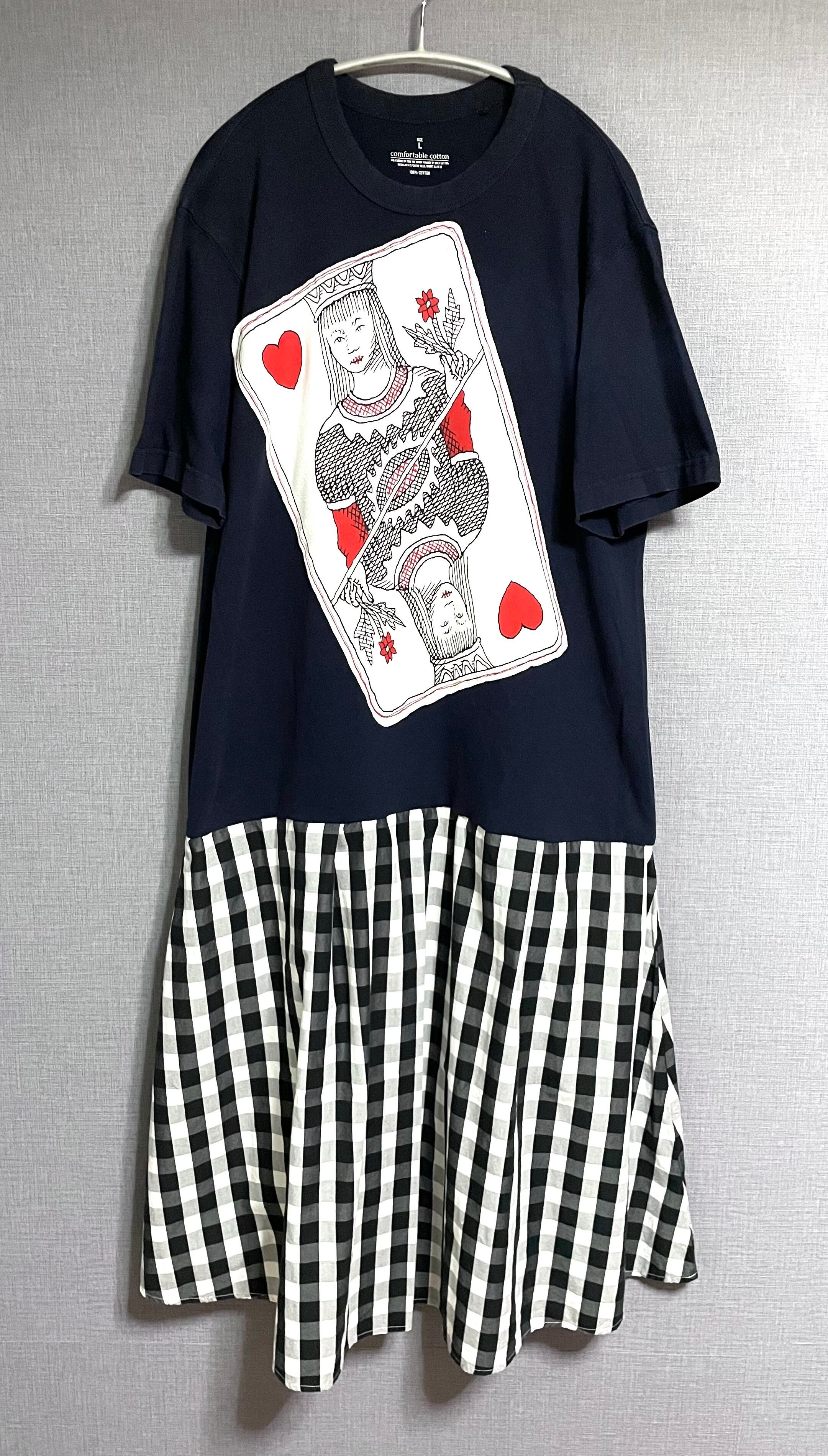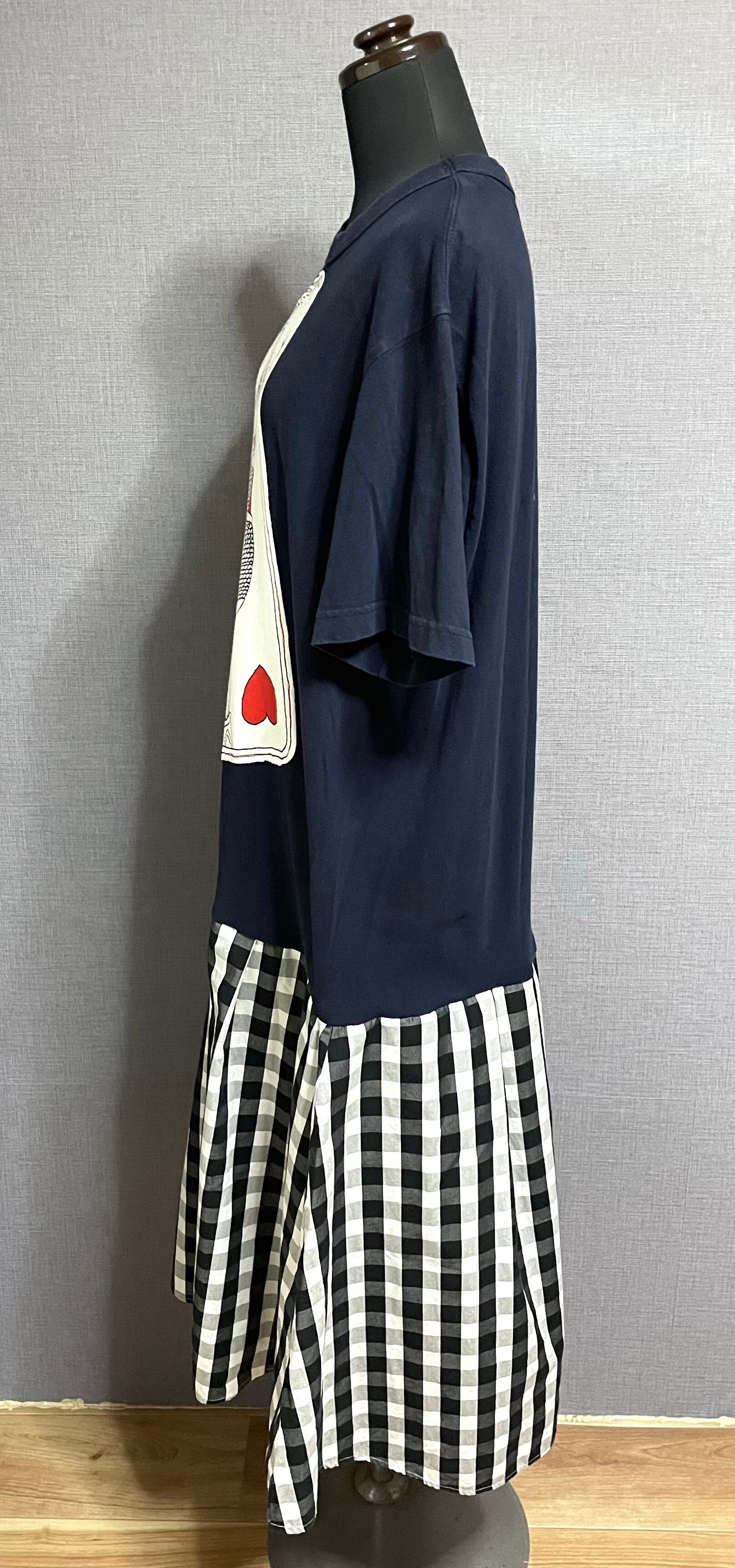ネイビーTシャツにトランプ柄を縫いつけ、チェック柄スカートを合わせています♬