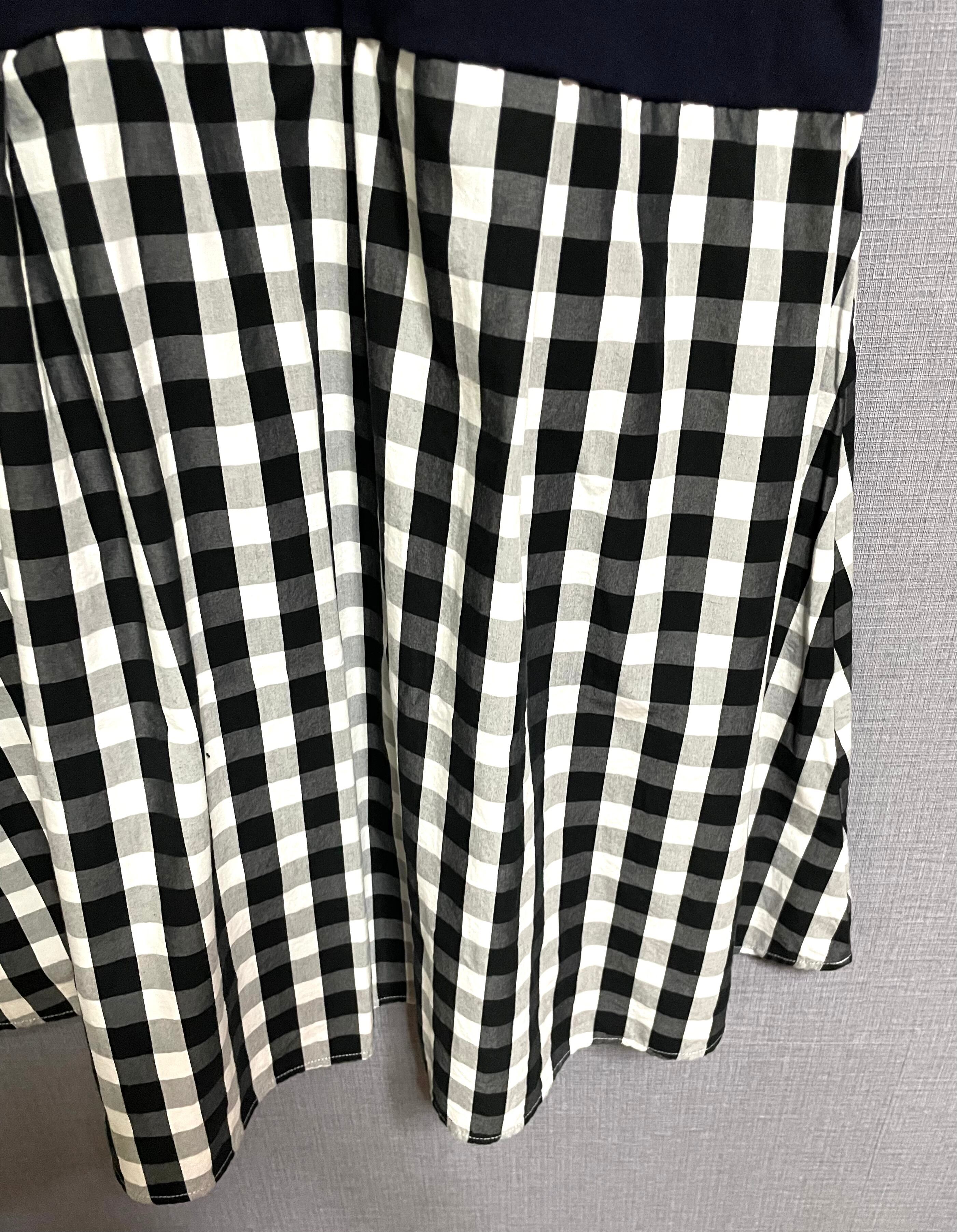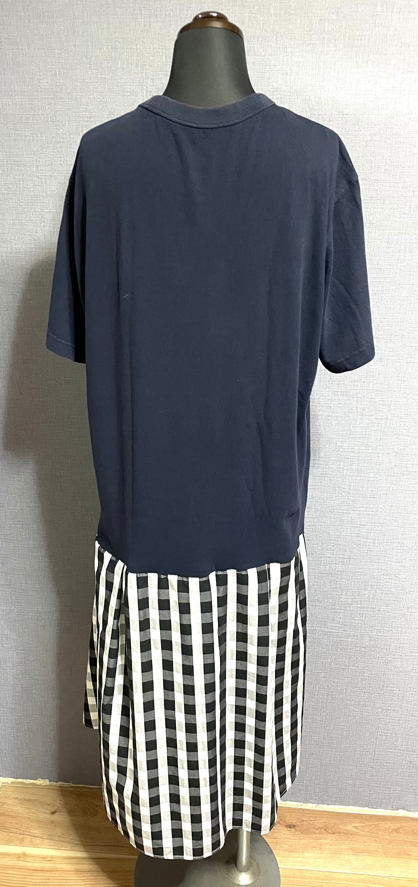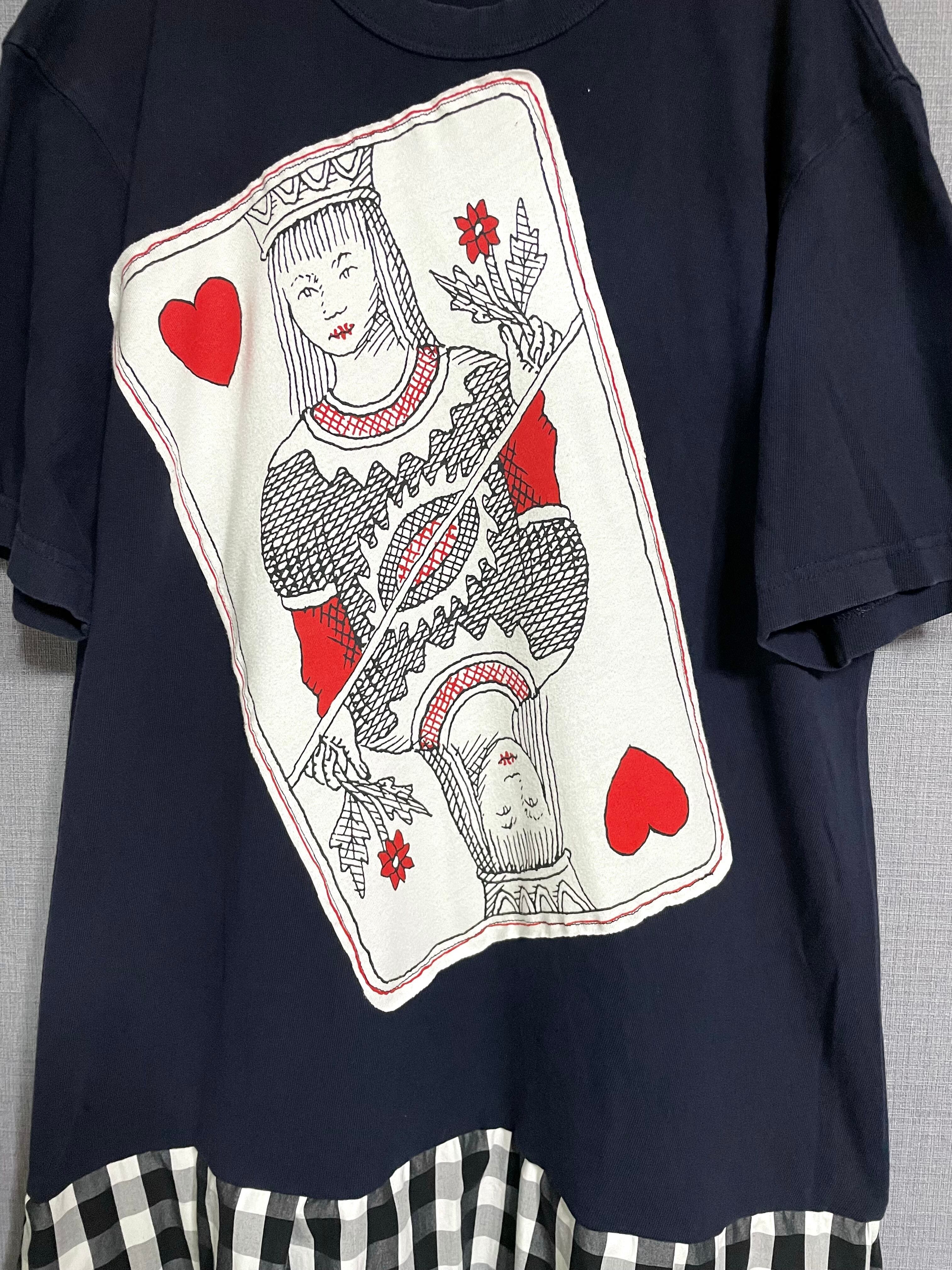 ネイビーTシャツにトランプ柄を縫いつけ、チェック柄スカートを合わせています♬