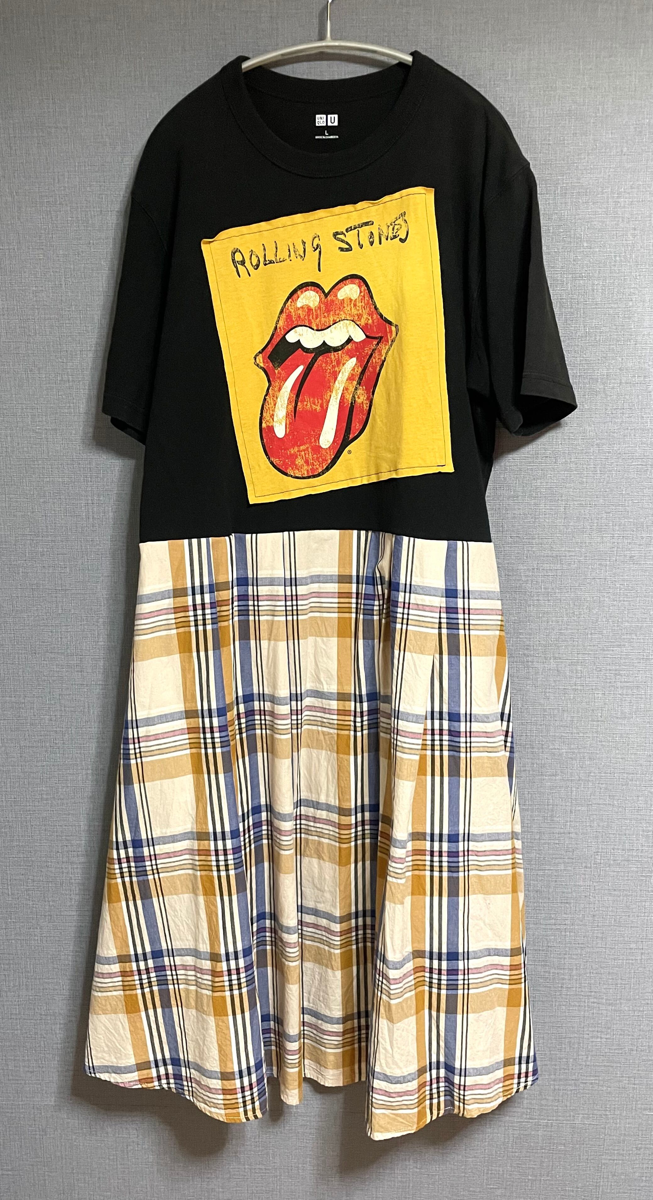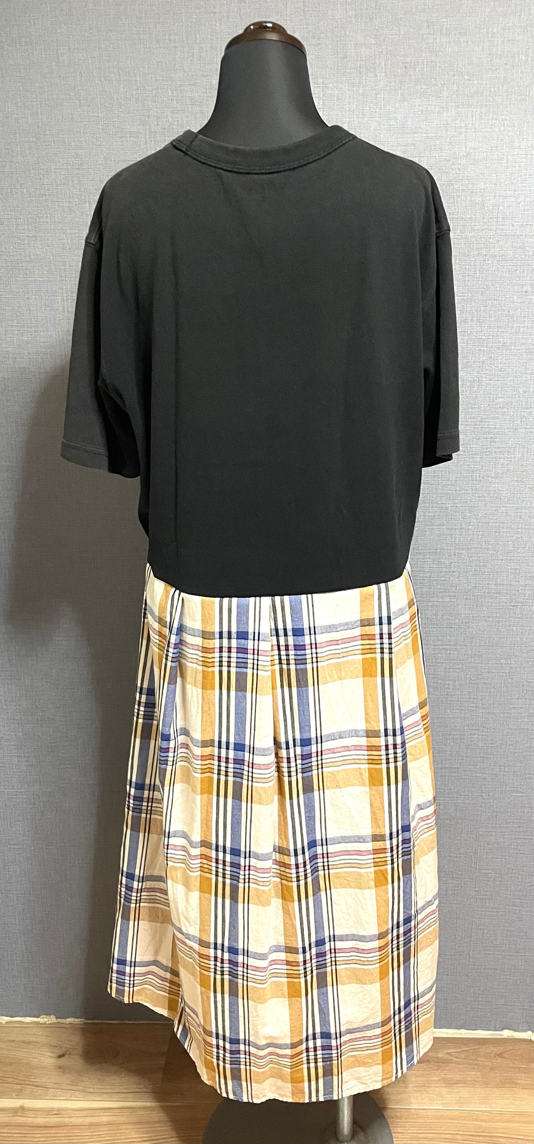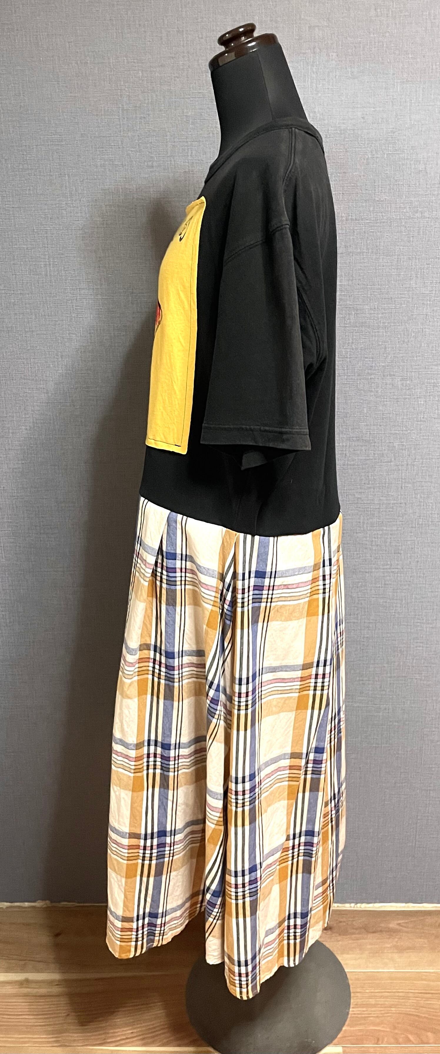 黒Tシャツに掠れたプリントがかわいいベロを縫いつけ、チェック柄スカートを合わせています♬