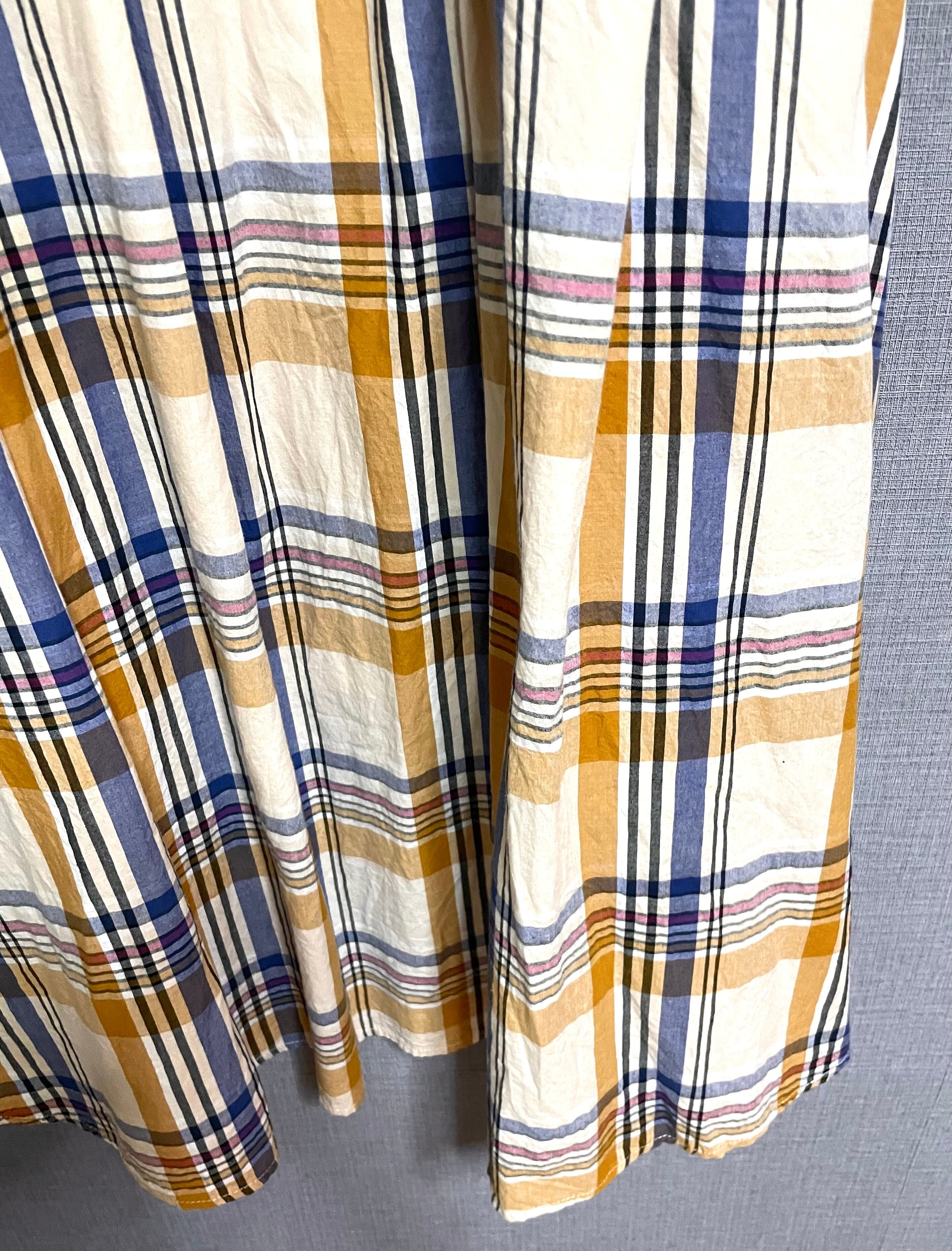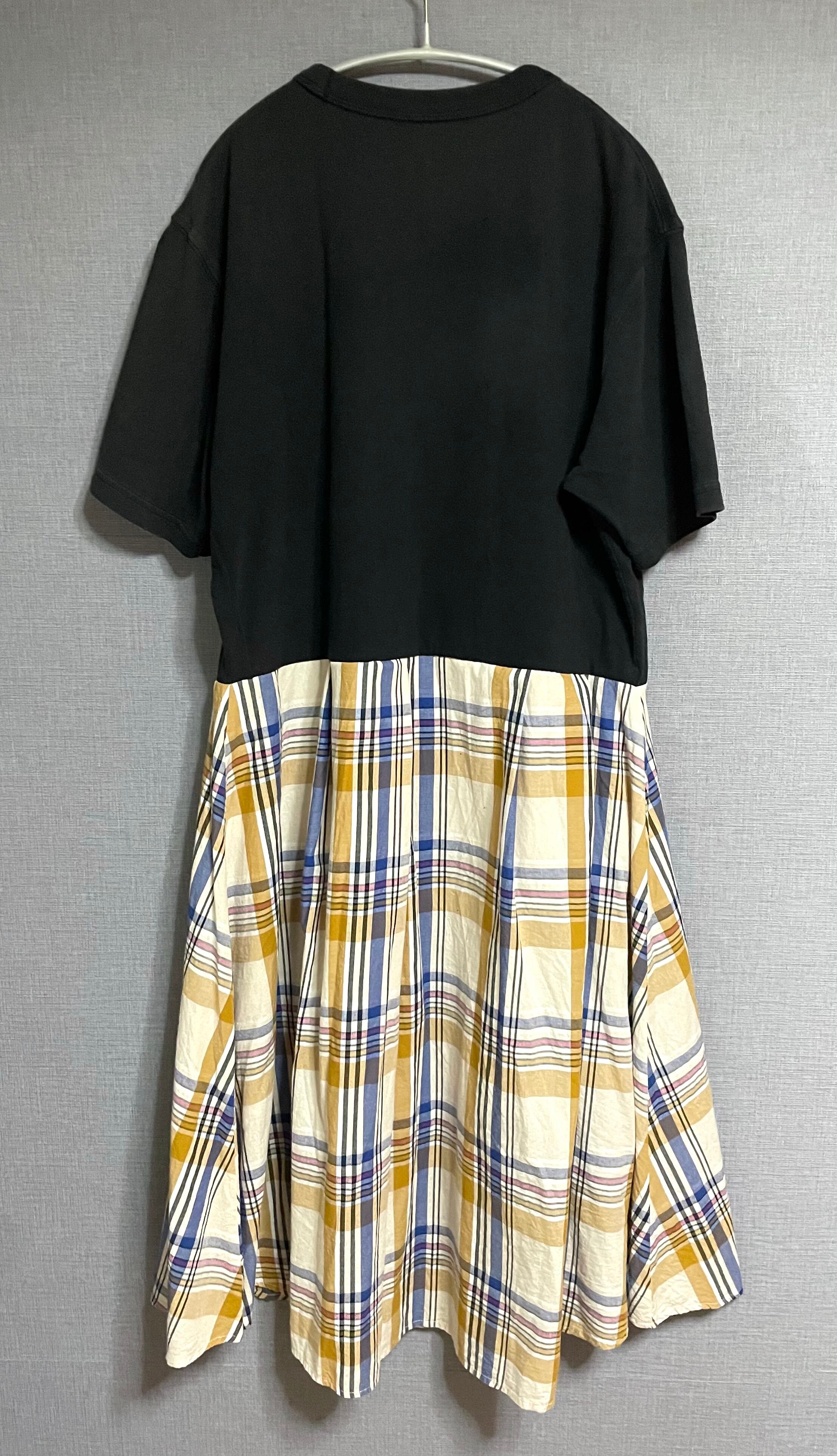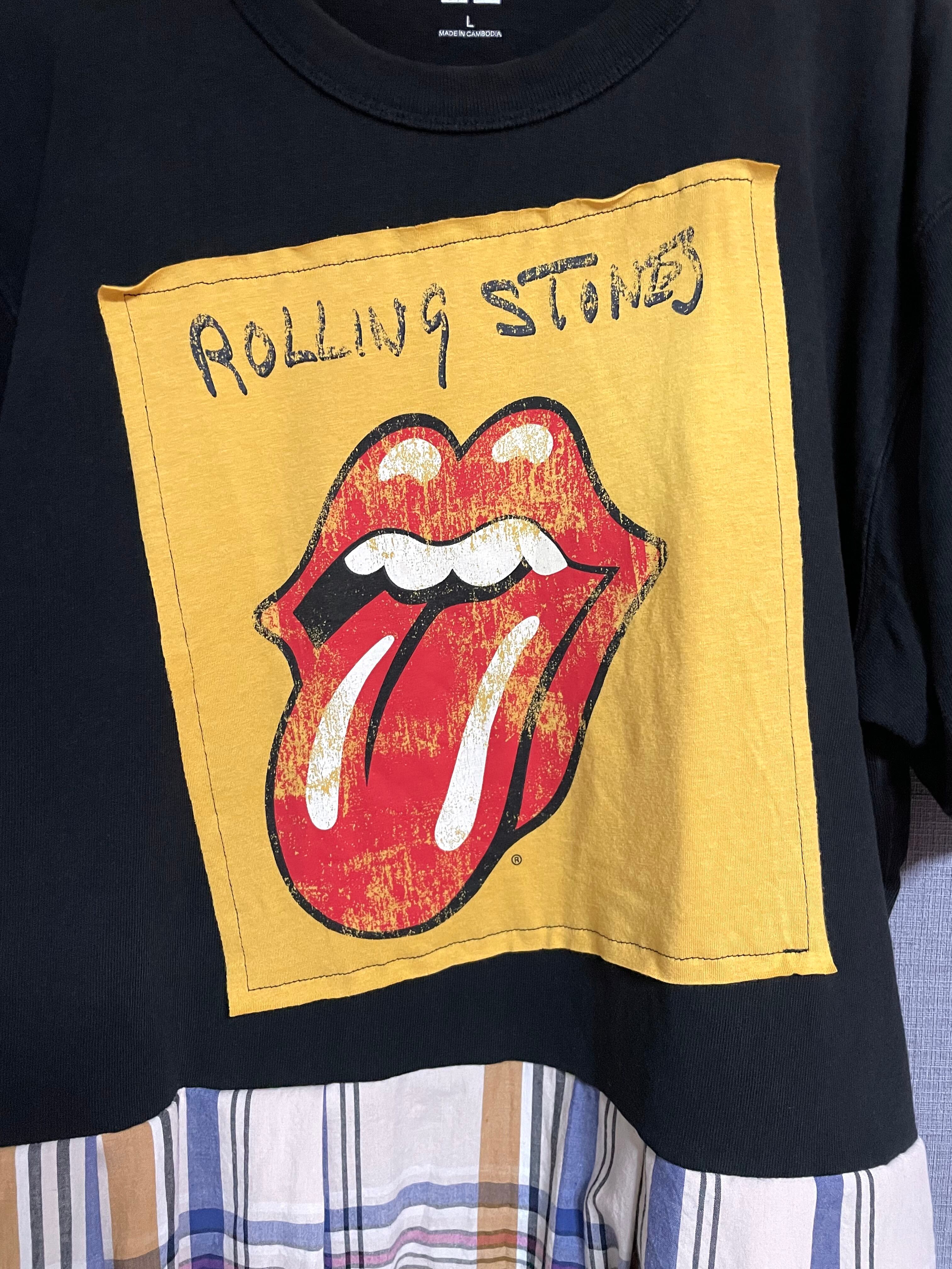 黒Tシャツに掠れたプリントがかわいいベロを縫いつけ、チェック柄スカートを合わせています♬