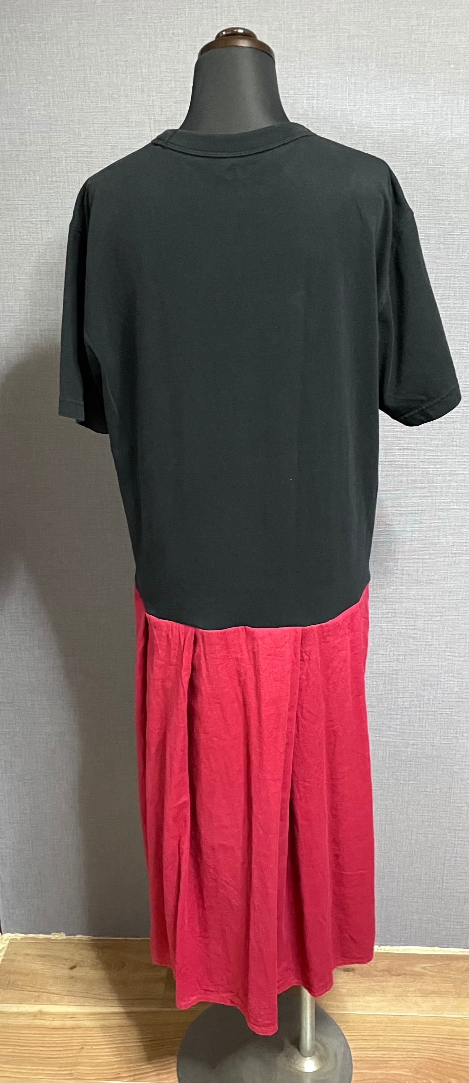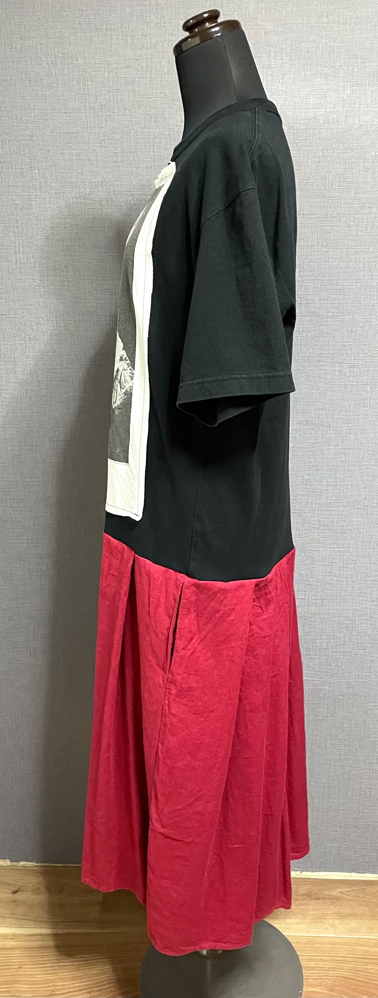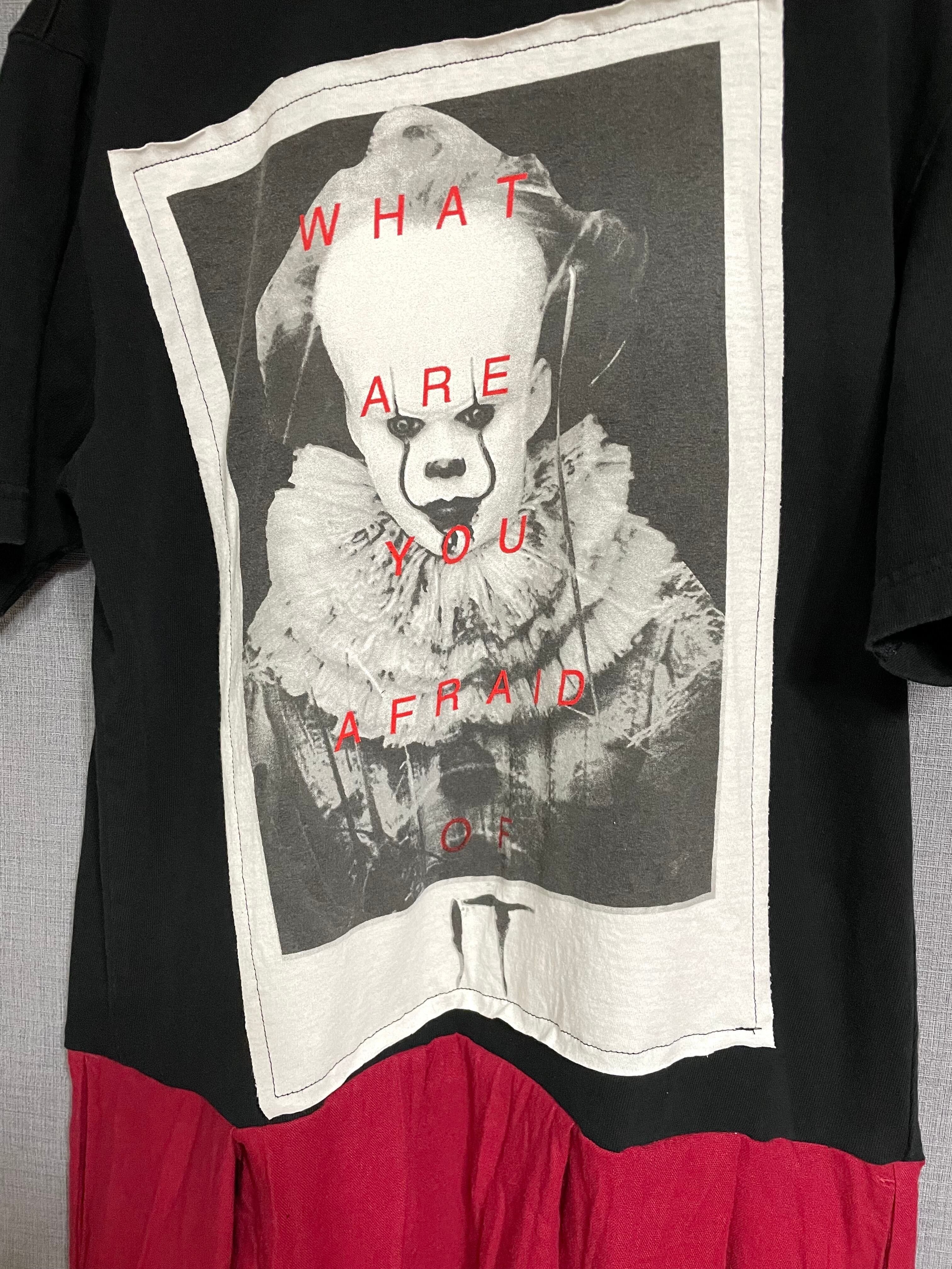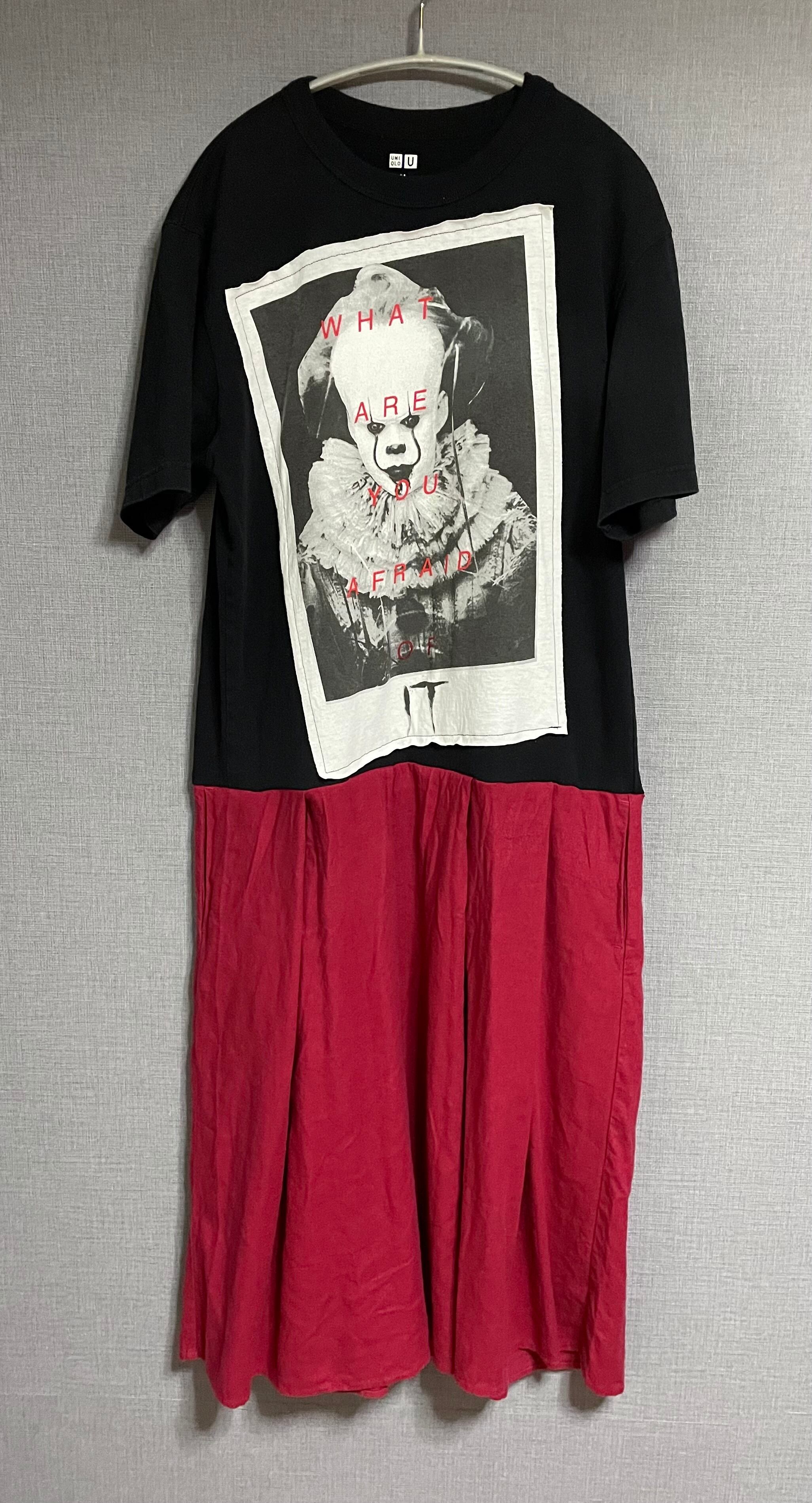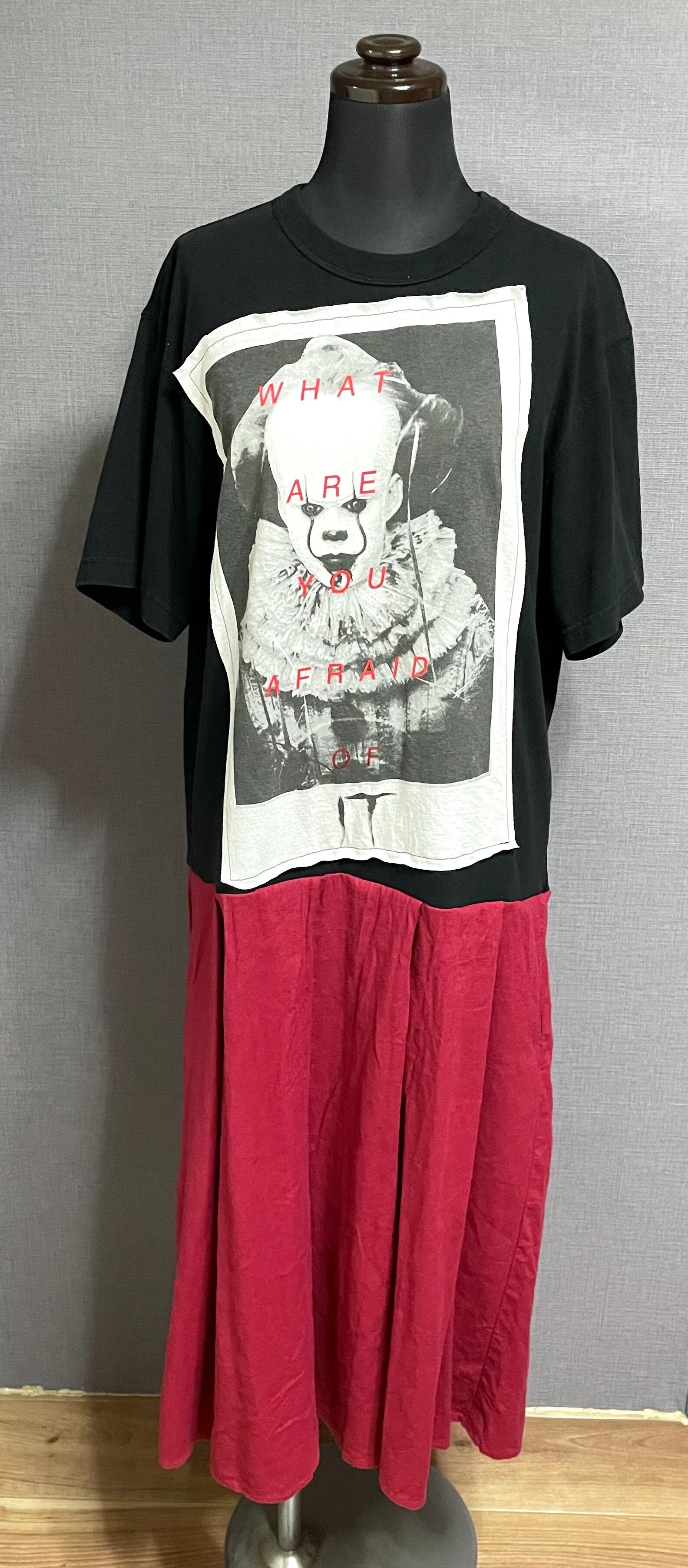 黒Tシャツにピエロを縫いつけ、落ち着いた赤色スカートを合わせています♬