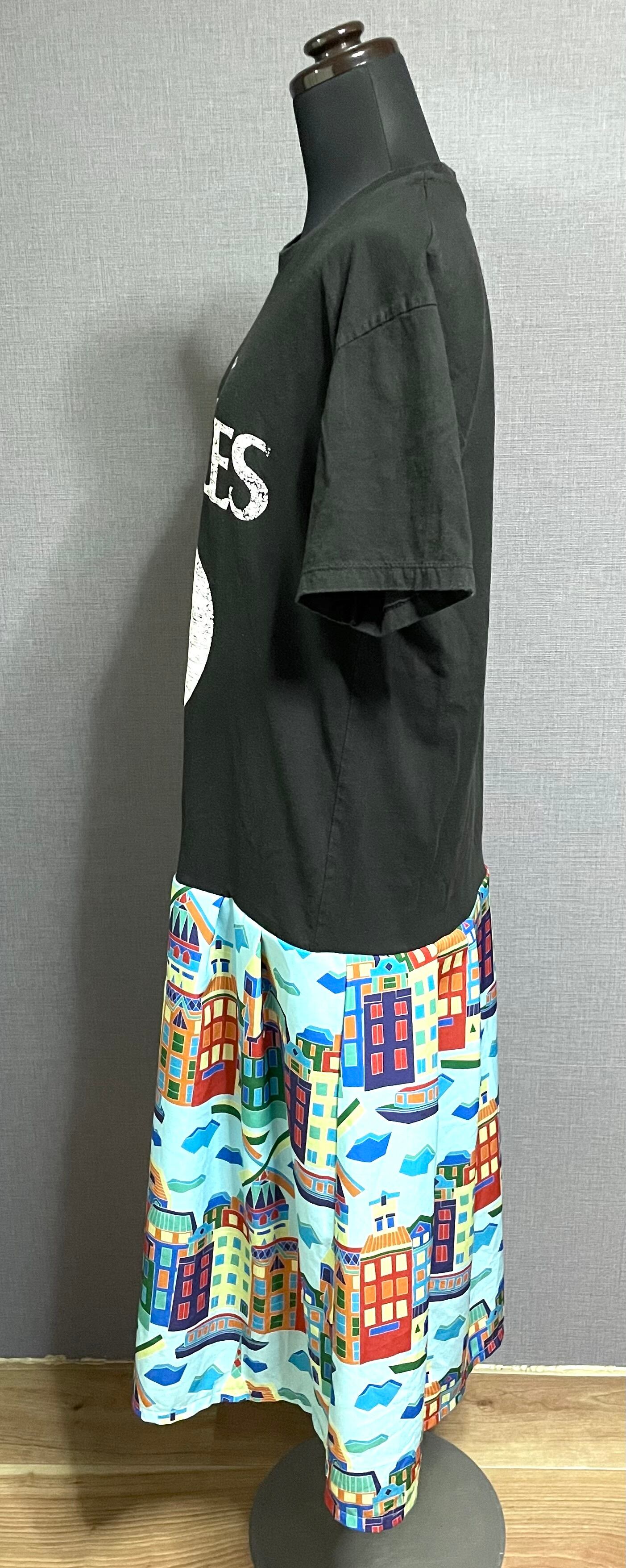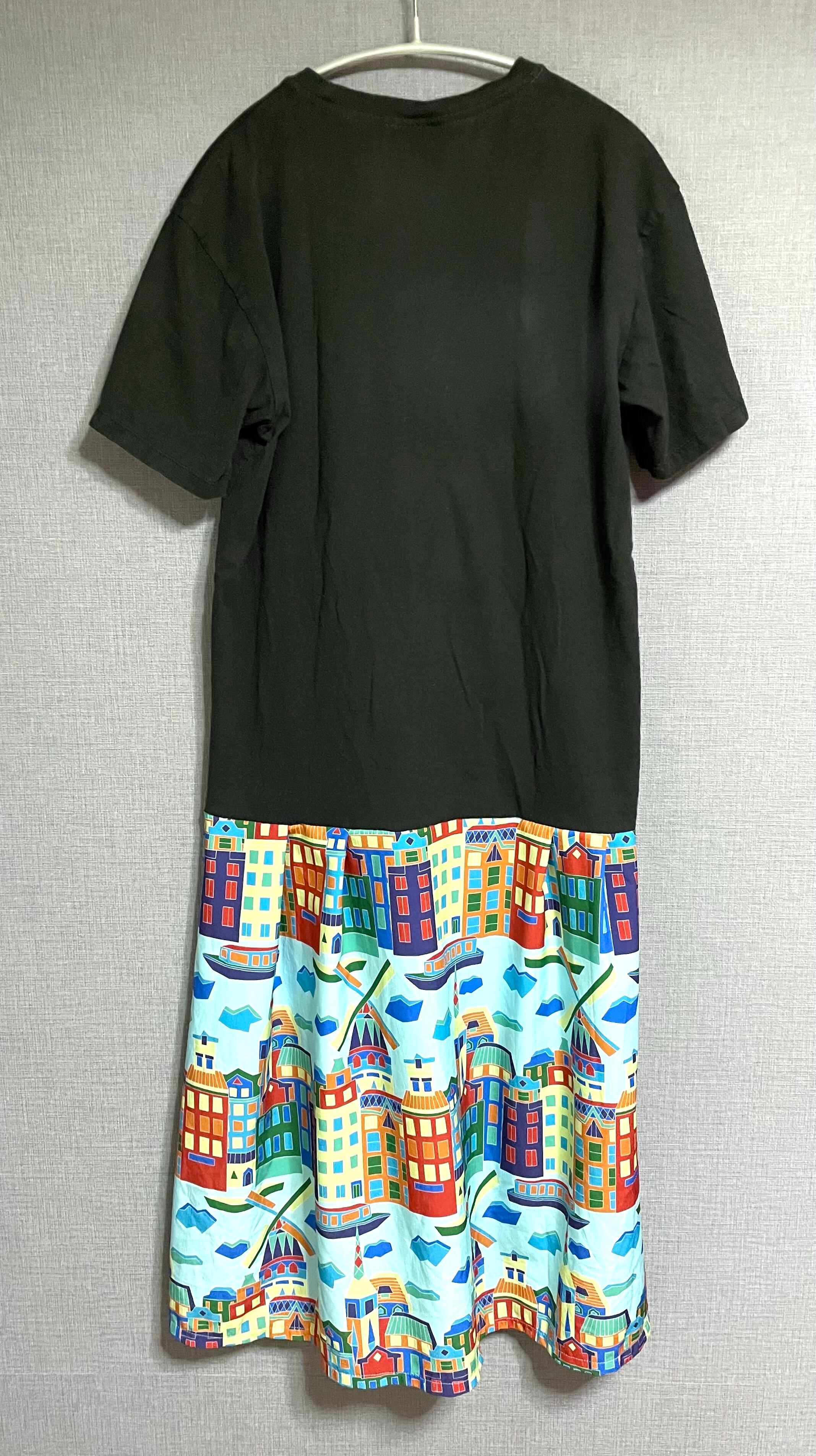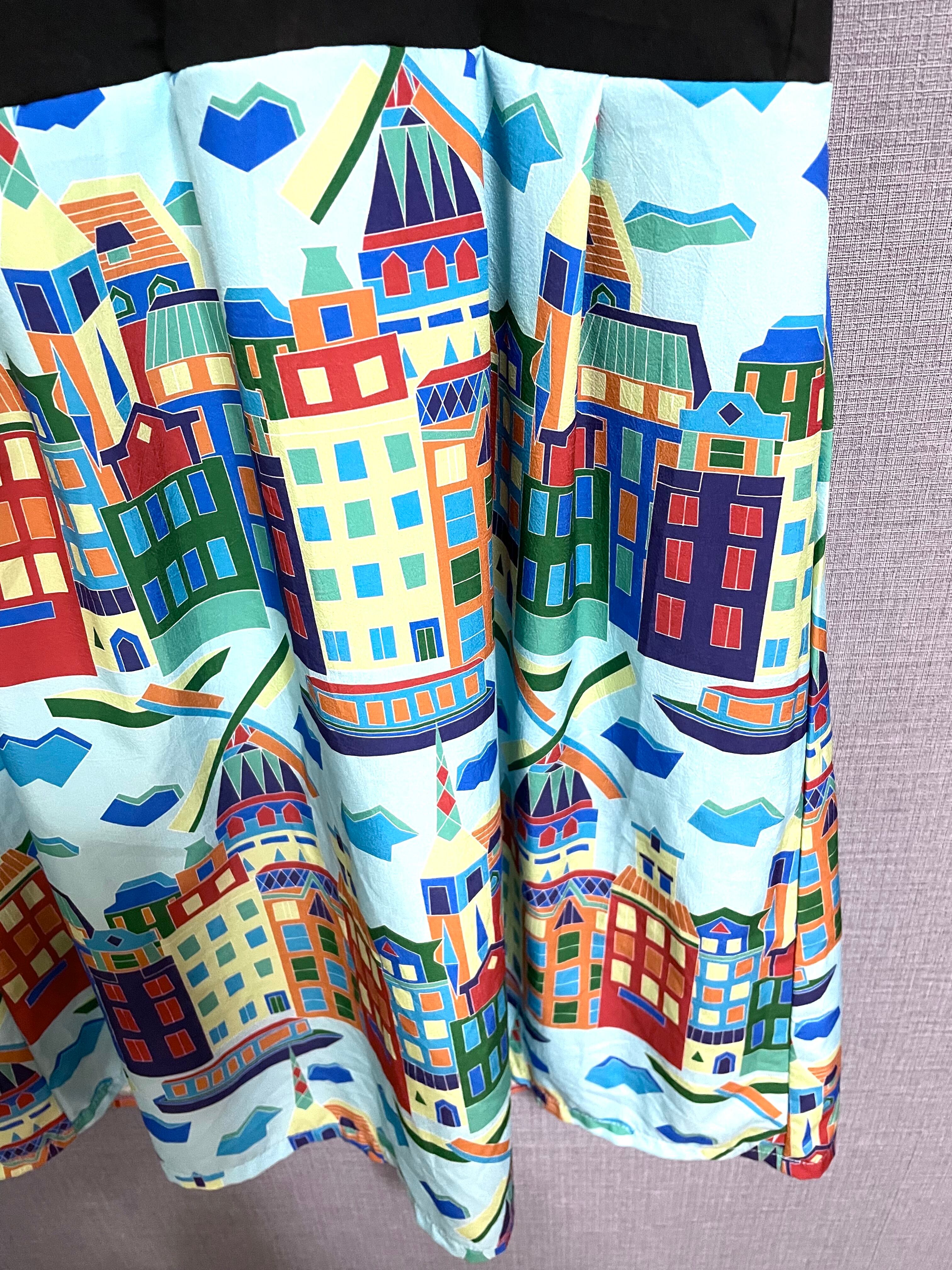 かわいいプリントの黒Tシャツに、港町風景スカートを合わせています♬