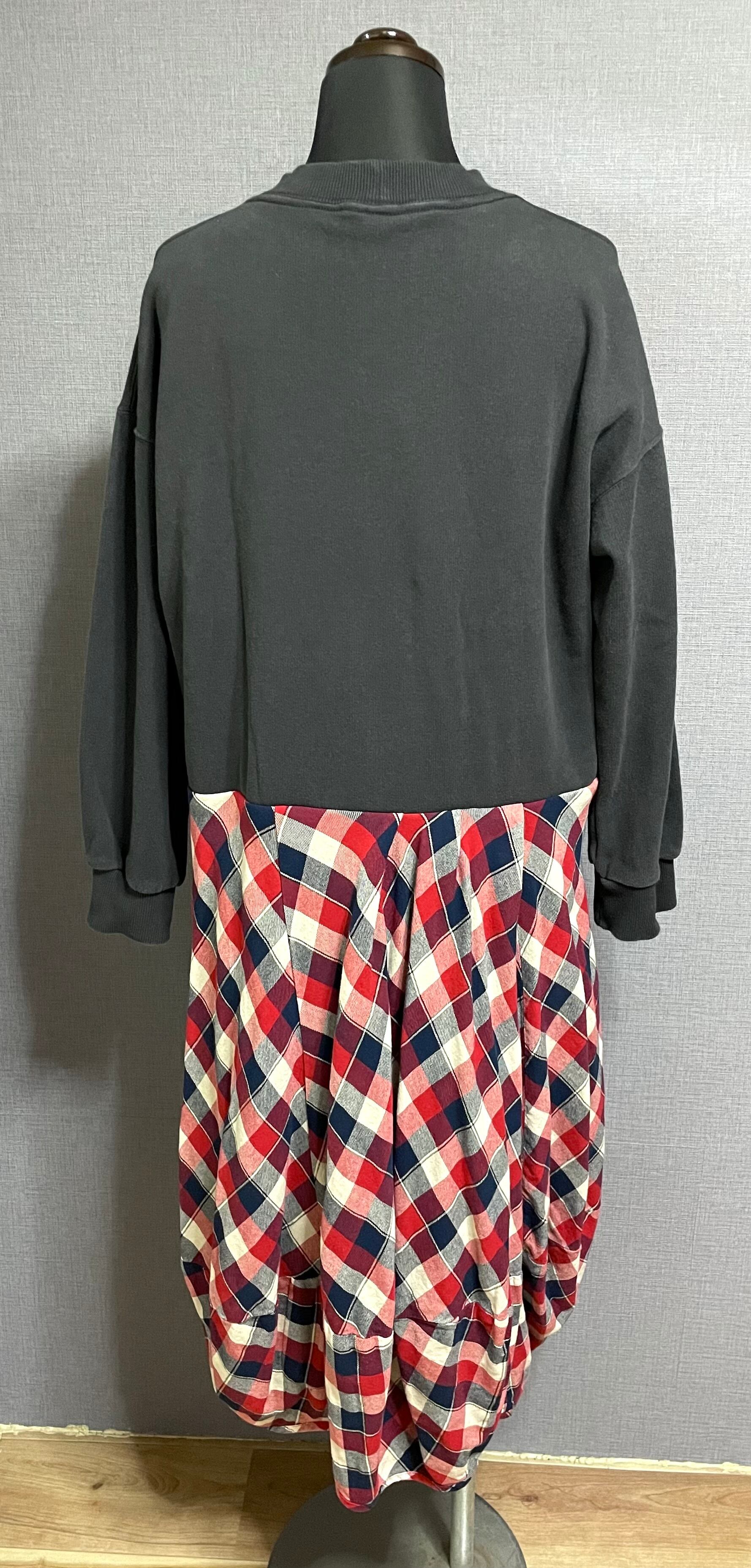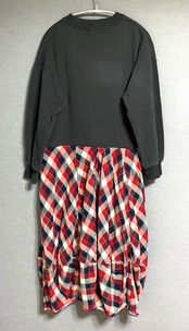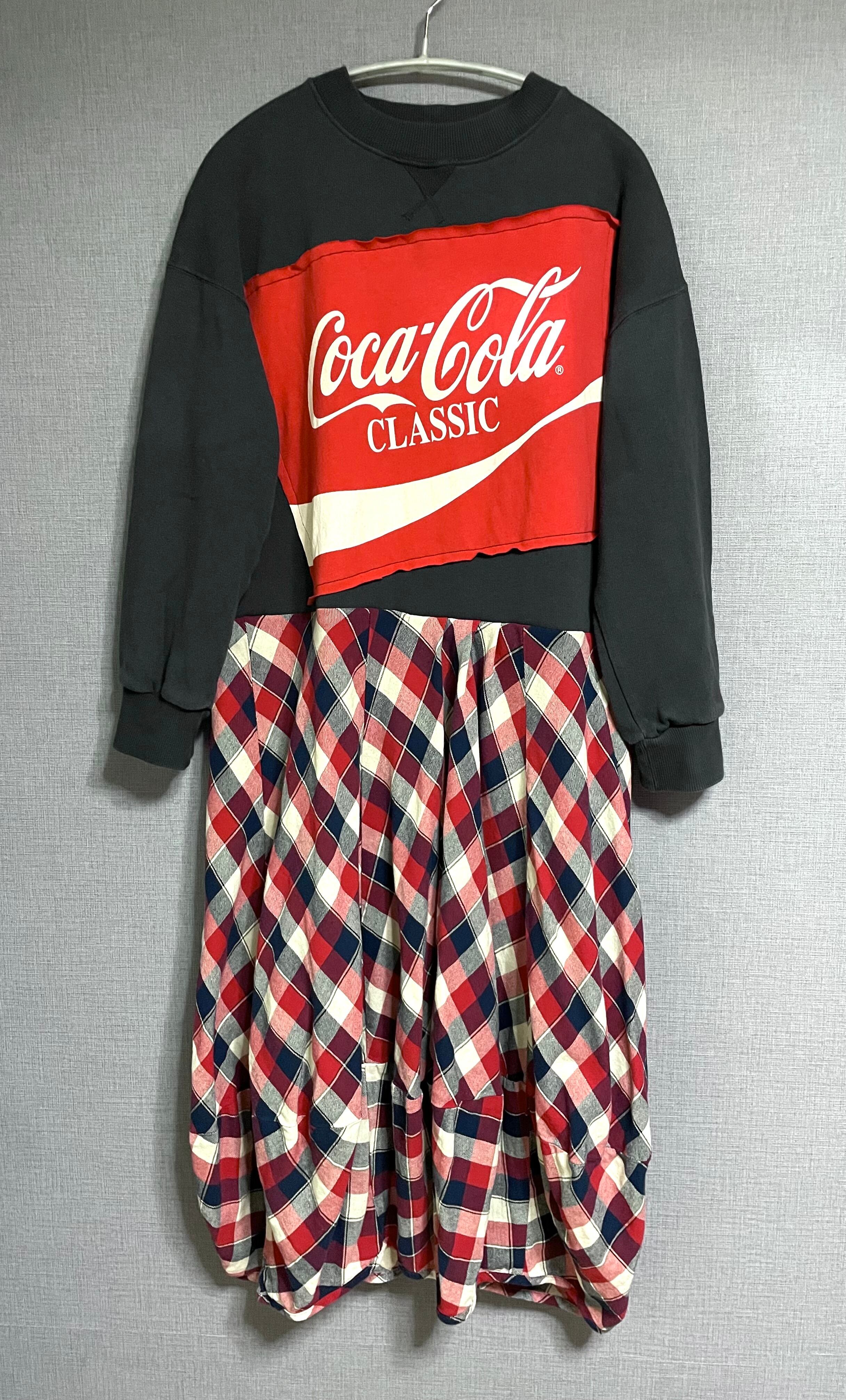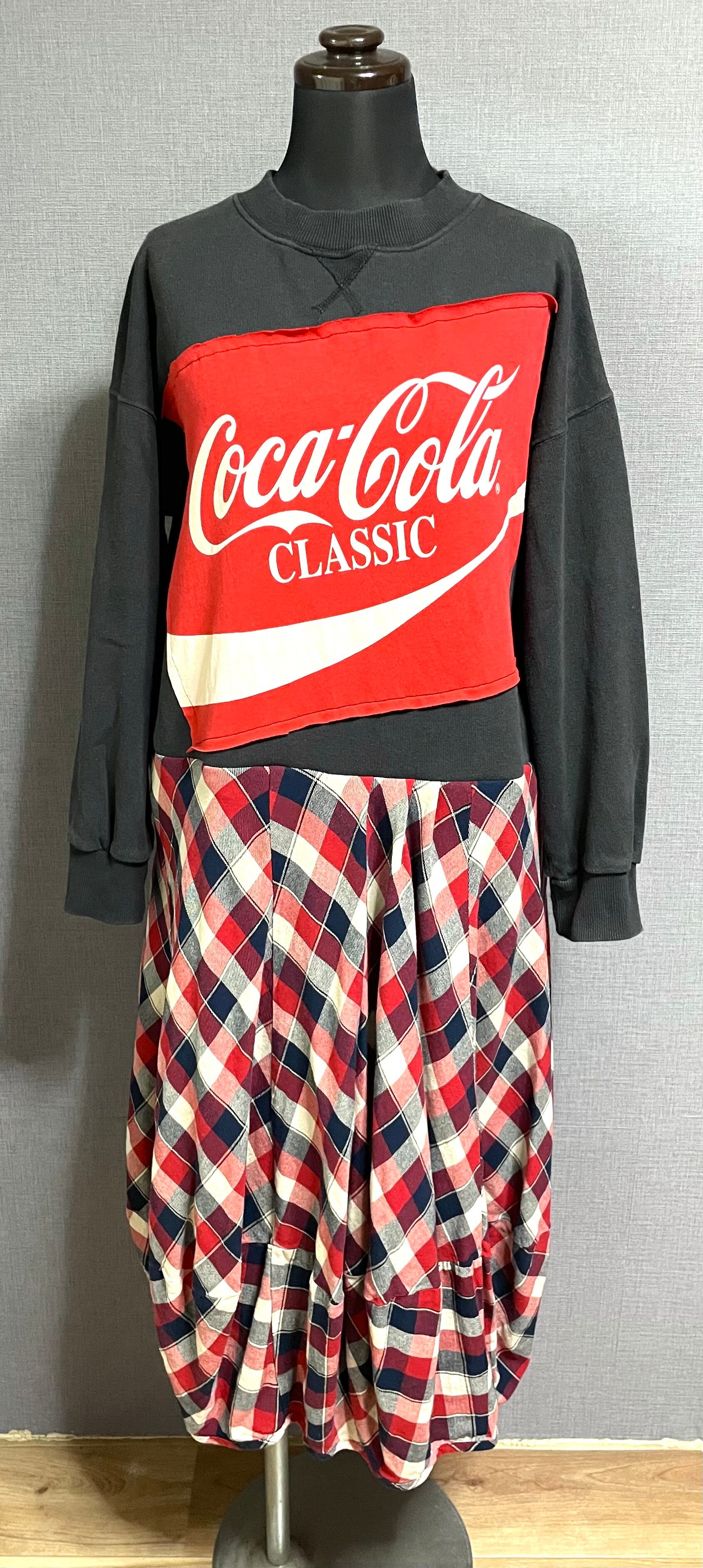 グレーのスウェットに炭酸飲料を縫いつけ、チェック柄の変形スカートを合わせています♬