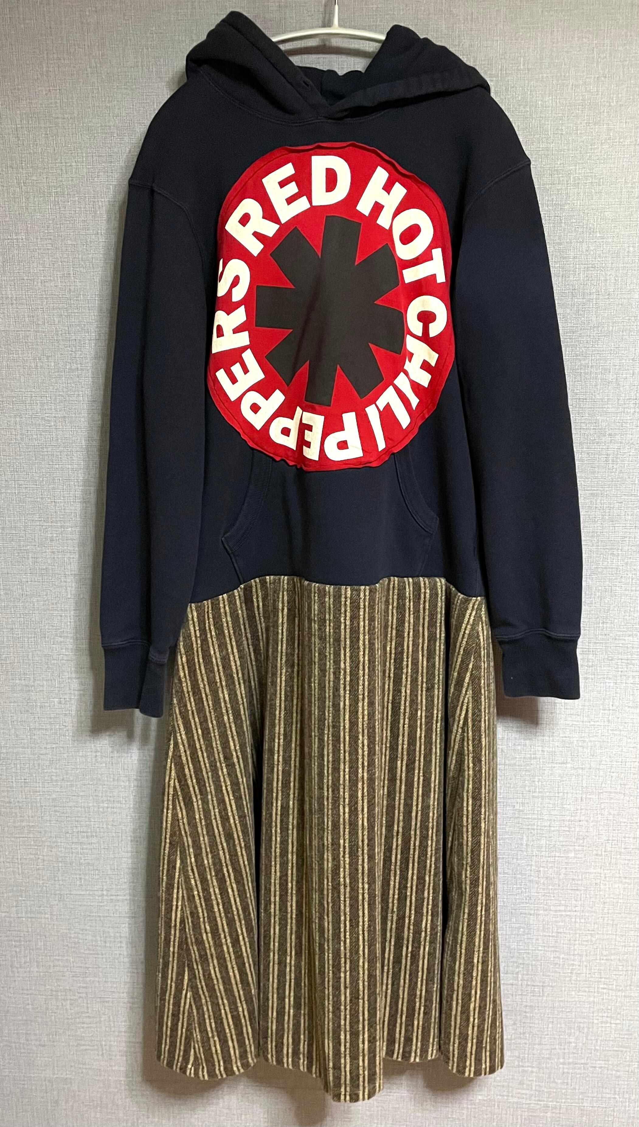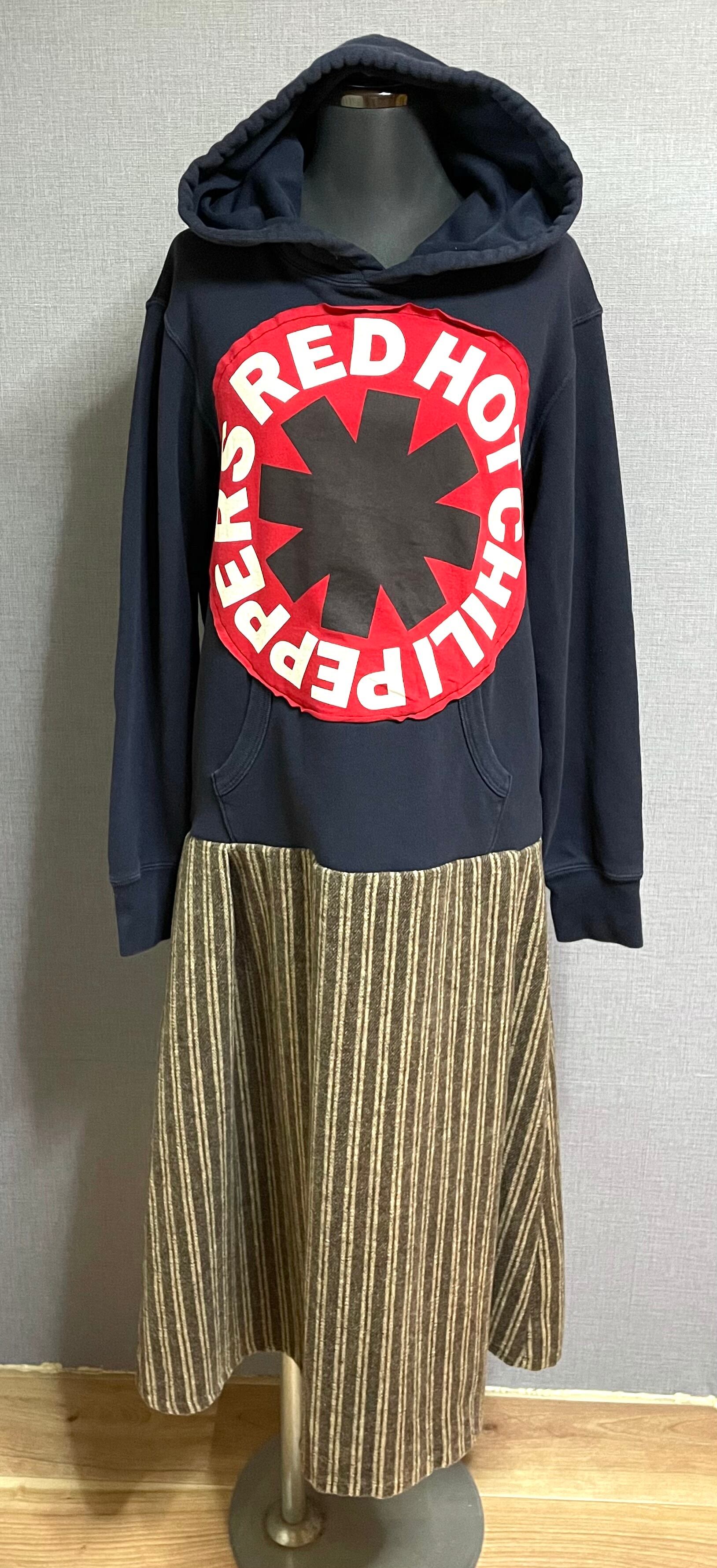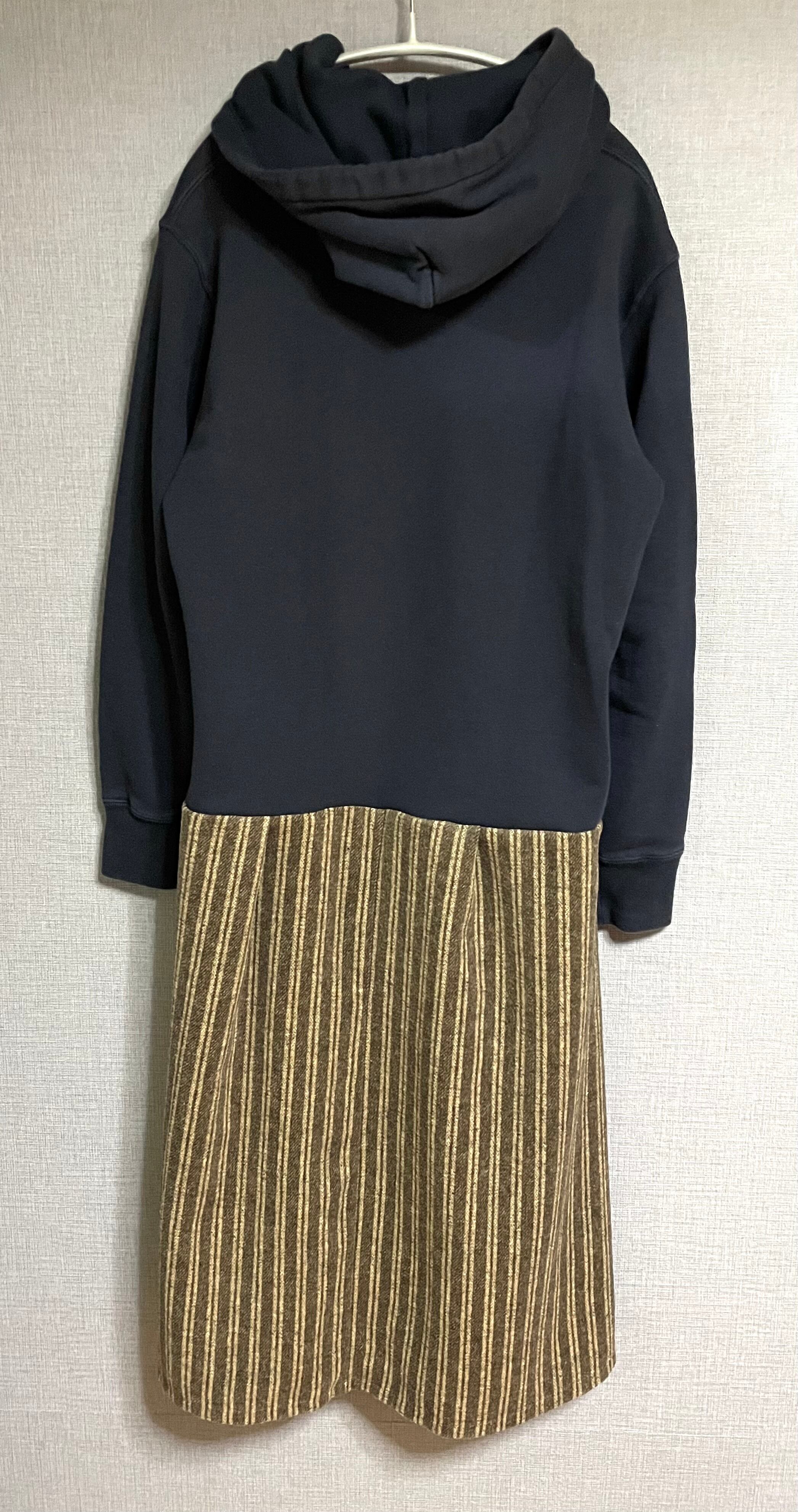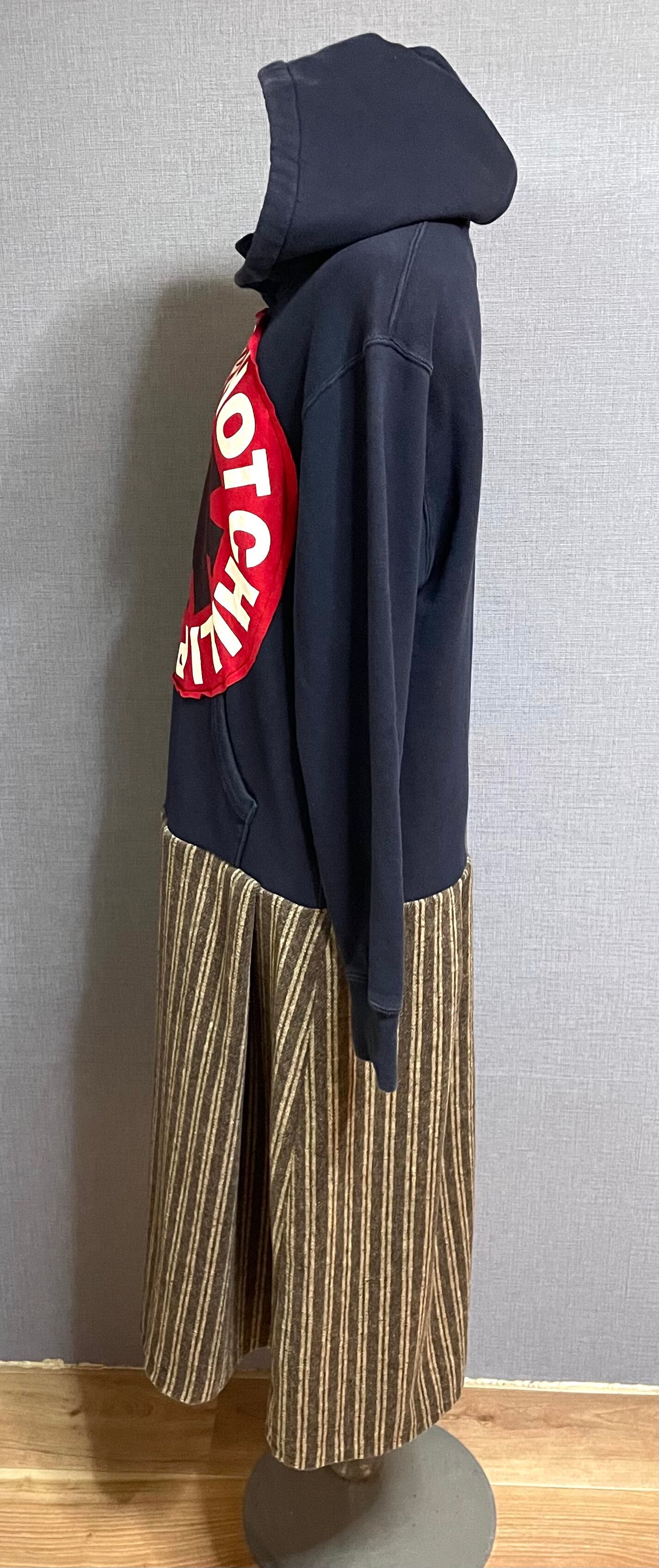 濃紺パーカーにかっこいいやつを縫いつけ、茶系のストライプスカートを合わせています♬