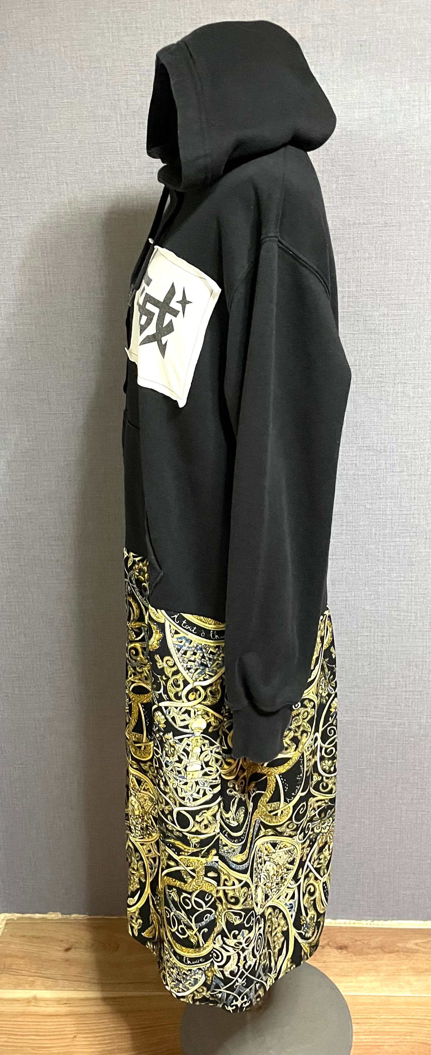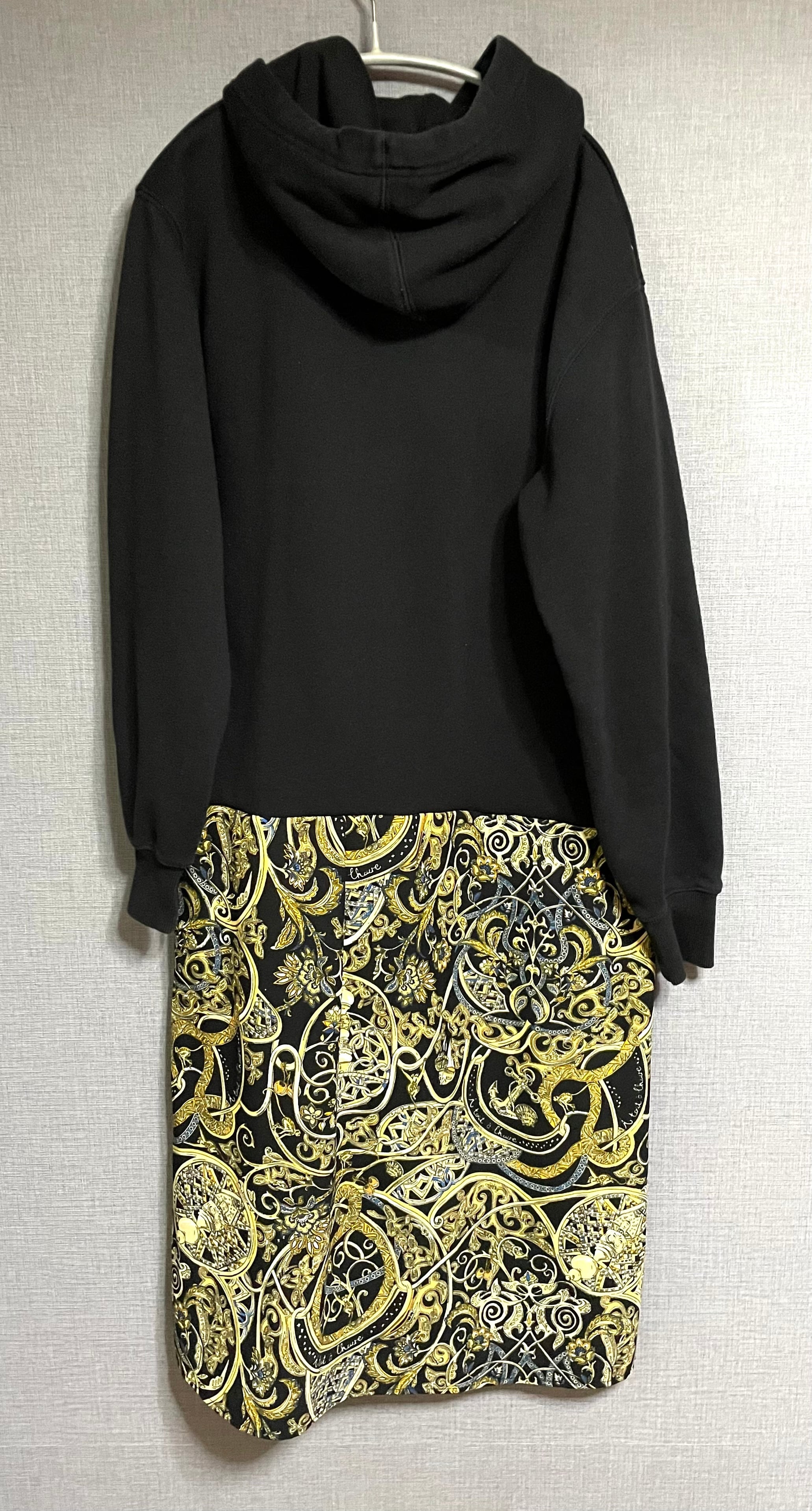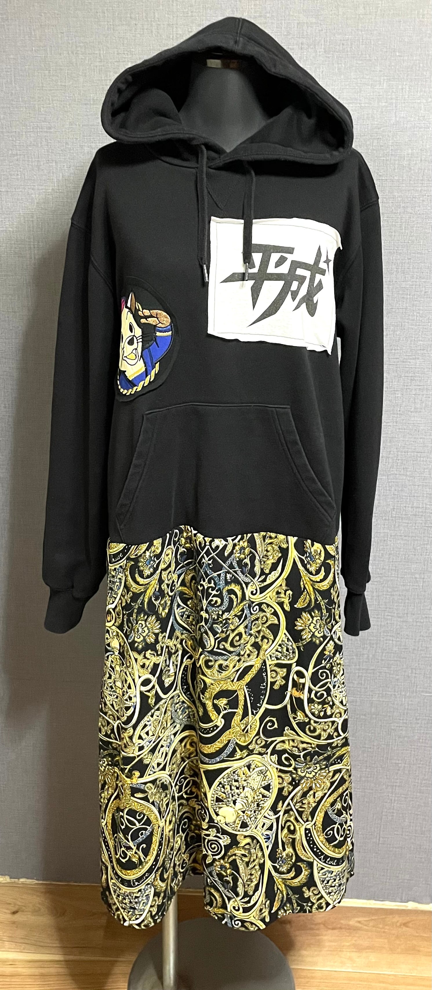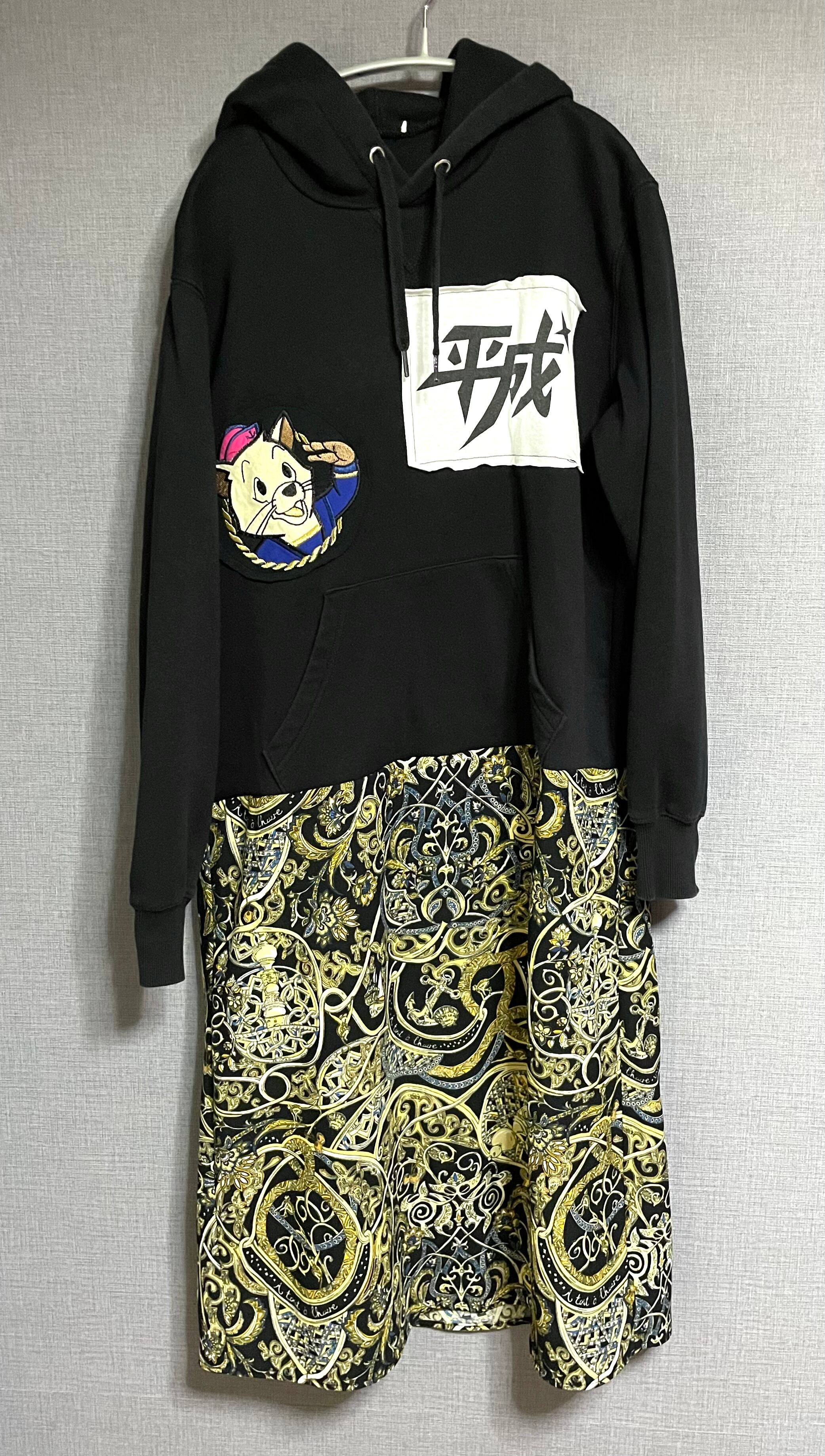 黒パーカーに平成とかわいい猫ちゃんを縫いつけ、バブルな柄スカートを合わせています♬