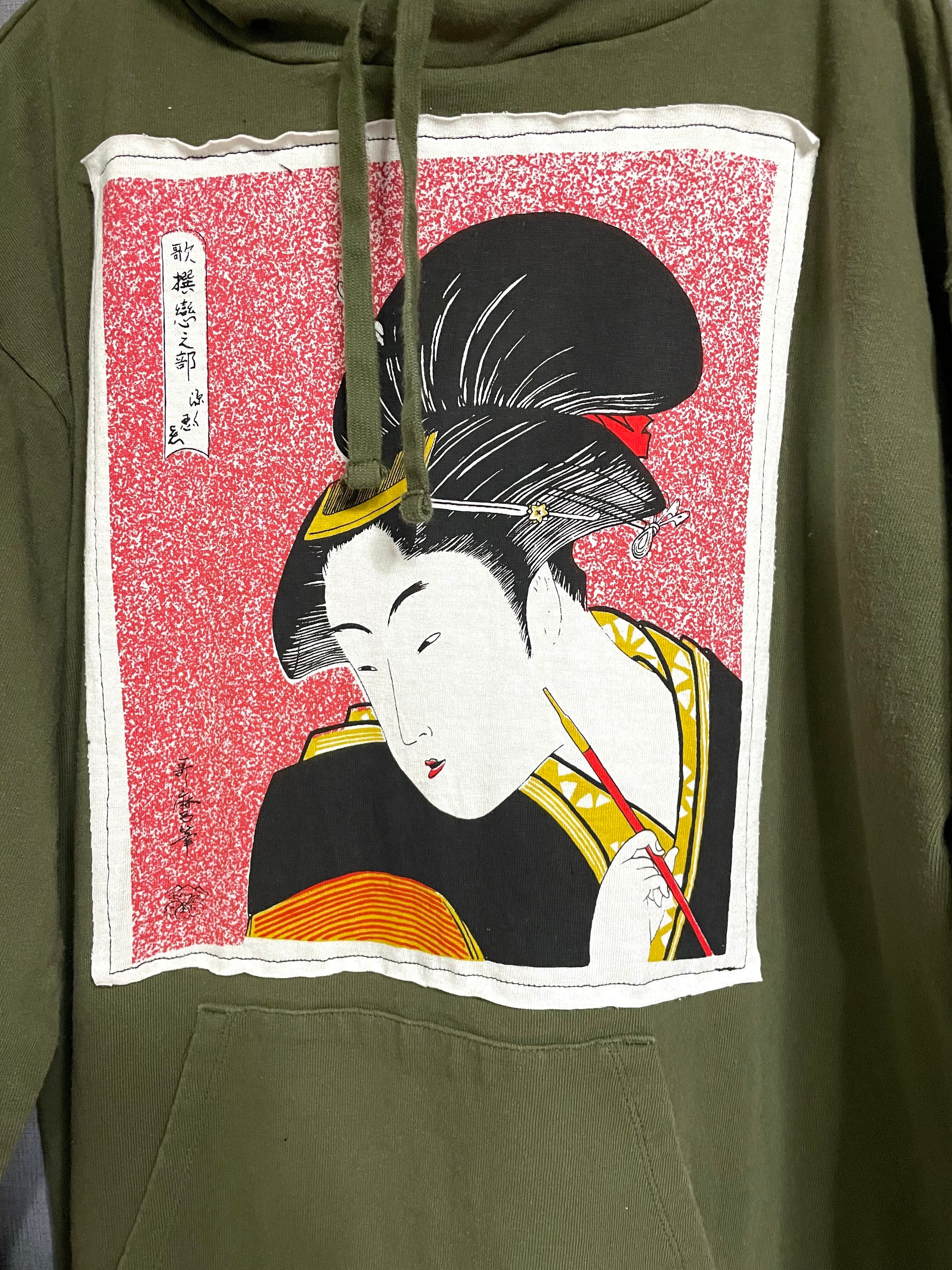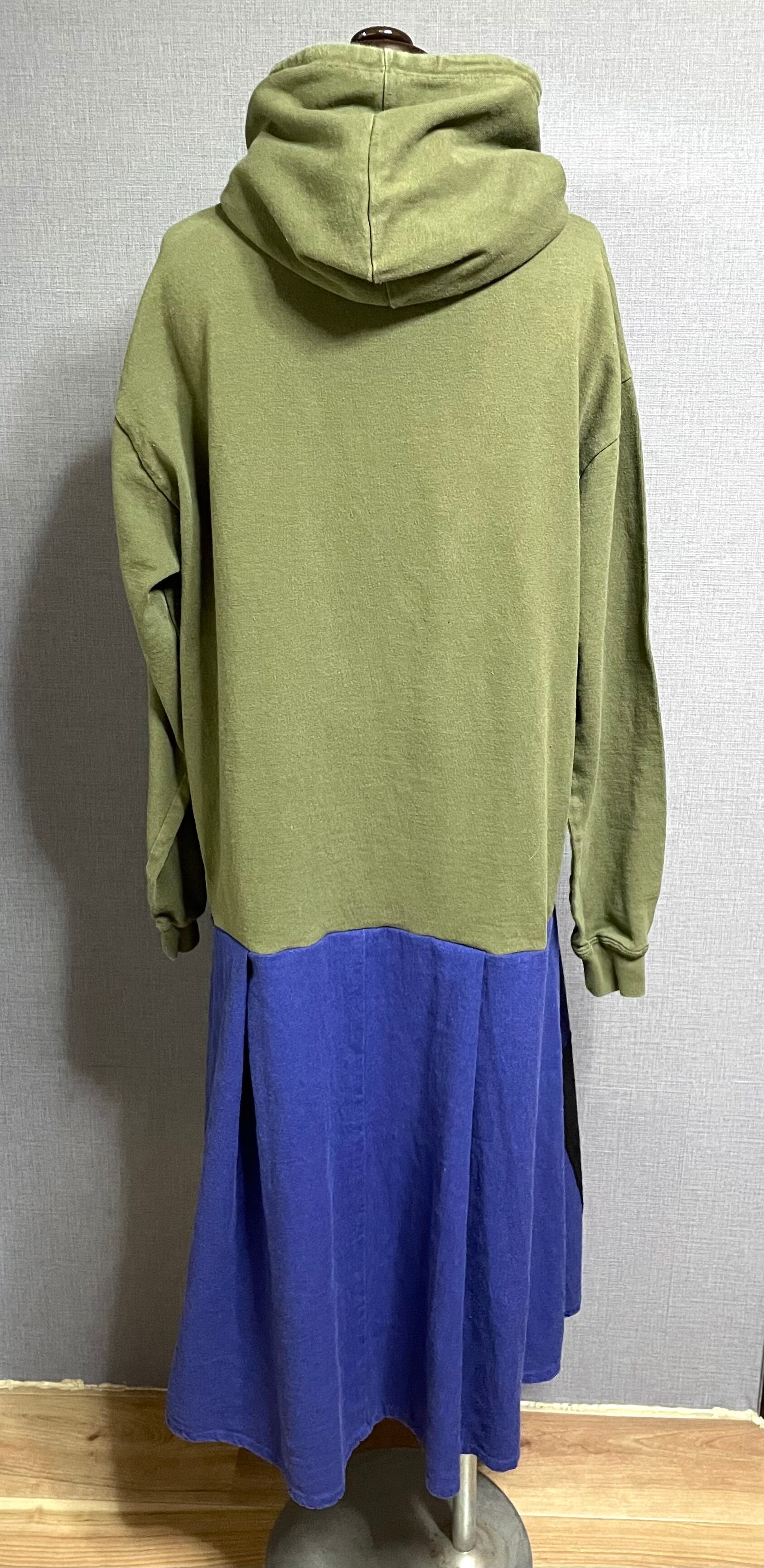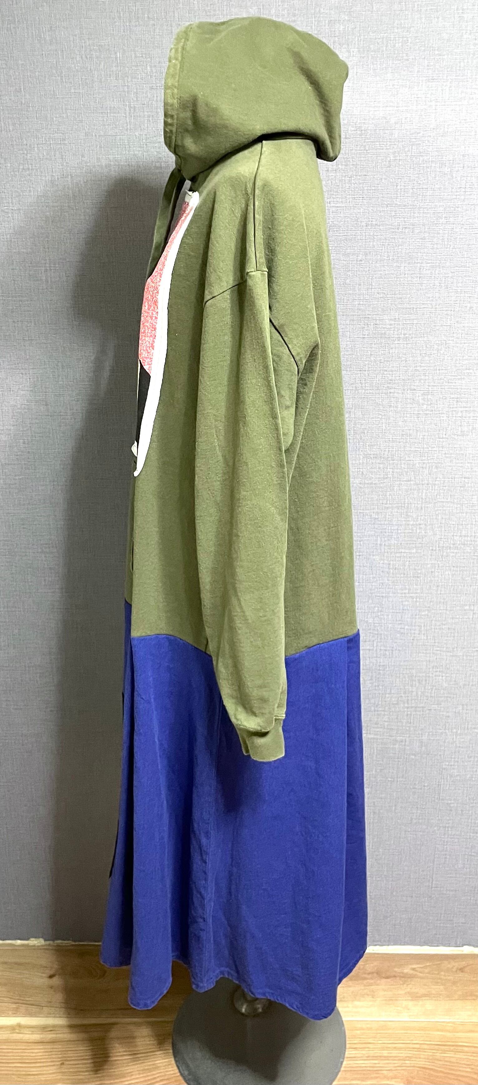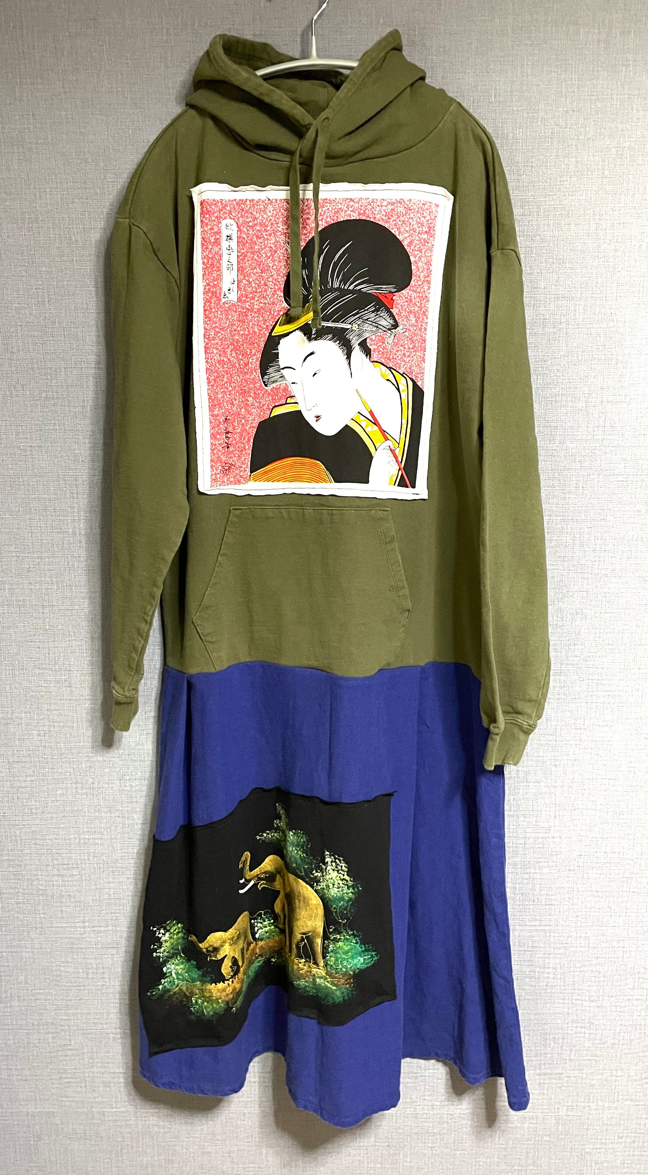 カーキーのパーカーに浮世絵を縫いつけ、親子のぞうさんを縫い付けたスカートを合わせています♬