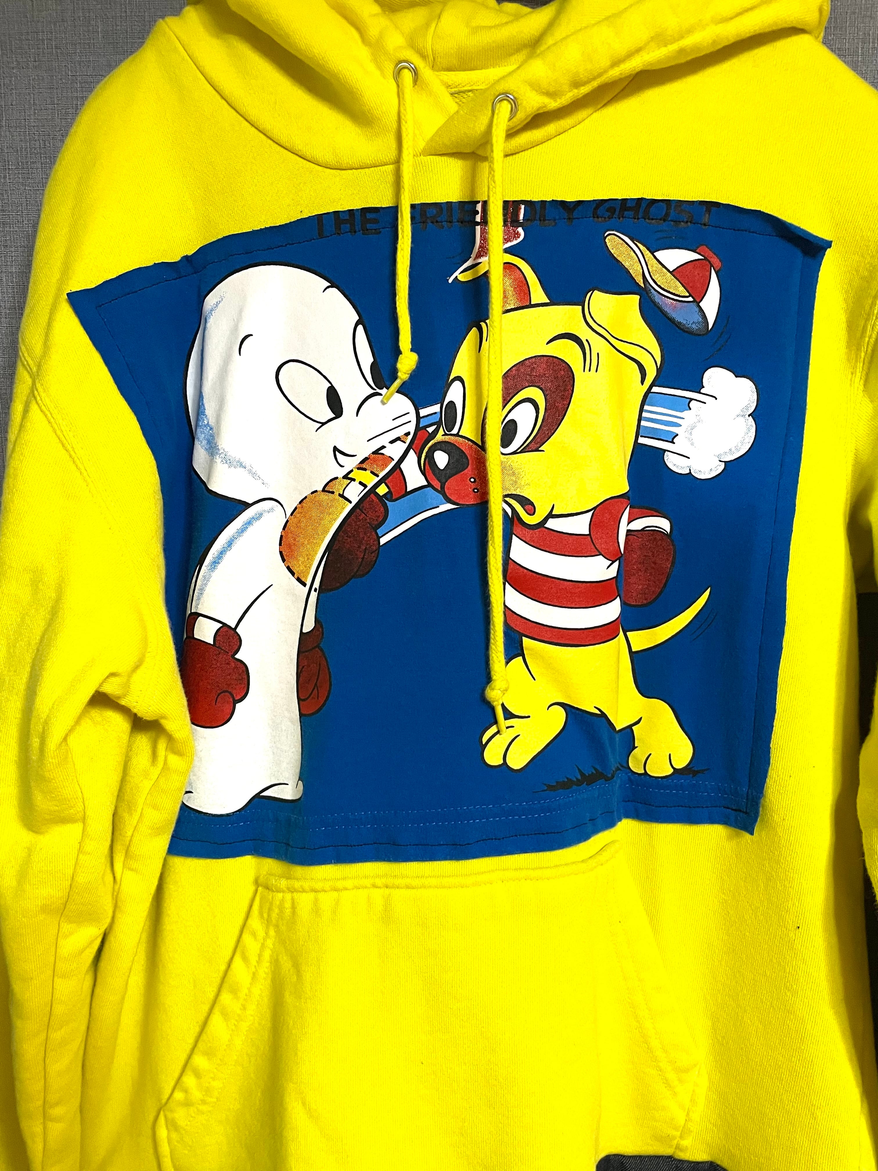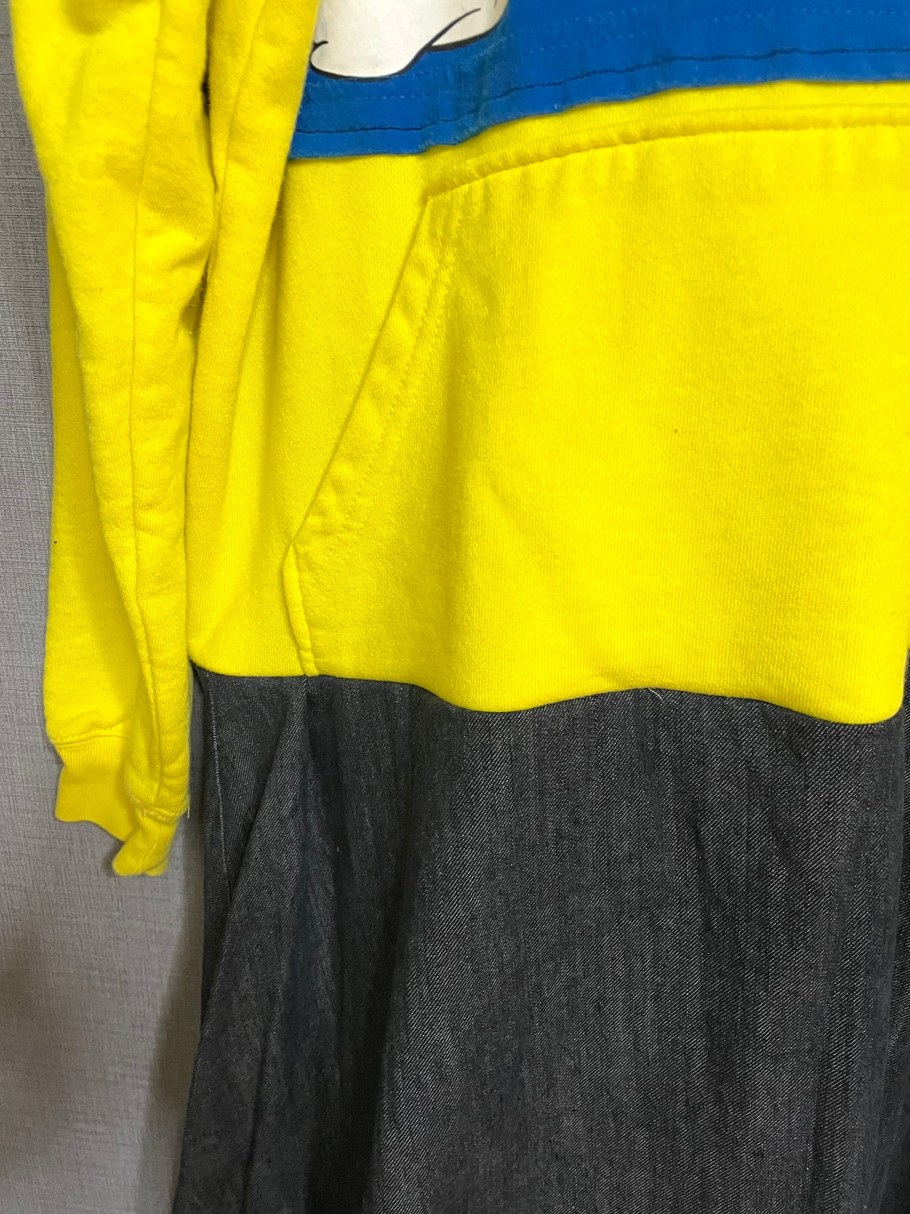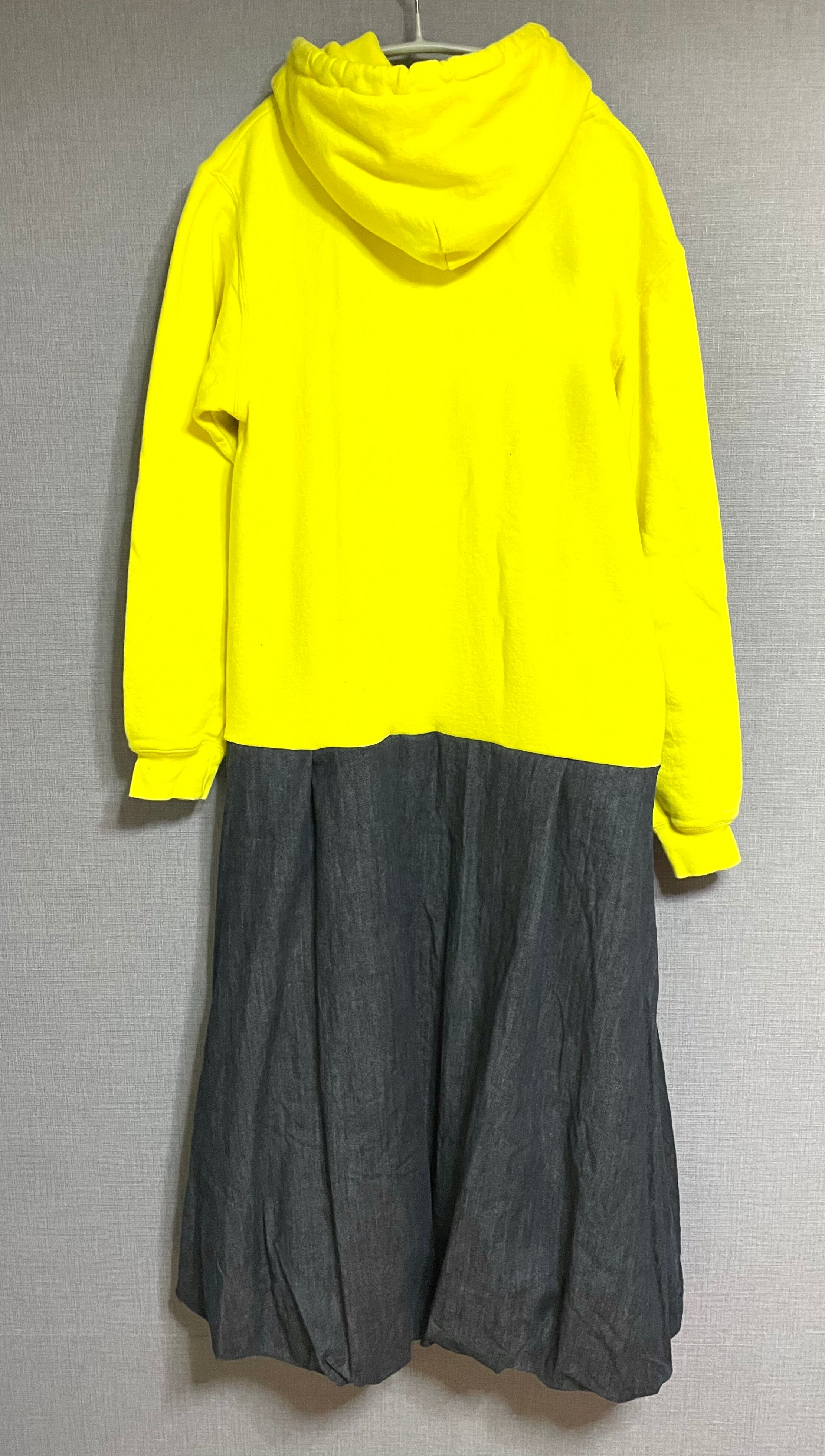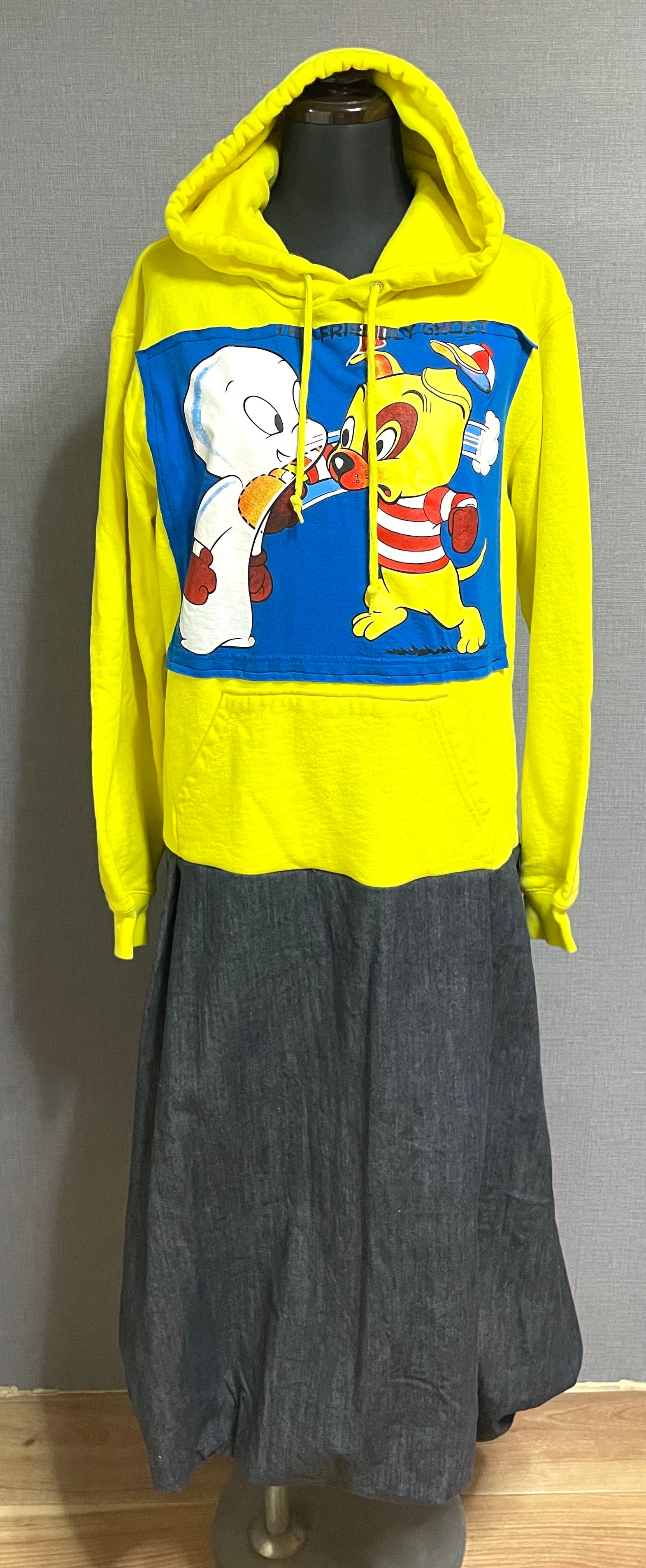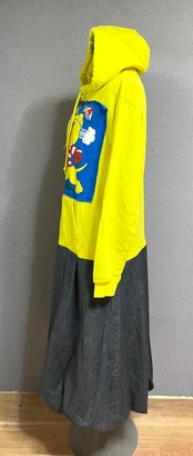 レモンイエローのパーカーにかわいいオバケを縫いつけ、デニムのバルーンスカートを合わせています♬