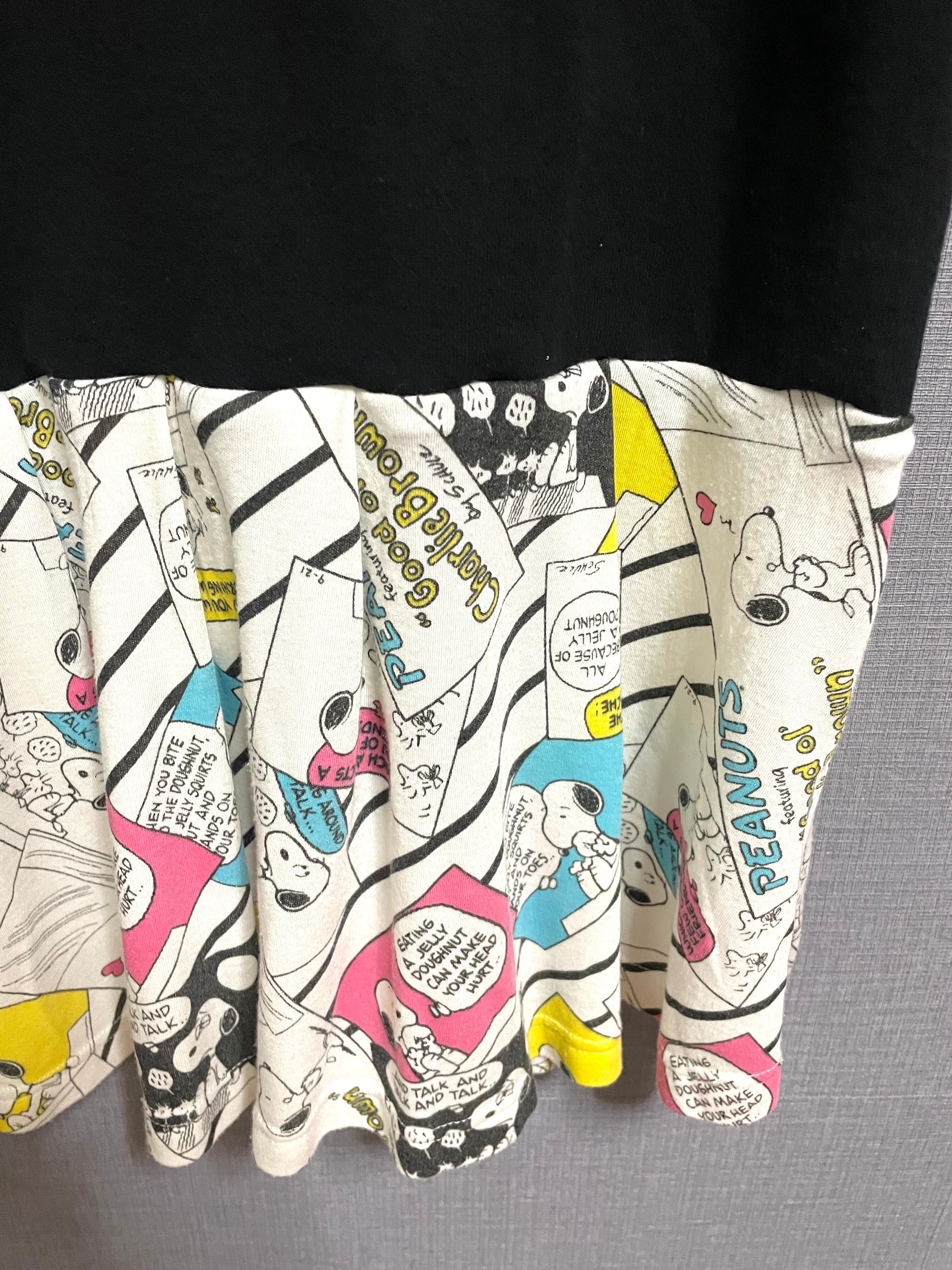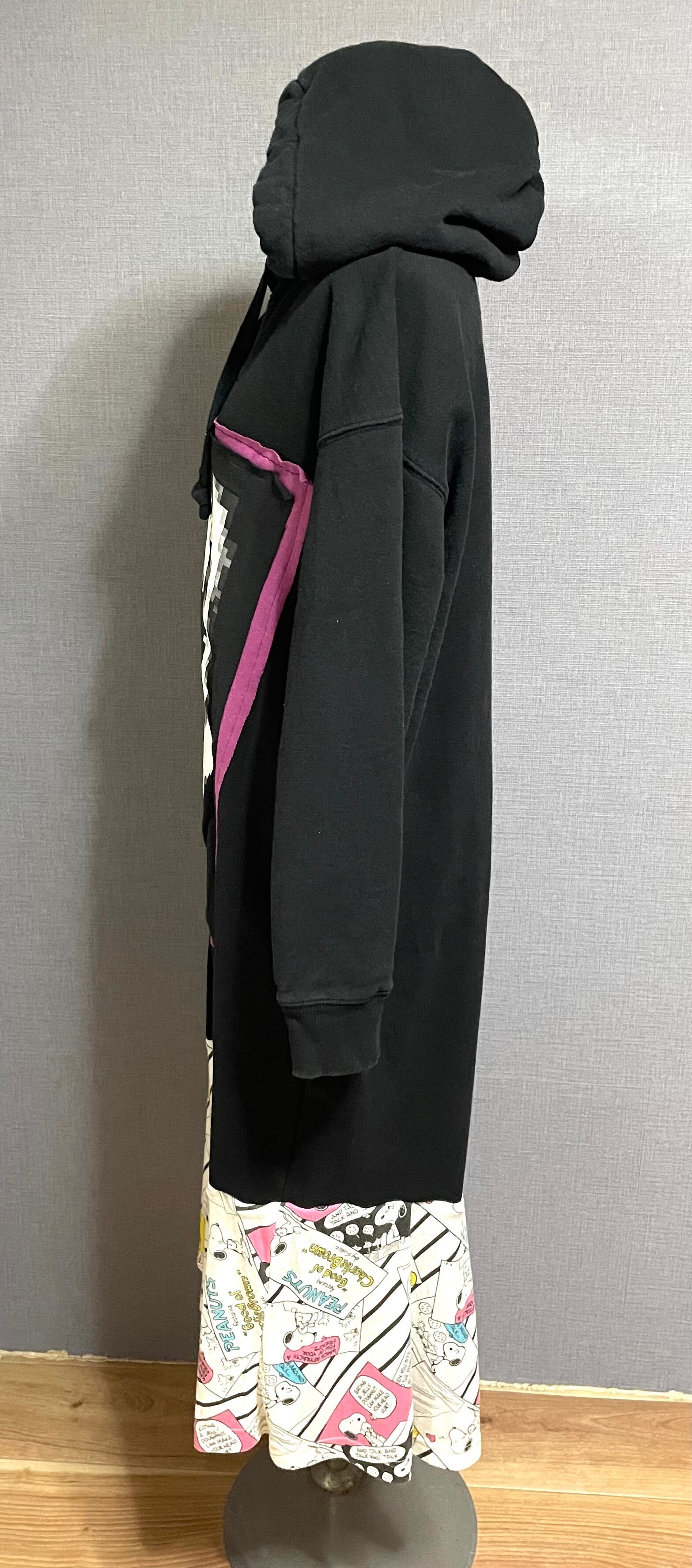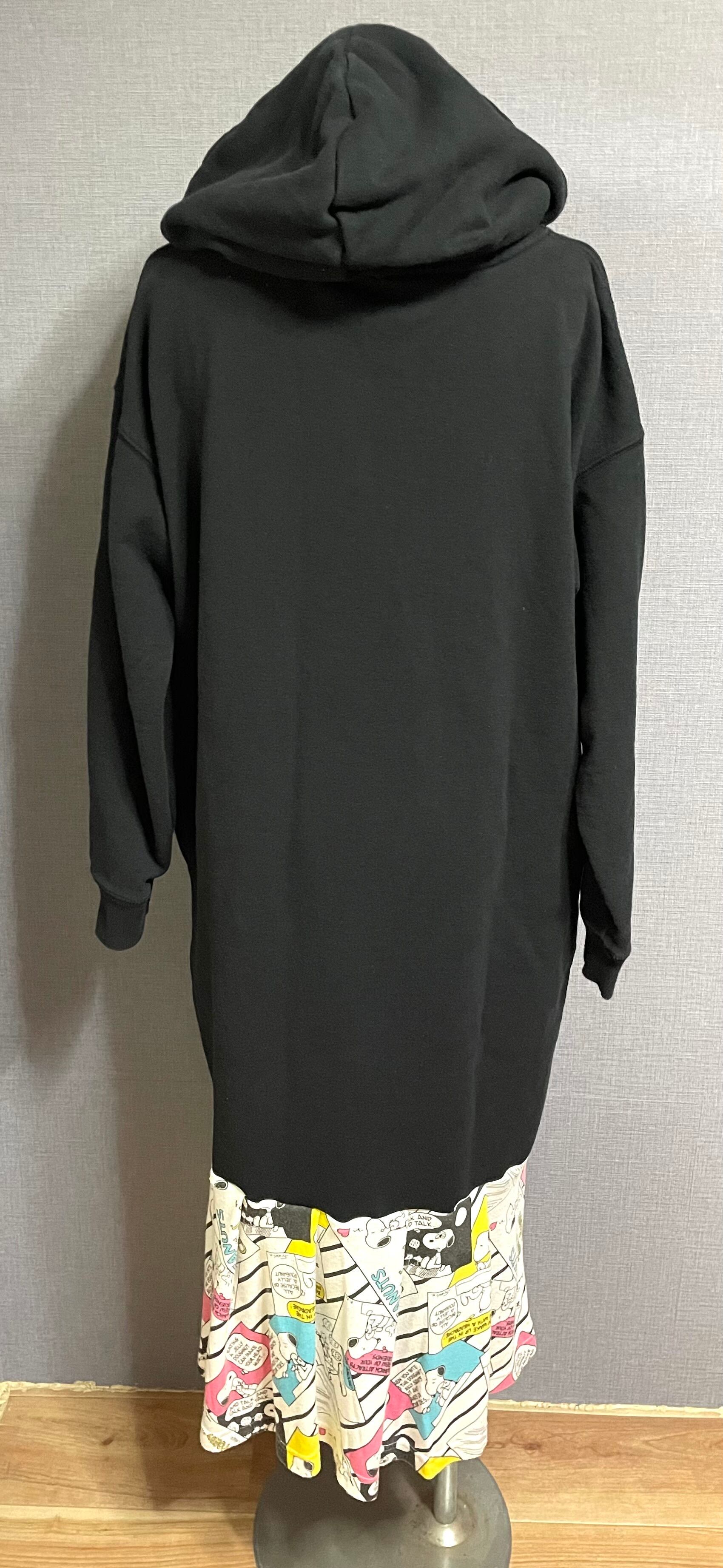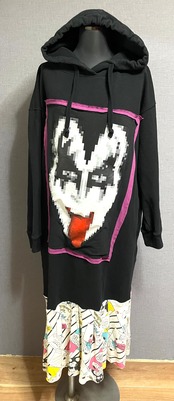 黒パーカーワンピースにロングベロちょんまげ男子を縫いつけ、かわいい柄スカートを合わせています♬