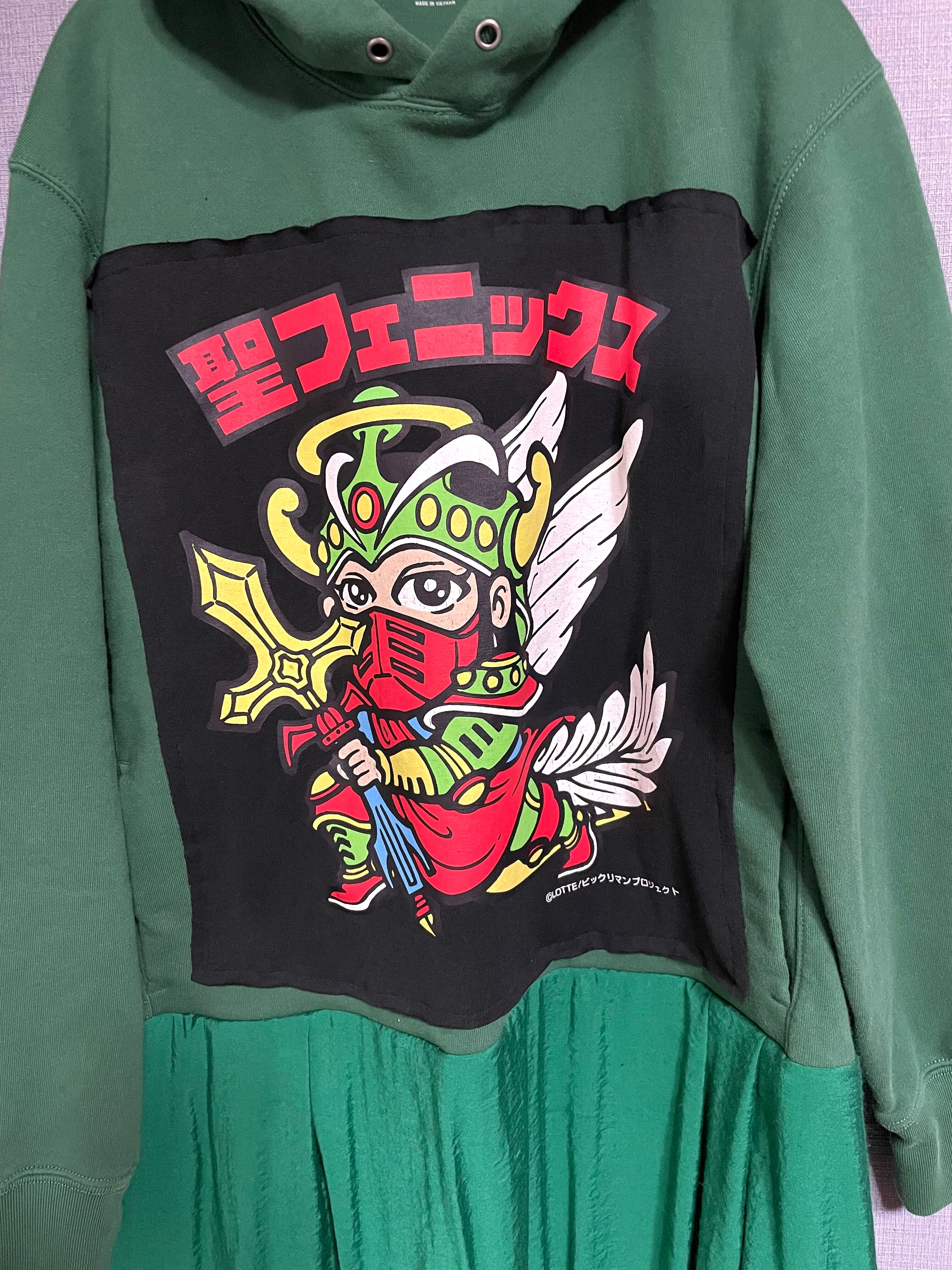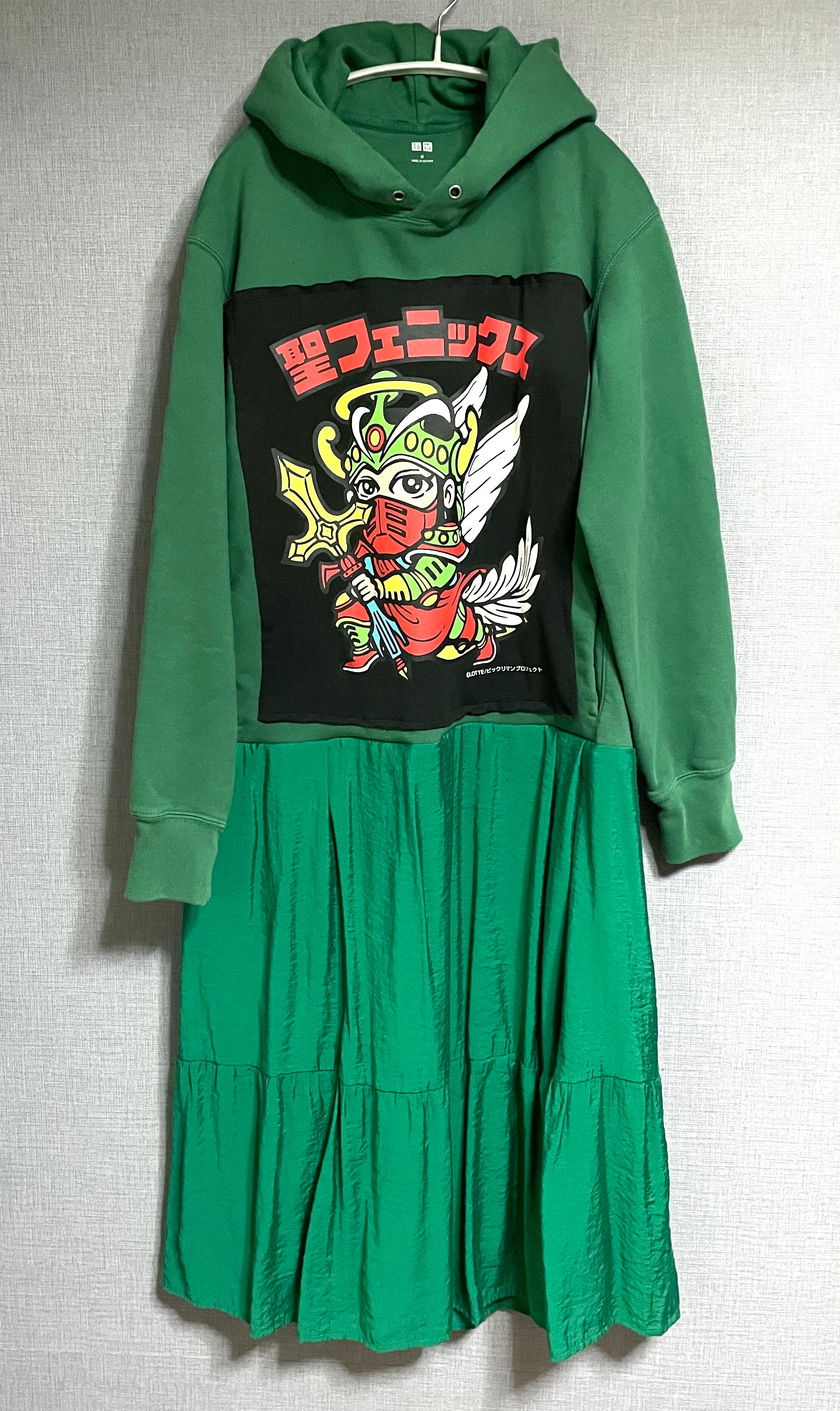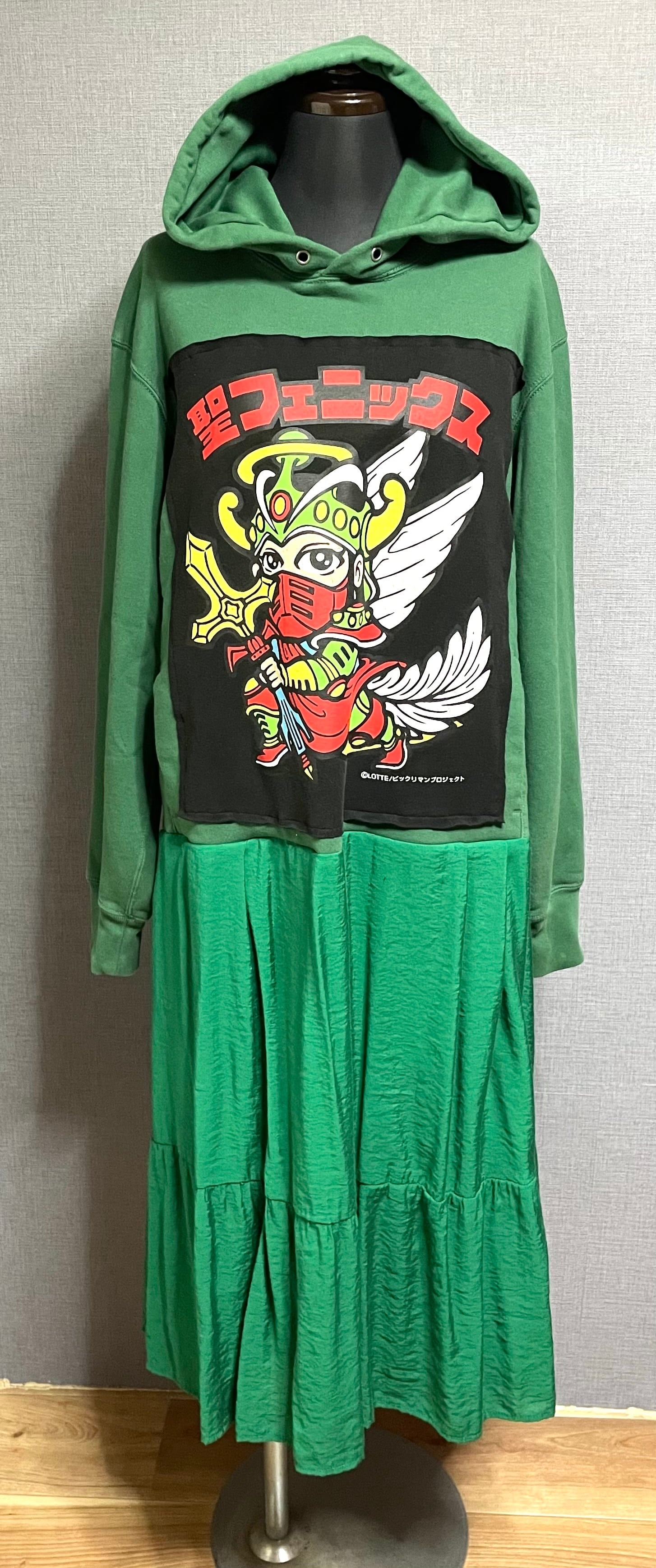 深緑パーカーに聖フェニックスを縫いつけ、緑スカートを合わせています♬