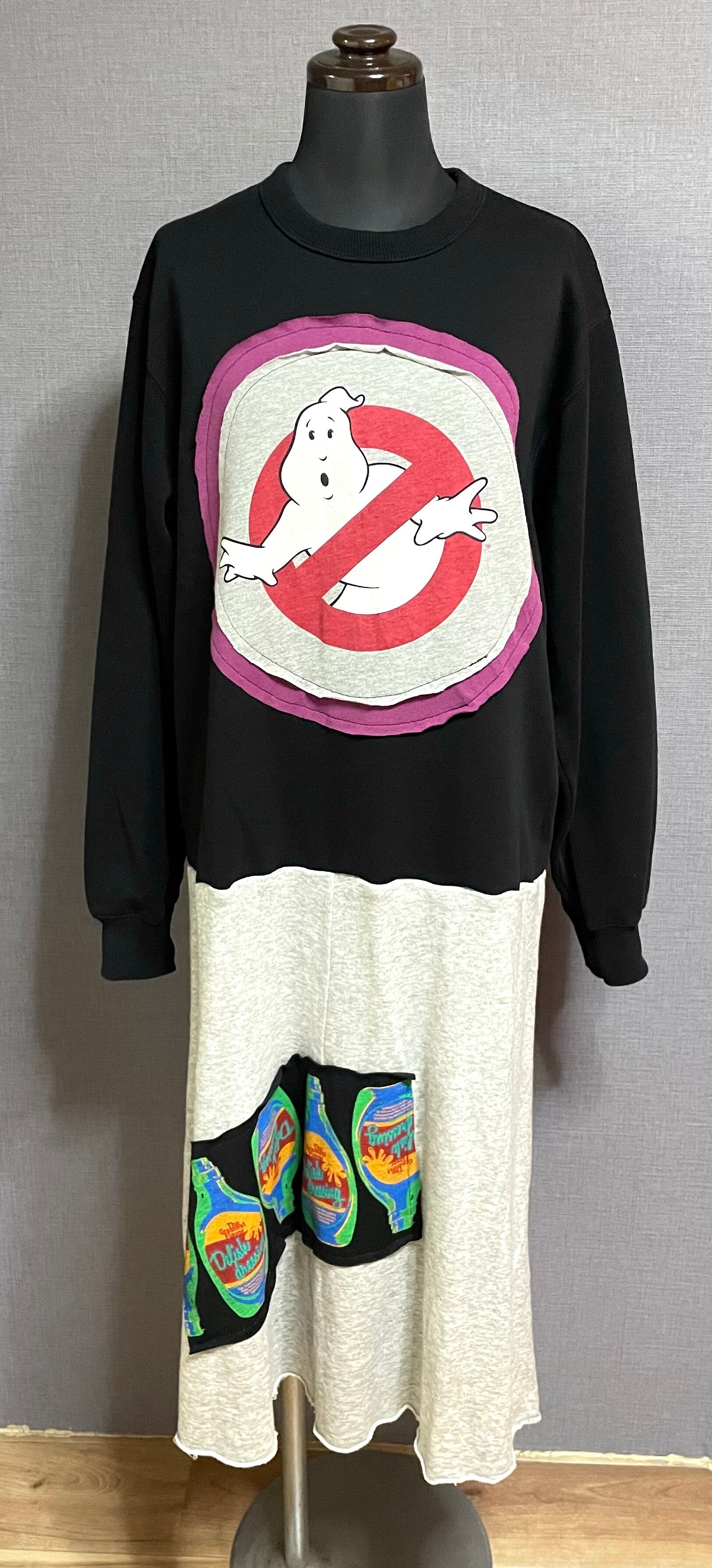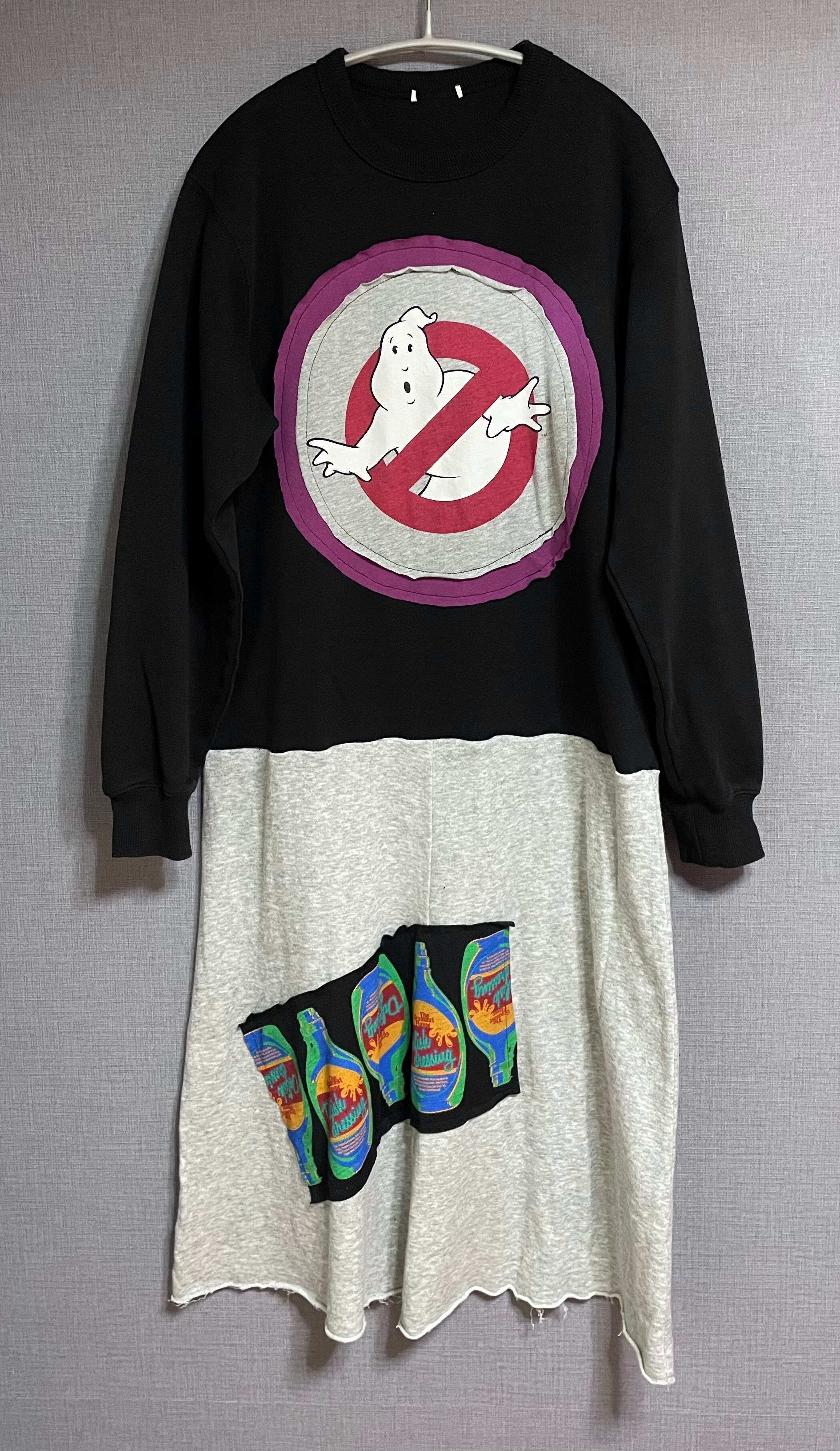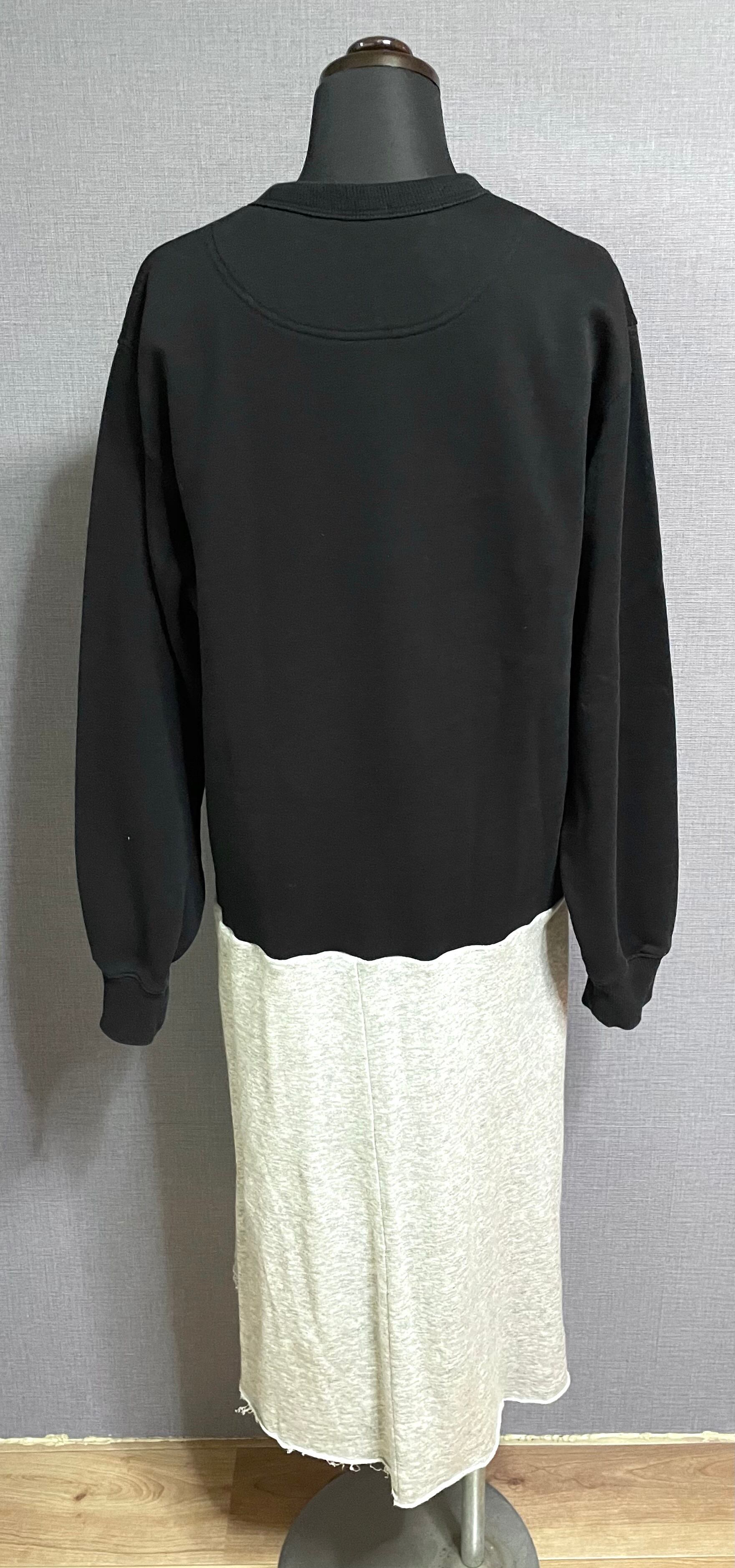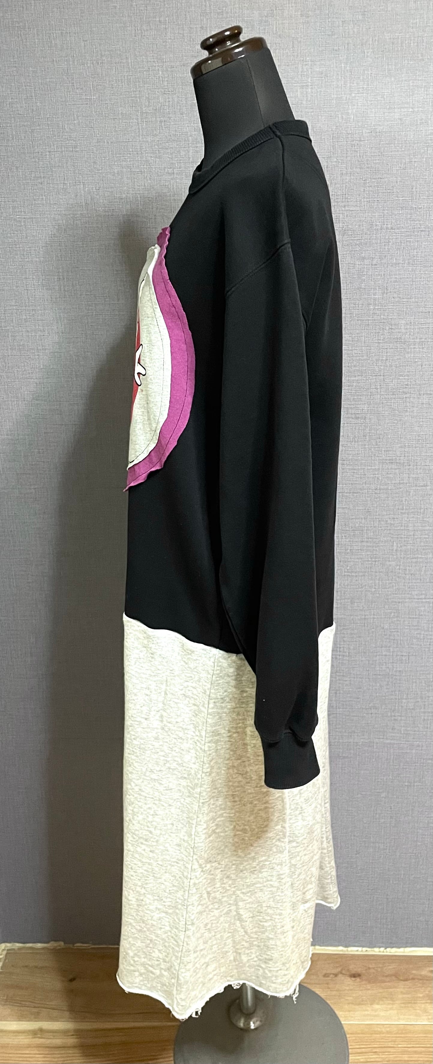 黒スウェットに困り顔くんを縫いつけ、ケチャップみたいなやつを縫い付けたグレー系の薄手スウェットスカートを合わせています♬