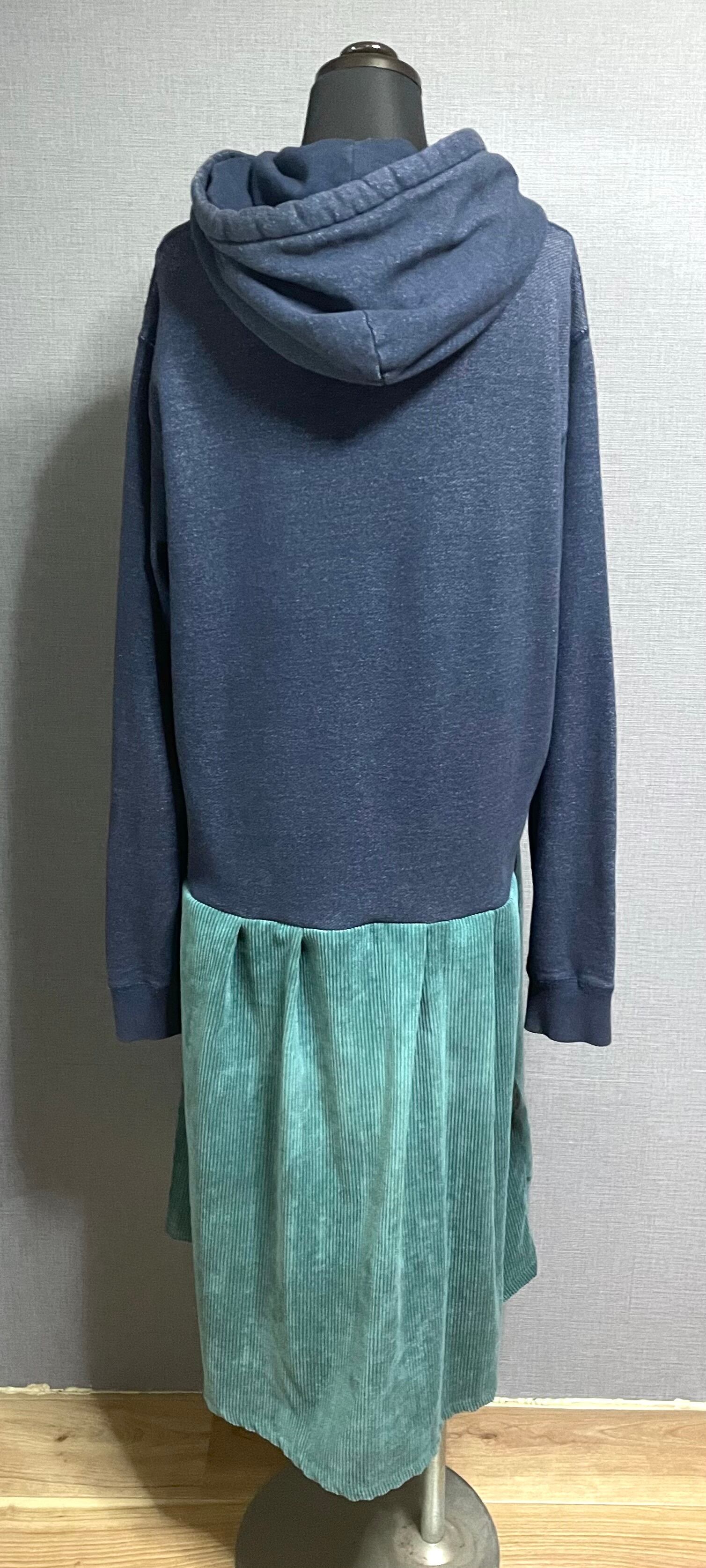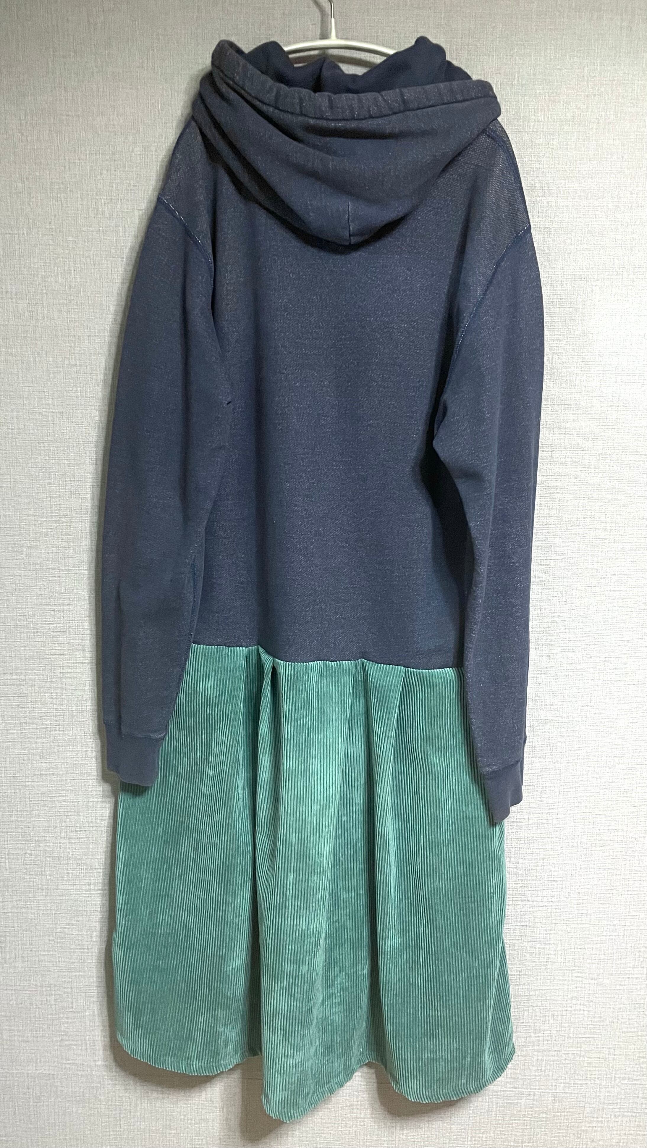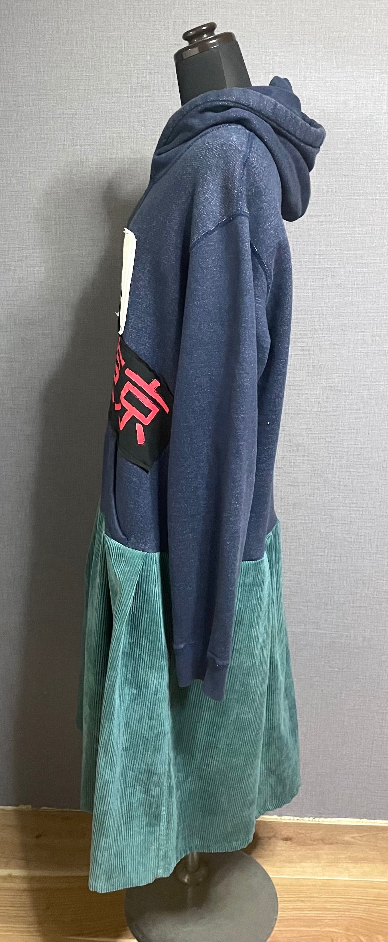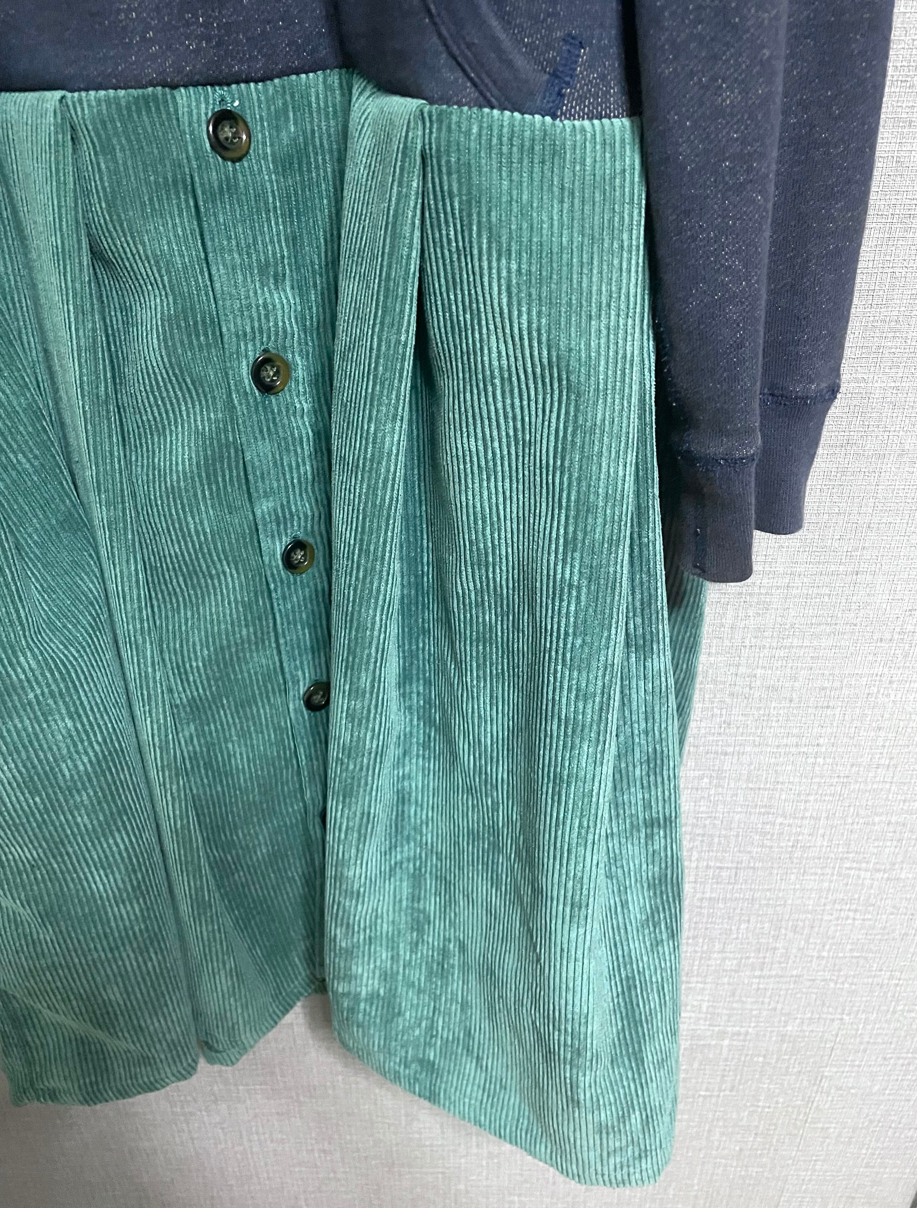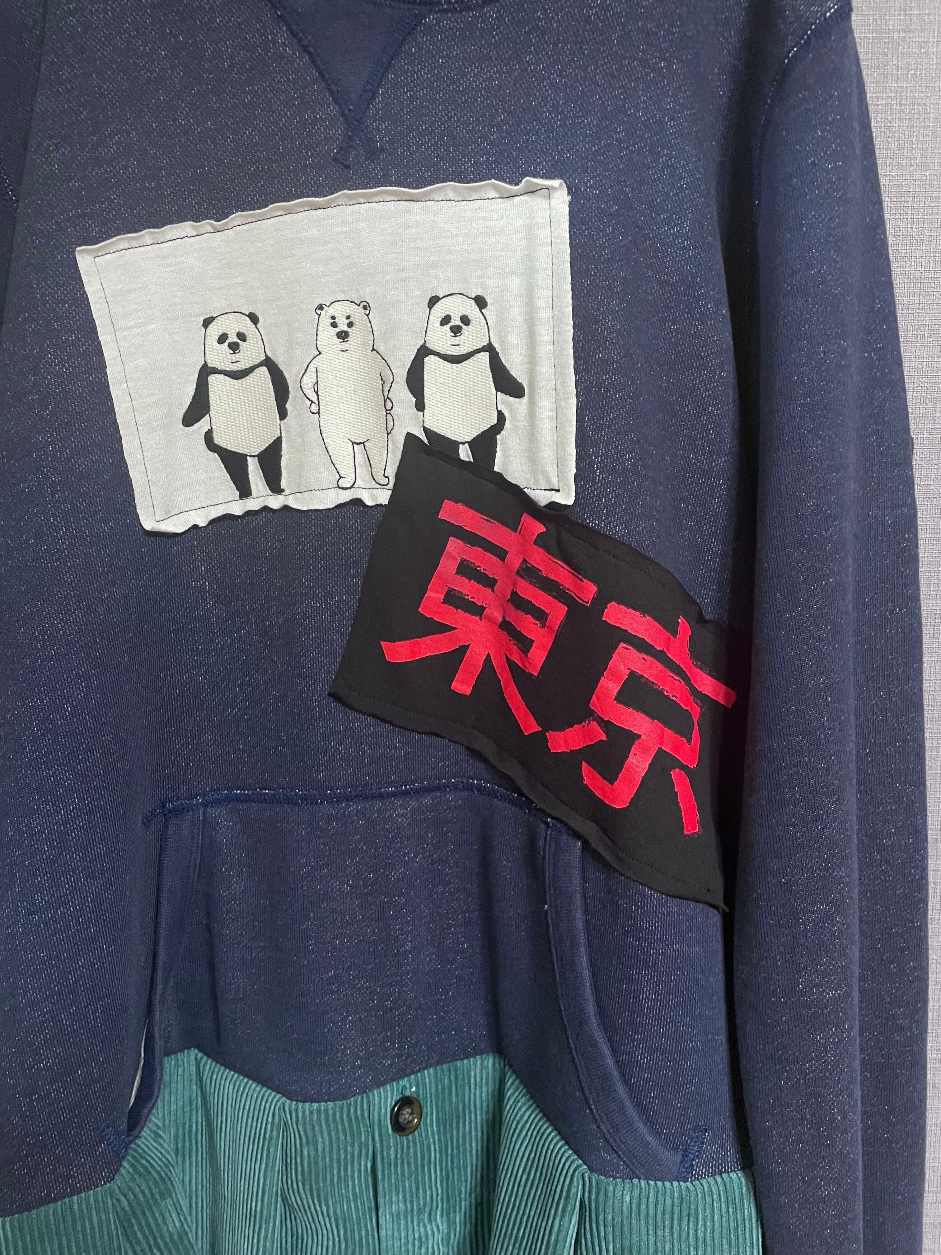 紺系のパーカーにパンダ白くまと東京を縫いつけ、モスグリーンのコーデュロイスカートを合わせています♬