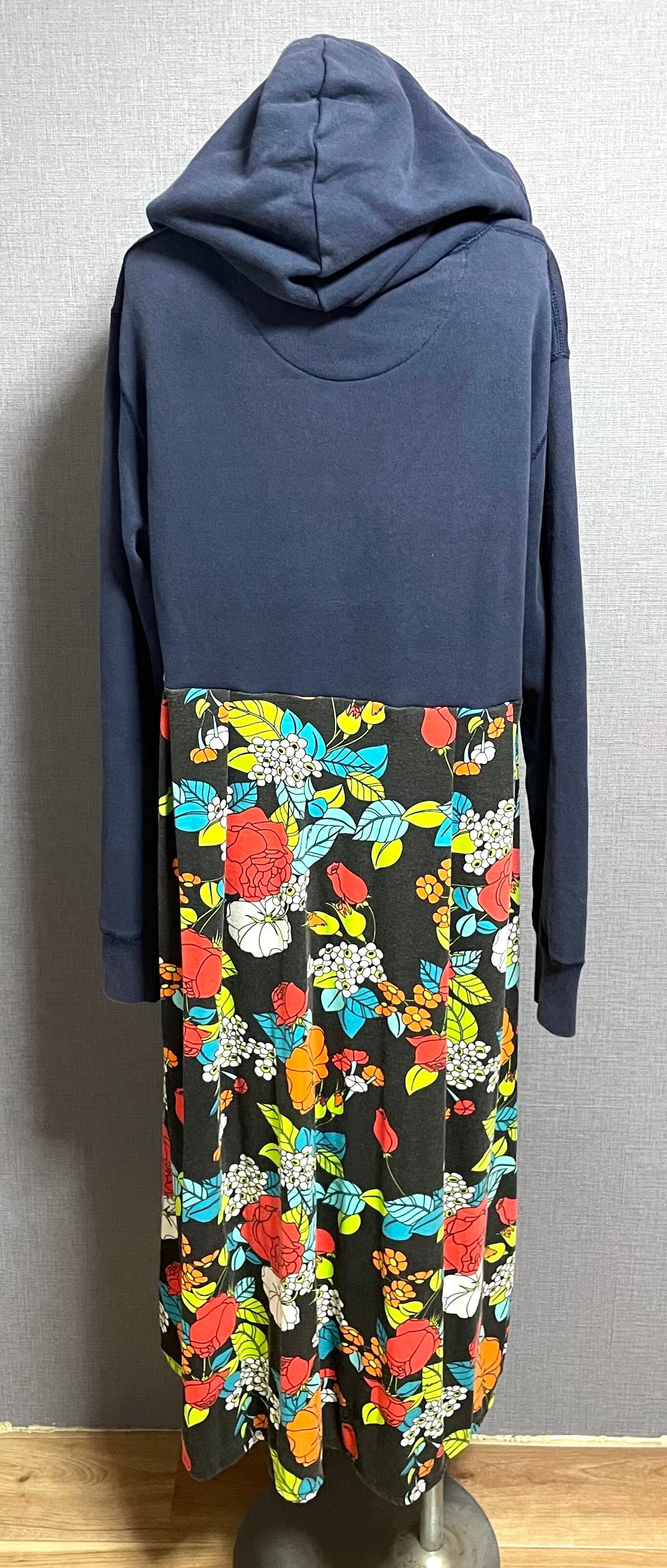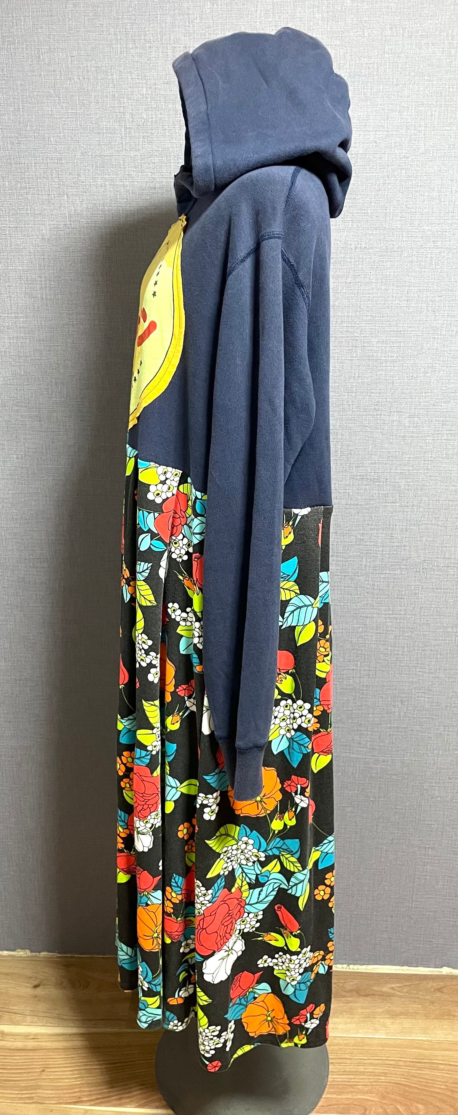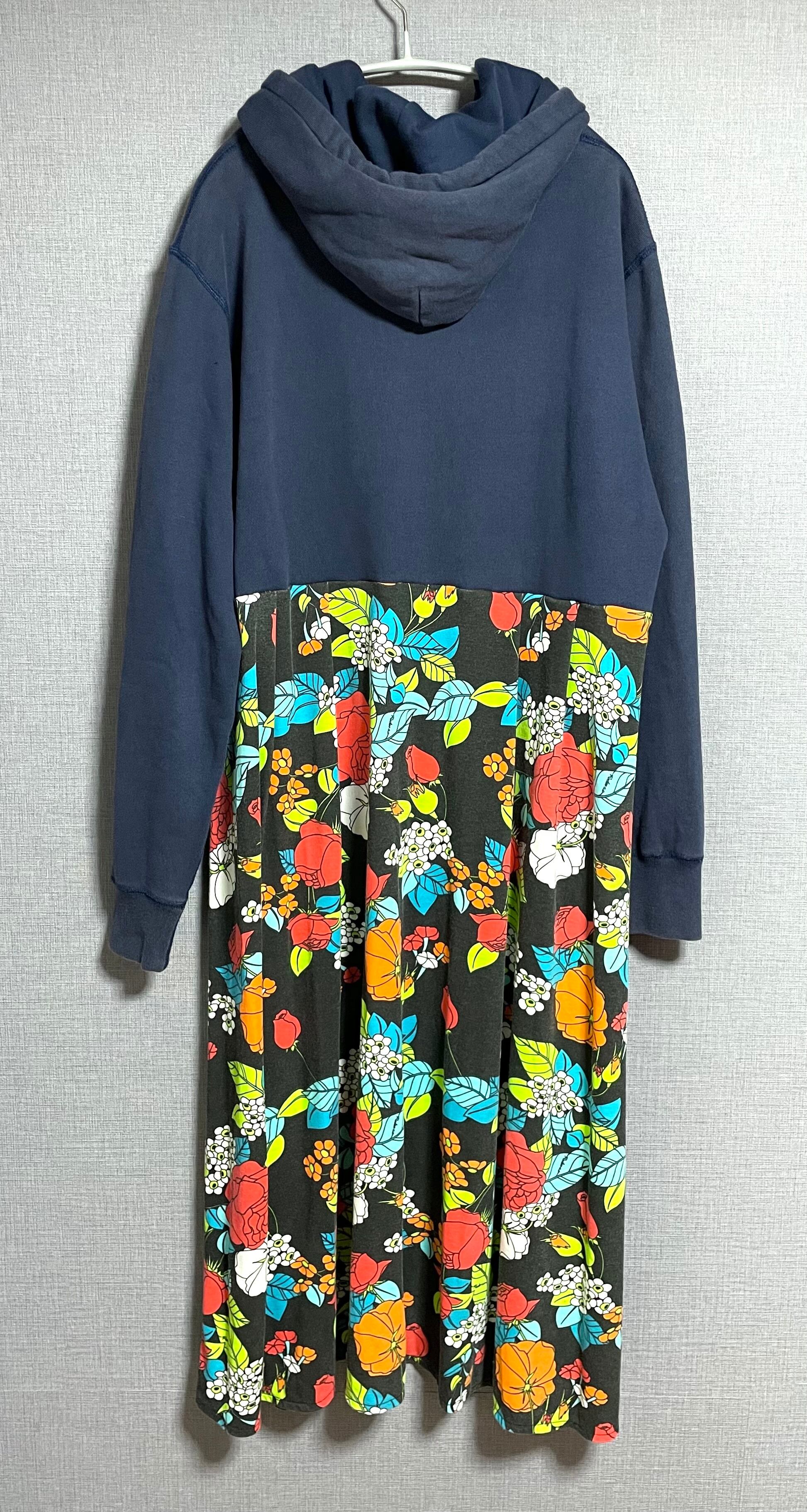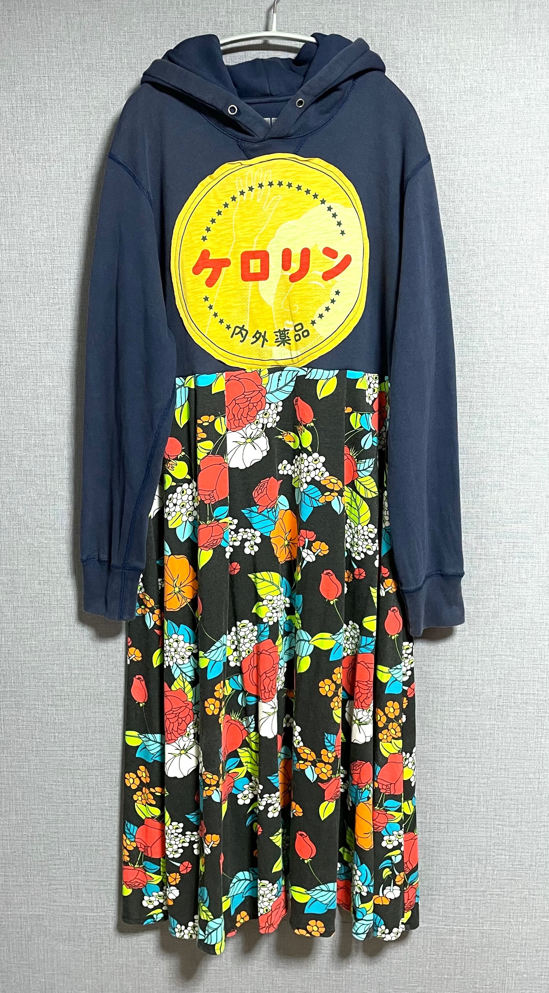 ネイビーパーカーにケロリンを縫いつけ、可愛い柄スカートを合わせています♬