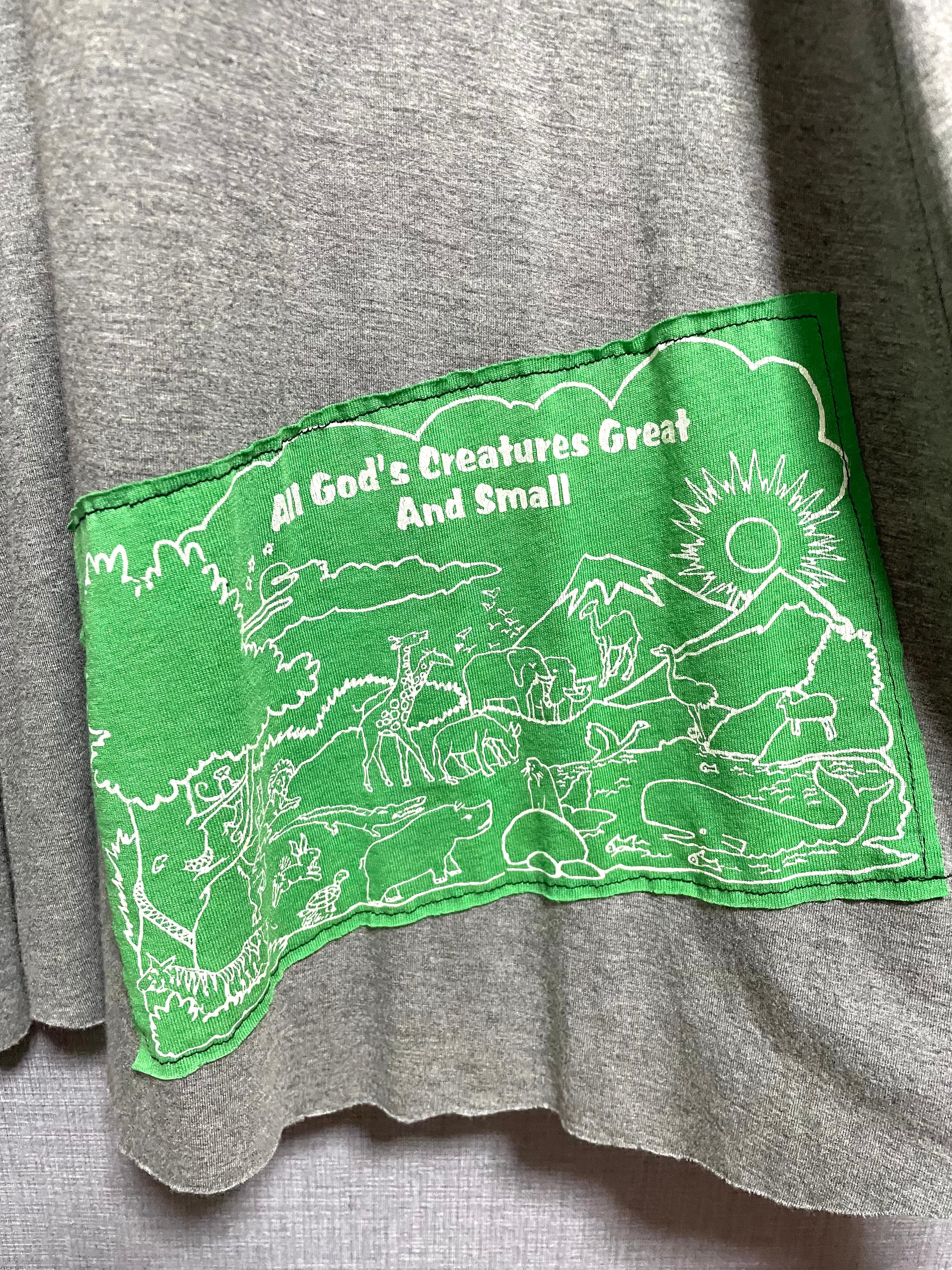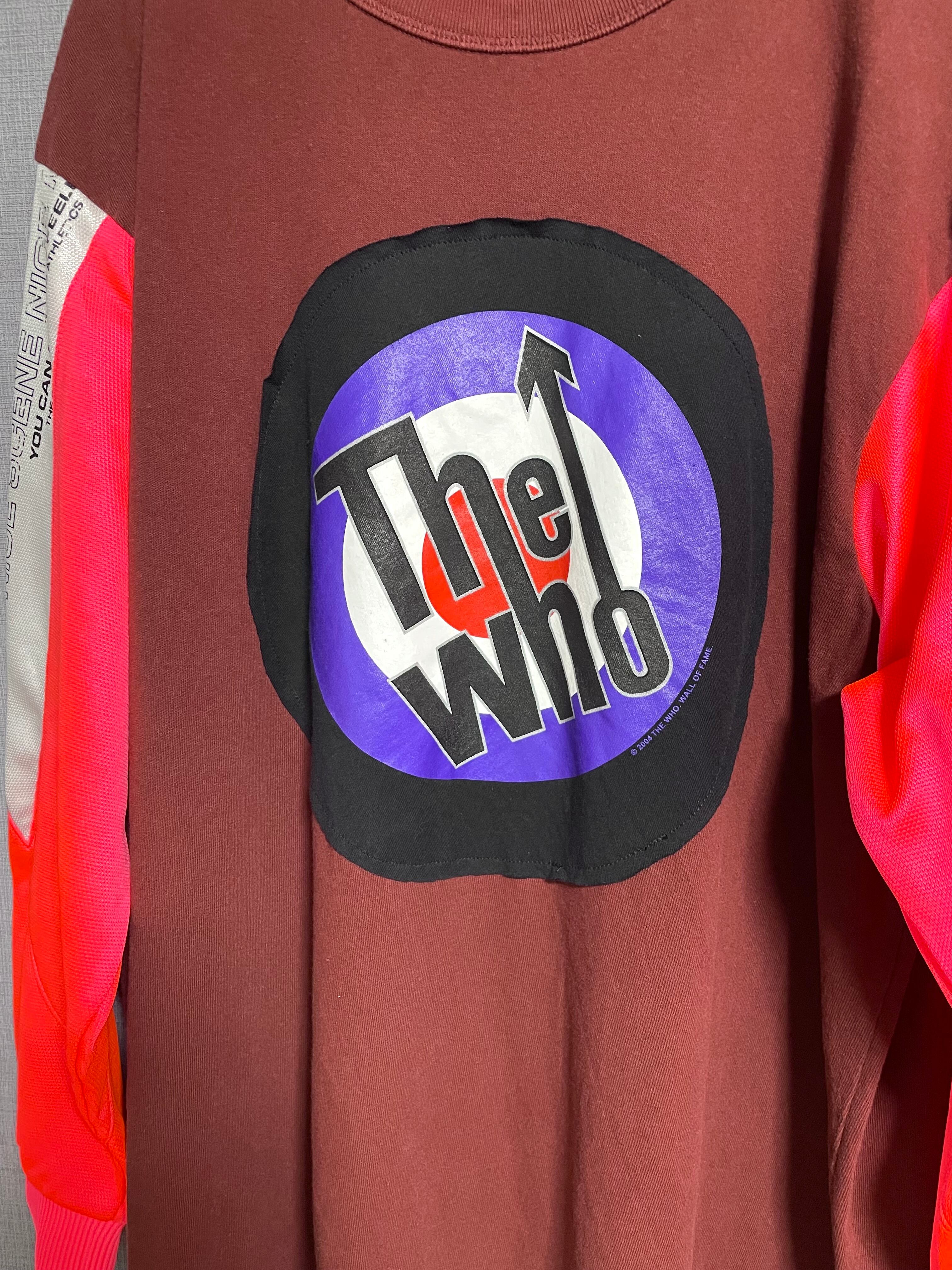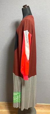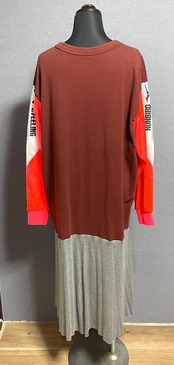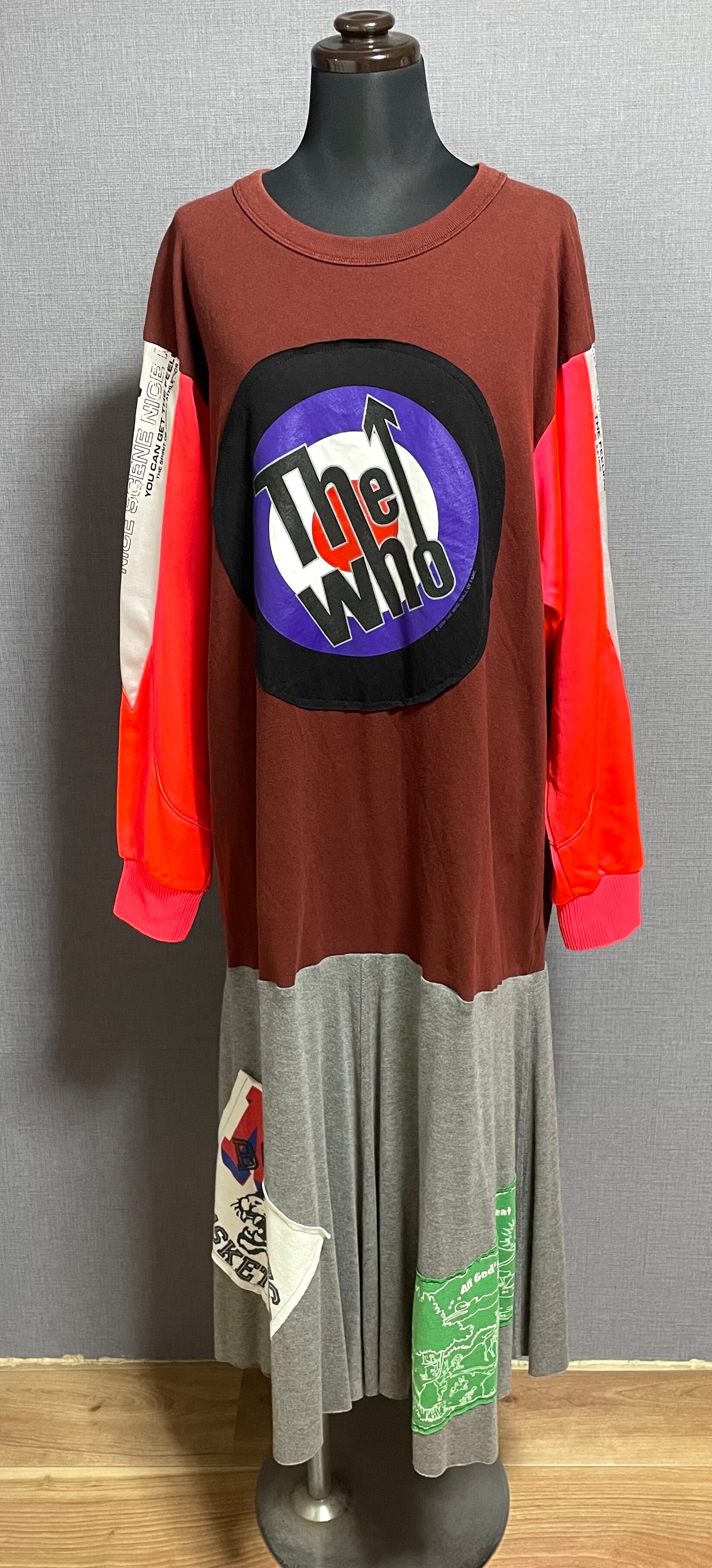 えんじ色Tシャツにザフーを縫いつけ、ピンクのジャージ袖を合わせ、Tシャツの切れ端を縫い付けたグレースカートを合わせています♬