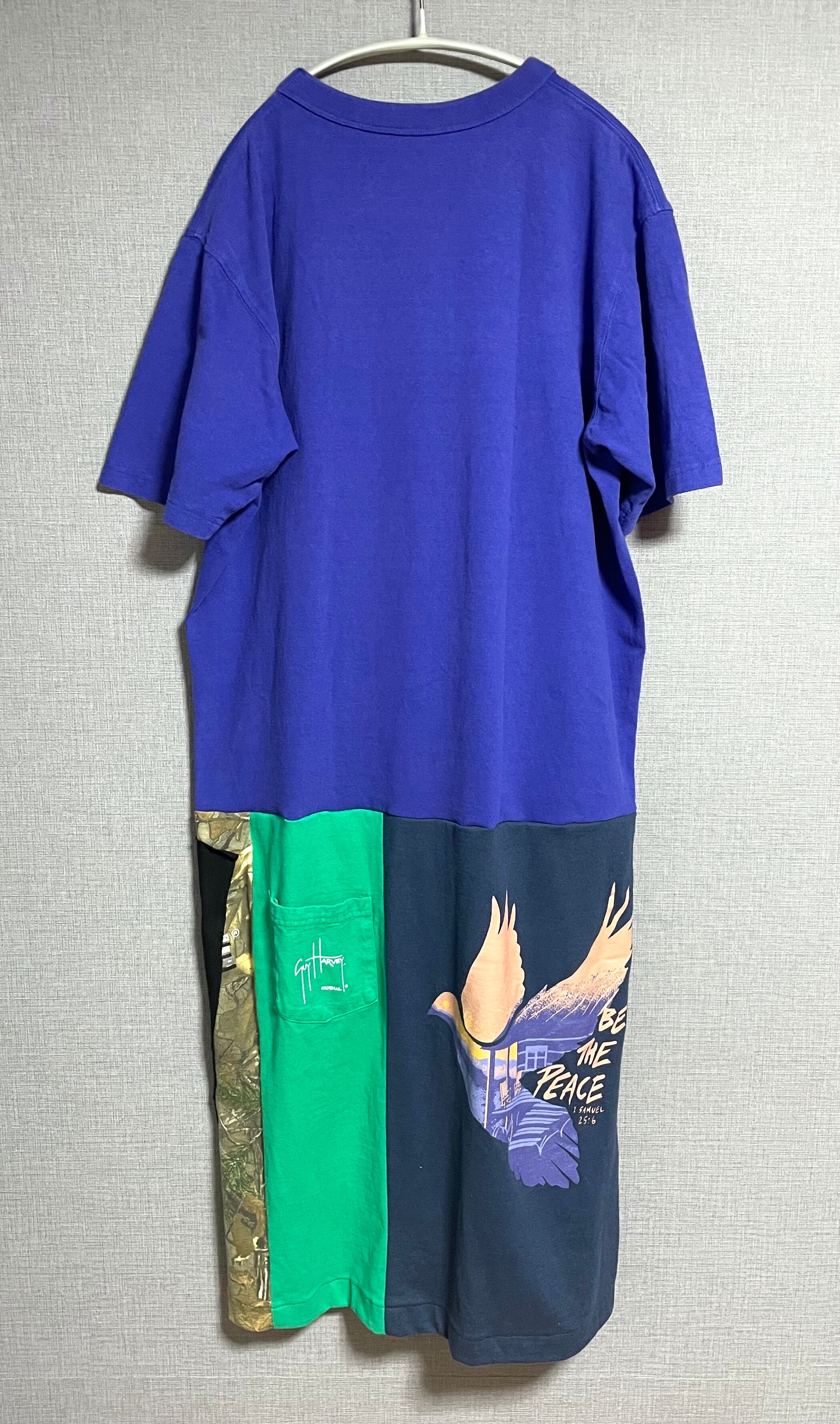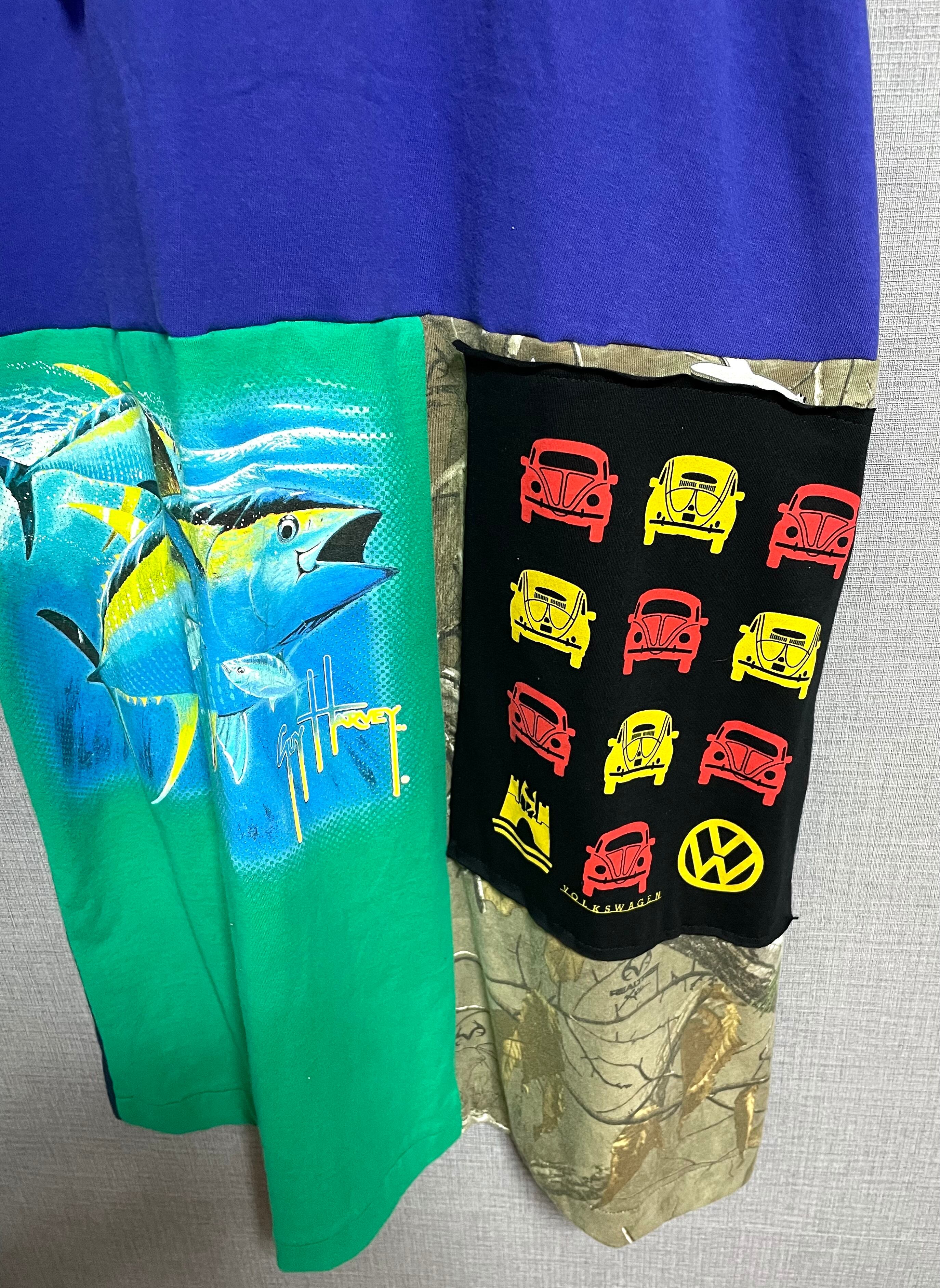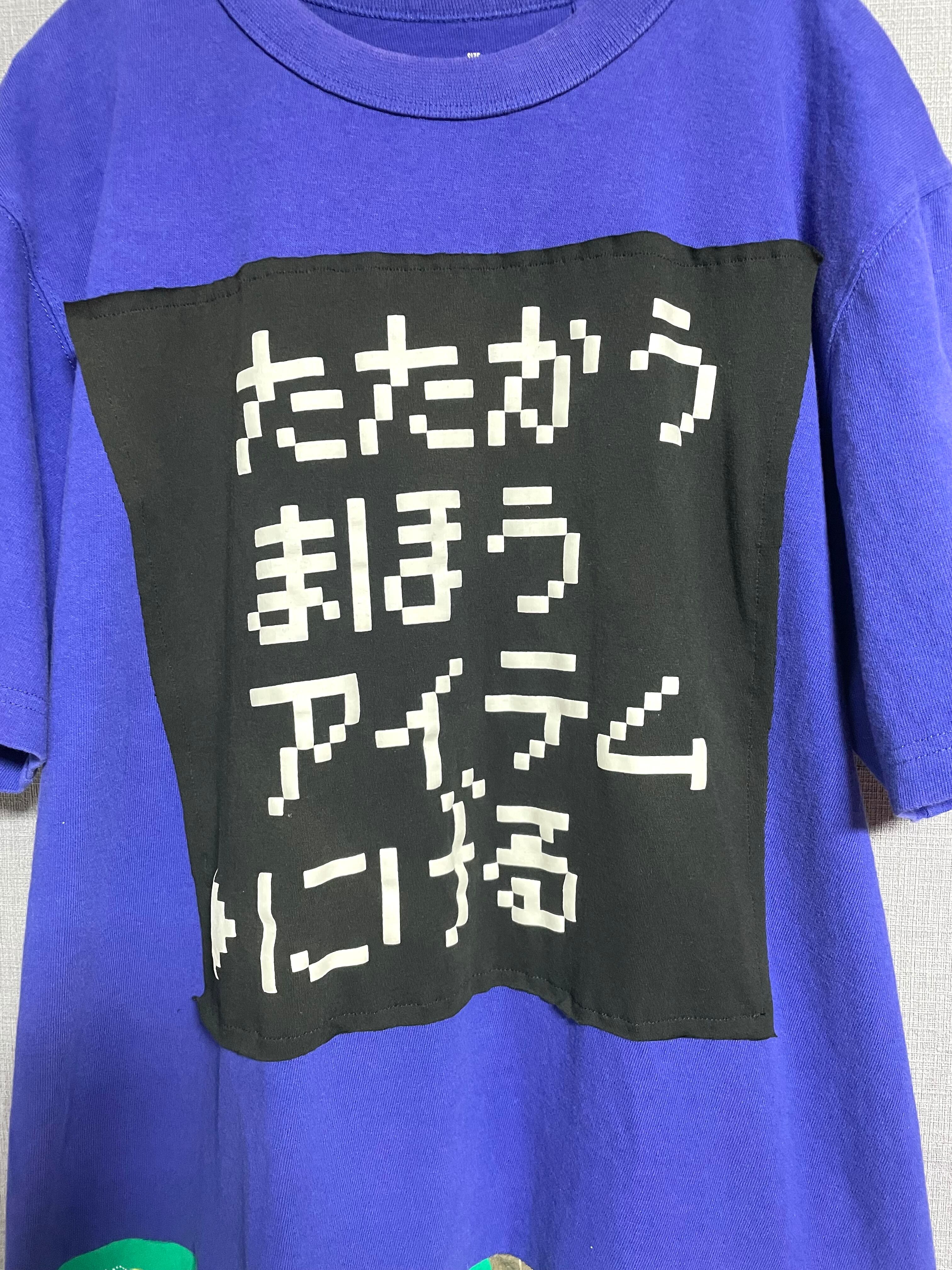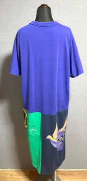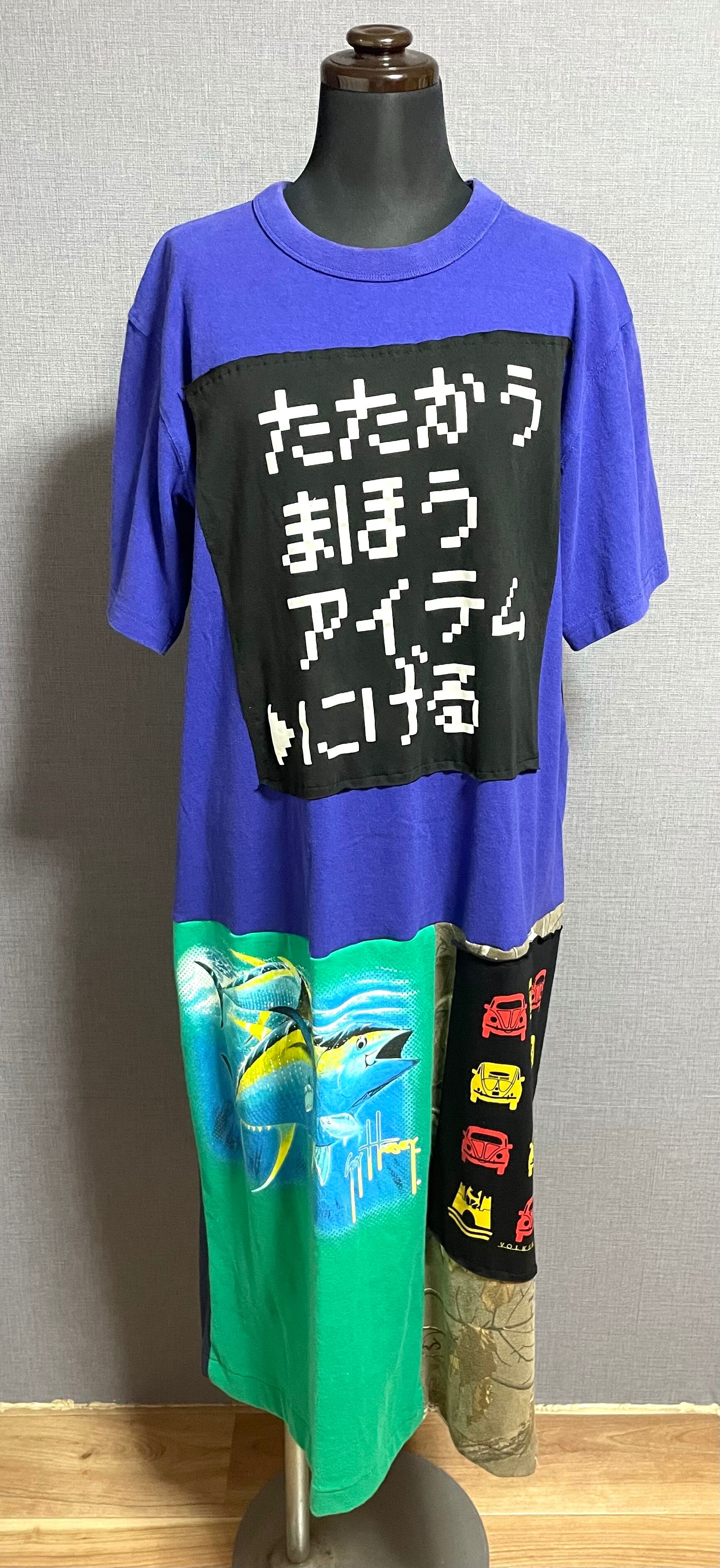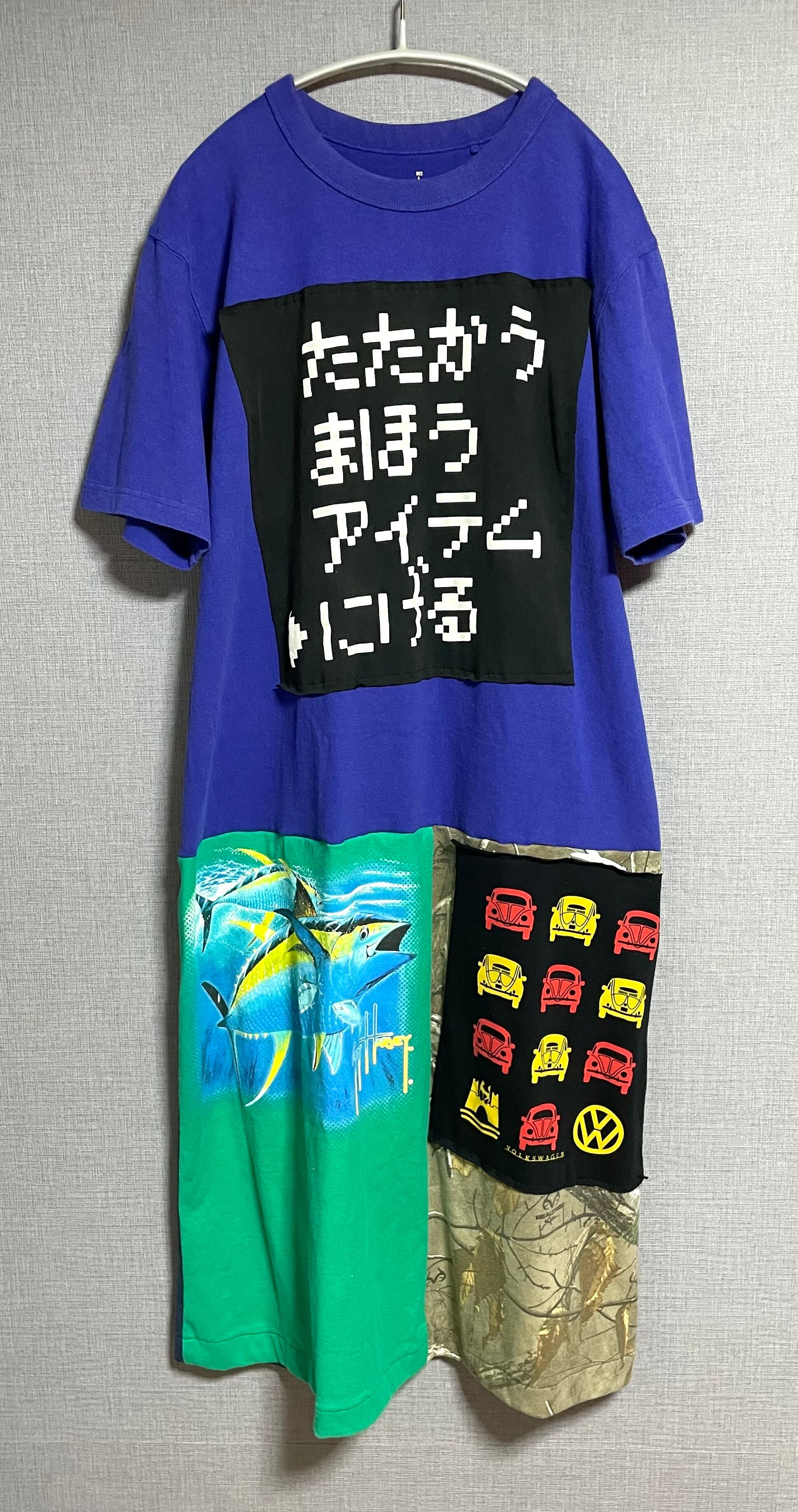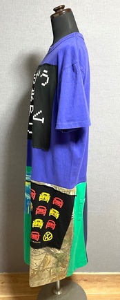 紫っぽい青いTシャツにかわいいやつを縫いつけ、いろんなTシャツで作ったスカートを合わせています♬