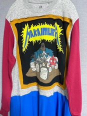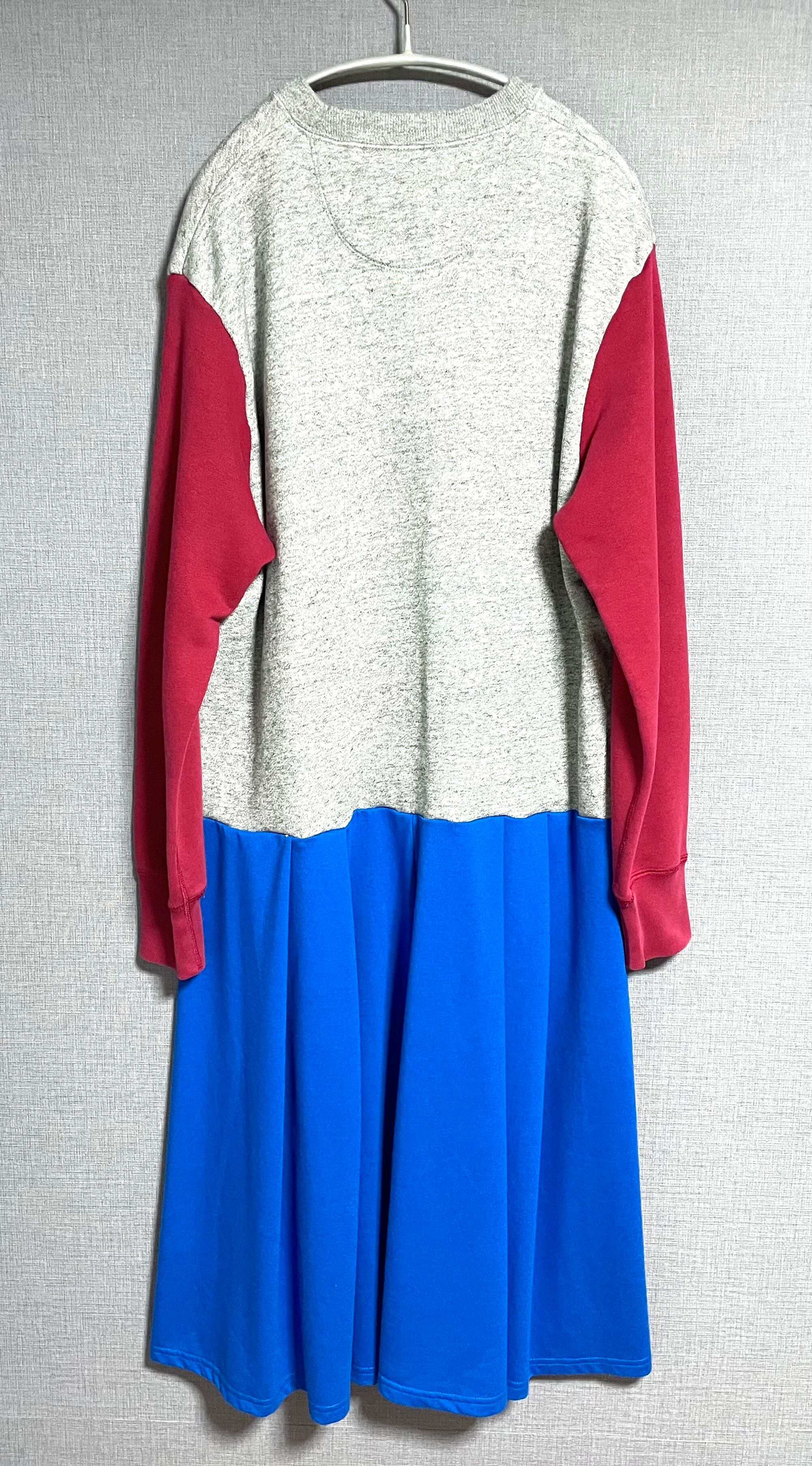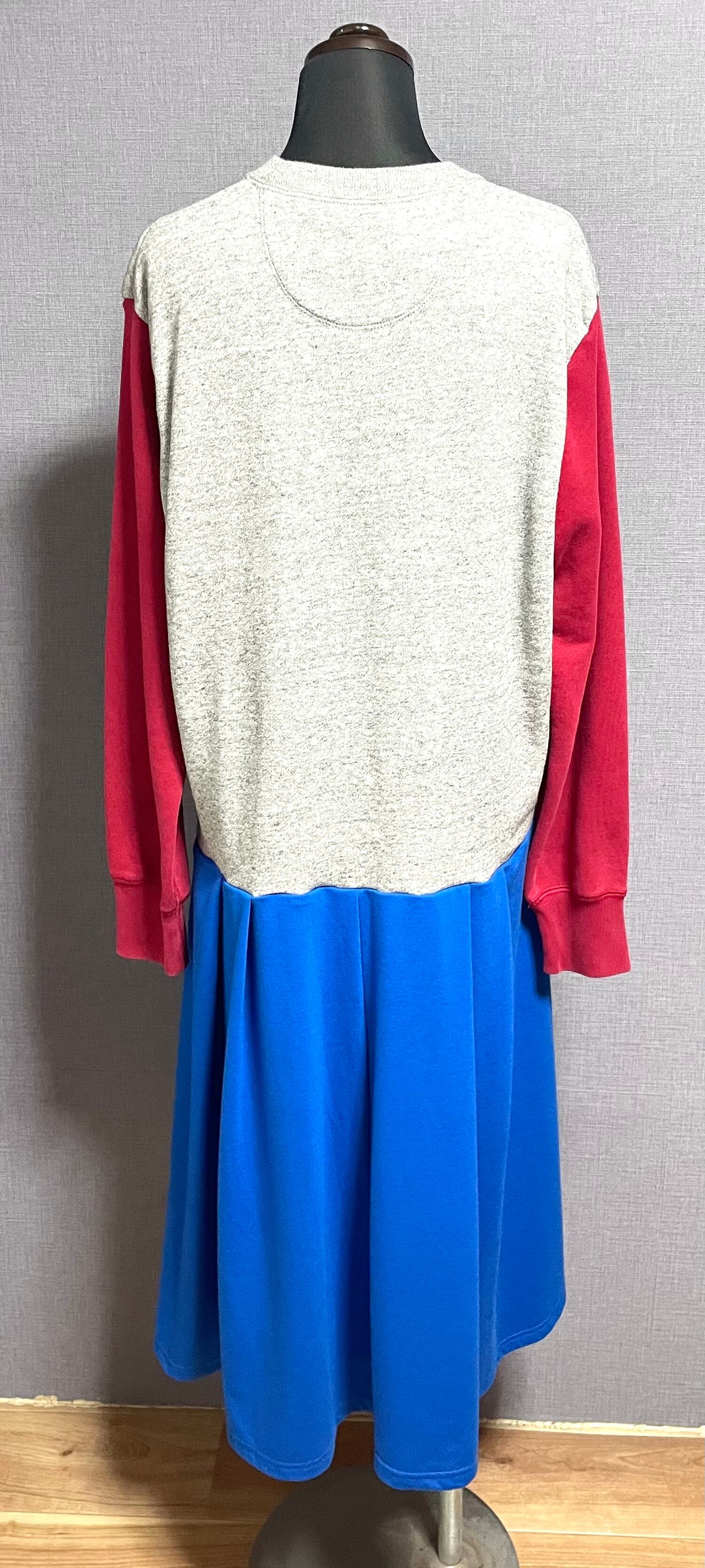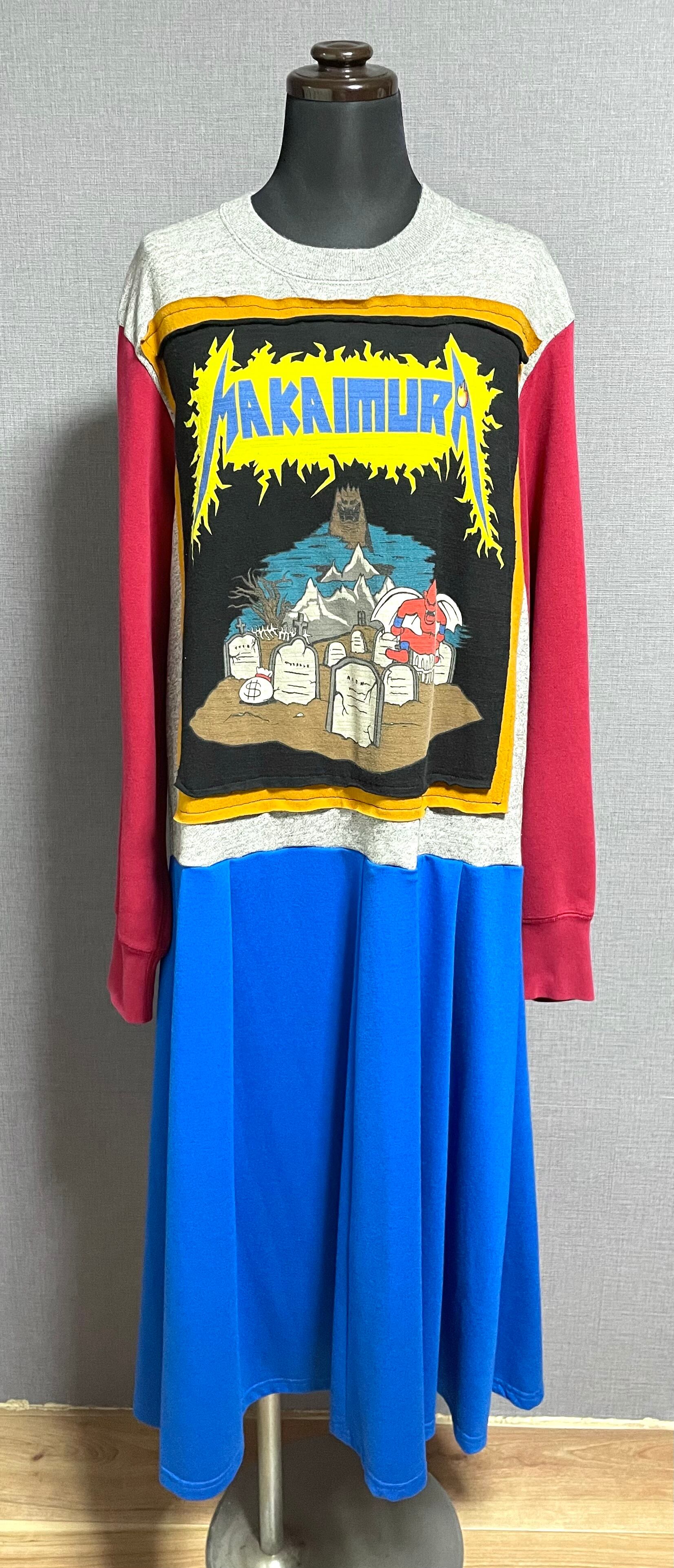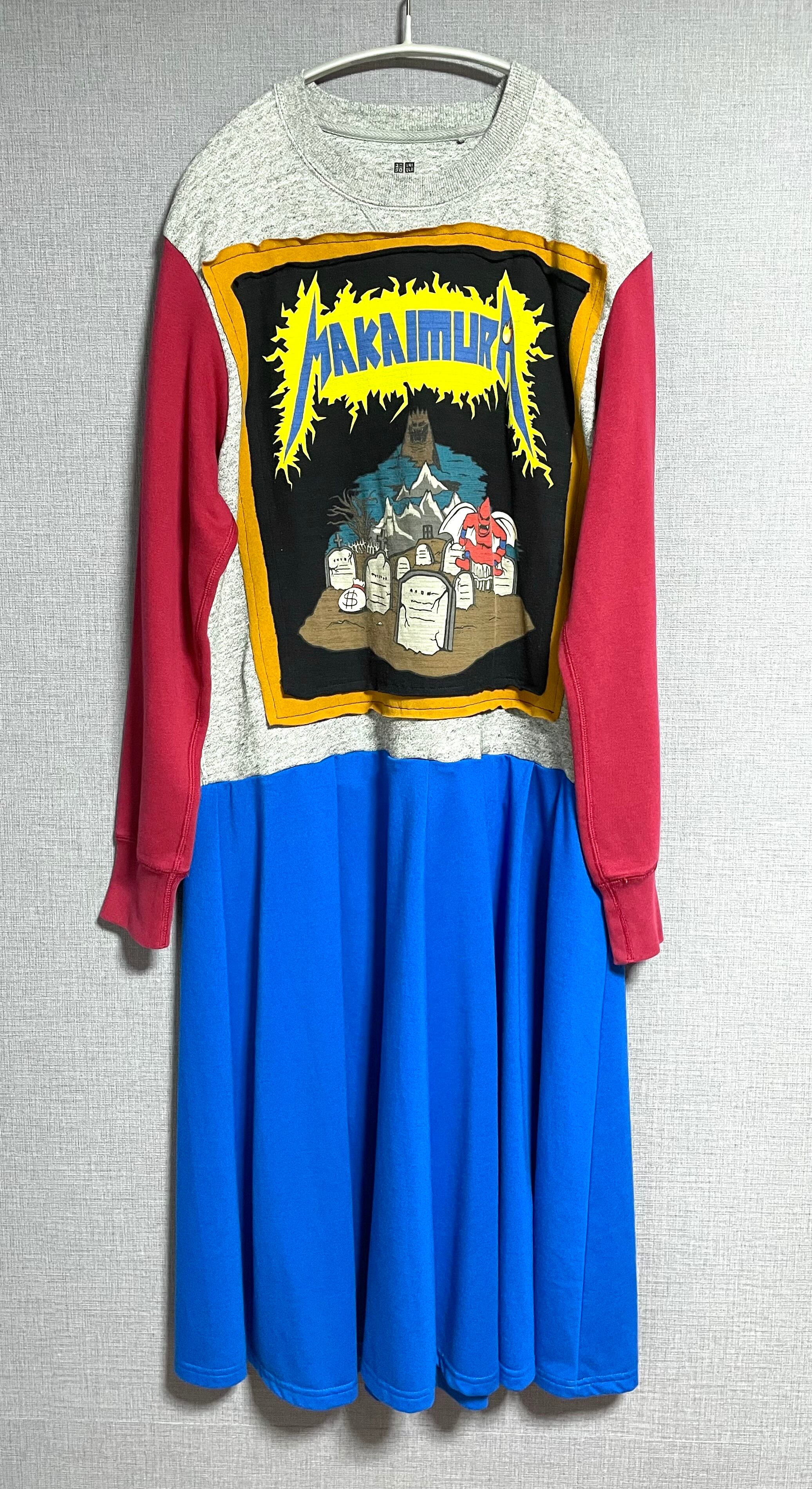 グレーのスウェットに魔界村を縫いつけ渋めの赤袖を合わせ、鮮やか青スカートを合わせています♬