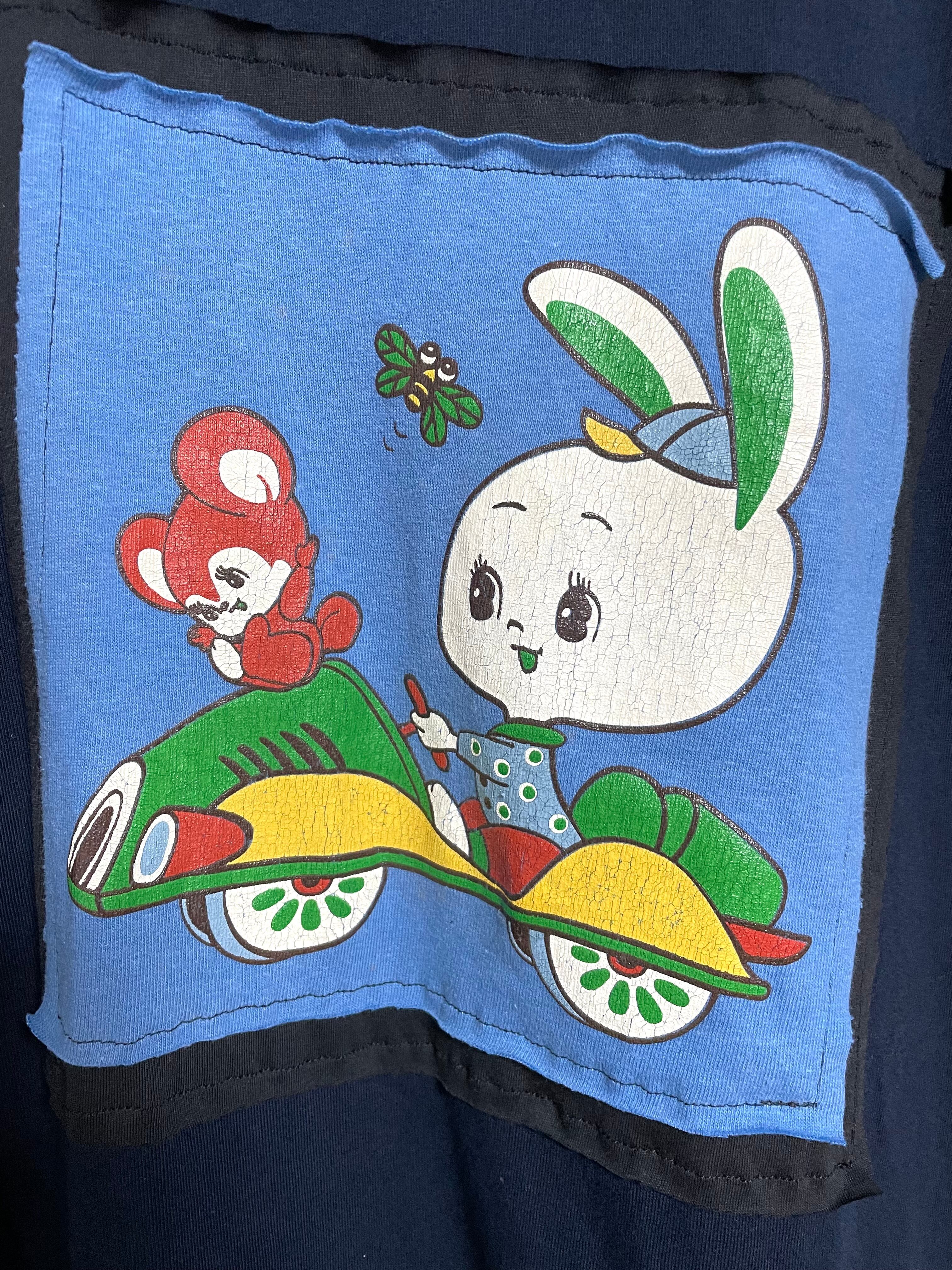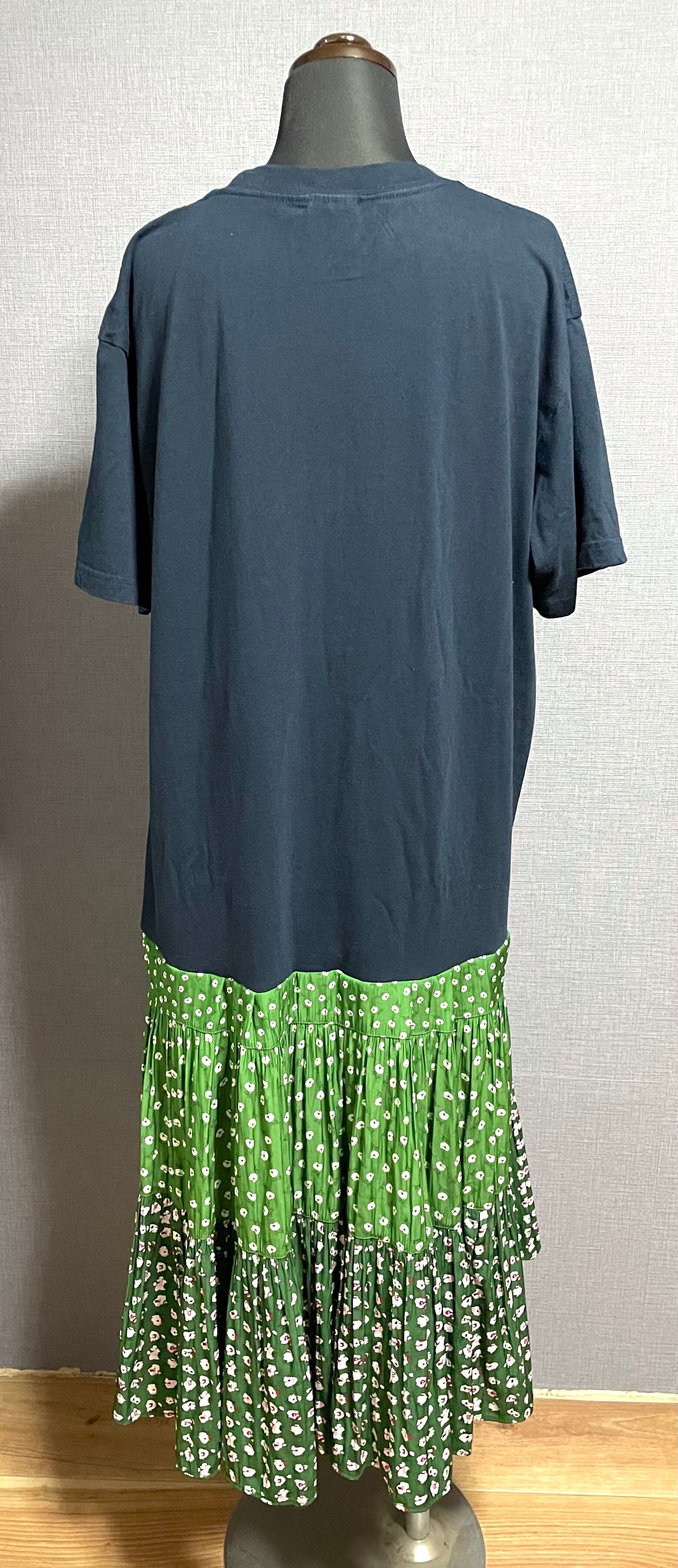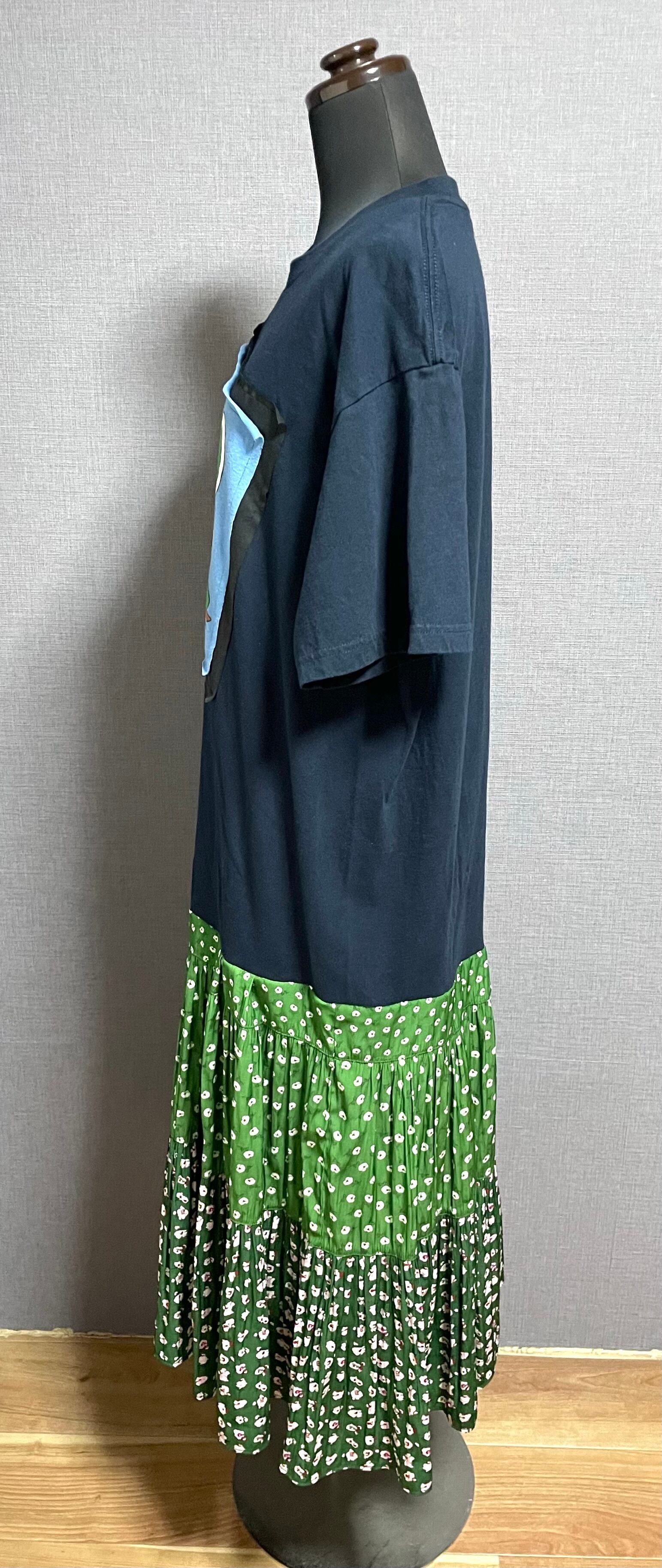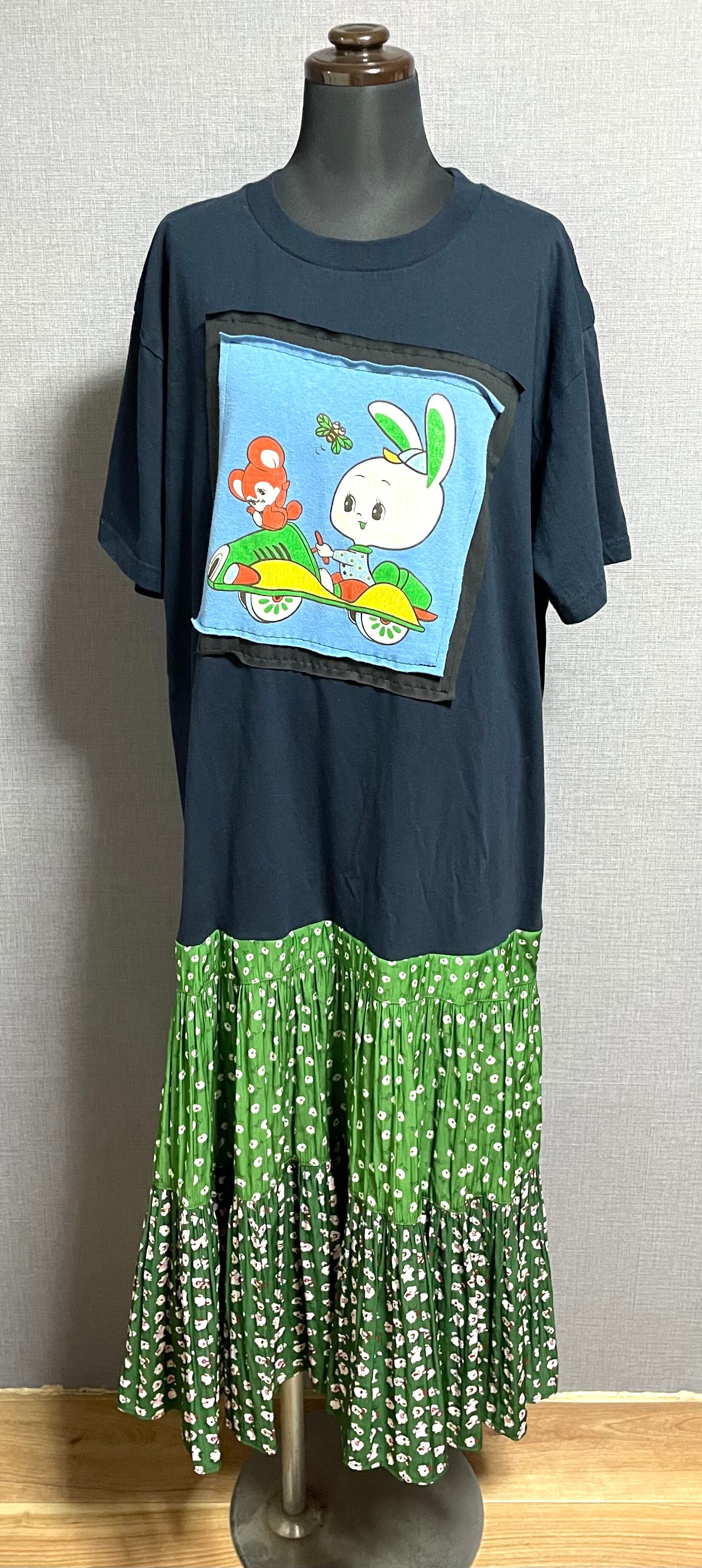 ネイビーのTシャツにかわいい動物を縫いつけ、グリーン系の柄スカートを合わせています♬