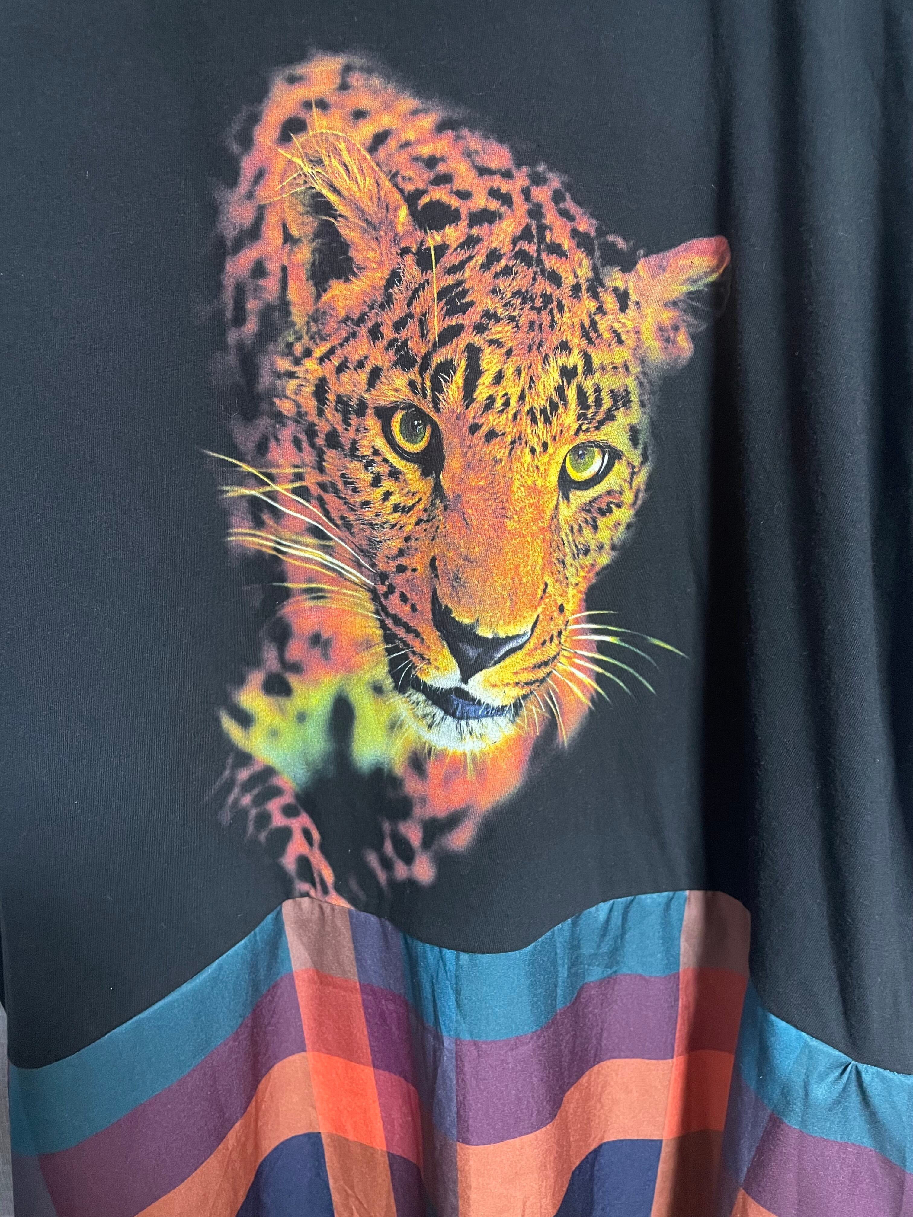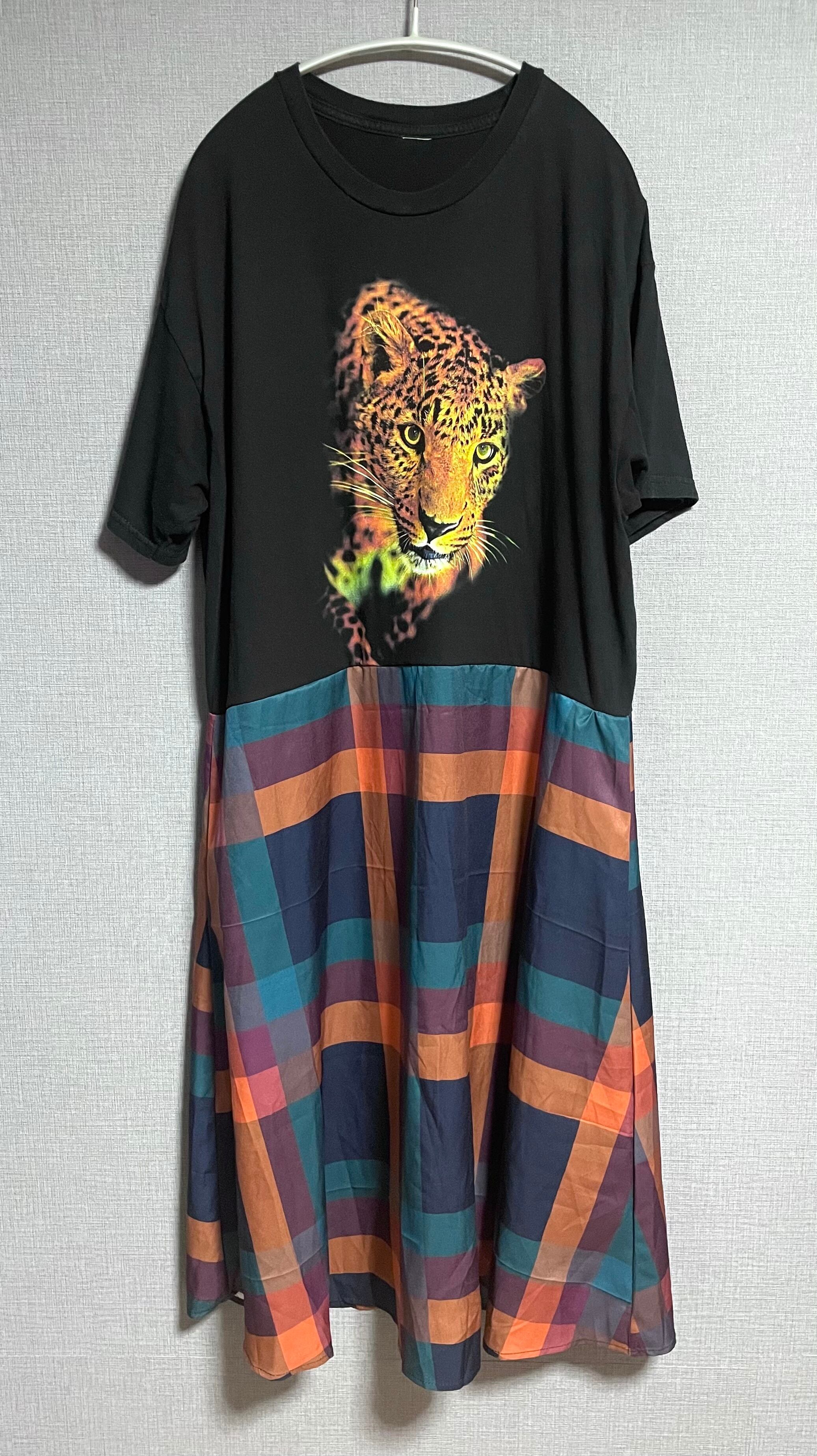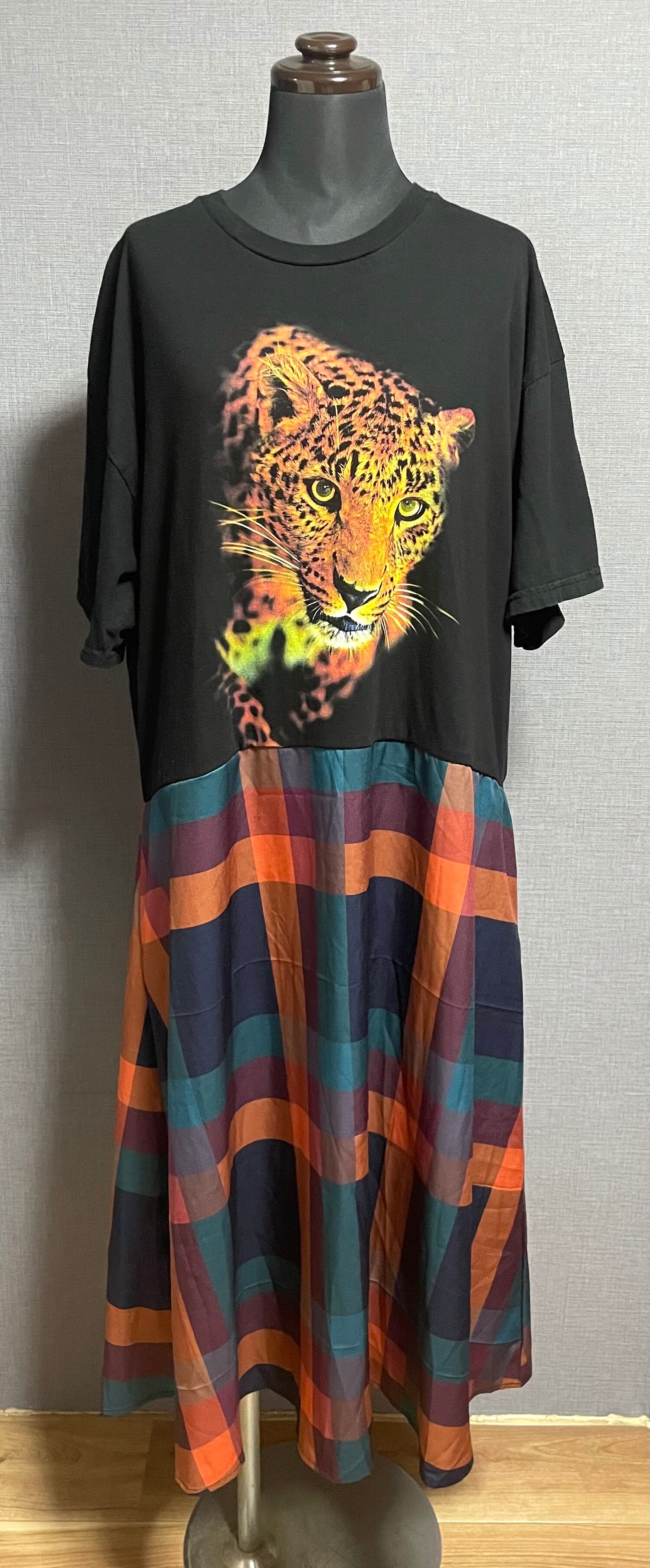 豹が素晴らしい黒Tシャツに、チェック柄スカートを合わせています♬