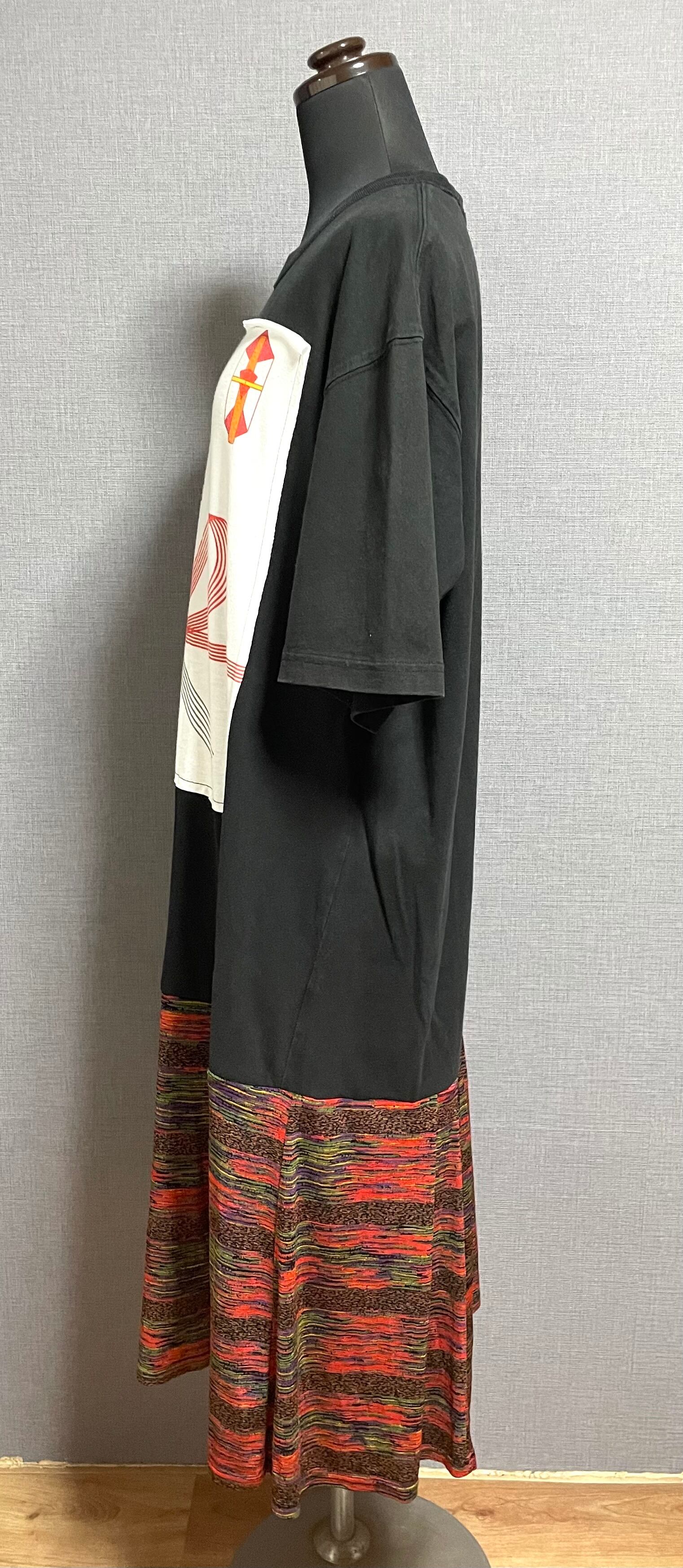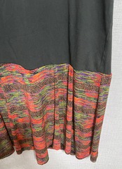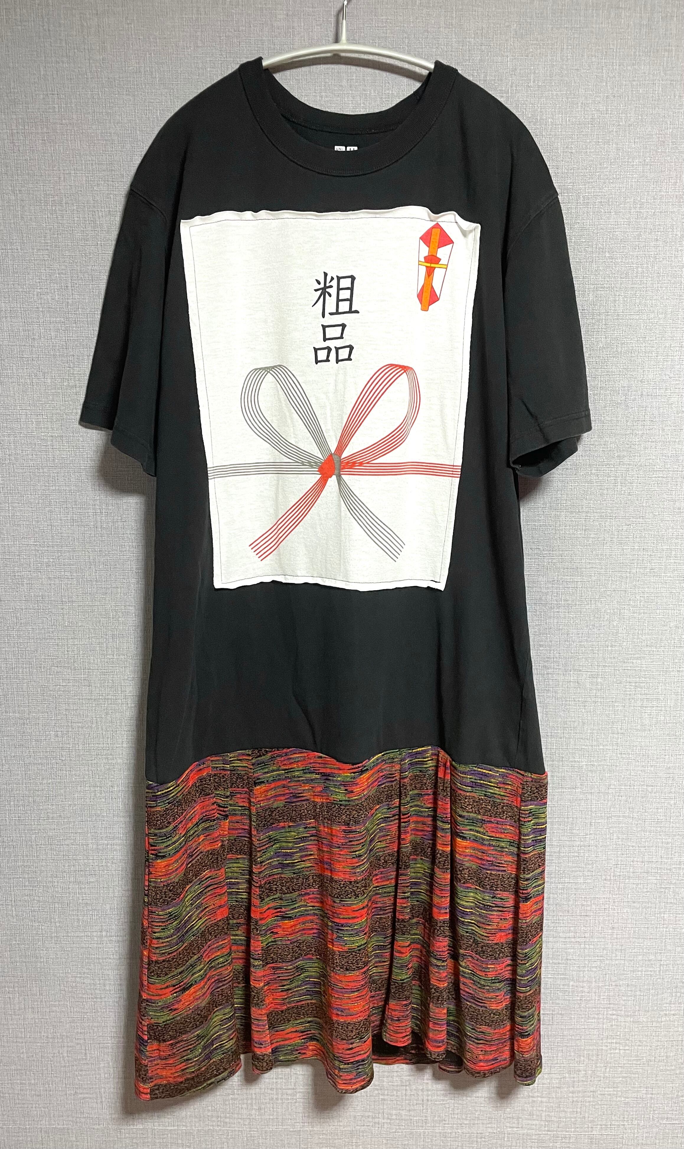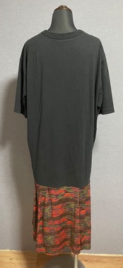 黒Tシャツに粗品を縫いつけ、柄スカートを合わせています♬
