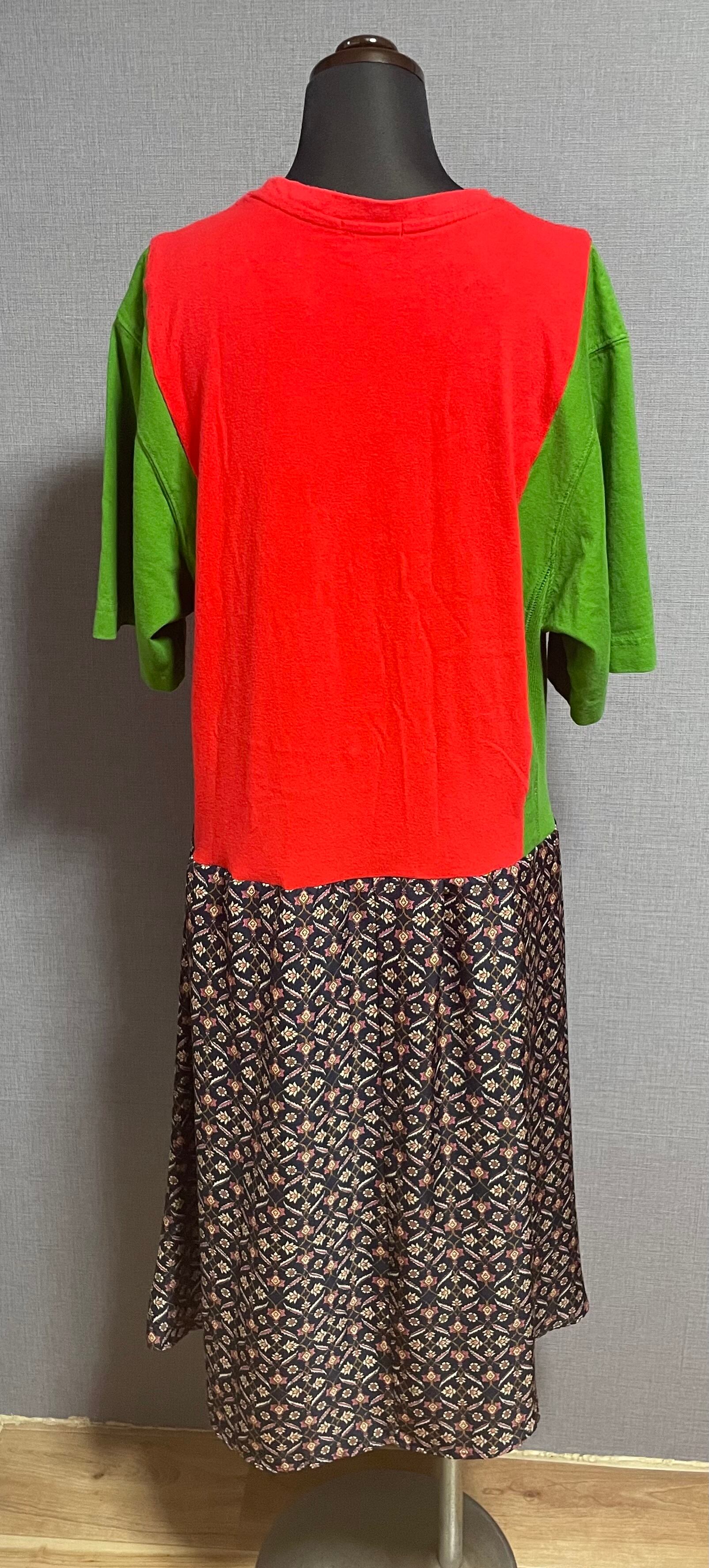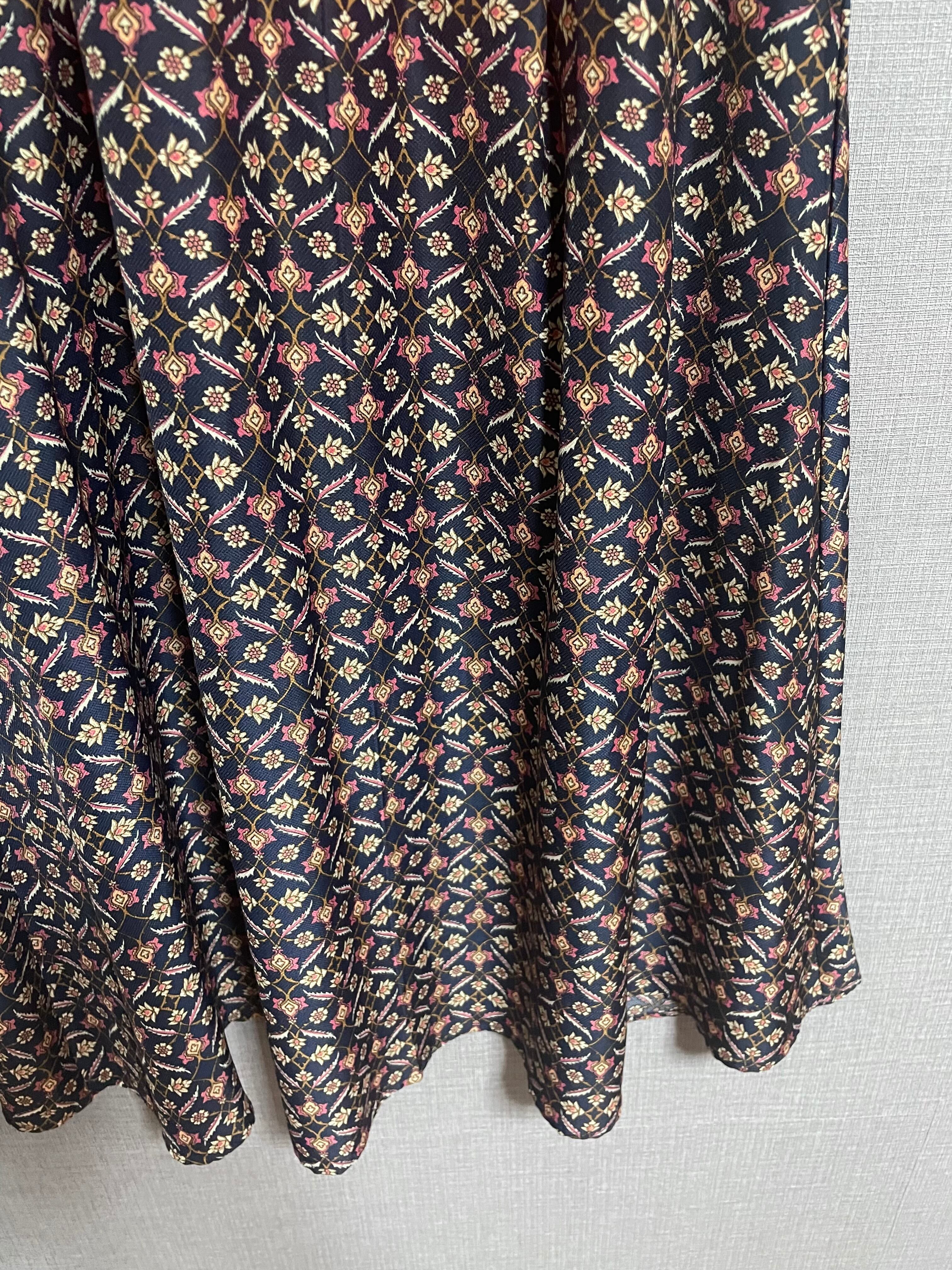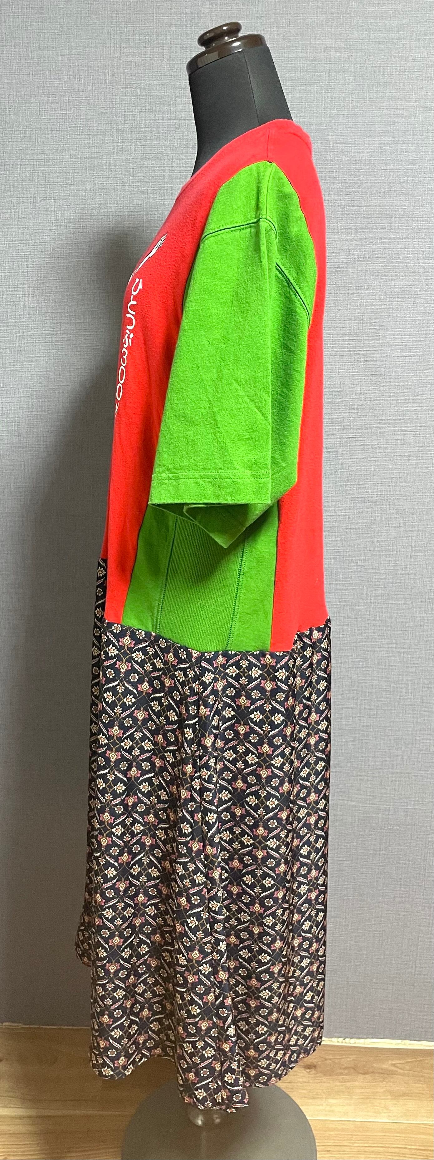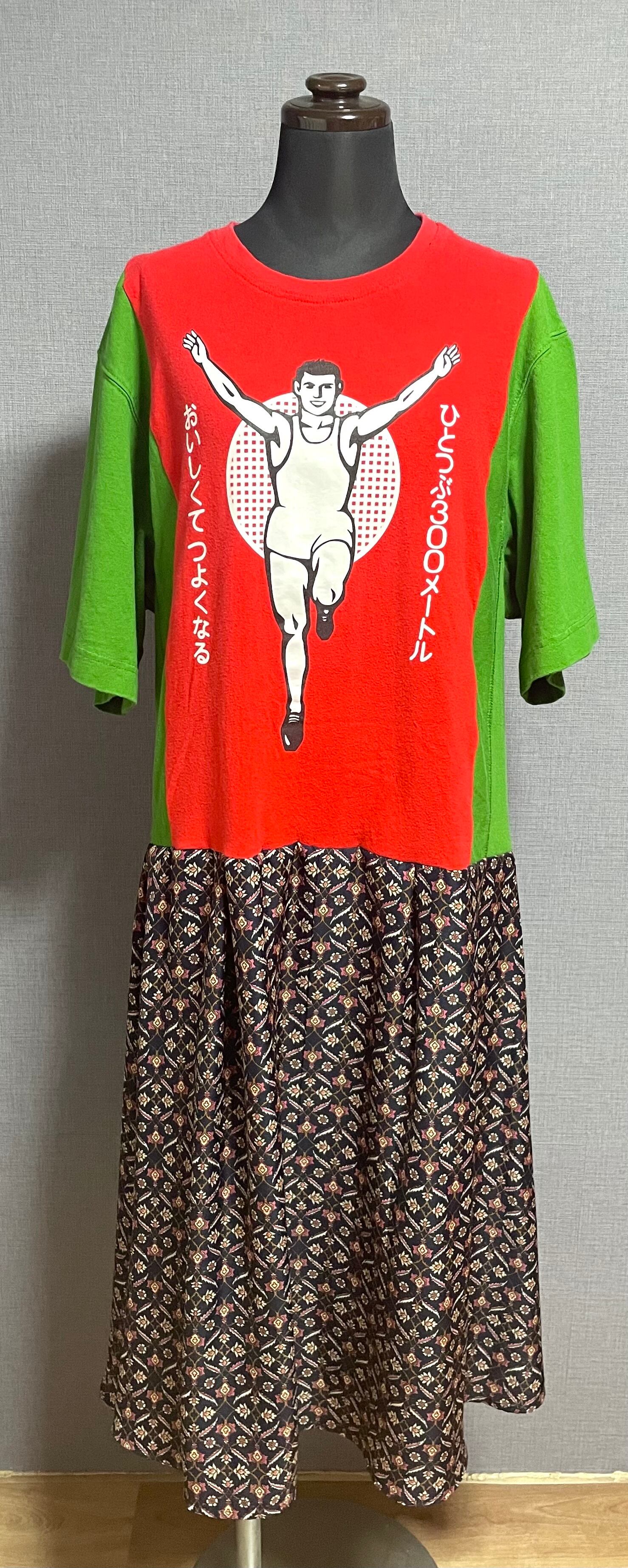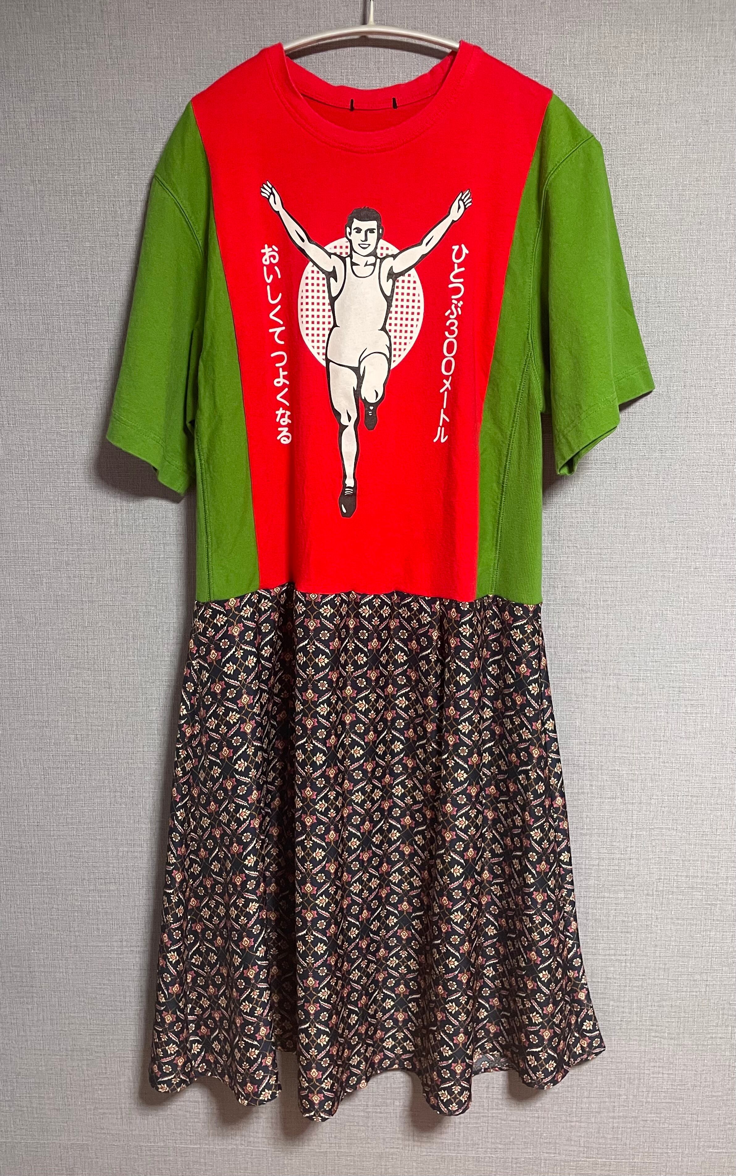 一粒で300メートルTシャツに抹茶色の袖を合わせ、レトロ調の柄スカートを合わせています♬