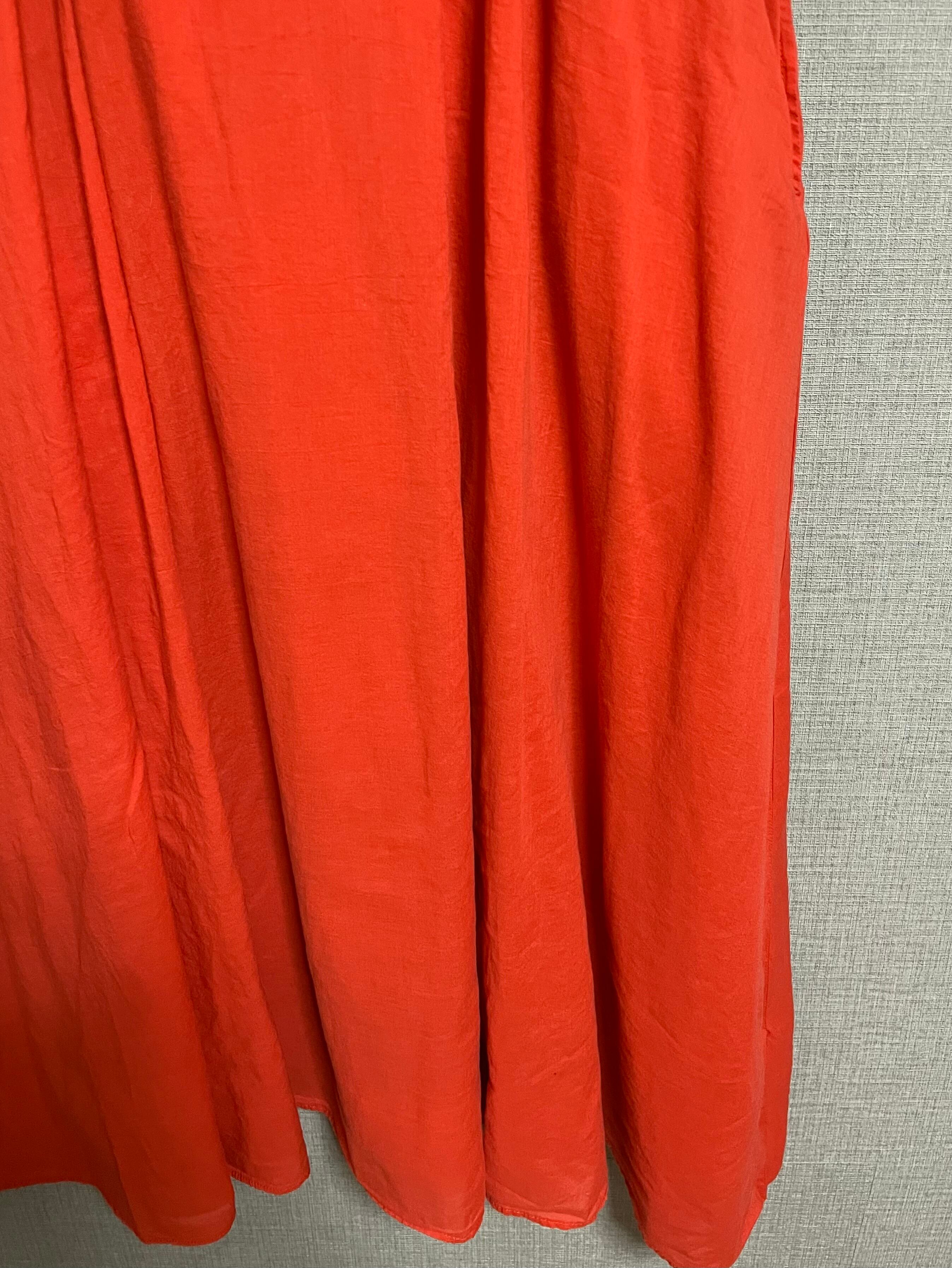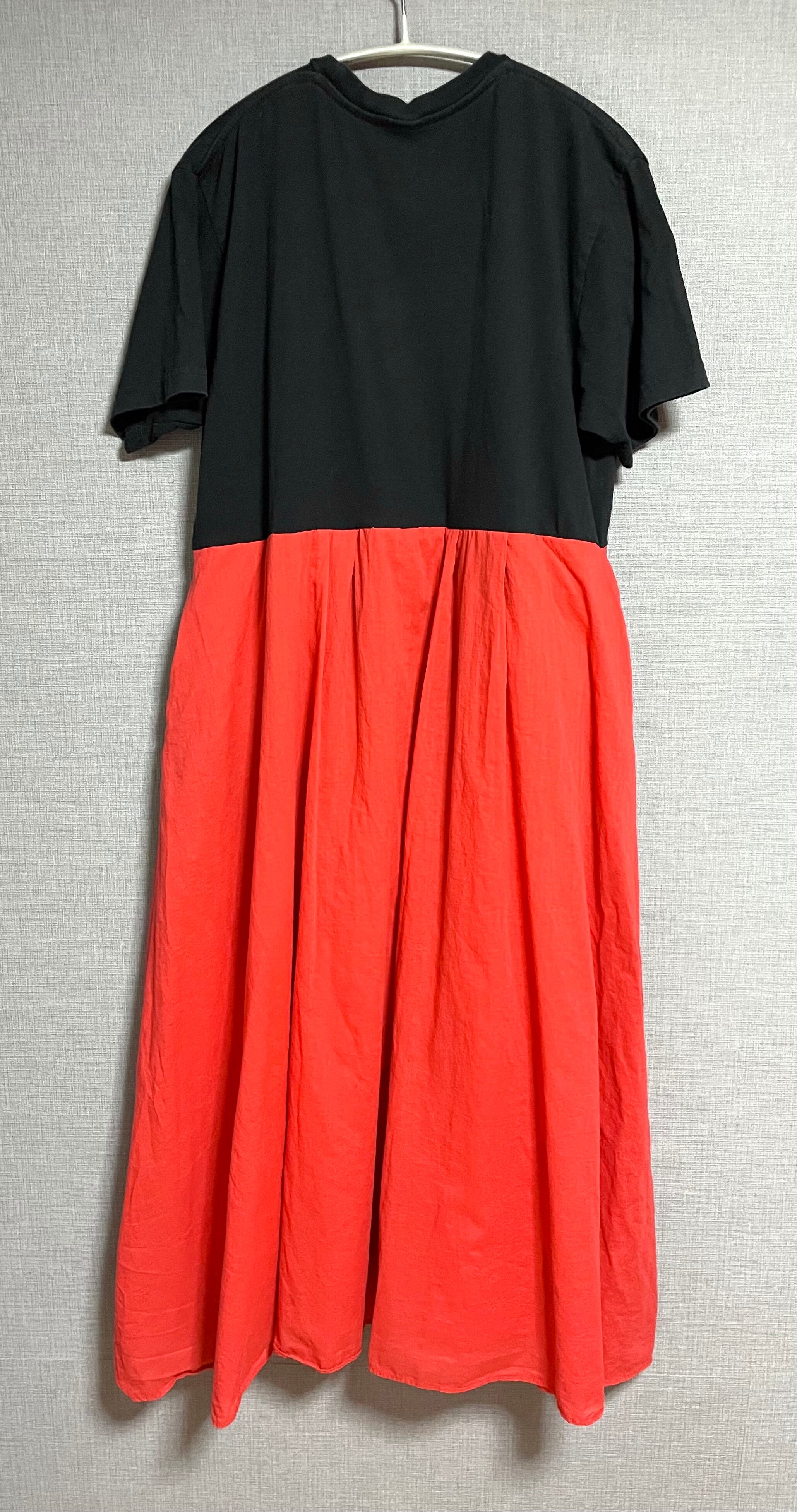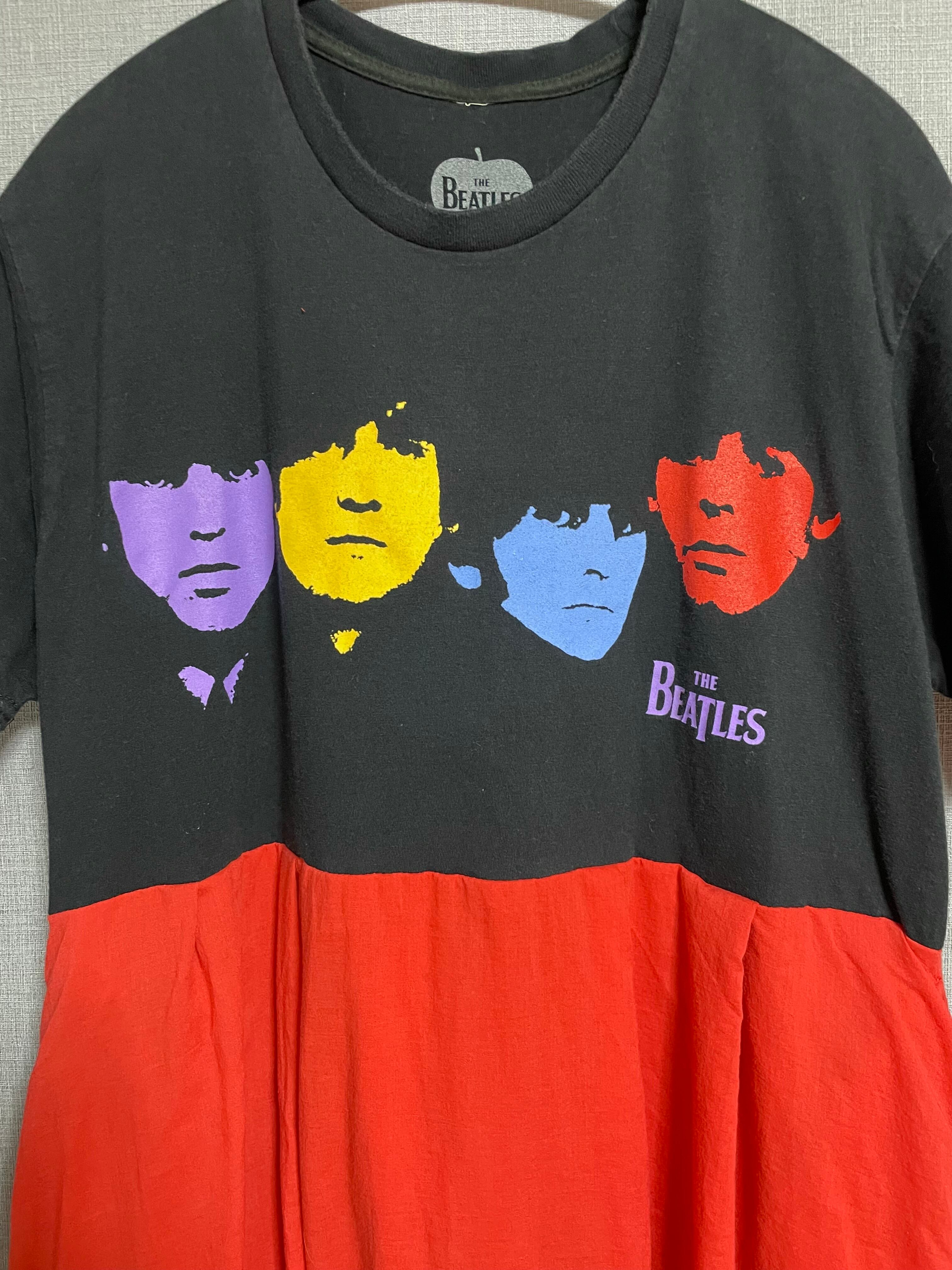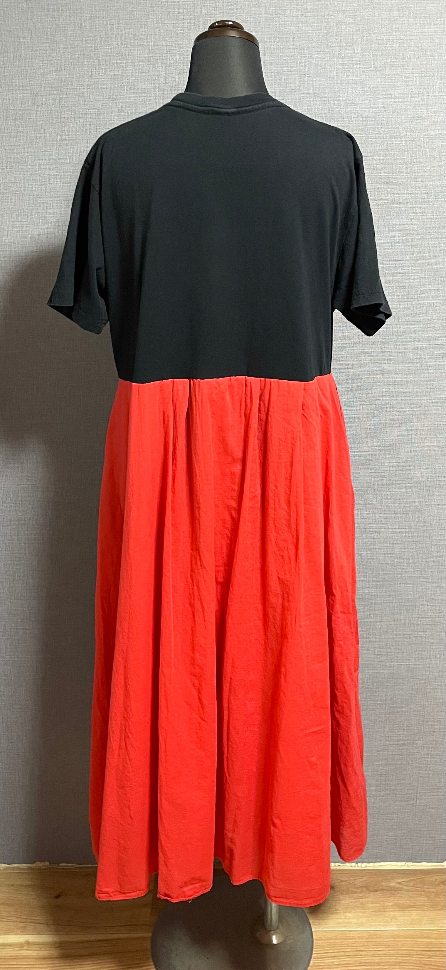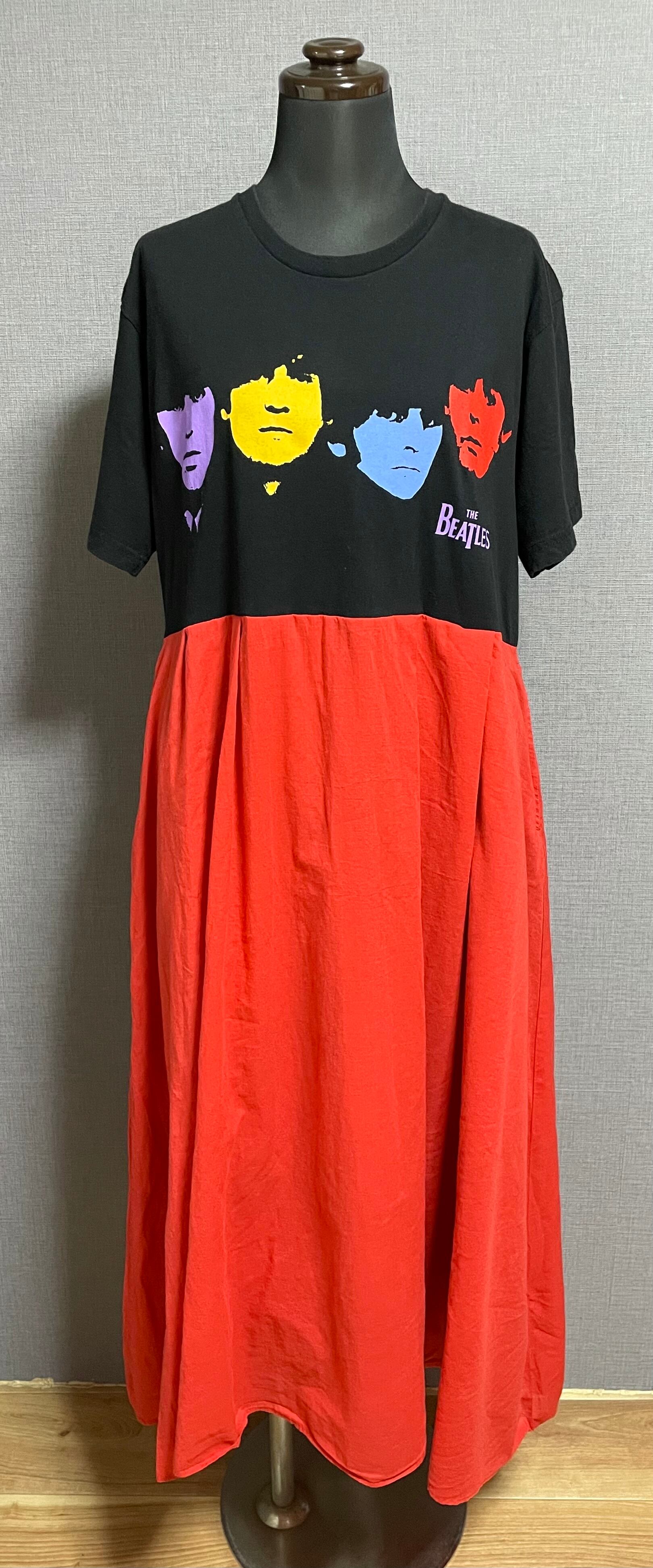 ビートルズ黒Tシャツに、柔らかい生地の赤系スカートを合わせています♬
