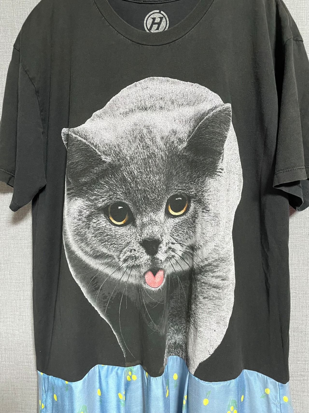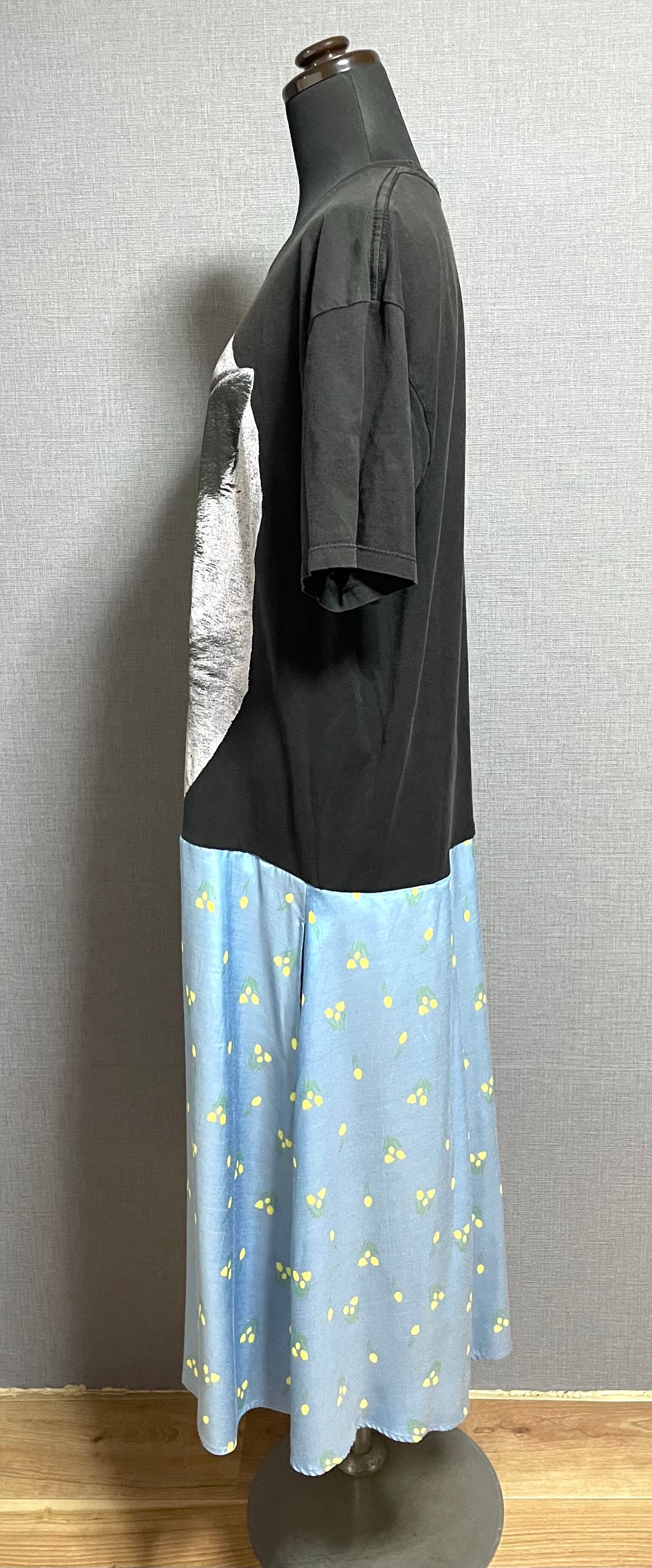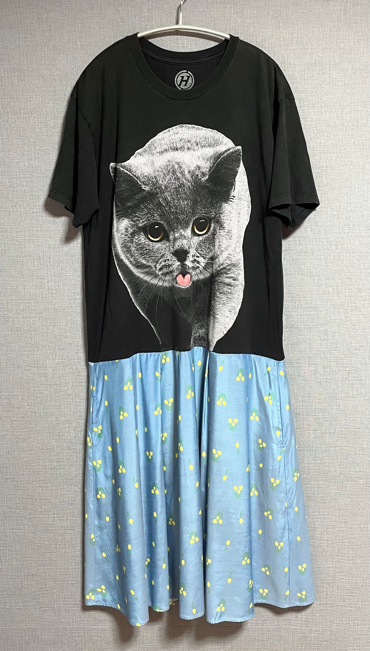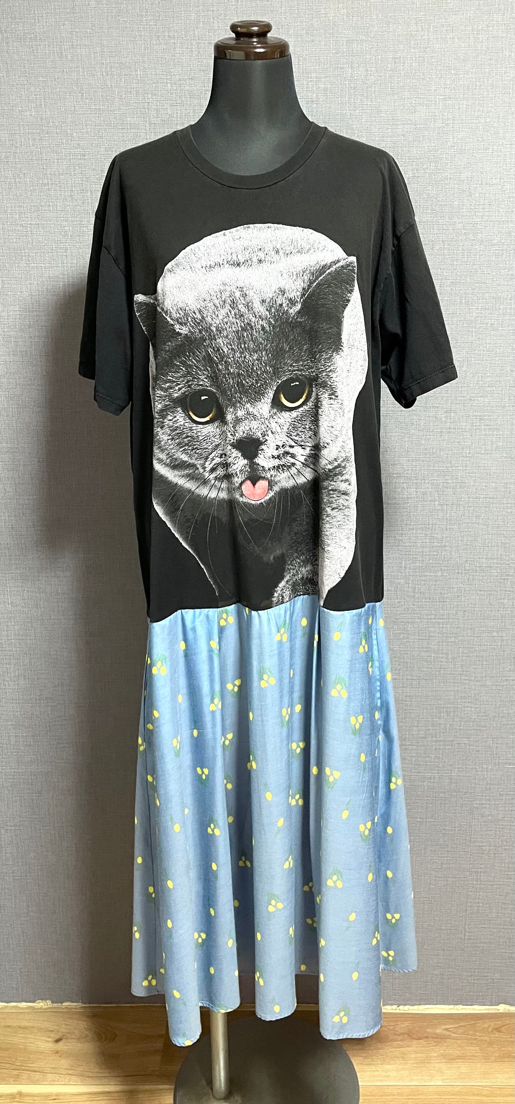 癒し系ネコ黒Tシャツに、光沢のあるブルーにレモンイエローチューリップ柄スカートを合わせています♬