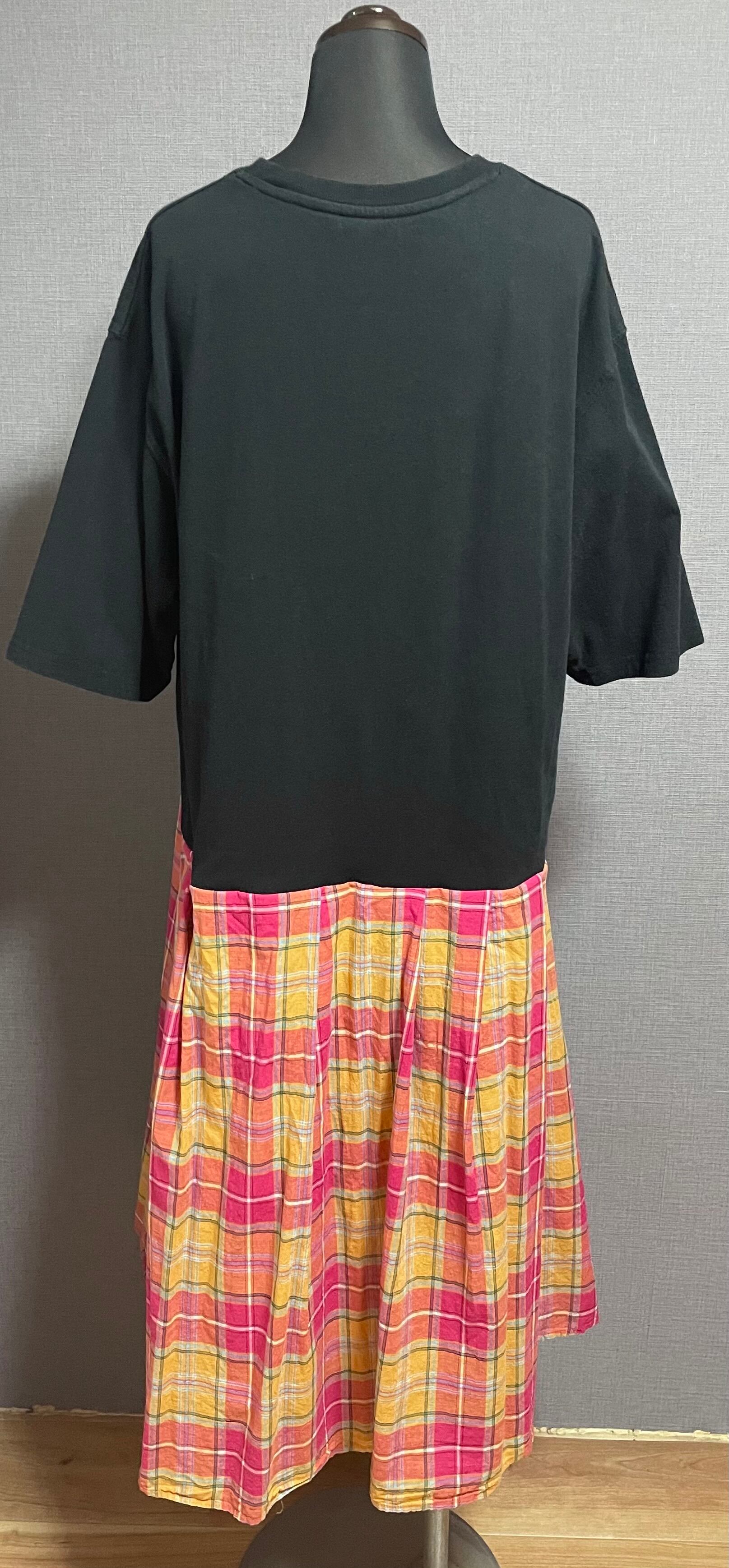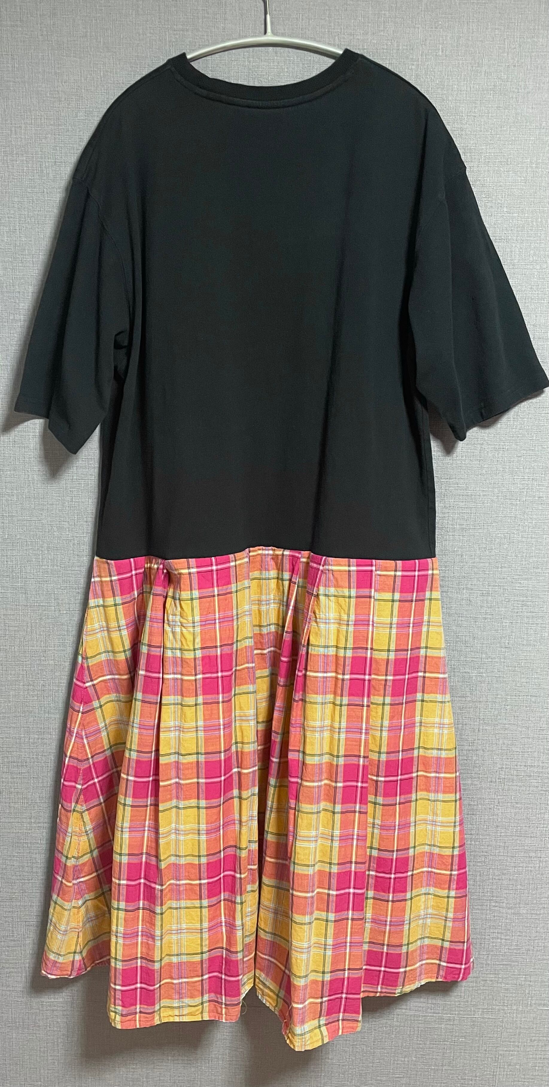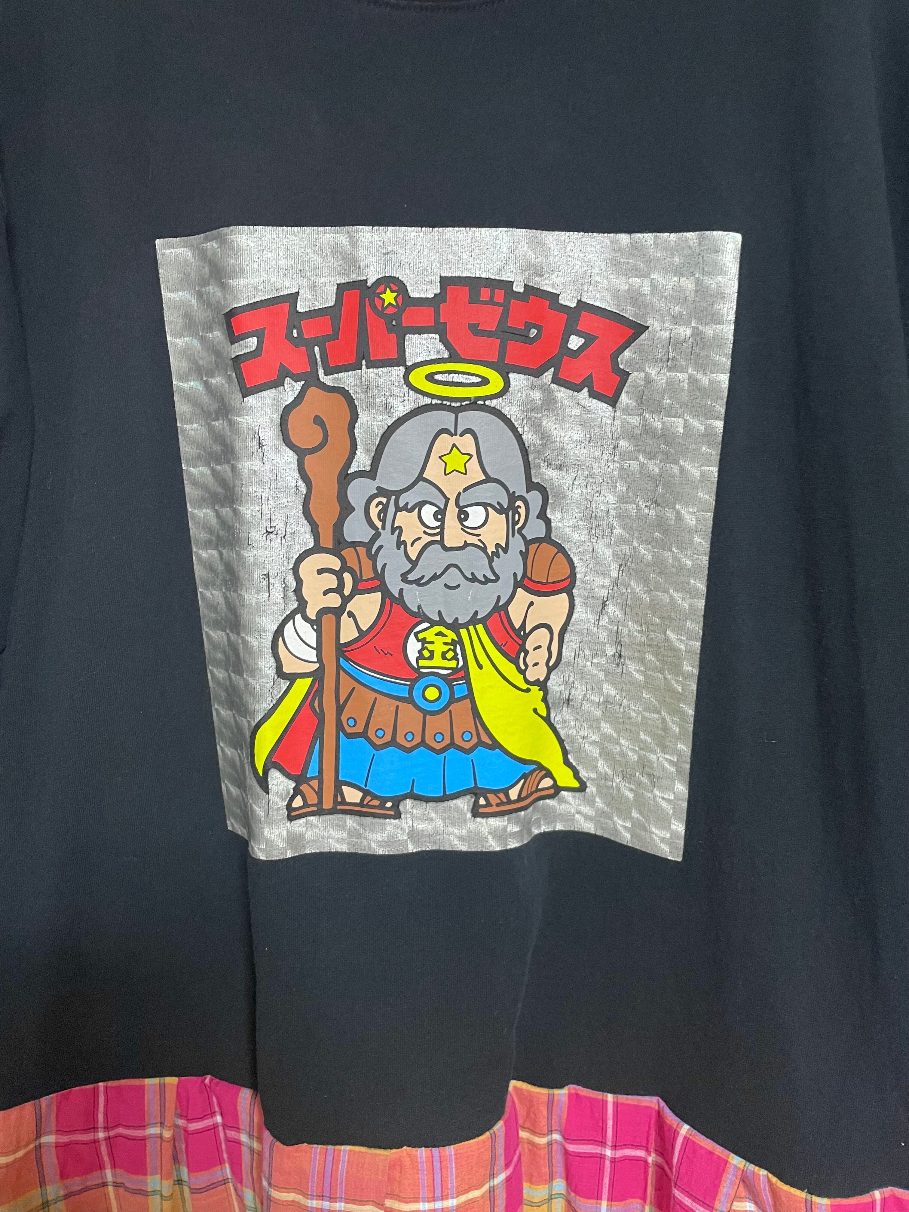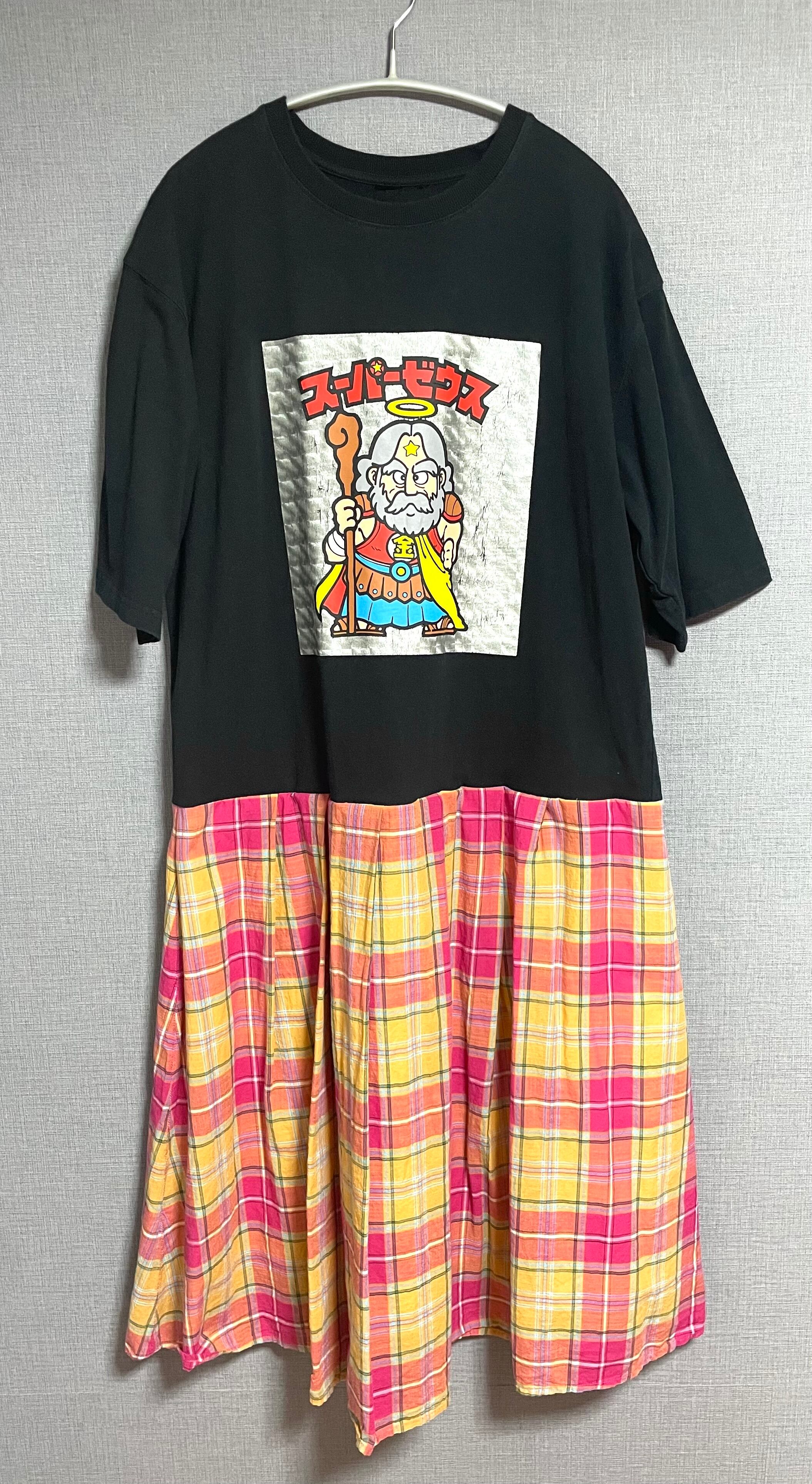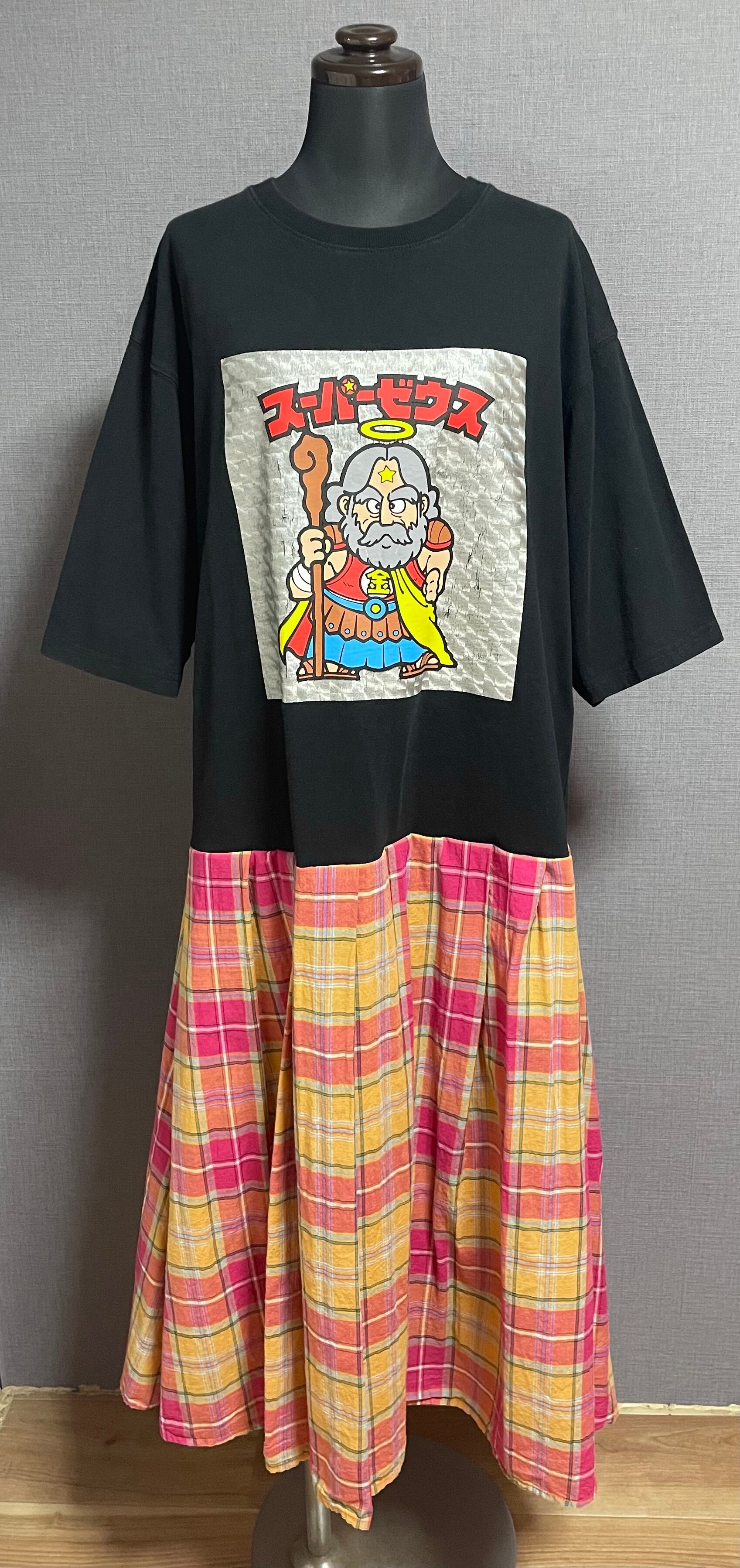 黒Tシャツにスーパーゼウスを縫いつけ、チェック柄スカートを合わせています♬