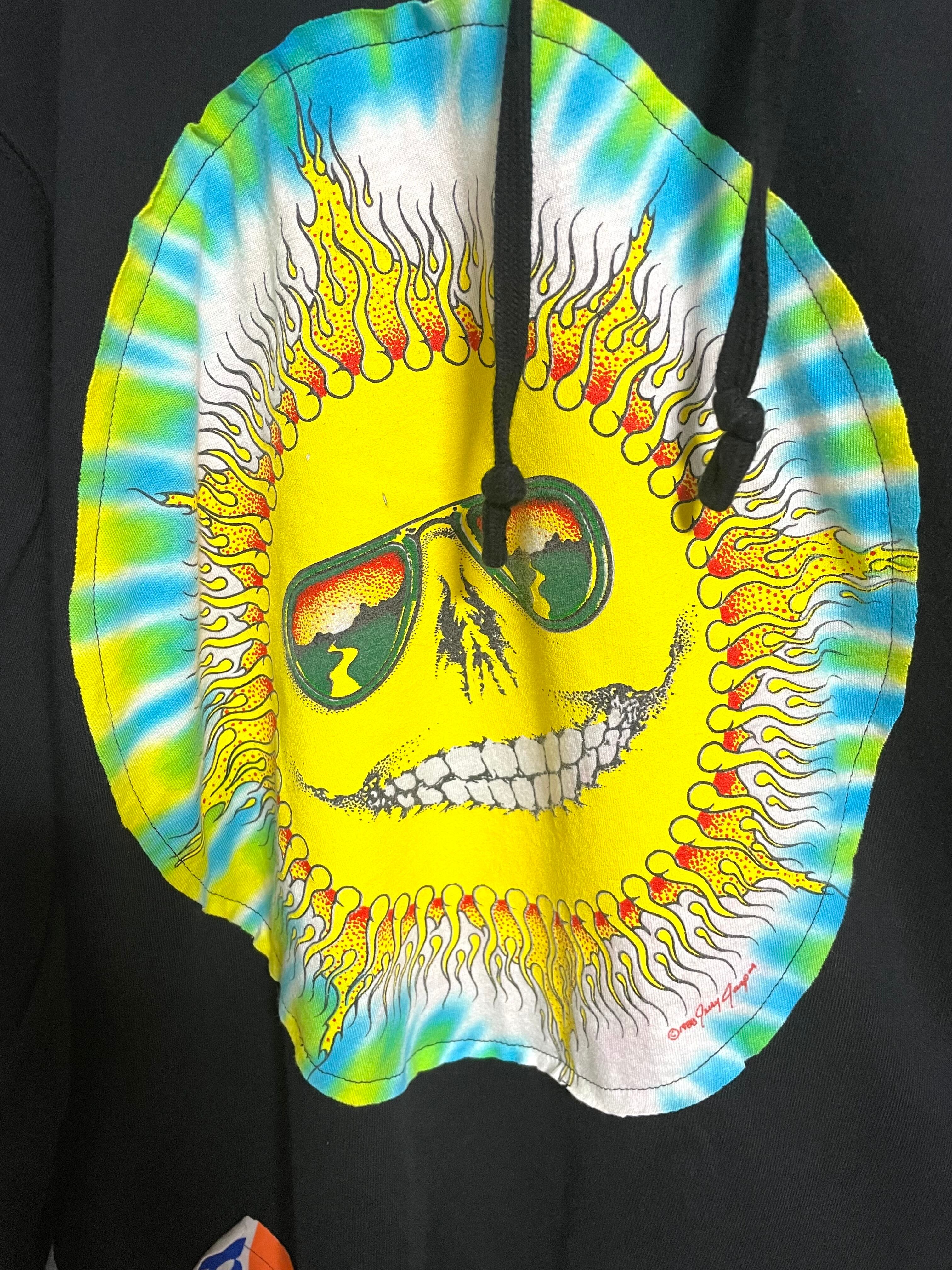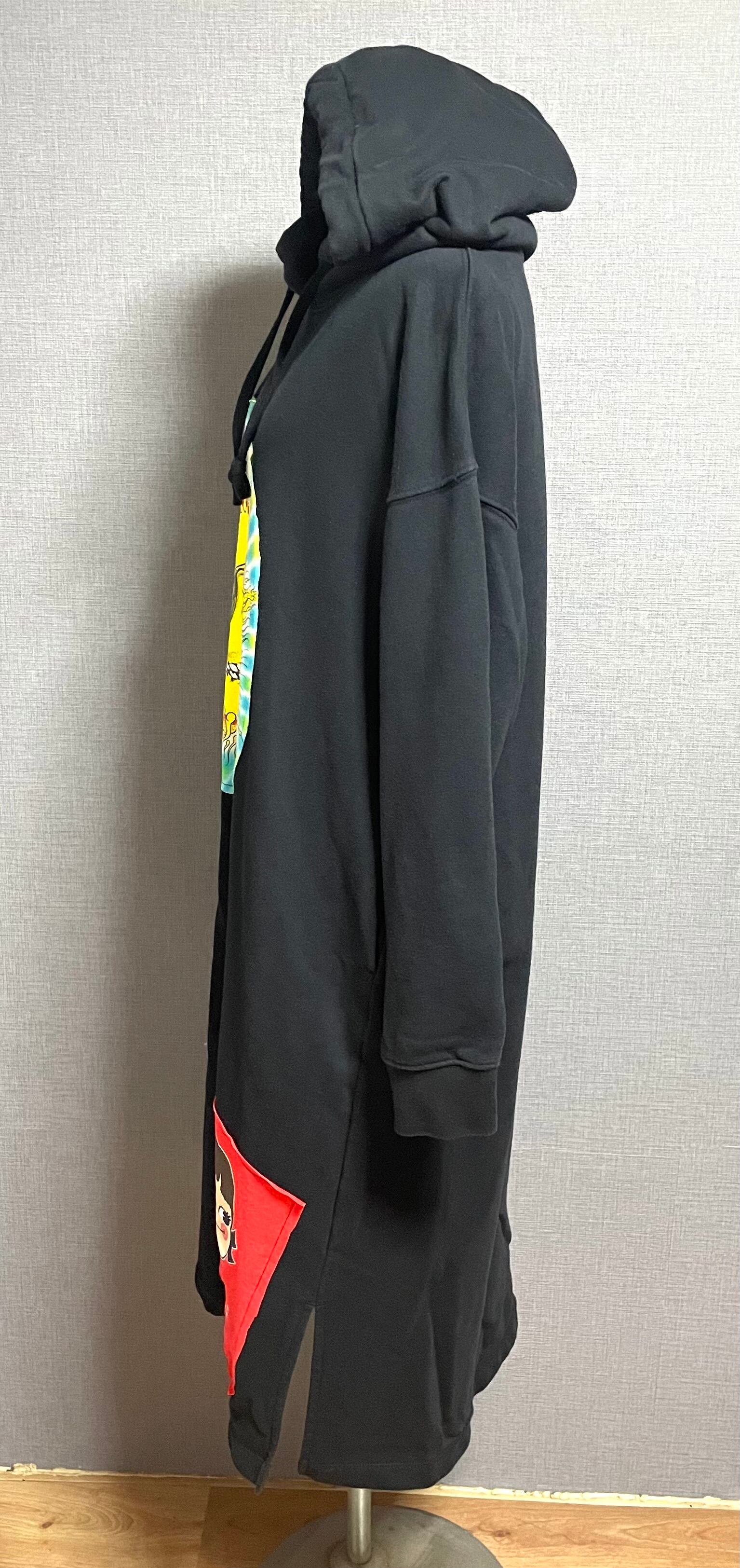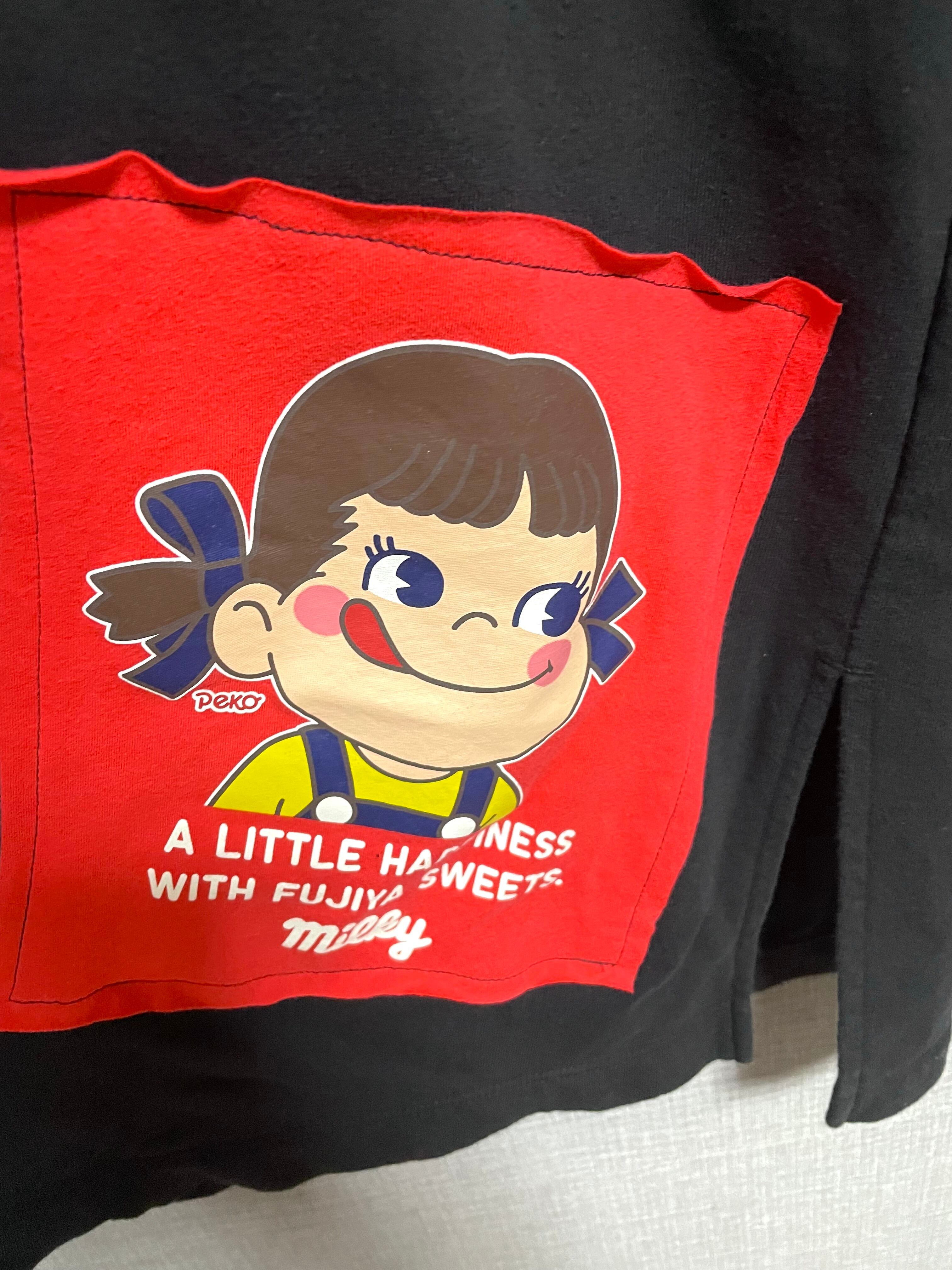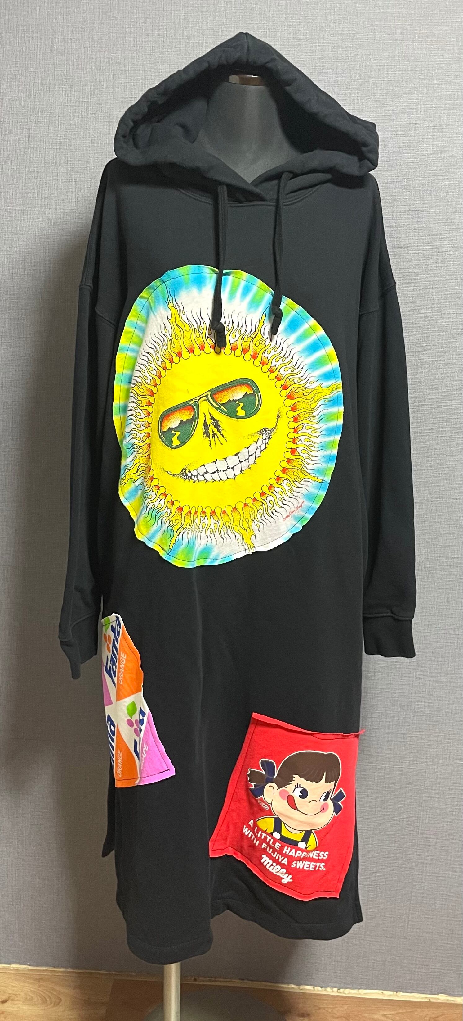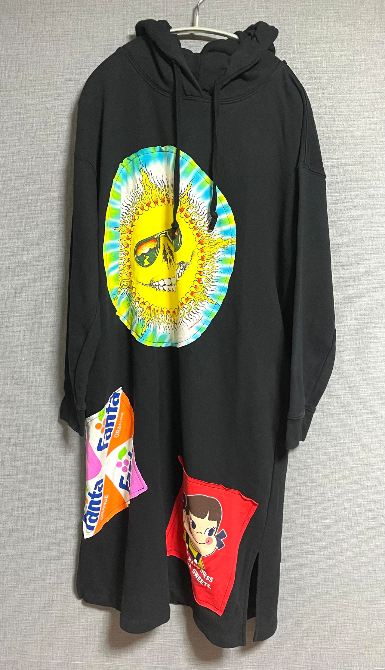黒のパーカーワンピースにロックな太陽とファンタとペコちゃんを縫いつけています♬
