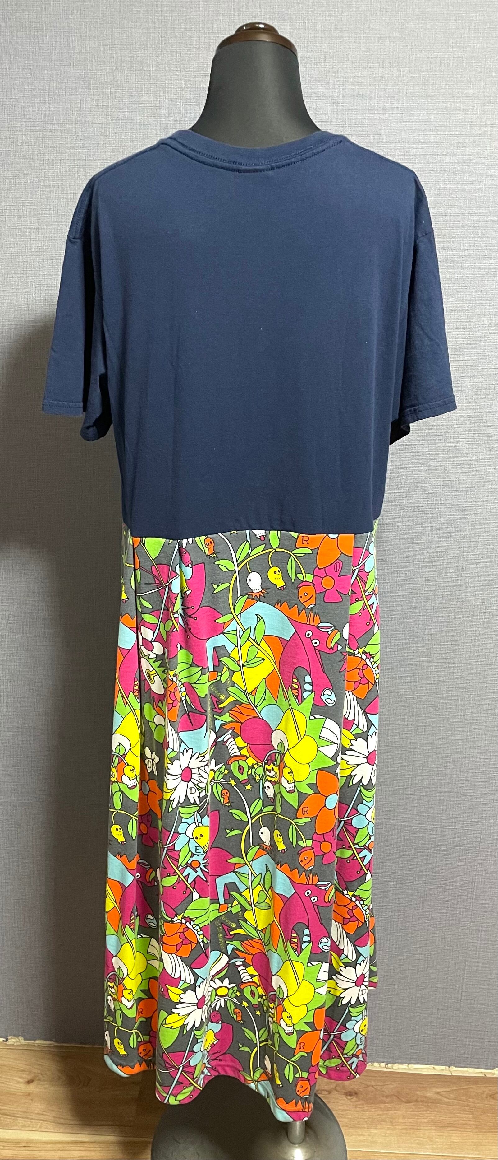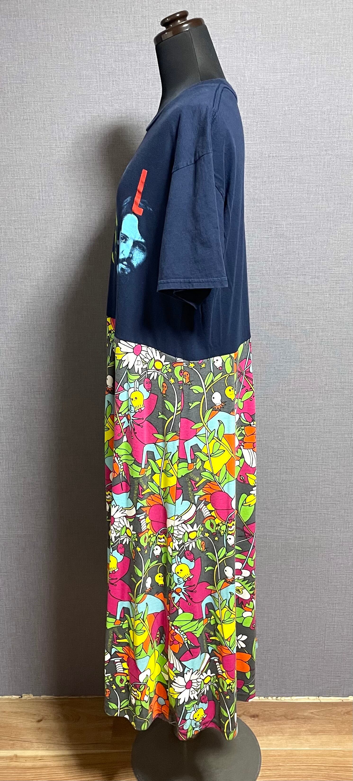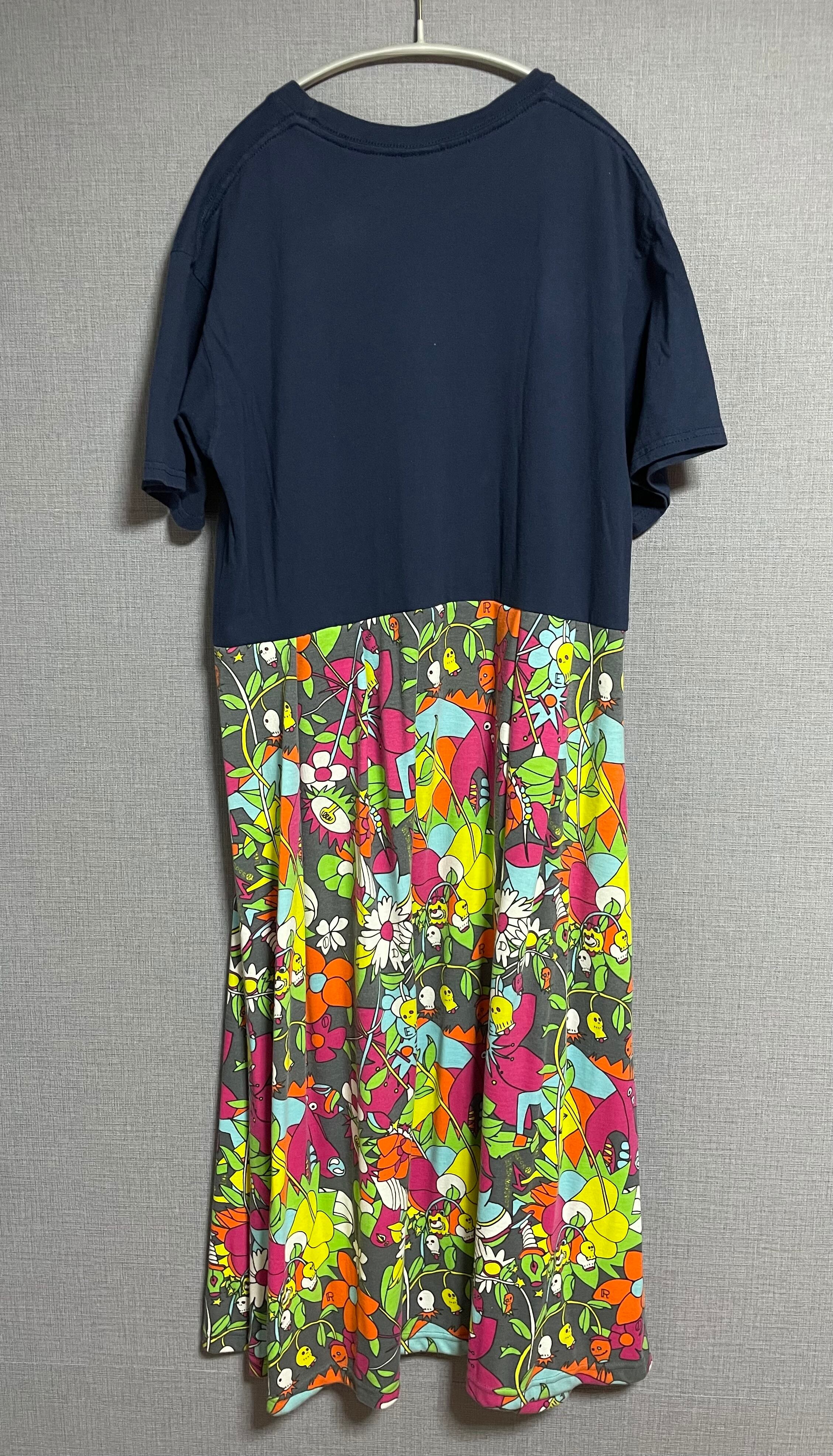 カラフル男性のネイビーTシャツに、かわいい柄スカートを合わせています♬