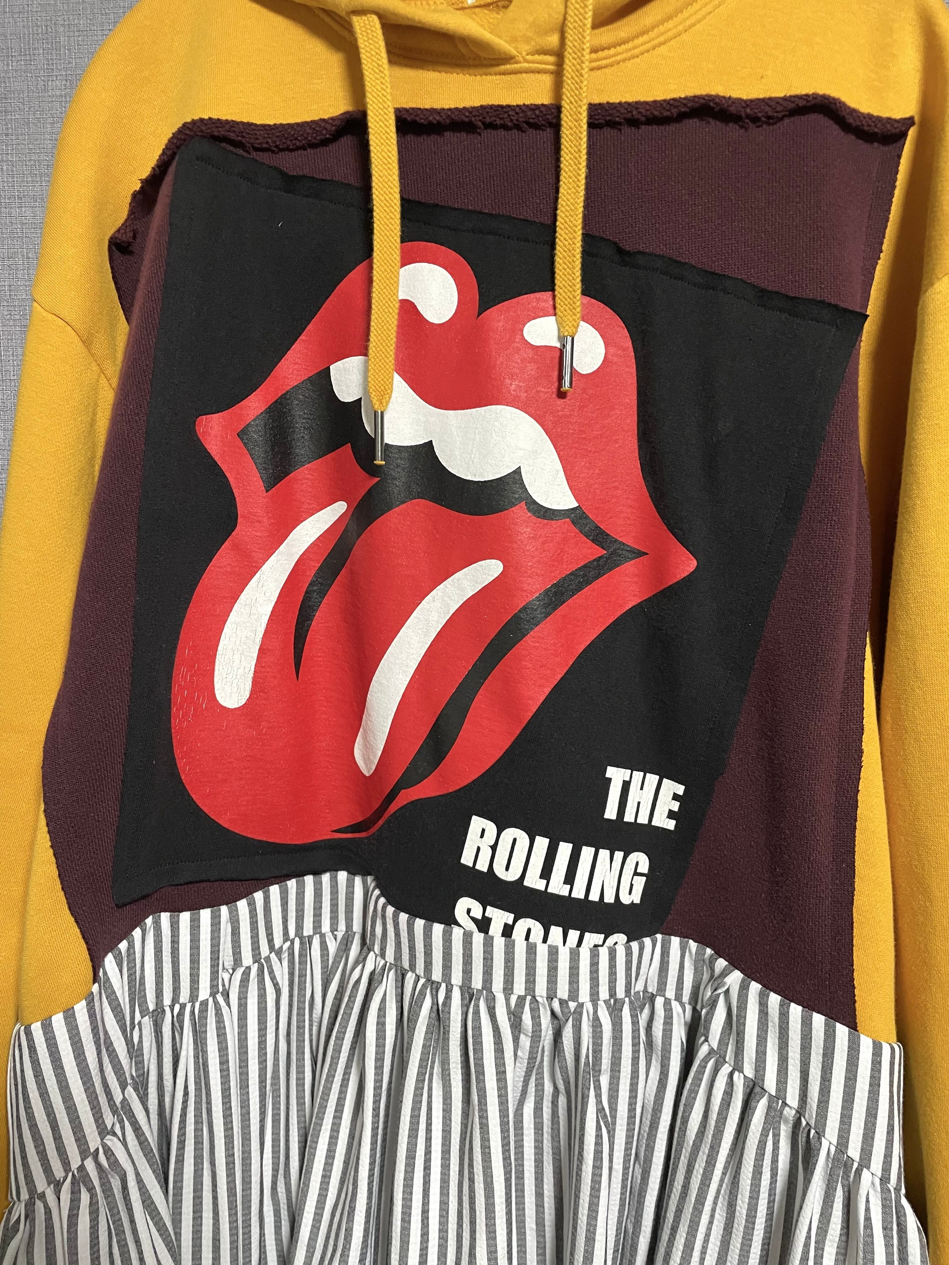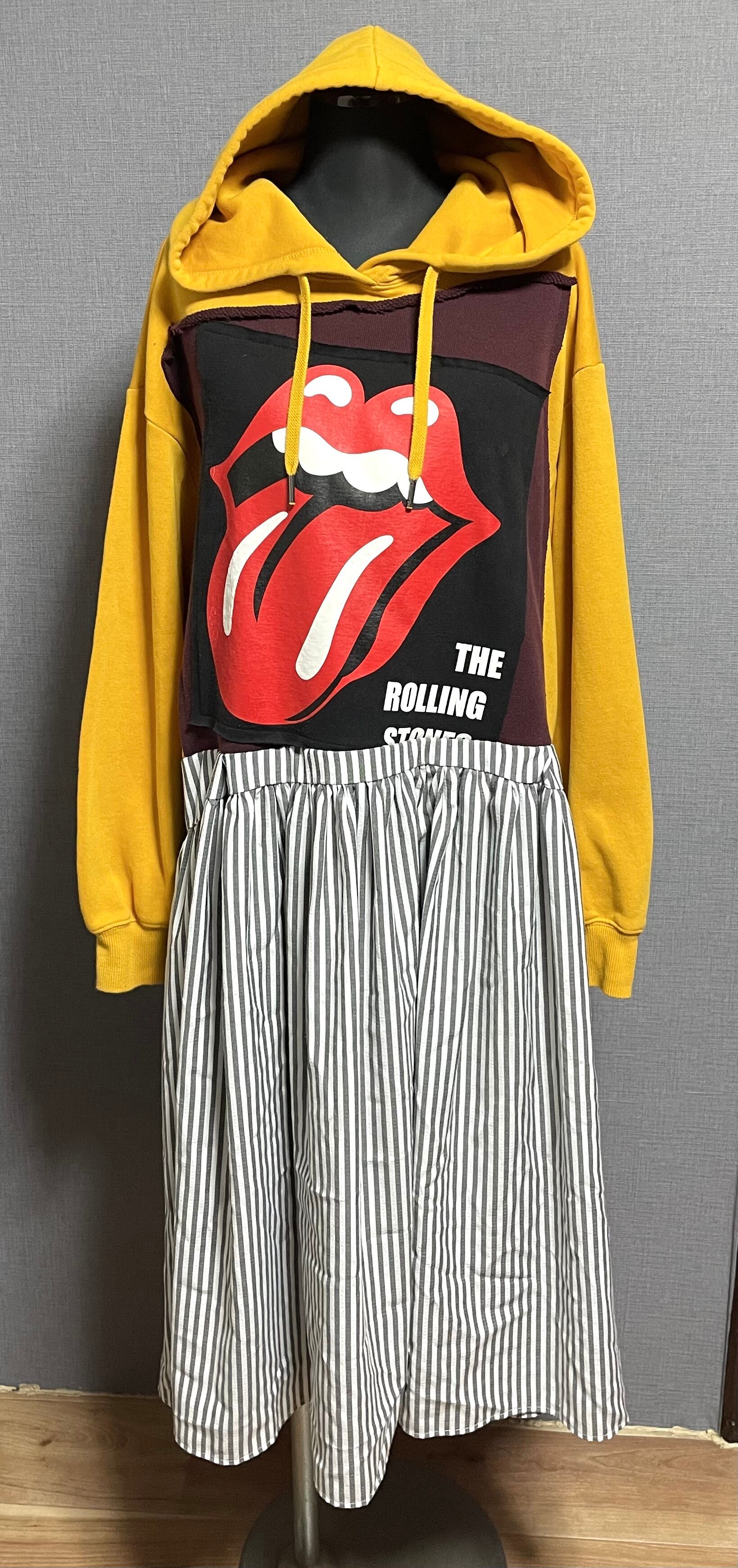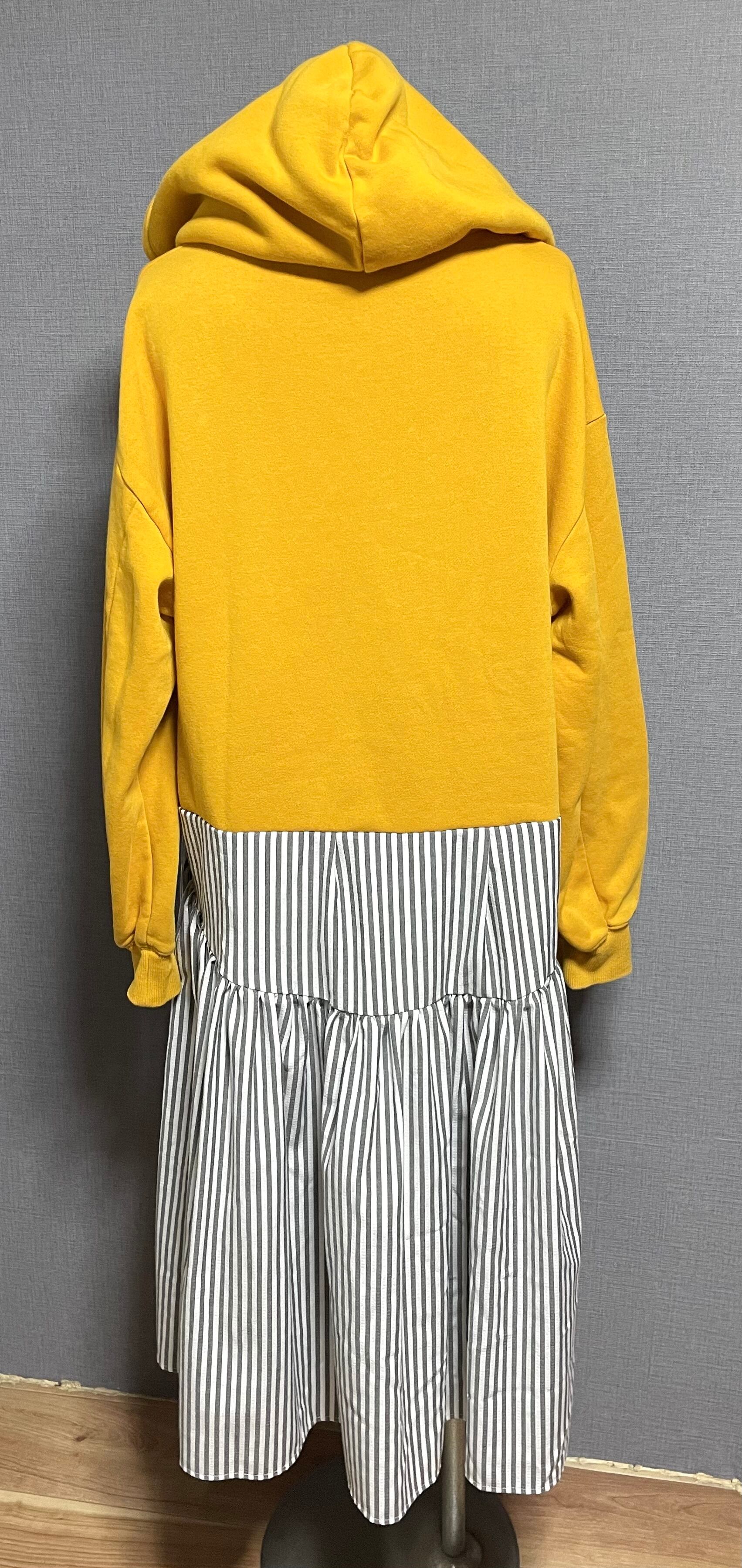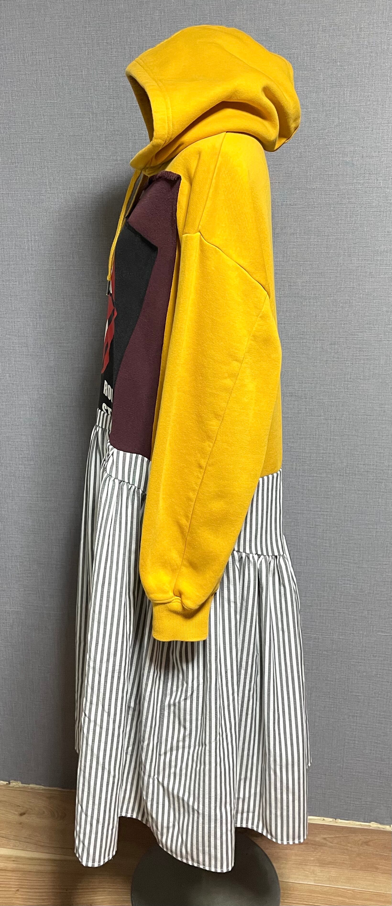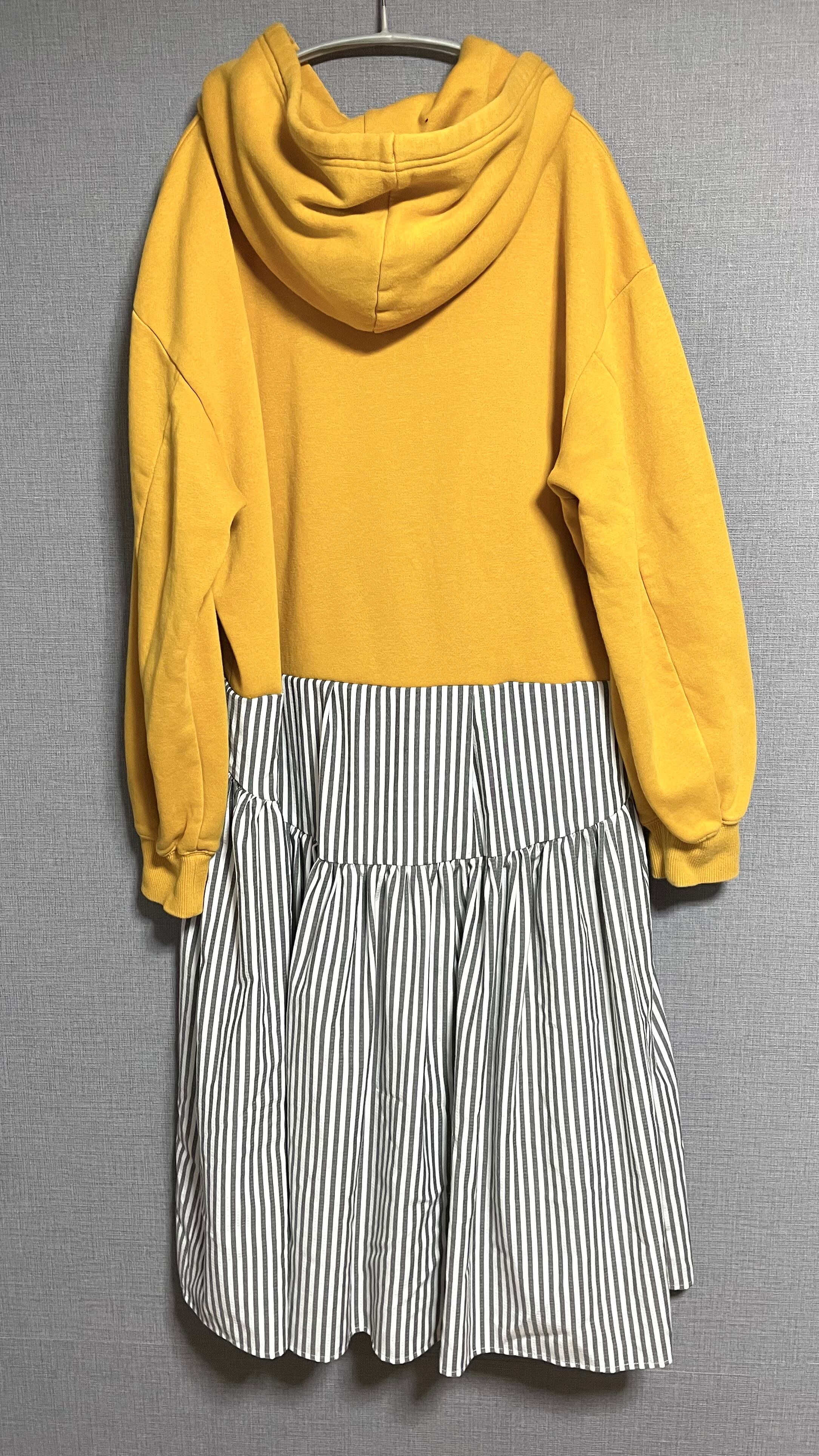 黄色パーカーにべろを縫いつけ、ストライプスカートを合わせています♬