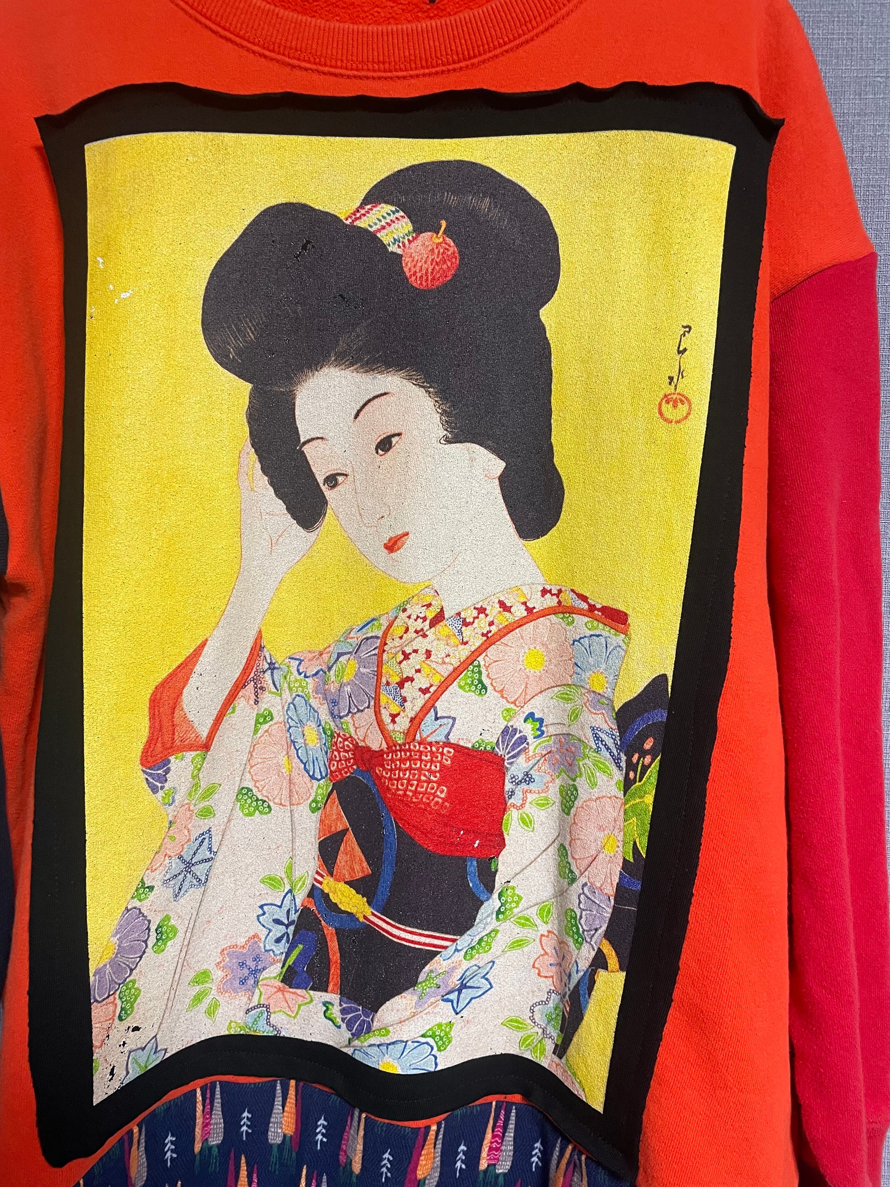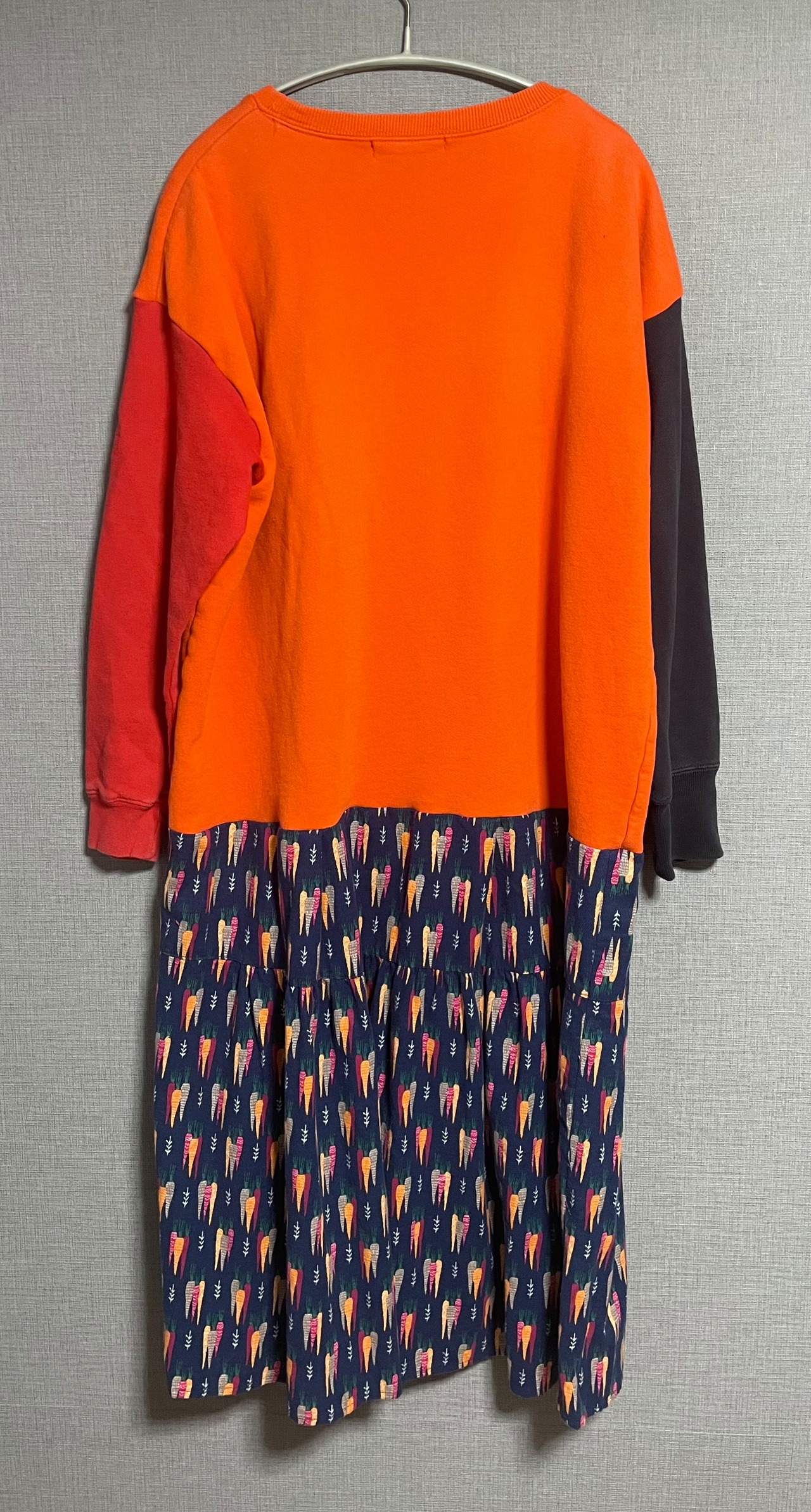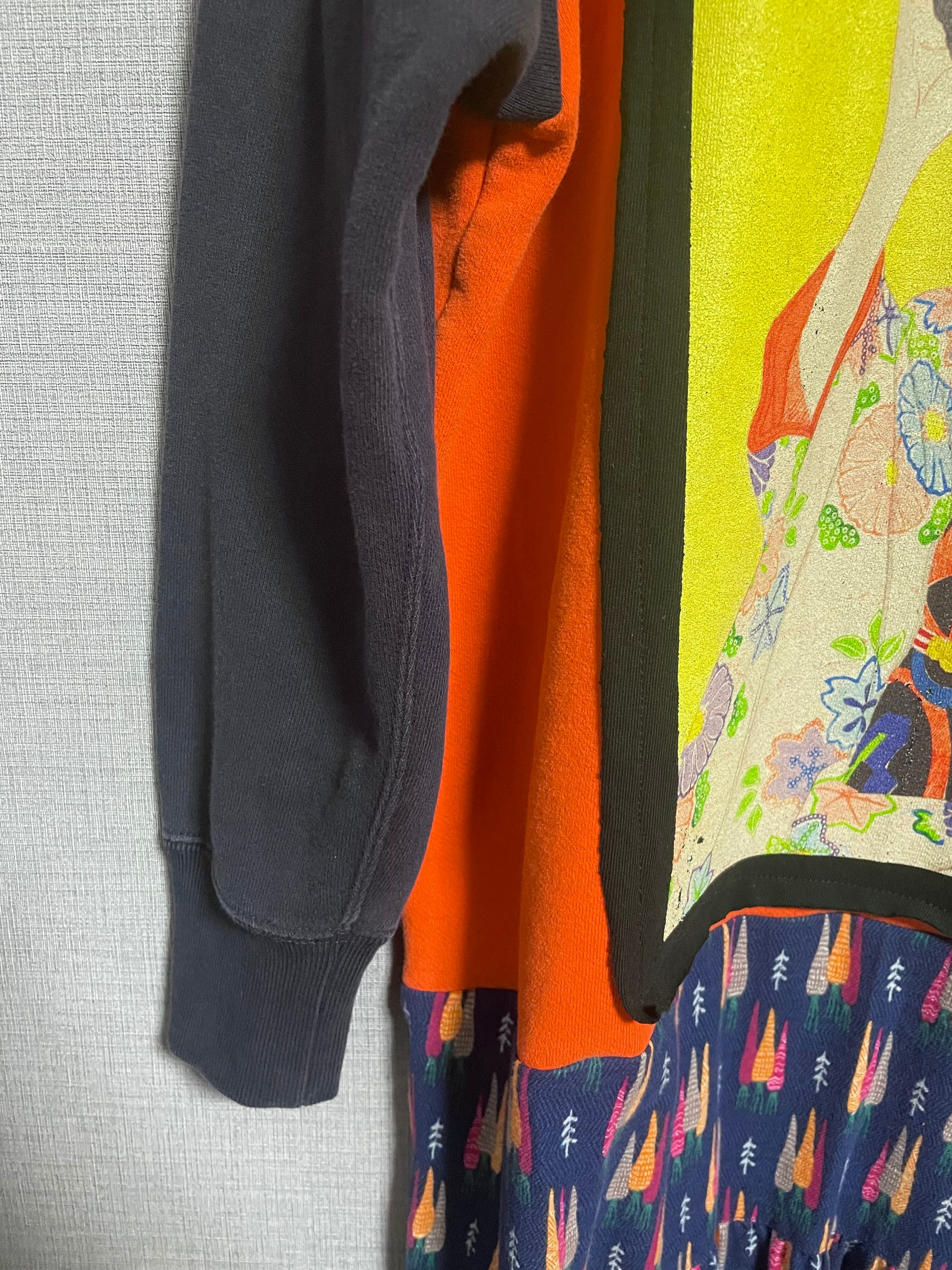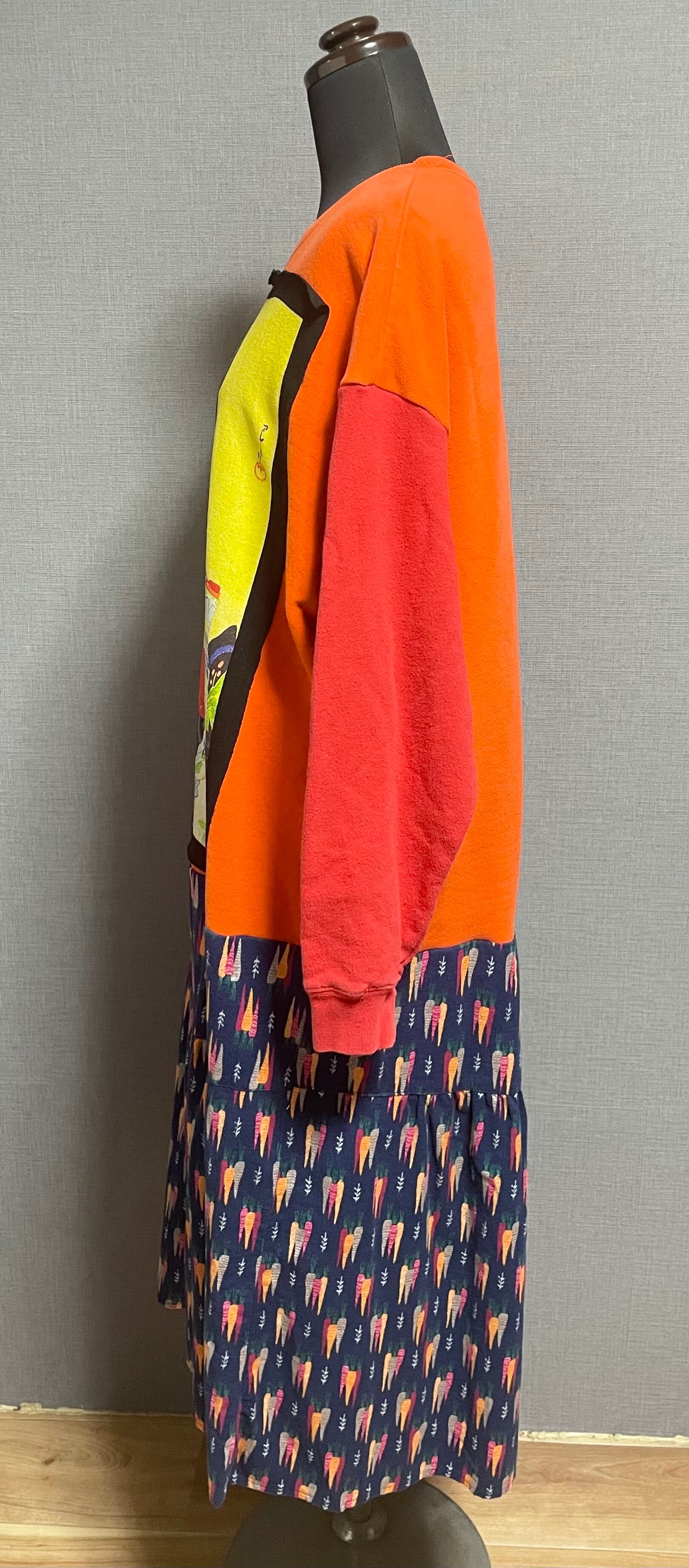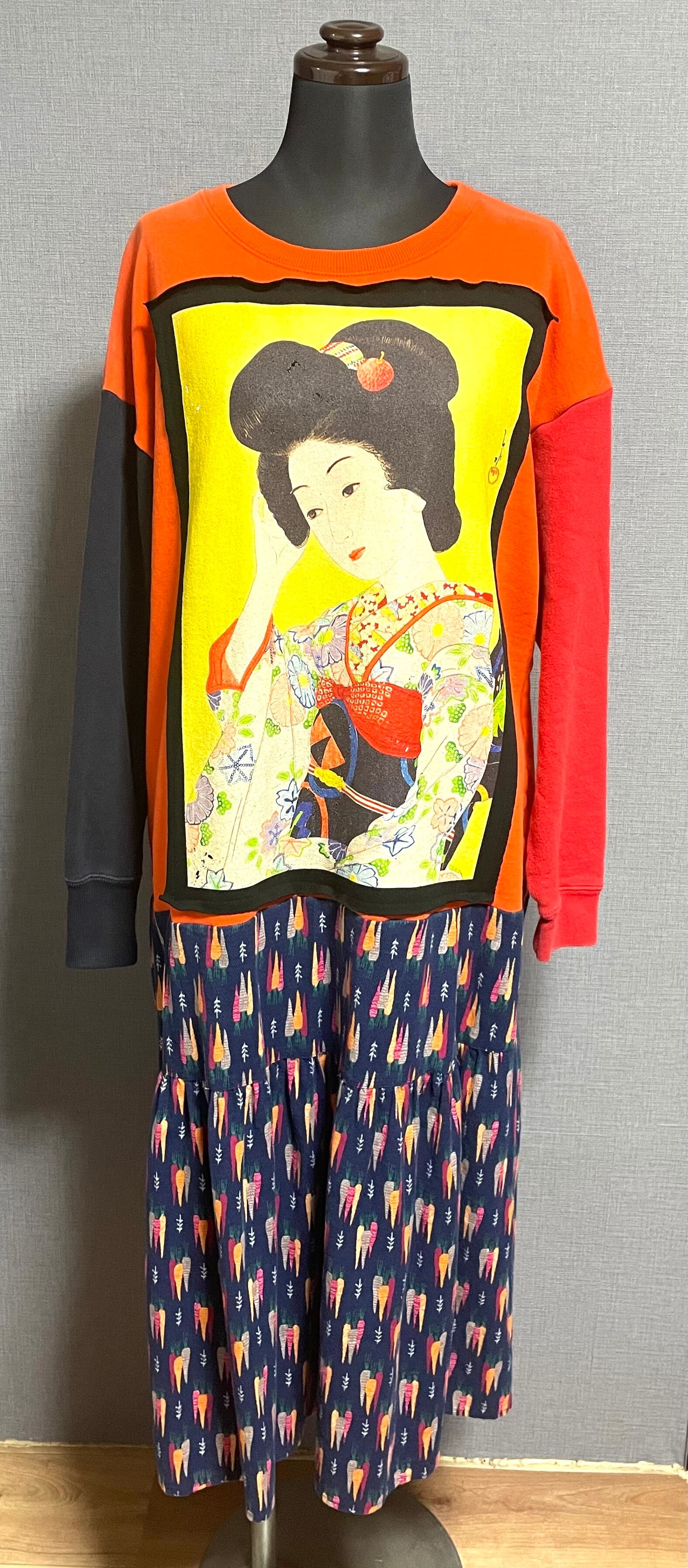 オレンジスウェットに美人画を縫いつけ、袖は赤とネイビーのスウェット袖を合わせ、にんじん柄スカートを合わせています♬