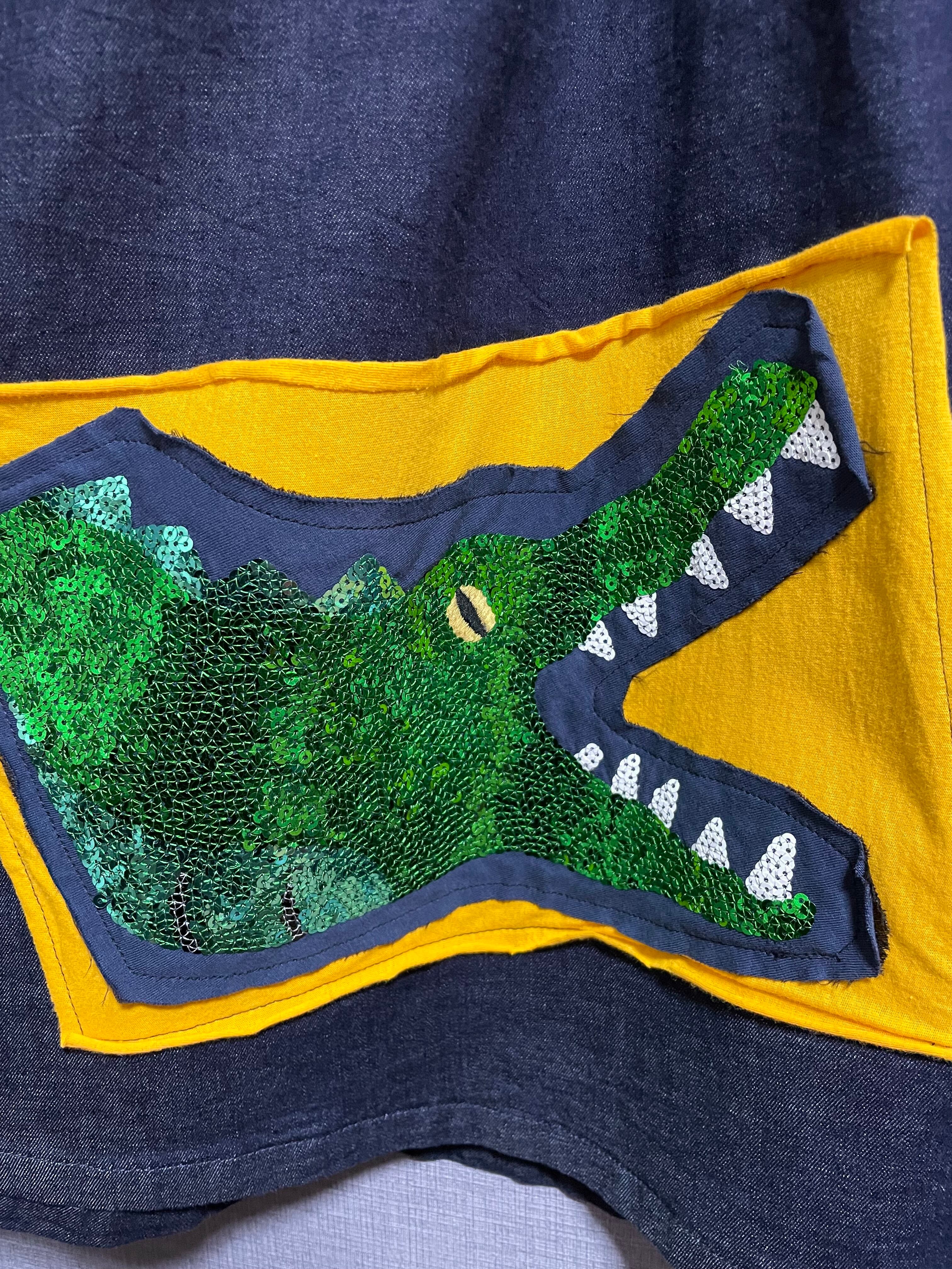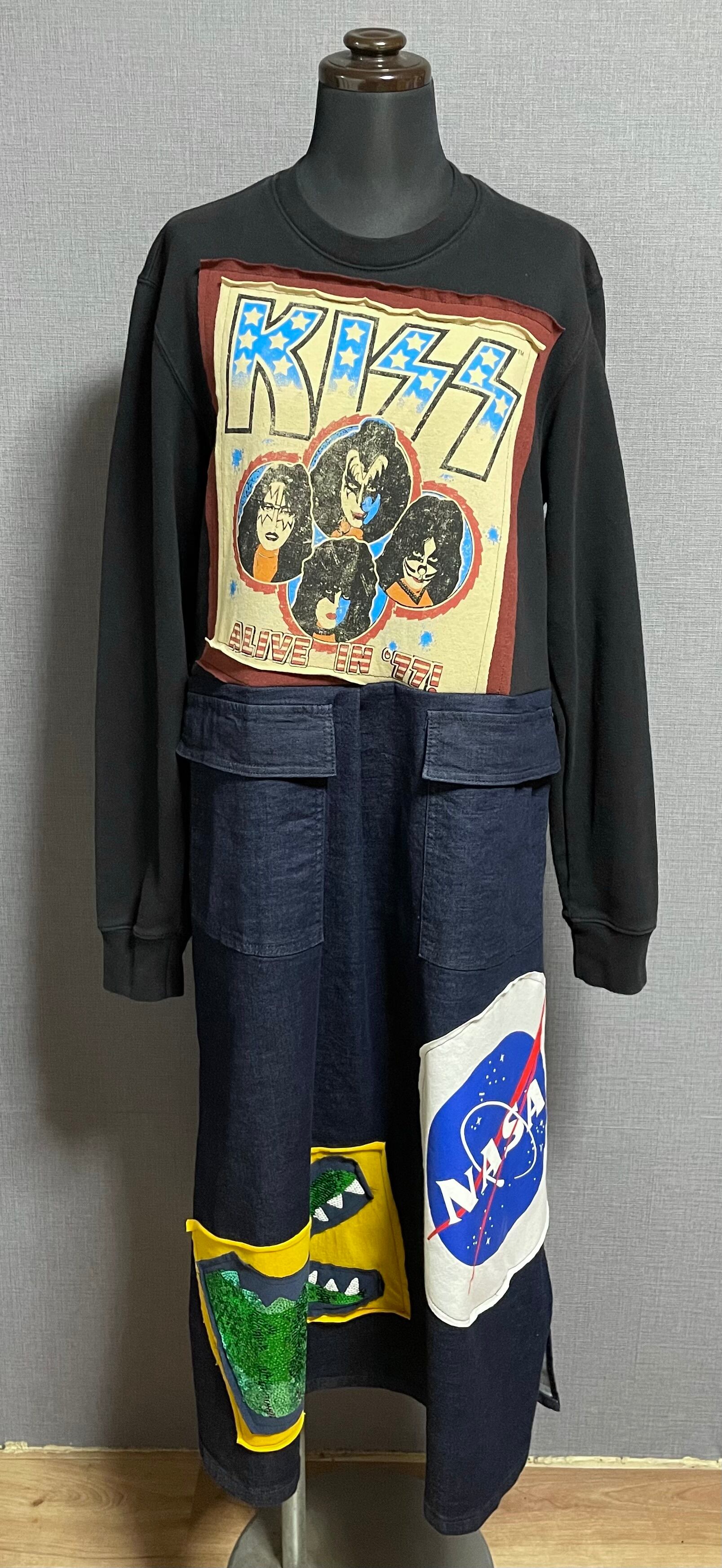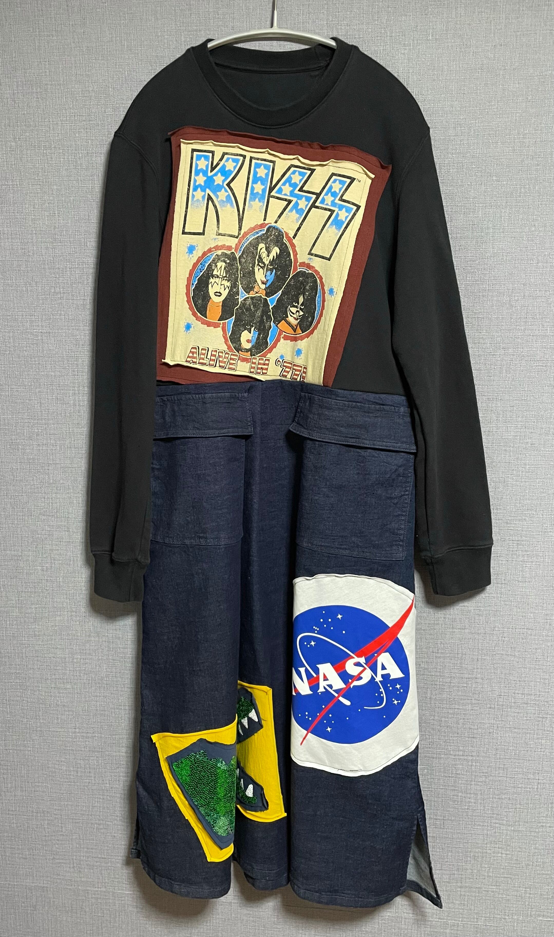 黒スウェットに4人組を縫いつけ、鰐と宇宙を縫い付けた薄めのデニムスカートを合わせています♬