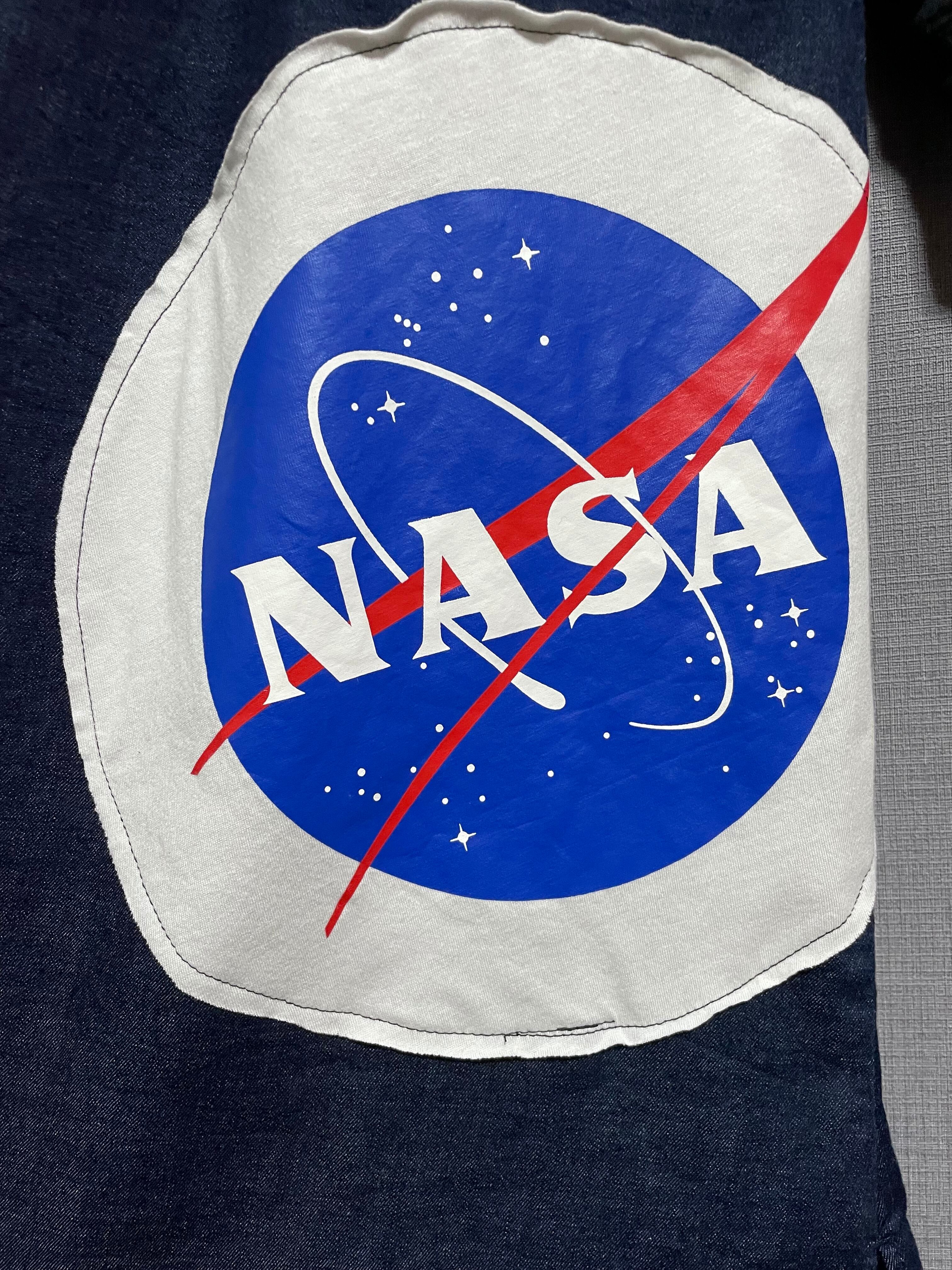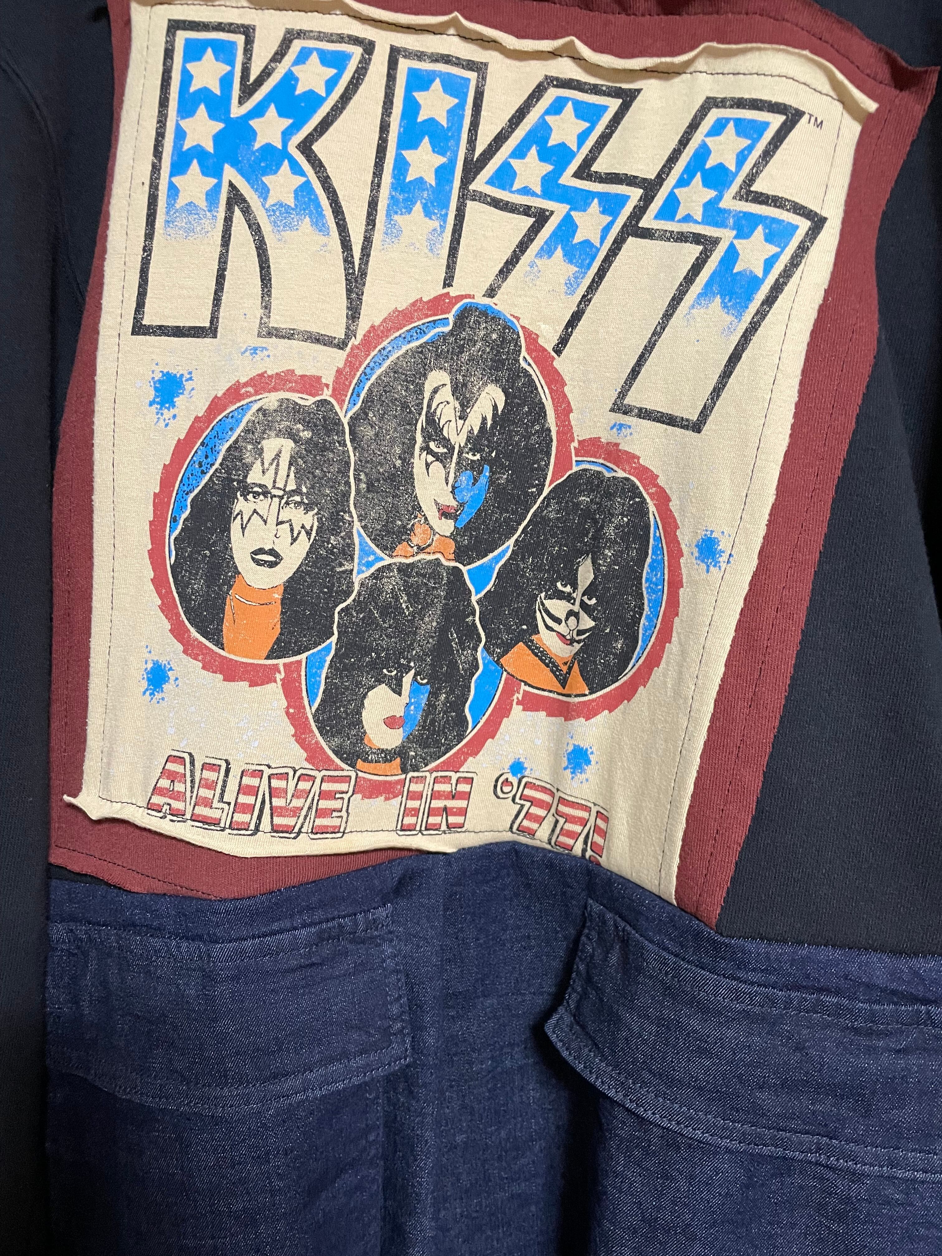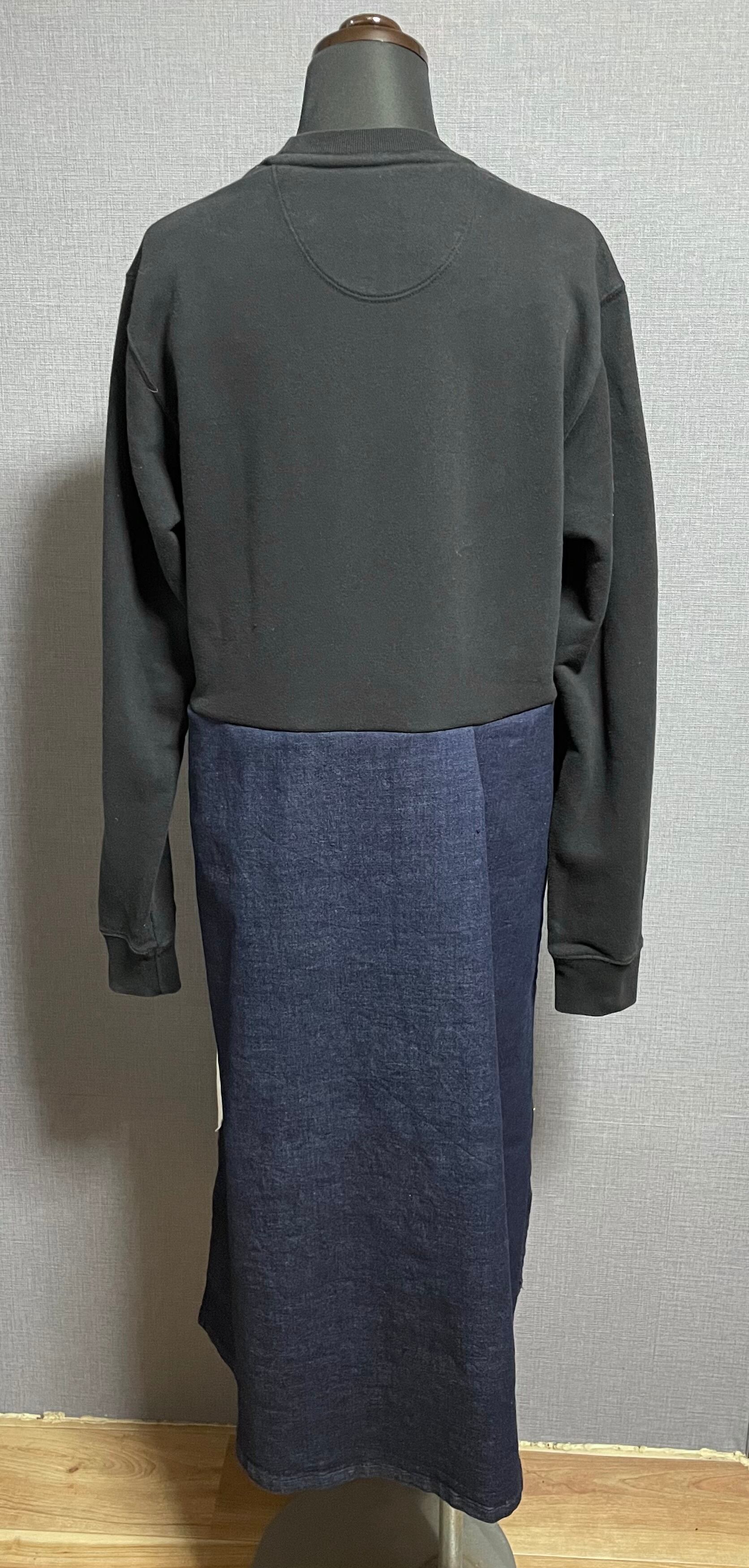 黒スウェットに4人組を縫いつけ、鰐と宇宙を縫い付けた薄めのデニムスカートを合わせています♬