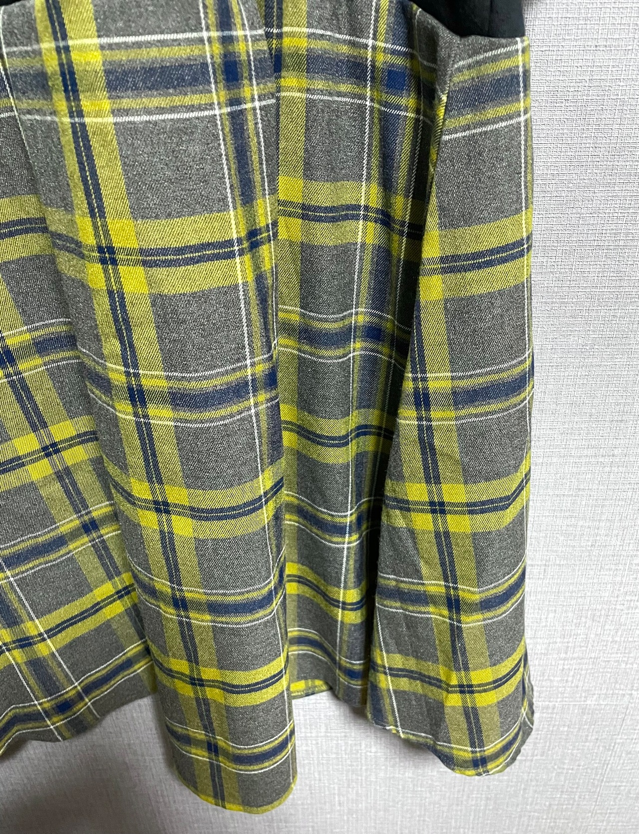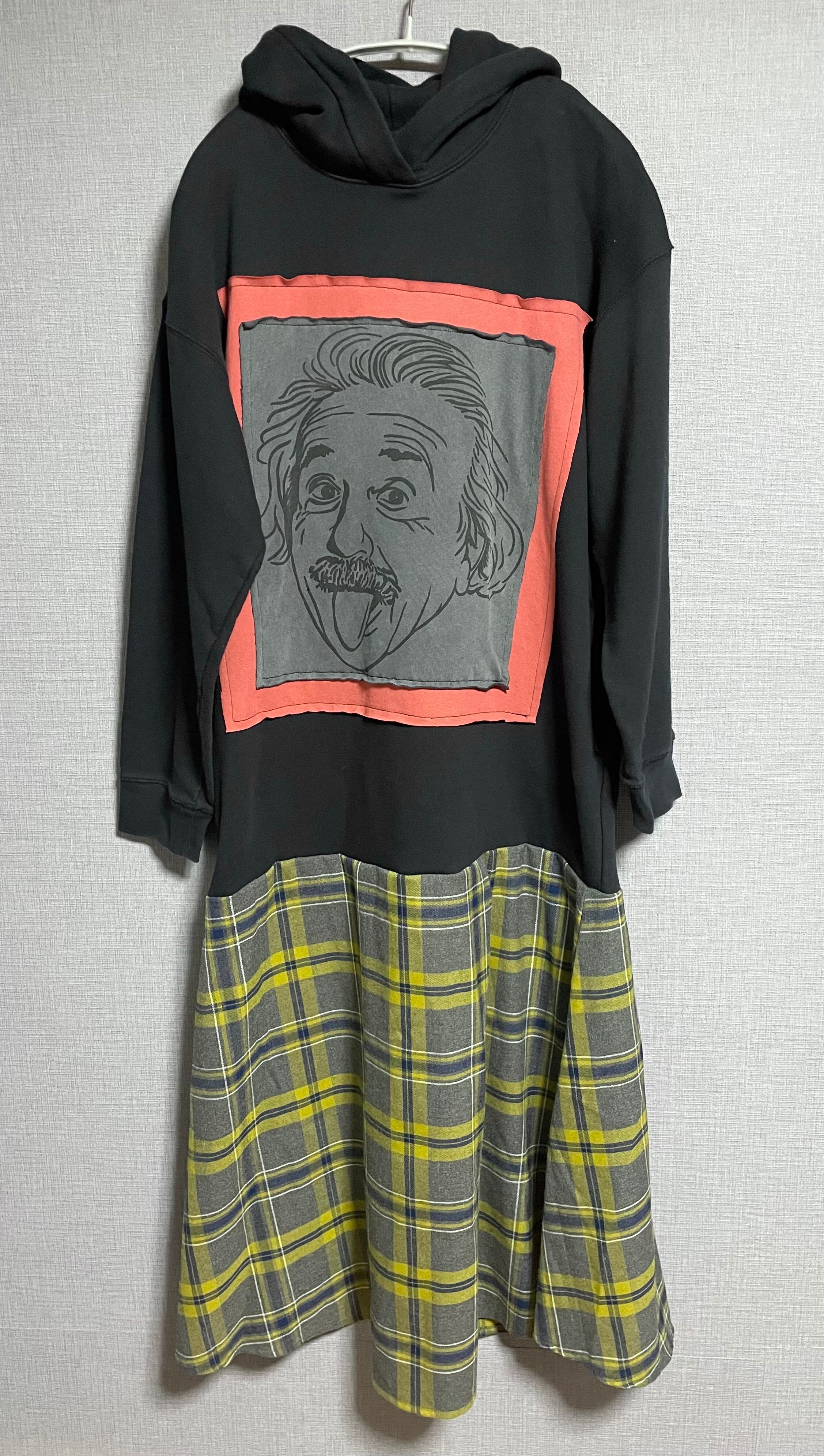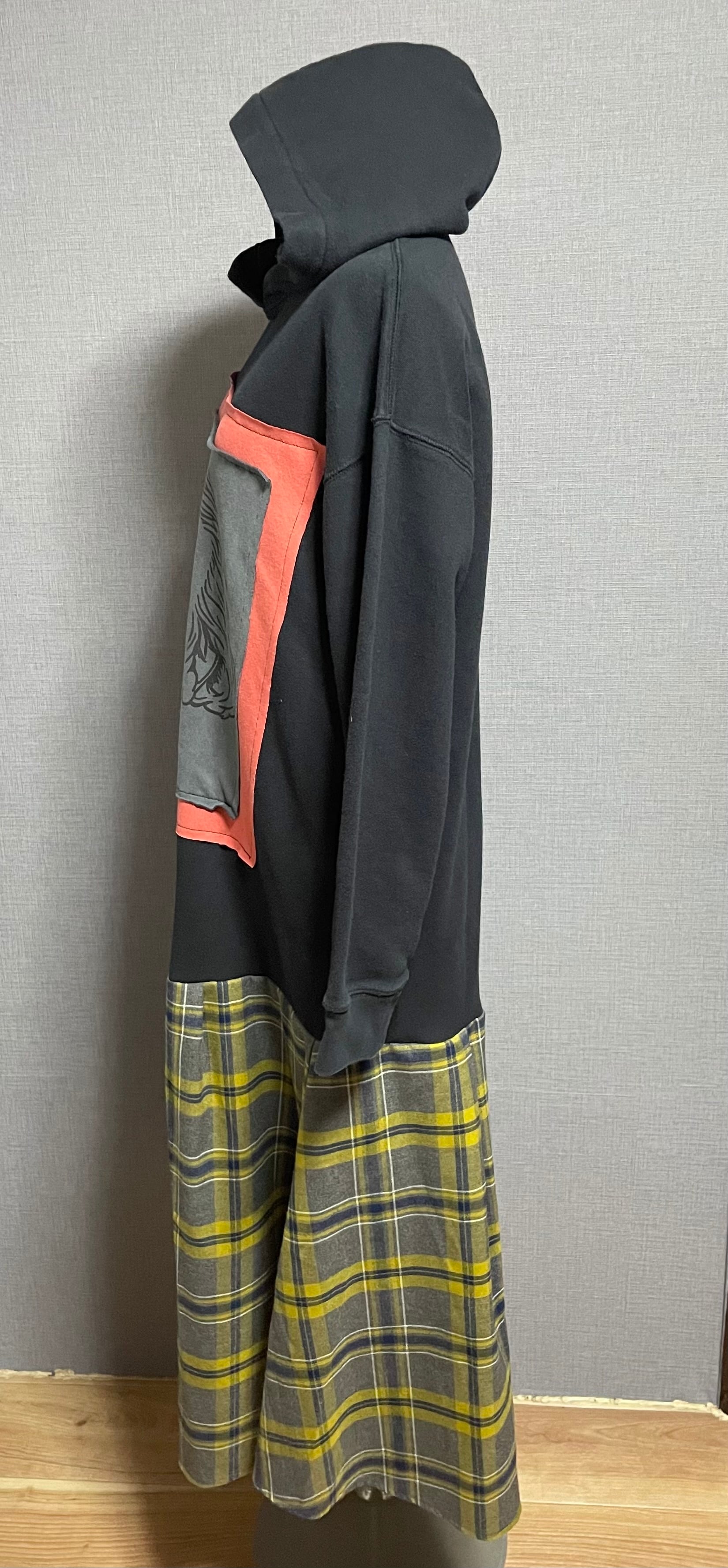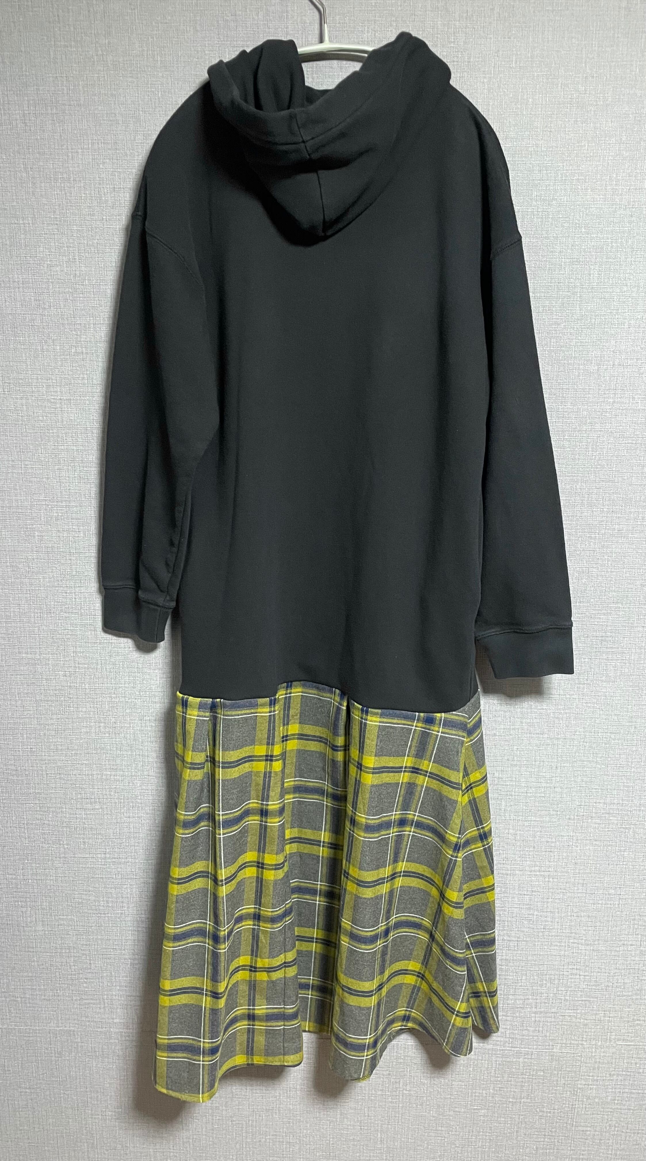 黒パーカーにベロ出し男性を縫いつけ、チェック柄スカートを合わせています♬