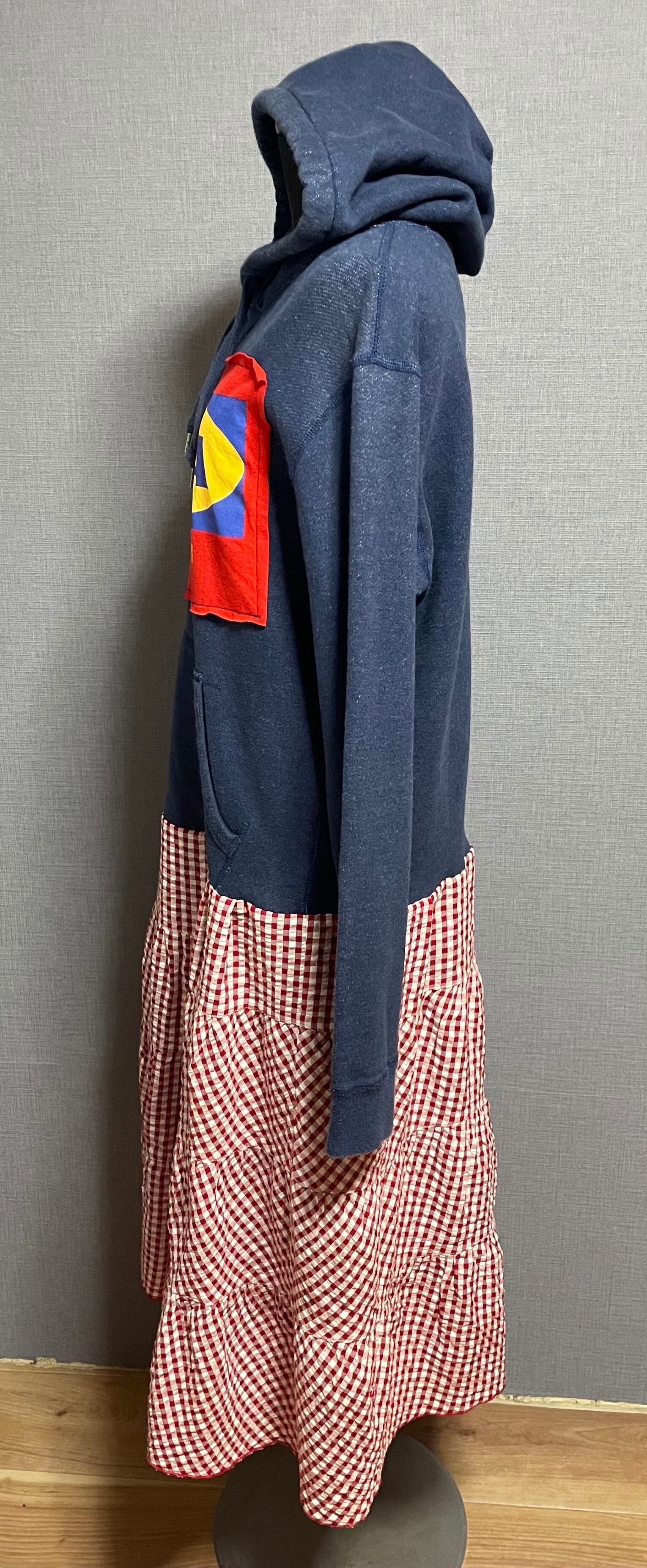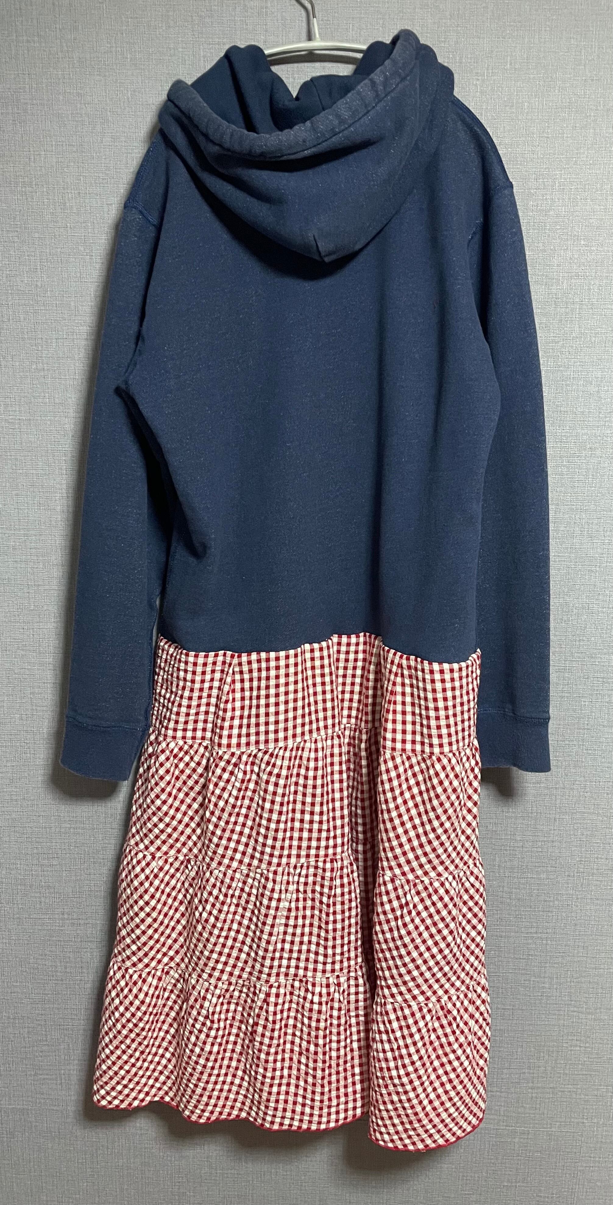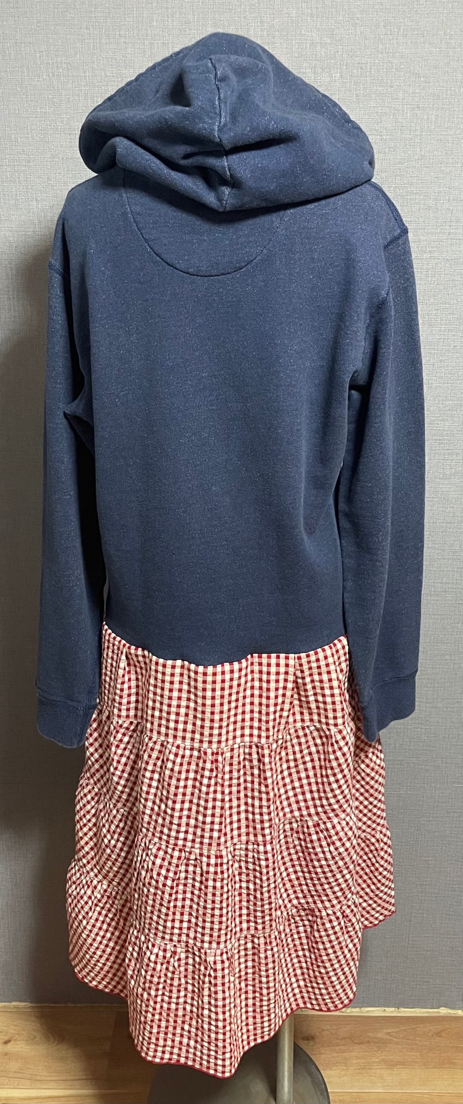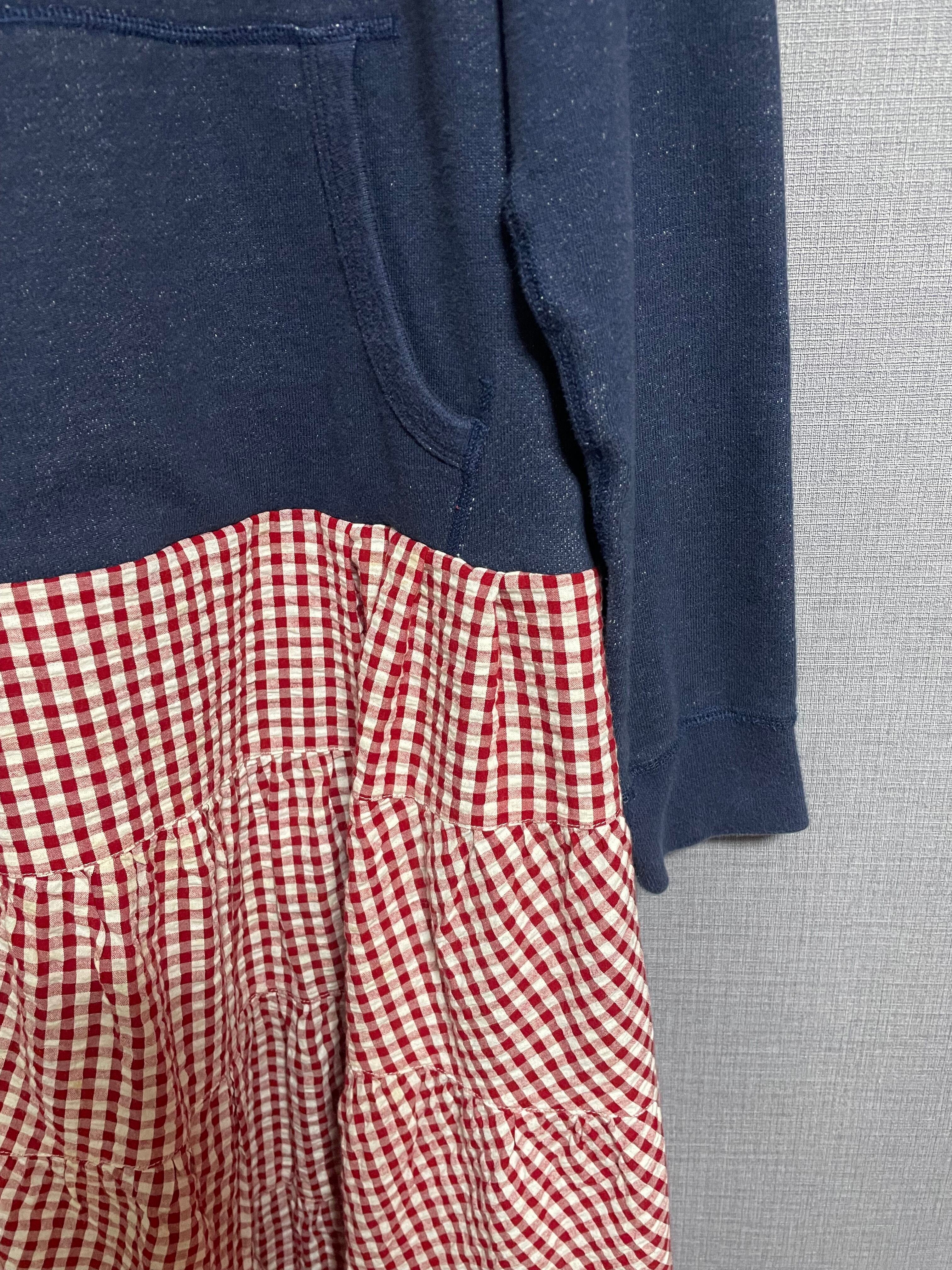 ネイビーパーカーにかわいいマークを縫いつけ、ギンガムチェックのスカートを合わせています♬