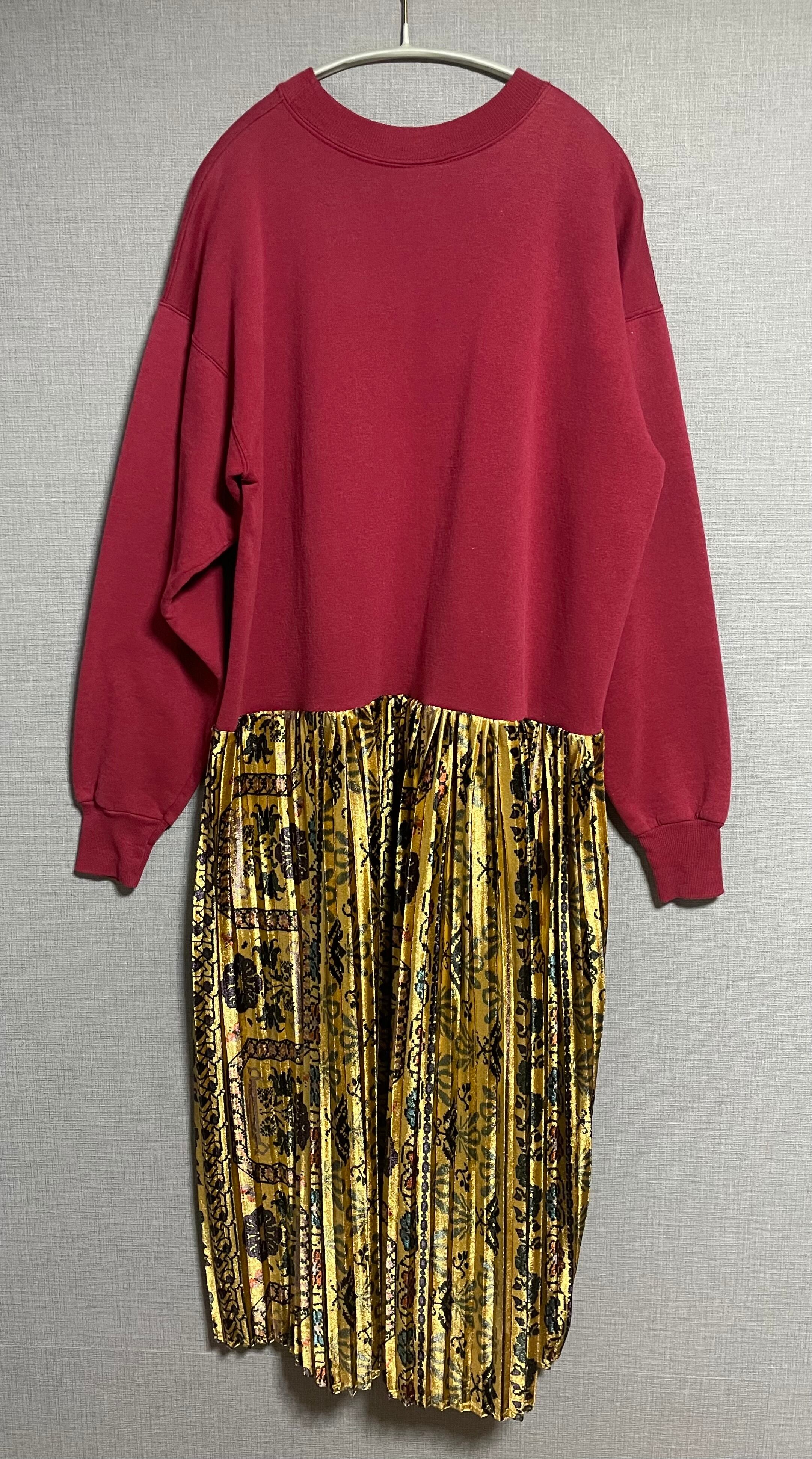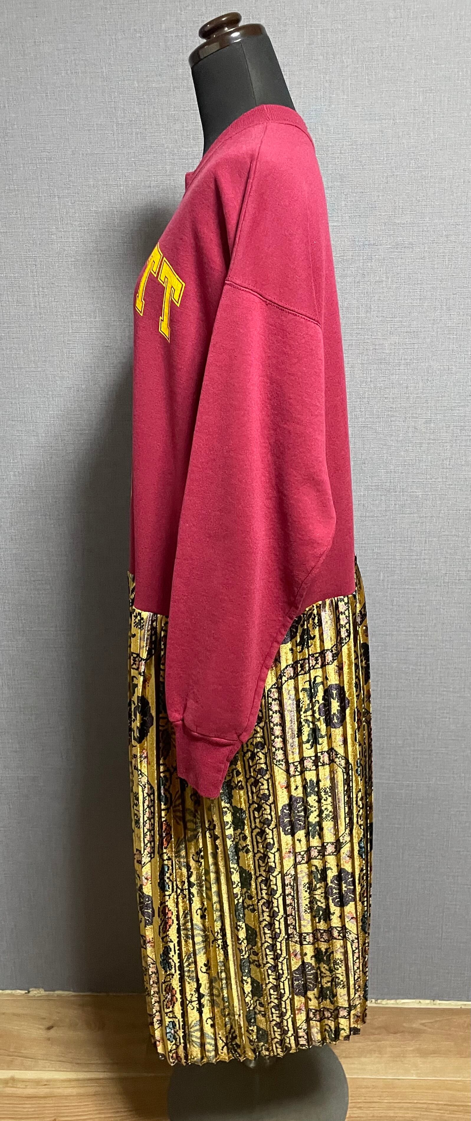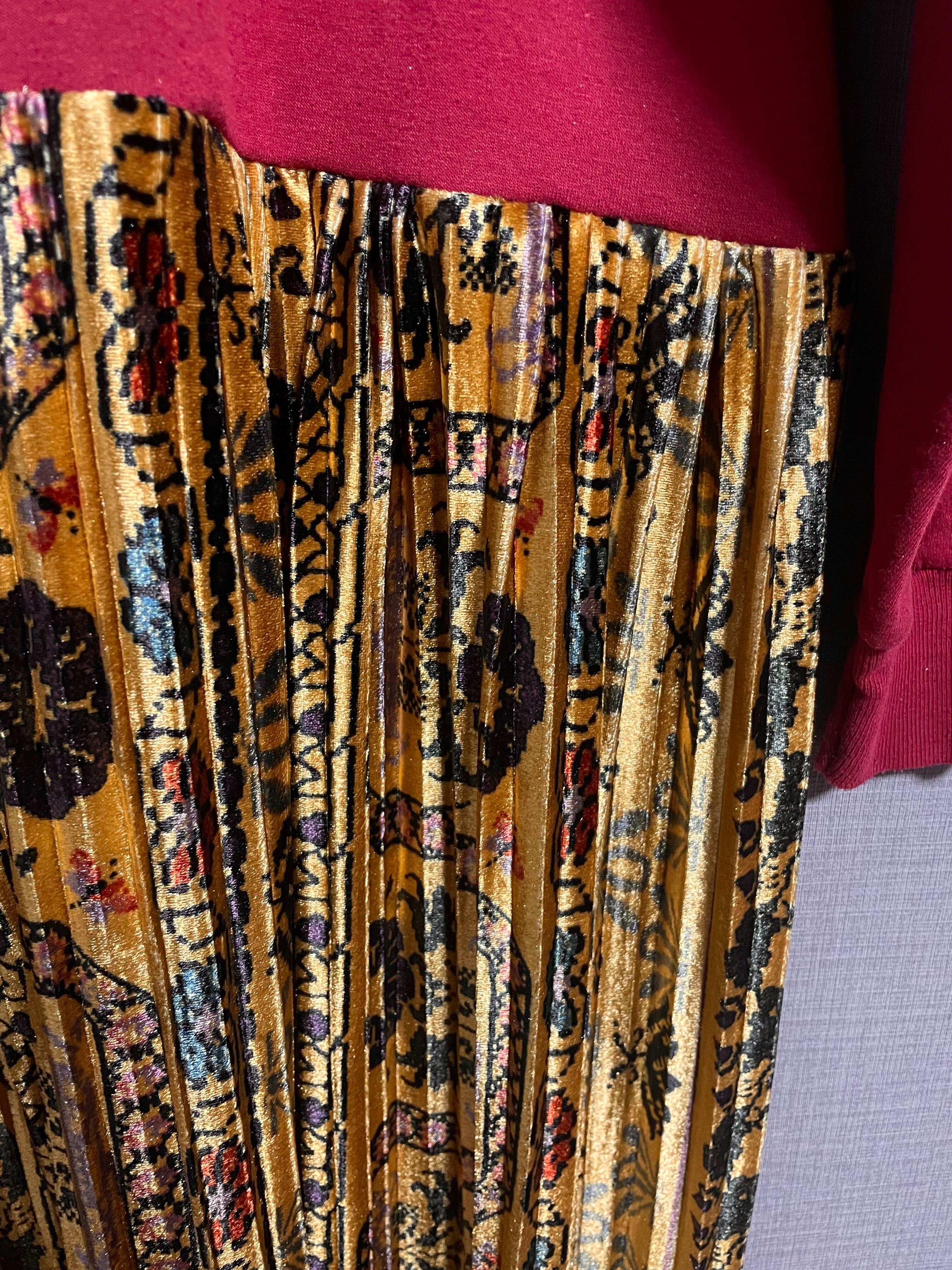 えんじ色のカレッジトレーナーに、ベロア調のプリーツスカートを合わせています♬